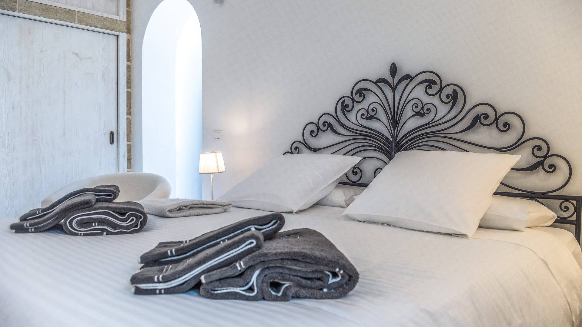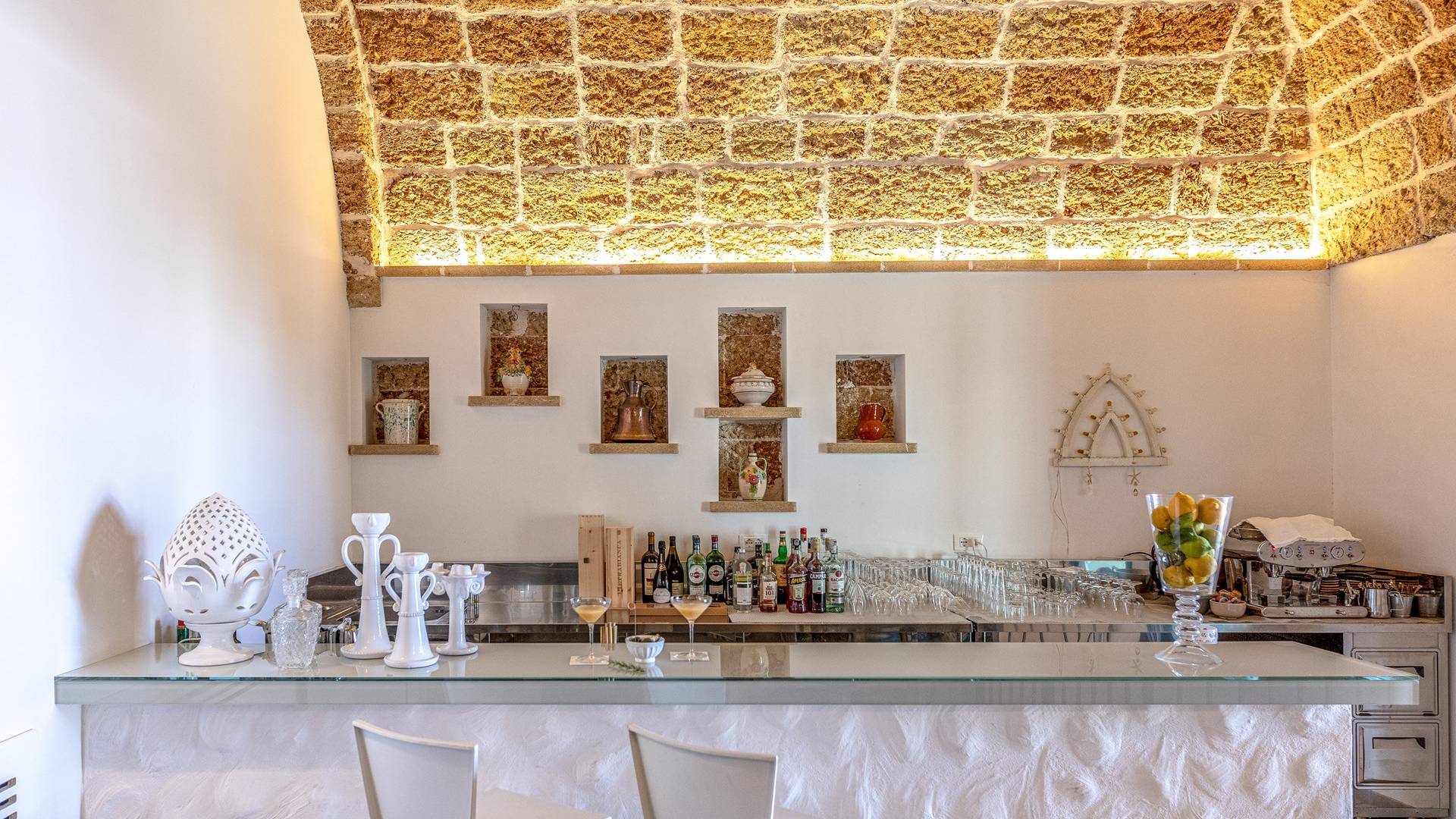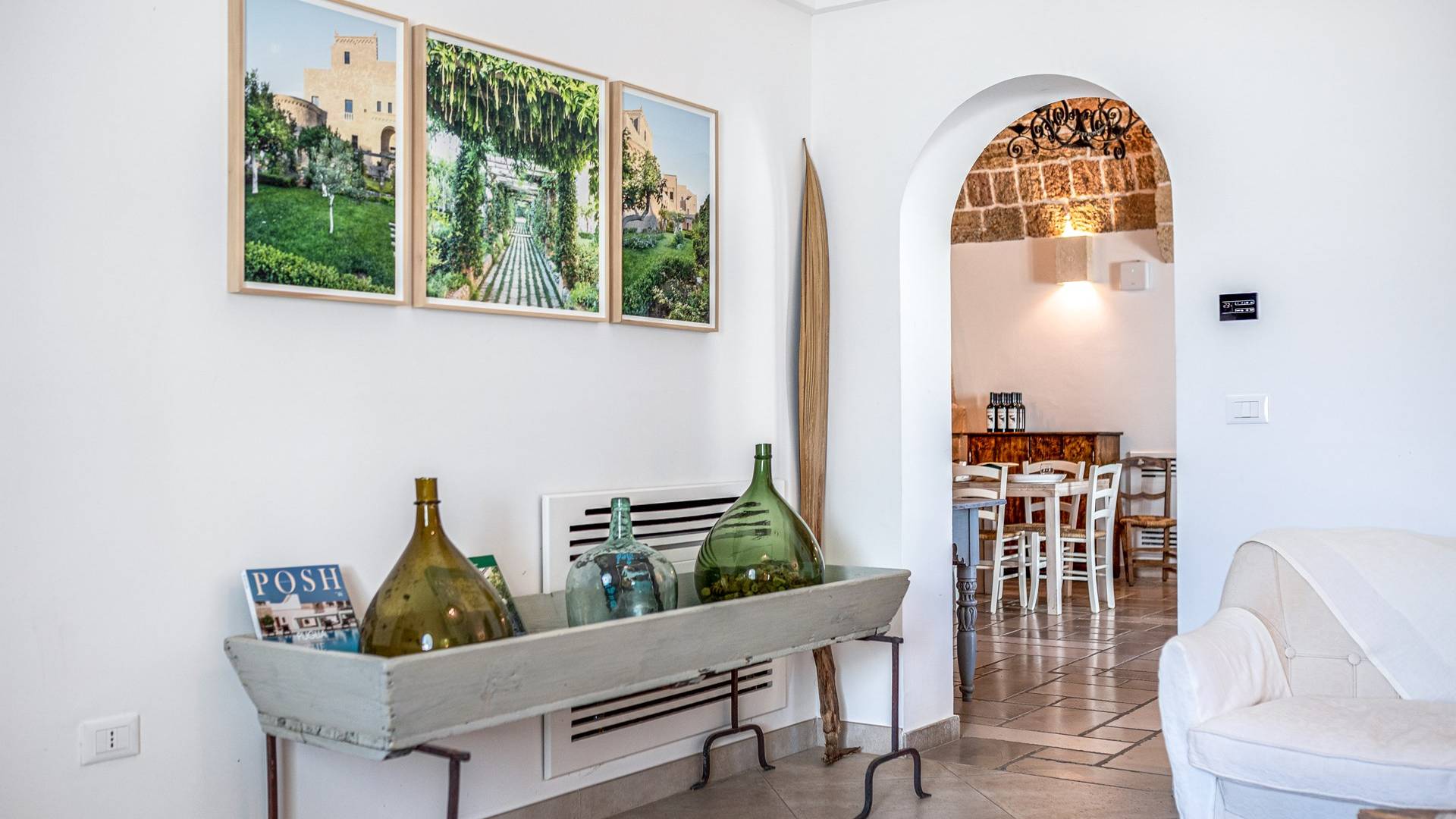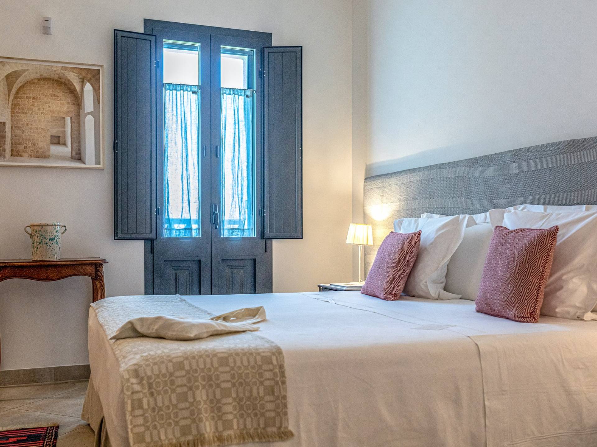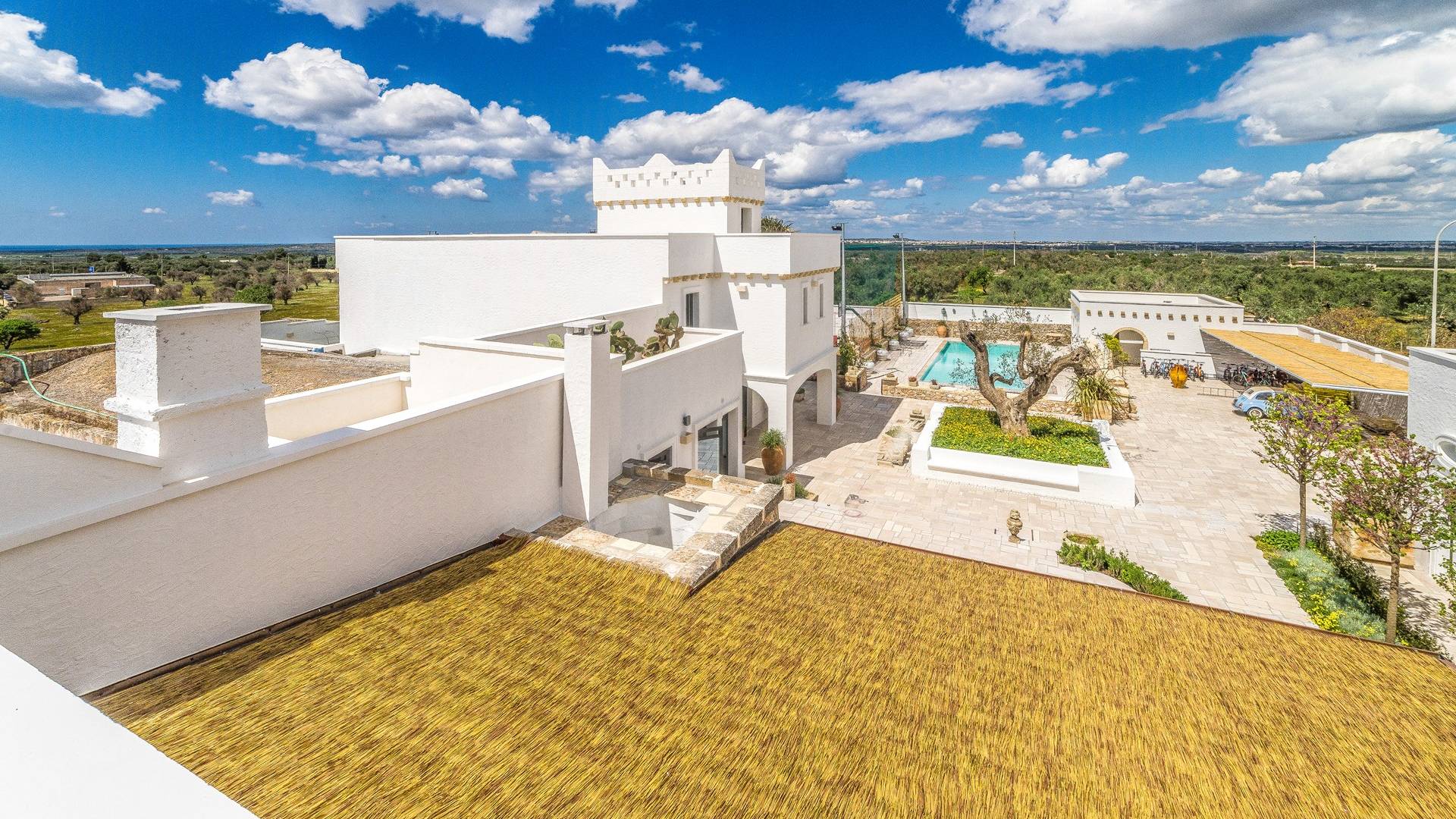 Sull'ampio terreno, c'è una piscina a sfioro con lettini per tutti gli ospiti, un campo sportivo e un cortile interno che ospita un ulivo centenario. A ridosso del centro cittadino, gli interni della Masseria comprendono un soggiorno, un lounge bar, una sala colazione/pranzo, una palestra e un totale di quattordici camere matrimoniali di diversa tipologia. Il design della casa, affrontato con ricerca nel contesto storico, mescola mobili di design ed elementi restaurati con le caratteristiche originali che questa proprietà conserva, risultando in uno stile eclettico con pietra locale di alta qualità e intonaco bianco incontaminato. I soffitti a volta immacolati conferiscono un tocco leggero agli interni.
