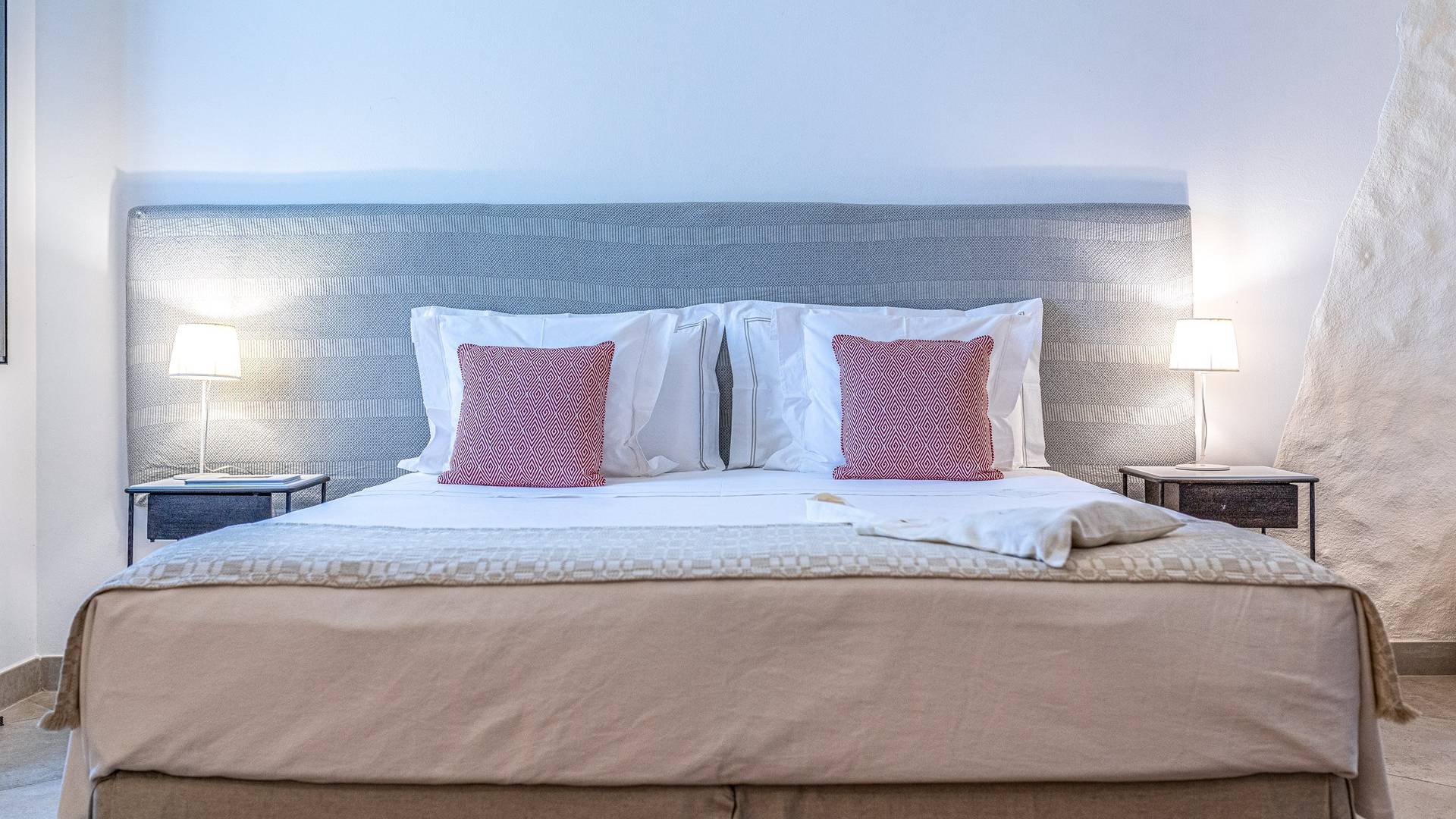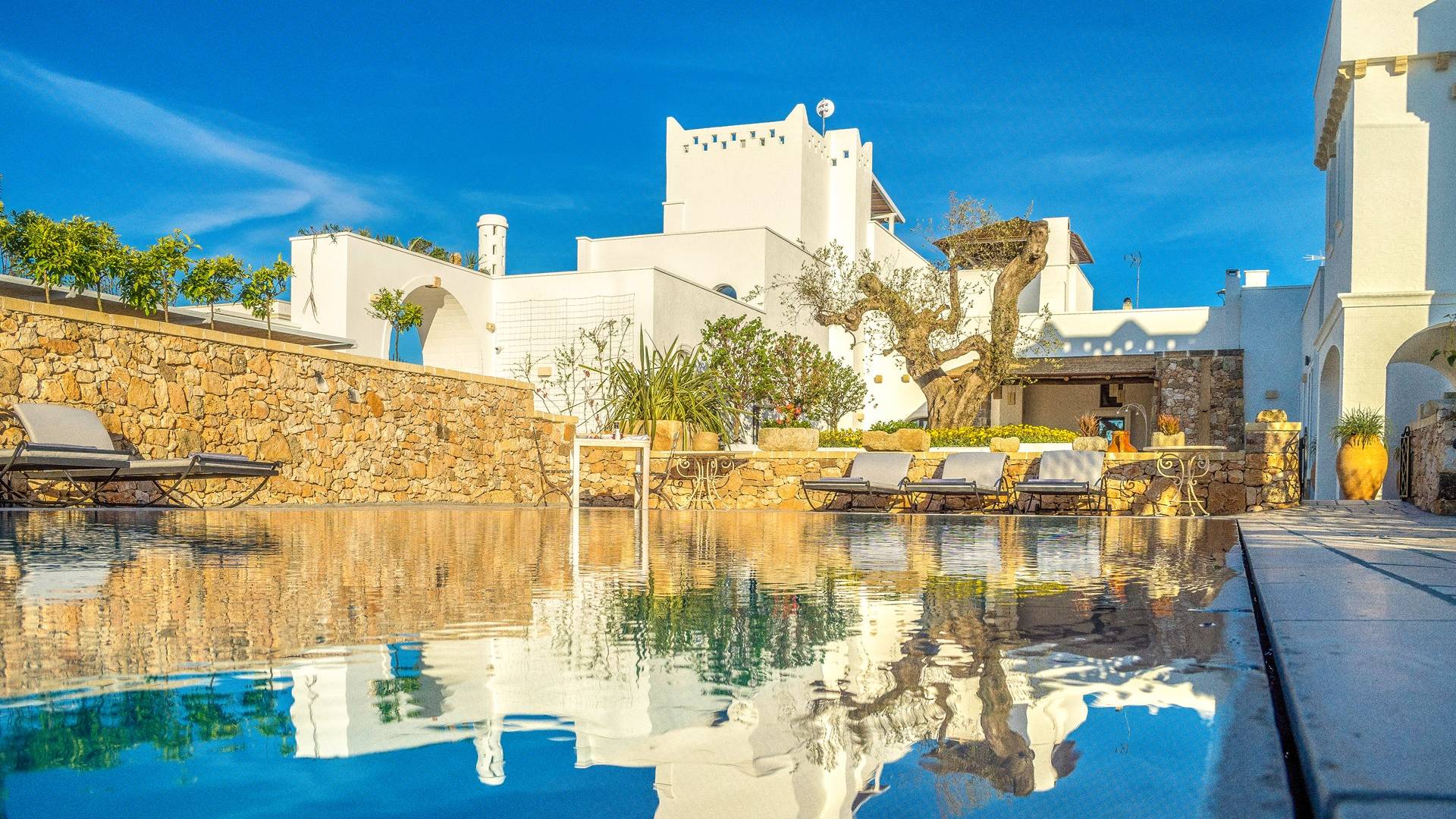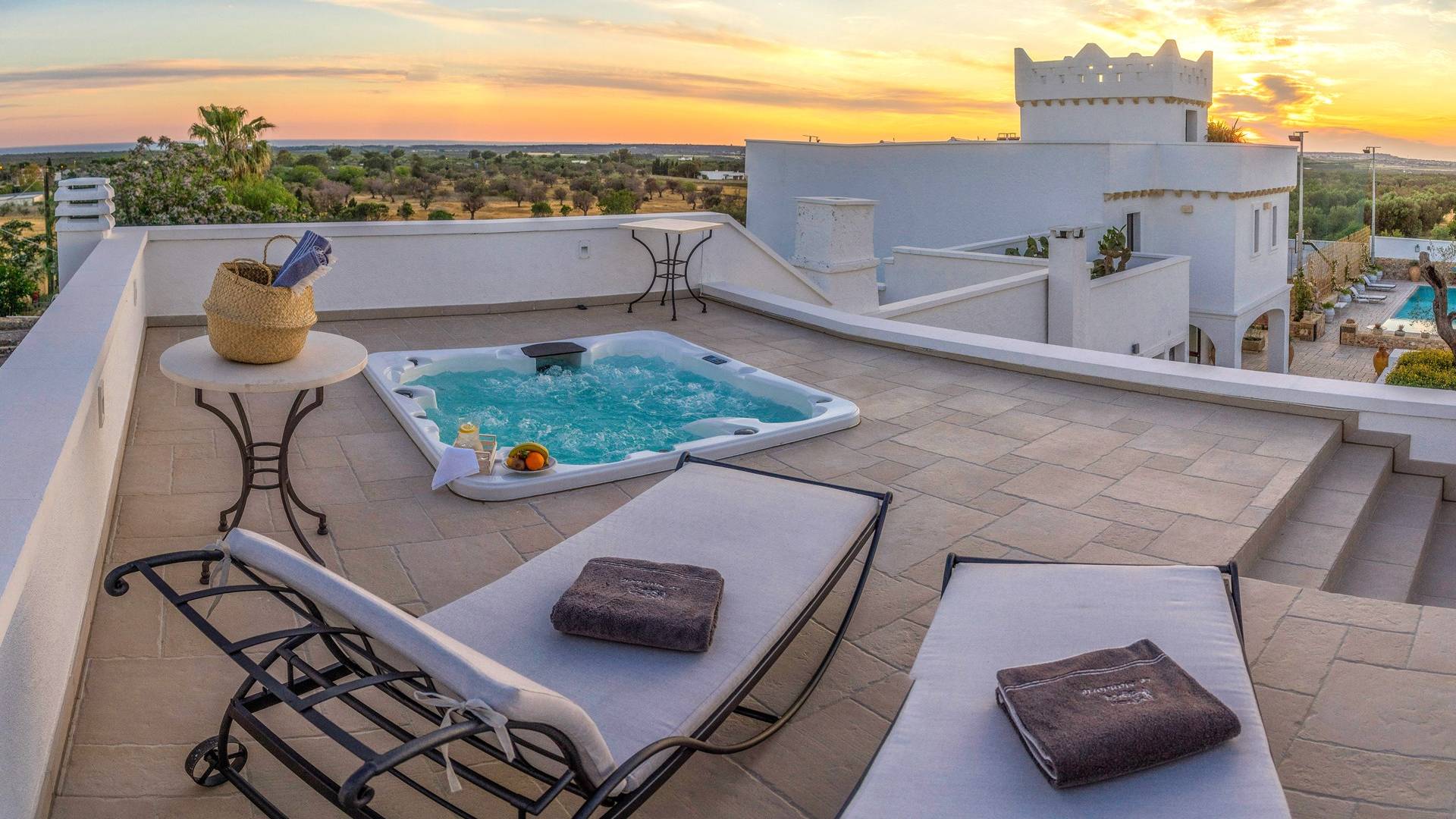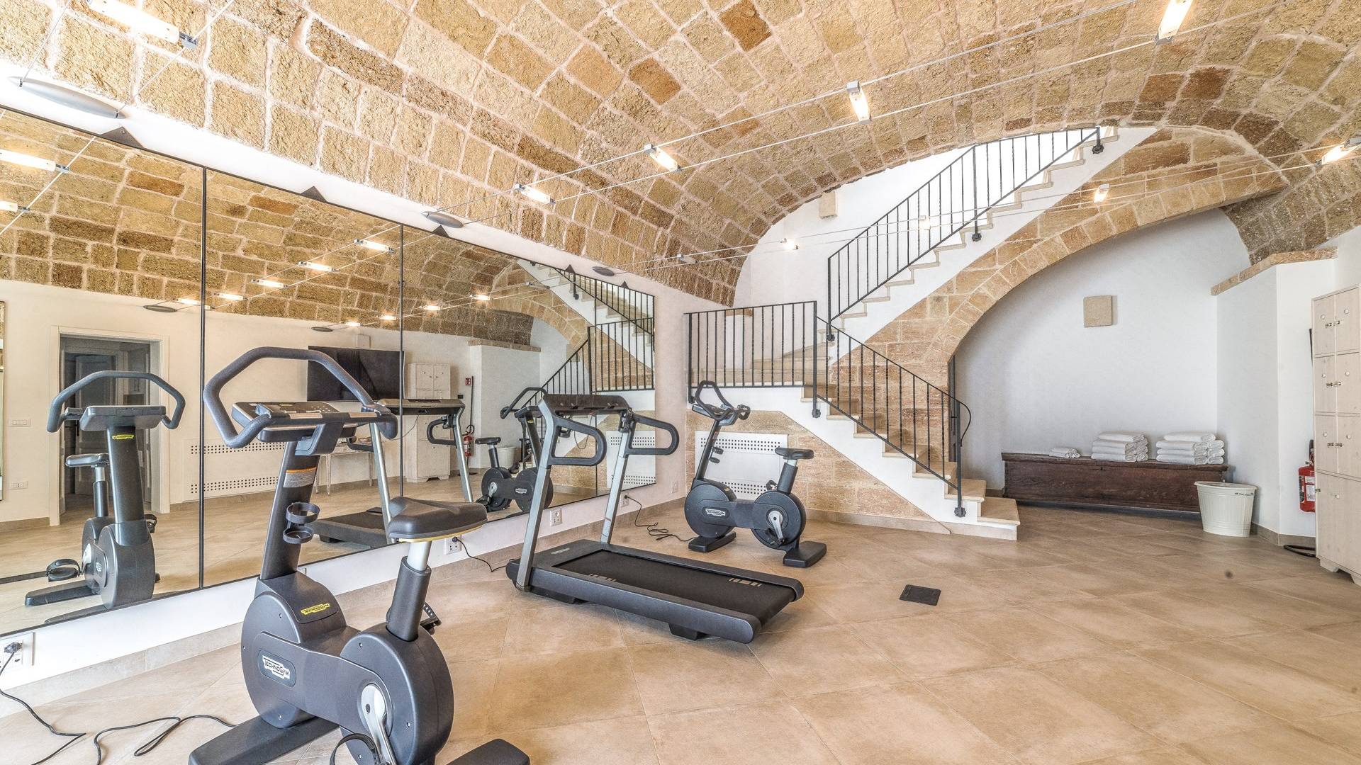 Sull'ampio terreno, c'è una piscina a sfioro con lettini per tutti gli ospiti, un campo sportivo e un cortile interno che ospita un ulivo centenario. A ridosso del centro cittadino, gli interni della Masseria comprendono un soggiorno, un lounge bar, una sala colazione/pranzo, una palestra e un totale di quattordici camere matrimoniali di diversa tipologia. Il design della casa, affrontato con ricerca nel contesto storico, mescola mobili di design ed elementi restaurati con le caratteristiche originali che questa proprietà conserva, risultando in uno stile eclettico con pietra locale di alta qualità e intonaco bianco incontaminato. I soffitti a volta immacolati conferiscono un tocco leggero agli interni.