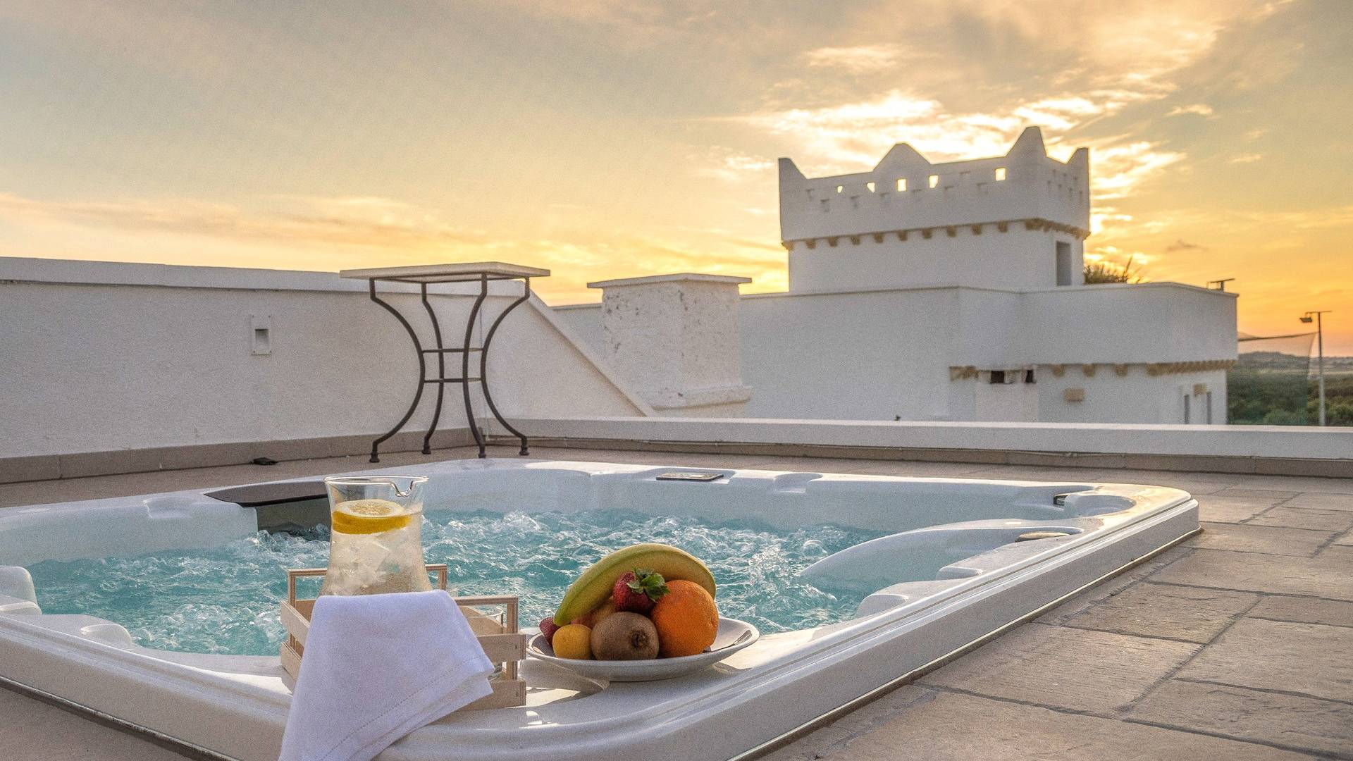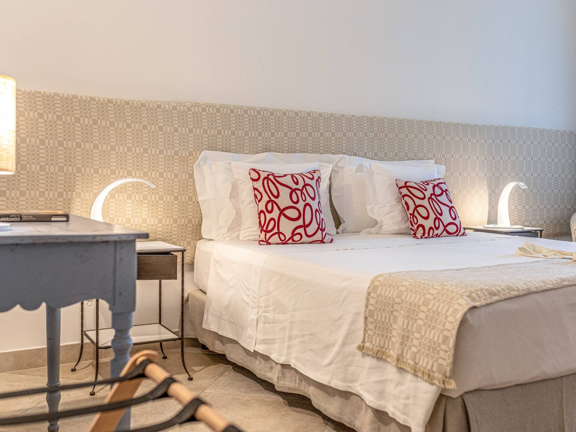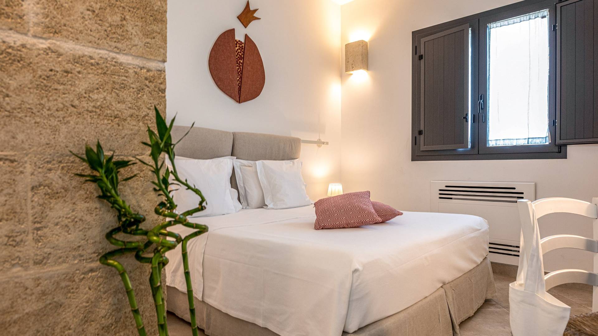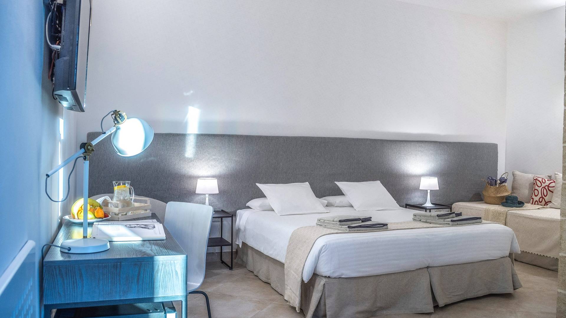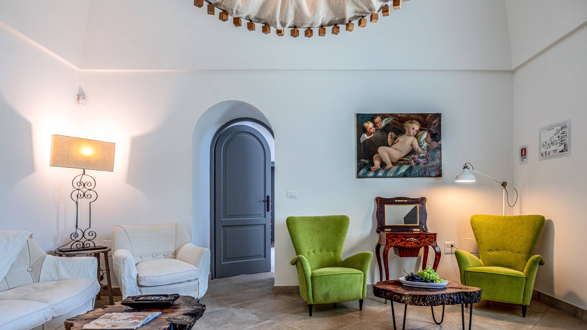 Sull'ampio terreno, c'è una piscina a sfioro con lettini per tutti gli ospiti, un campo sportivo e un cortile interno che ospita un ulivo centenario. A ridosso del centro cittadino, gli interni della Masseria comprendono un soggiorno, un lounge bar, una sala colazione/pranzo, una palestra e un totale di quattordici camere matrimoniali di diversa tipologia. Il design della casa, affrontato con ricerca nel contesto storico, mescola mobili di design ed elementi restaurati con le caratteristiche originali che questa proprietà conserva, risultando in uno stile eclettico con pietra locale di alta qualità e intonaco bianco incontaminato. I soffitti a volta immacolati conferiscono un tocco leggero agli interni.