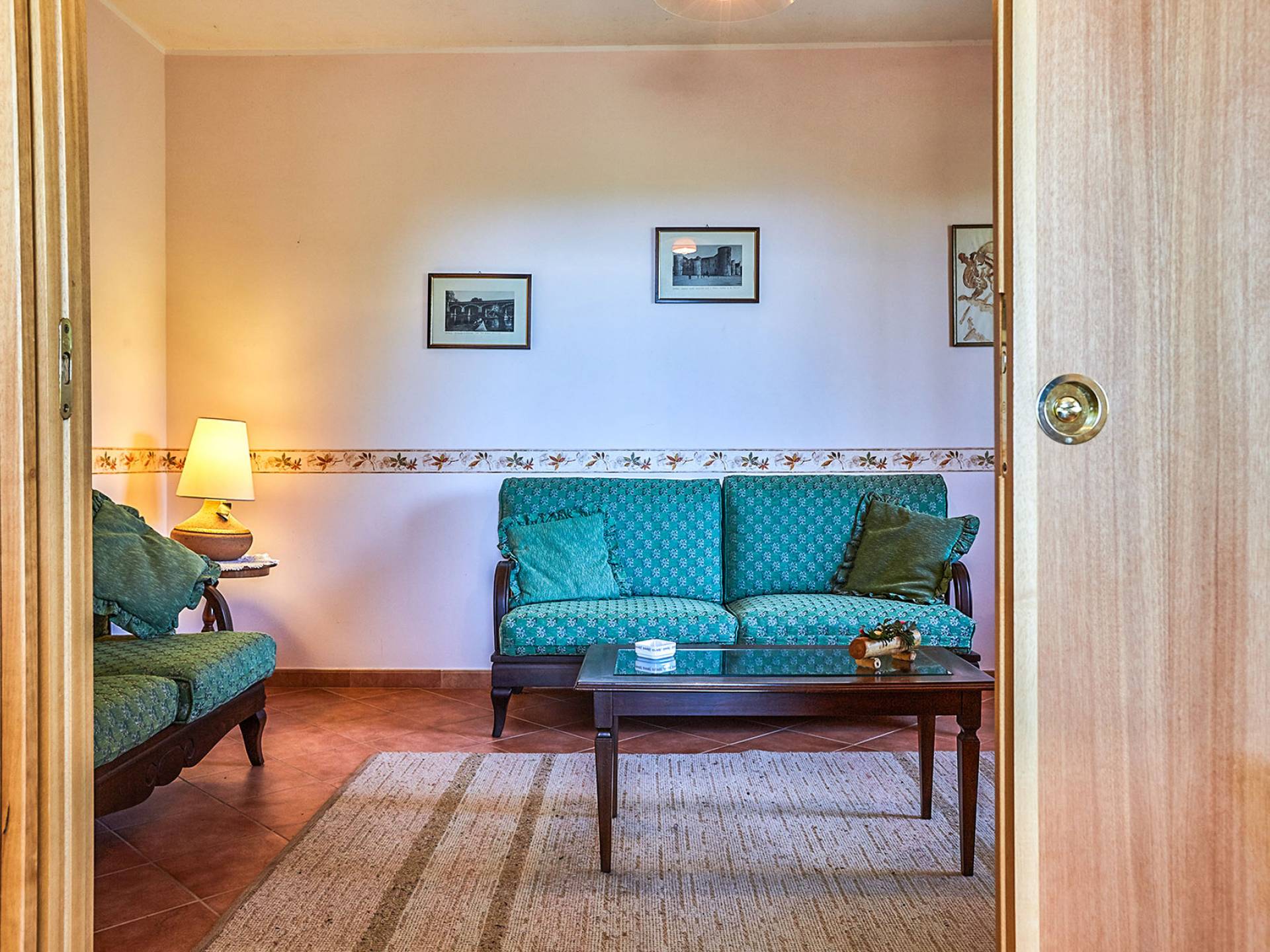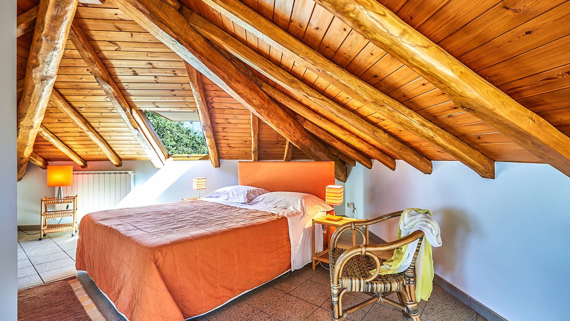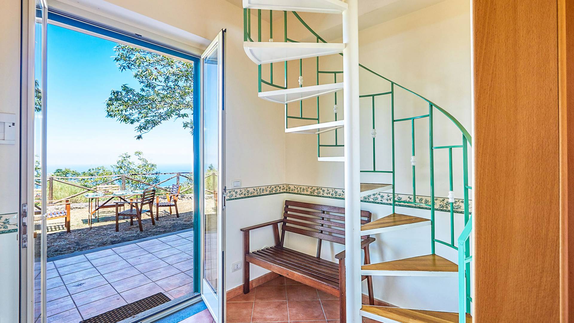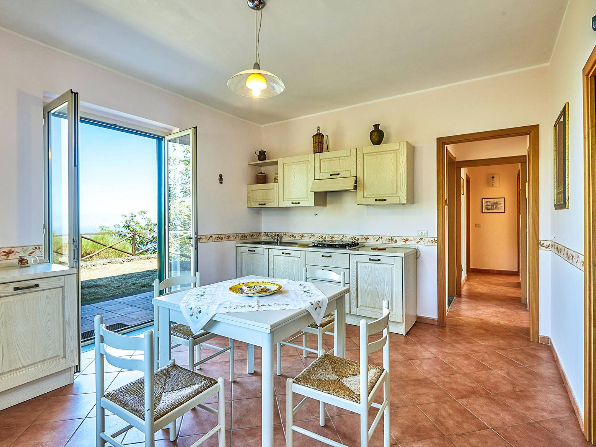 L'interno della villa è arredato in modo semplice e ha tutto il necessario per una vacanza in famiglia. Al piano terra c'è un piccolo soggiorno e una cucina con doppie porte che conducono alla terrazza da pranzo all'aperto. Su questo piano si trovano due delle tre camere matrimoniali, entrambe con accesso diretto al giardino, e due bagni (ciascuno con doccia). Una scala a chiocciola conduce alla terza camera da letto e al bagno.