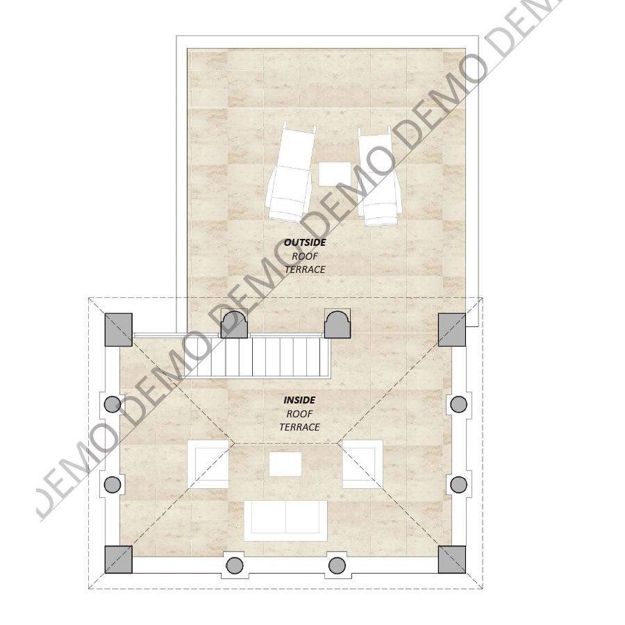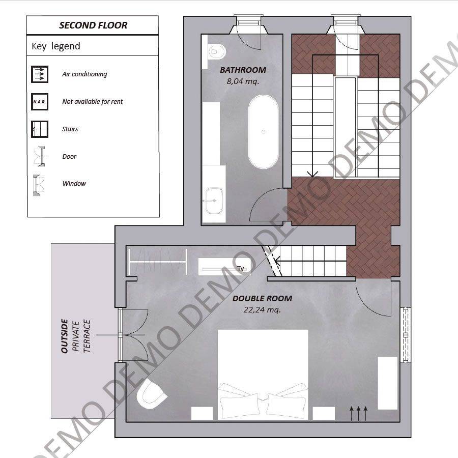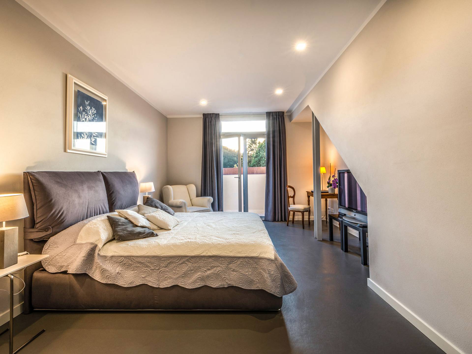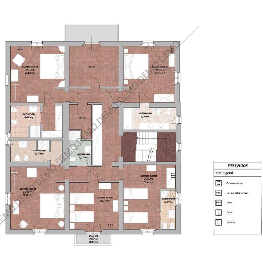 Al primo piano, la zona notte, è composta da 5 ampie camere da letto (3 matrimoniali e 2 doppie) e 5 bagni con doccia (1 normale, 4 ensuite di cui uno con vasca). Al secondo piano si trova un grazioso appartamento, arredato in stile contemporaneo, con letto matrimoniale, bagno (con doccia e vasca), TV e terrazzo. All'ultimo piano si trova un ampio terrazzo (5,5 m x 9,0 m) arredato con lettini prendisole, un divano in vimini e poltrone da cui poter ammirare una vista mozzafiato a 360° su tutta la valle di Camaiore.