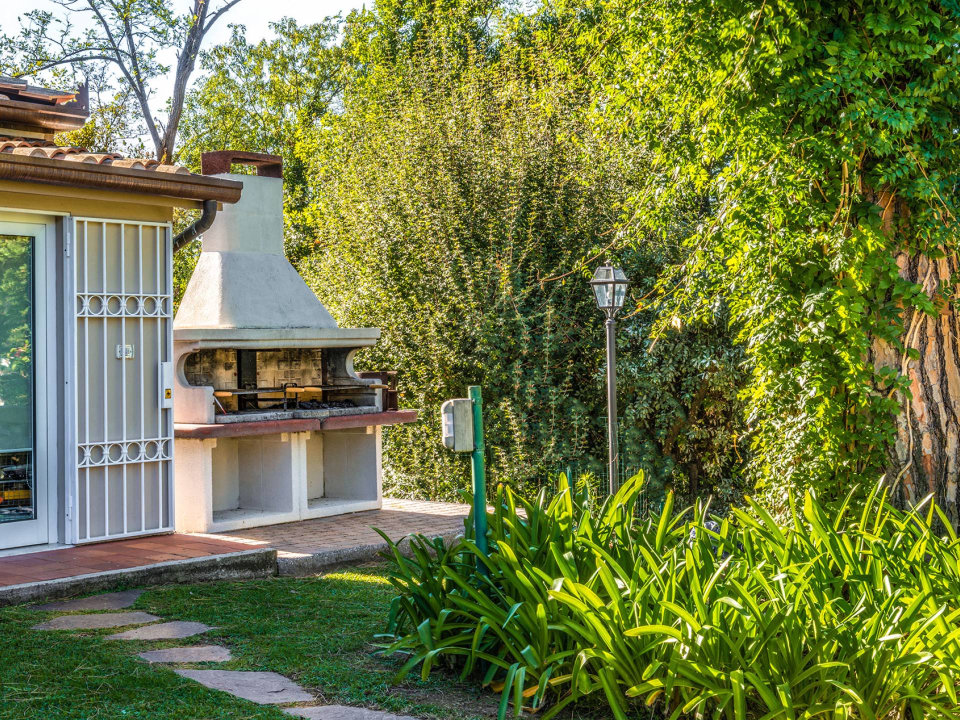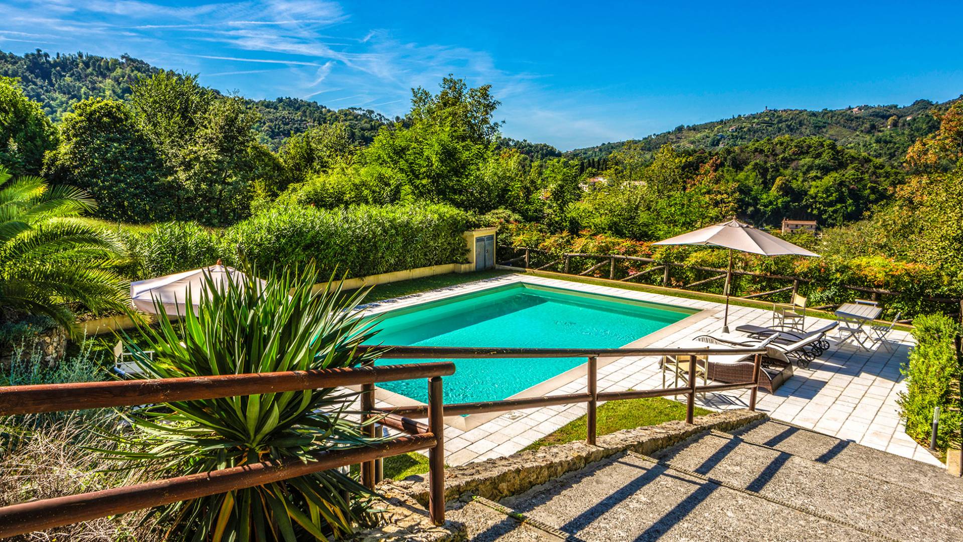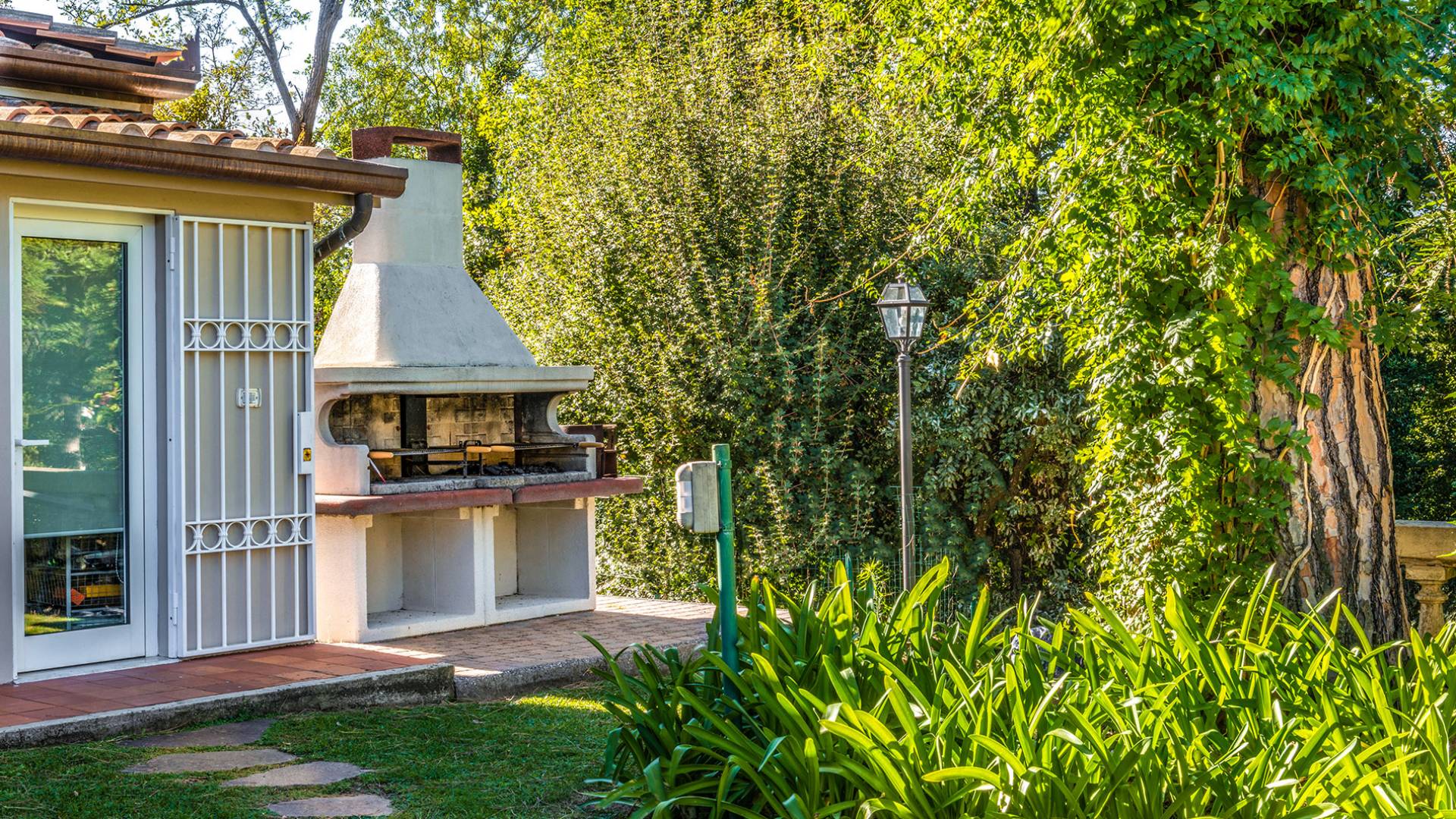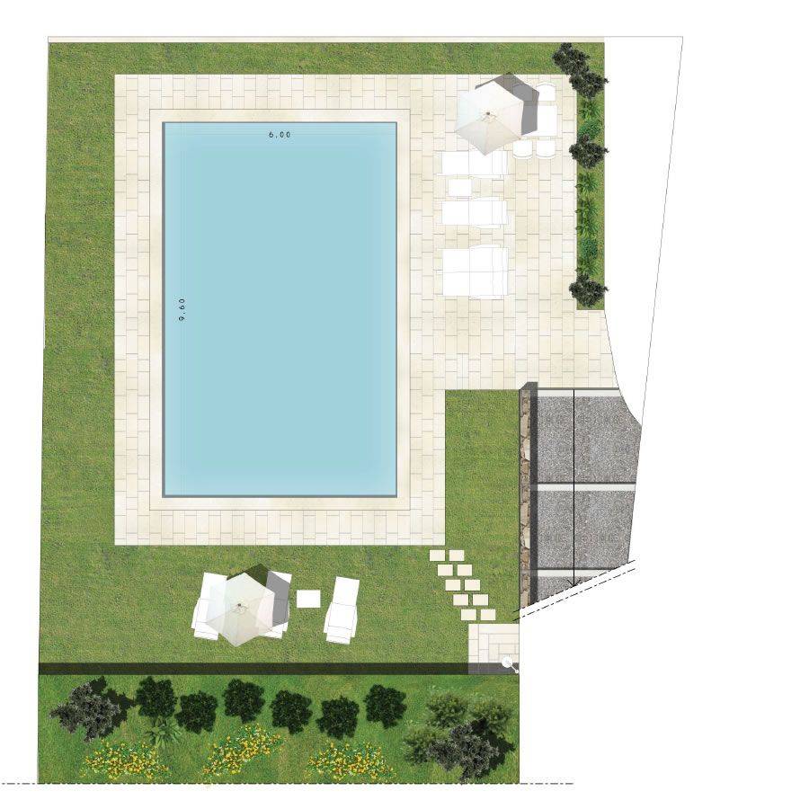 Nel giardino inferiore si trova una grande piscina recintata (9,6 m x 6 m) situata ai margini del bosco, raggiungibile tramite una breve rampa di scale. La piscina è dotata di solarium in pietra leccese, ombrelloni, sdraio, lettini prendisole, scaletta per ingresso/uscita e doccia esterna con acqua calda. Ci sono anche un tavolo da ping-pong e un barbecue in muratura.