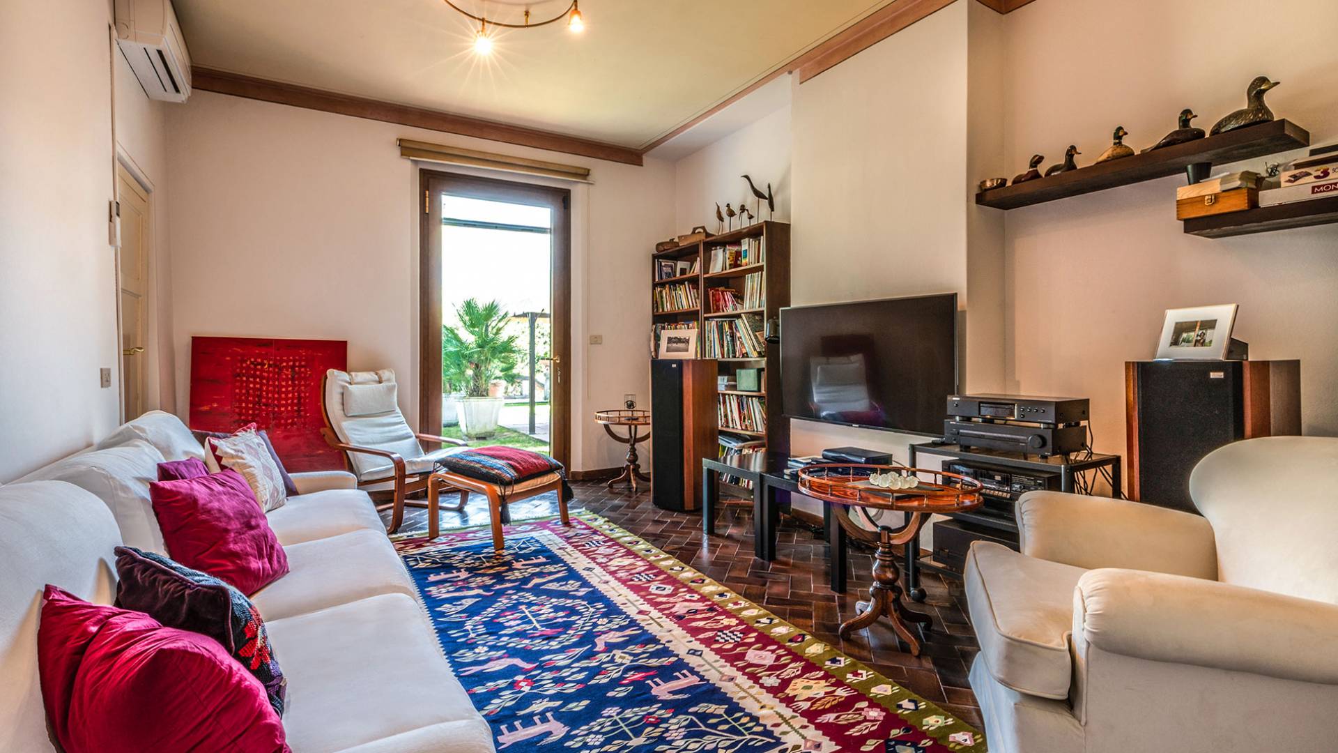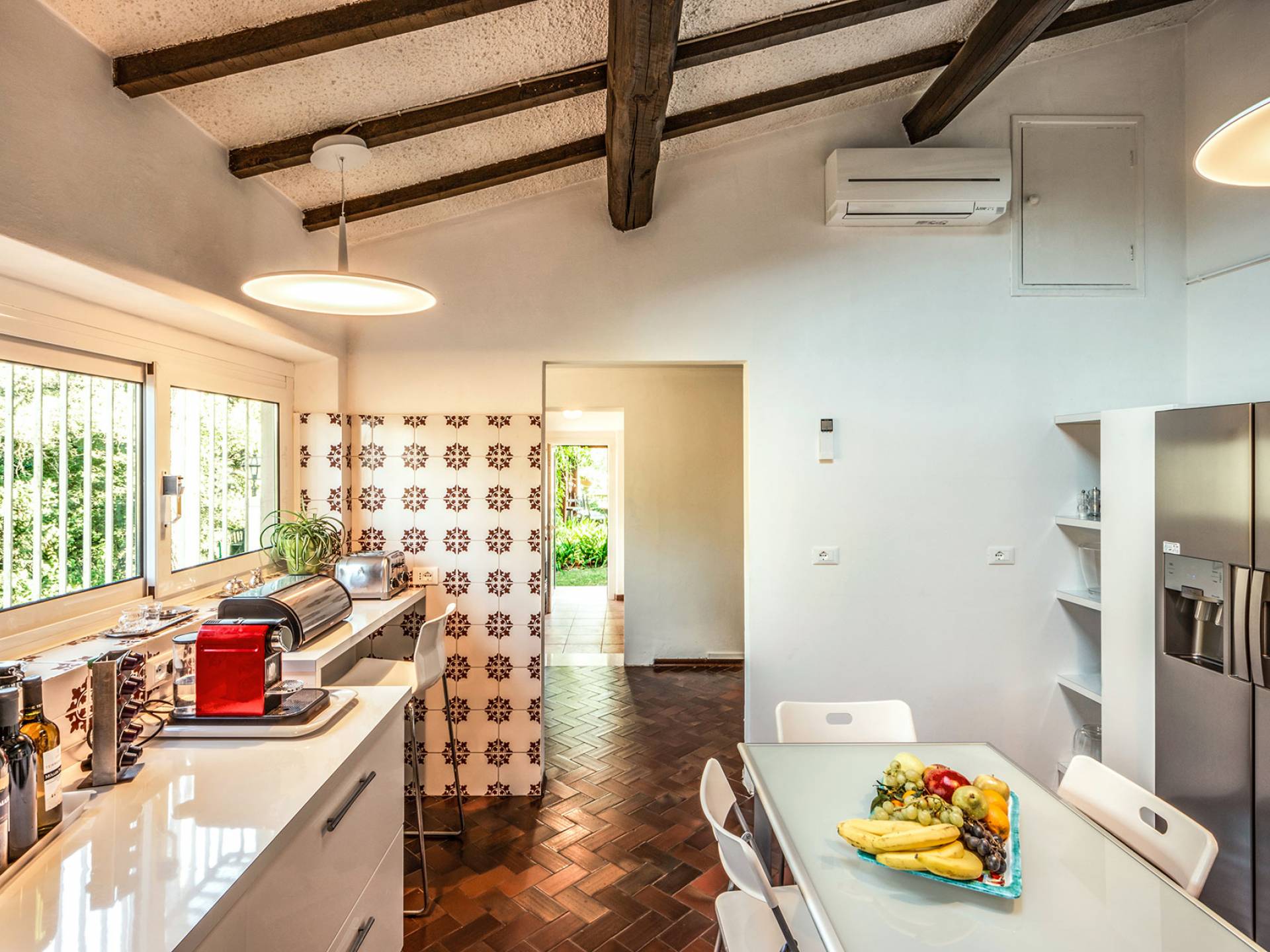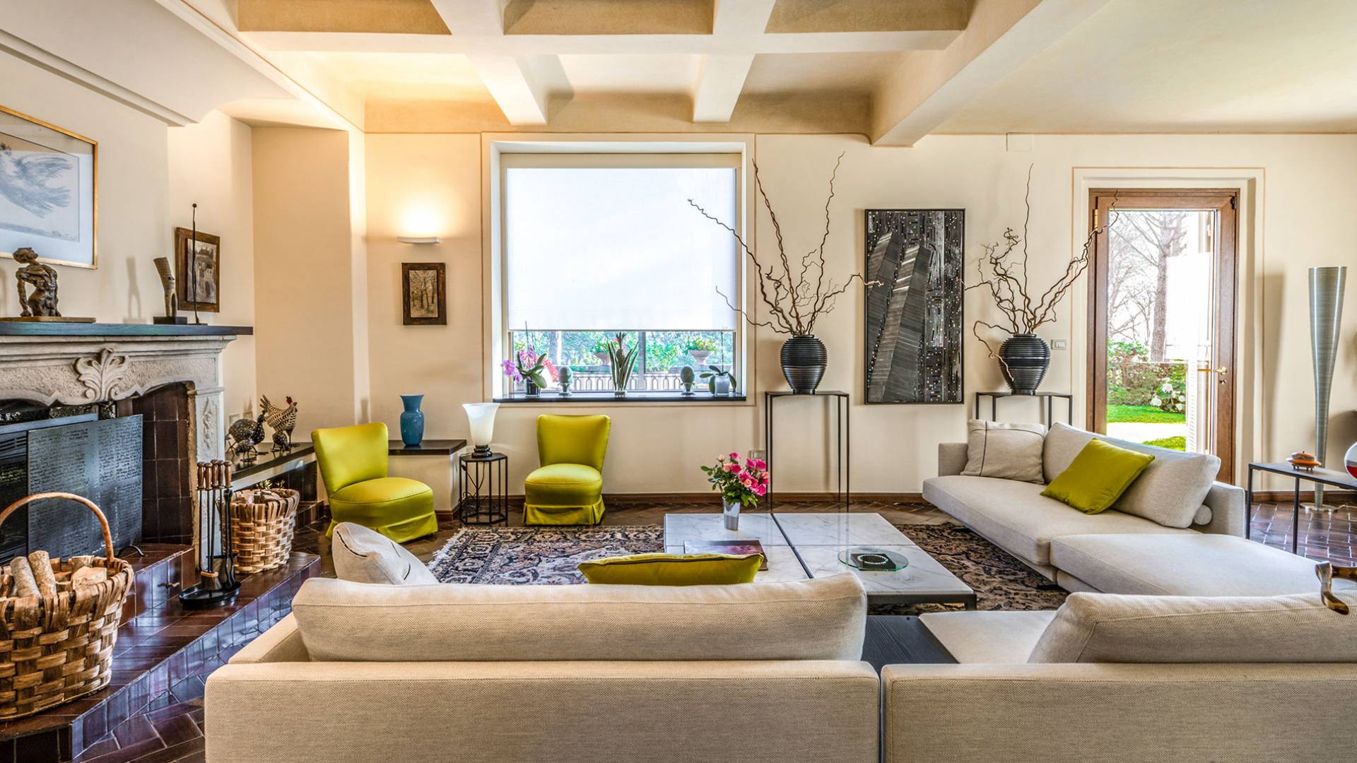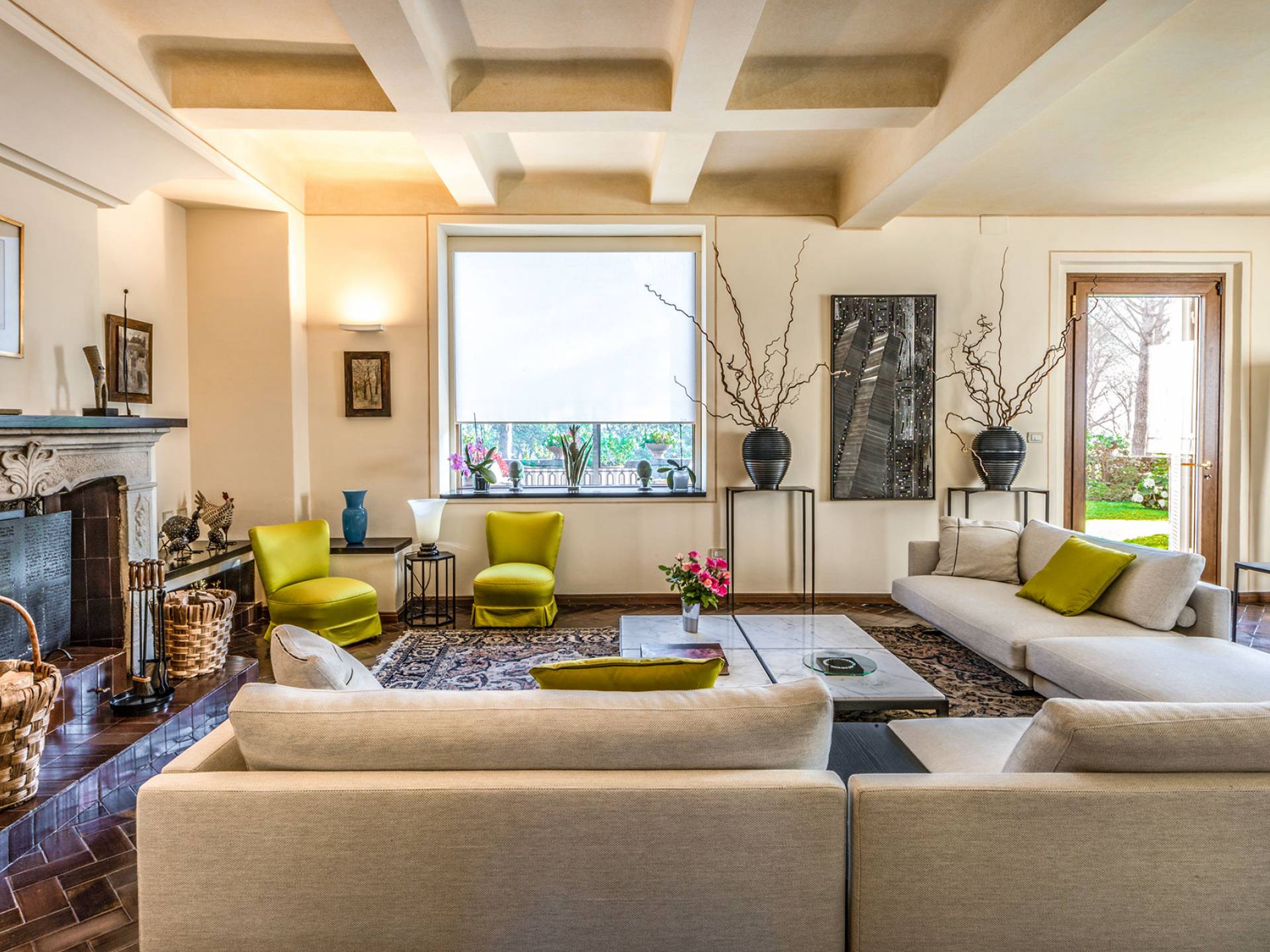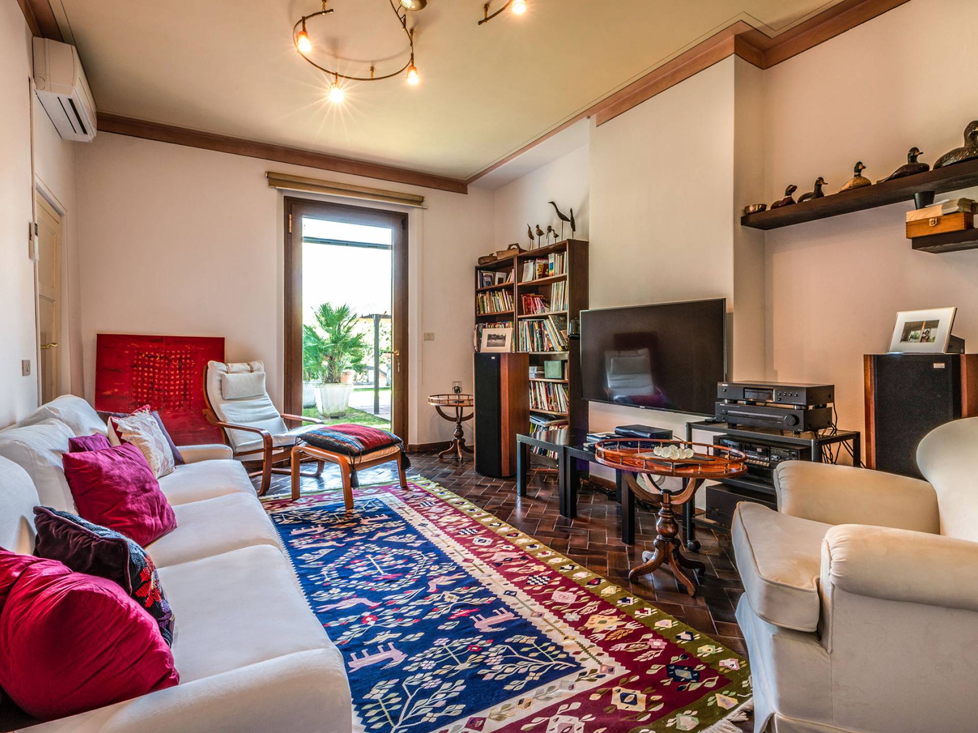 Dall'ingresso principale si accede ad un luminoso e ampio soggiorno con camino e divani. Attraverso porte-finestre si accede al giardino e a due gazebo, uno per aperitivi e relax, l'altro con tavolo da pranzo. Dall'altro lato del soggiorno, c'è un corridoio arredato con un'antica stufa veneziana in ceramica e un bel pianoforte verticale (Bechstein) che conduce al tavolo da pranzo. Un altro corridoio conduce a una cucina spaziosa e ben attrezzata con forno, microonde, frigorifero "side-by-side", tostapane, macchina da caffè Nespresso, lavastoviglie e tavolo per la colazione. Dalla cucina si accede facilmente al giardino e ai gazebo. Gli ospiti possono inoltre usufruire di una sala home theatre dotata di TV satellitare, lettori CD/DVD e impianto stereo di alta qualità. Due bagni con doccia compongono il resto di questo piano.