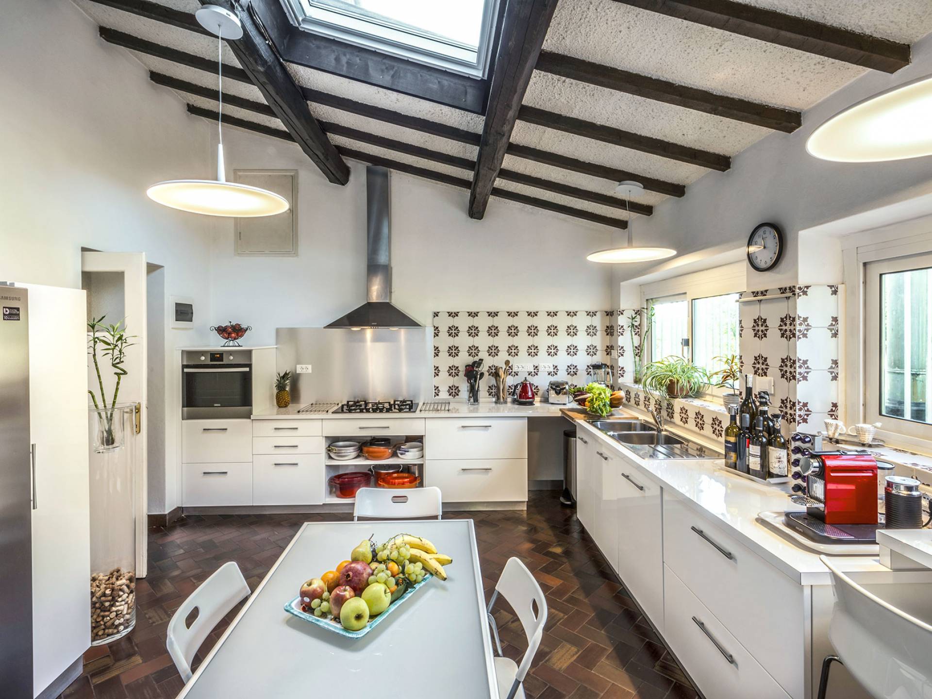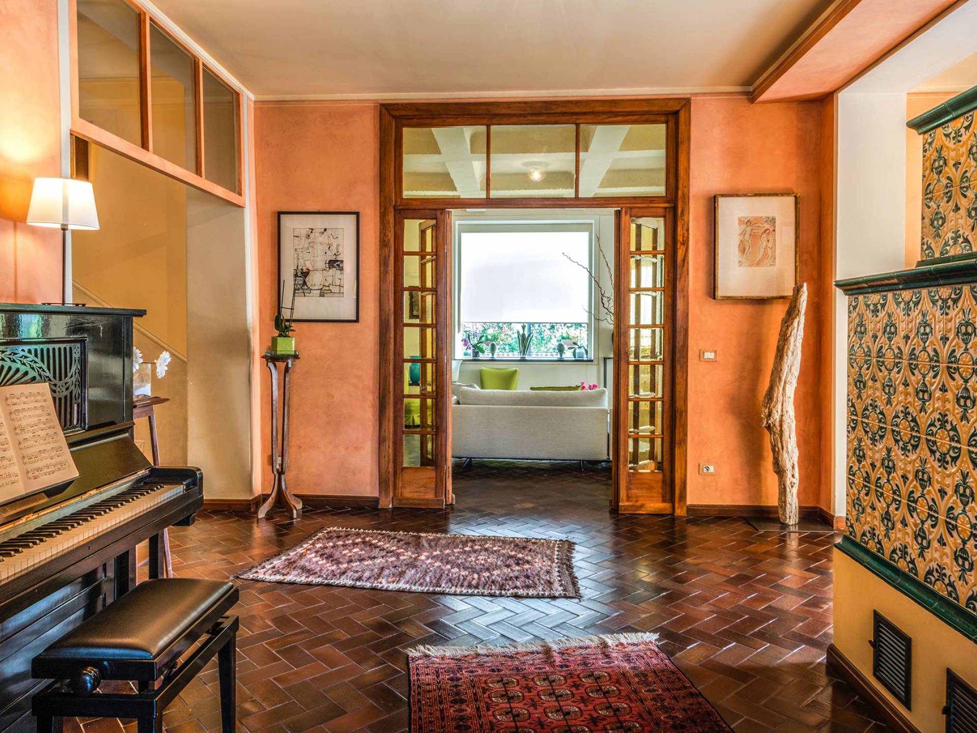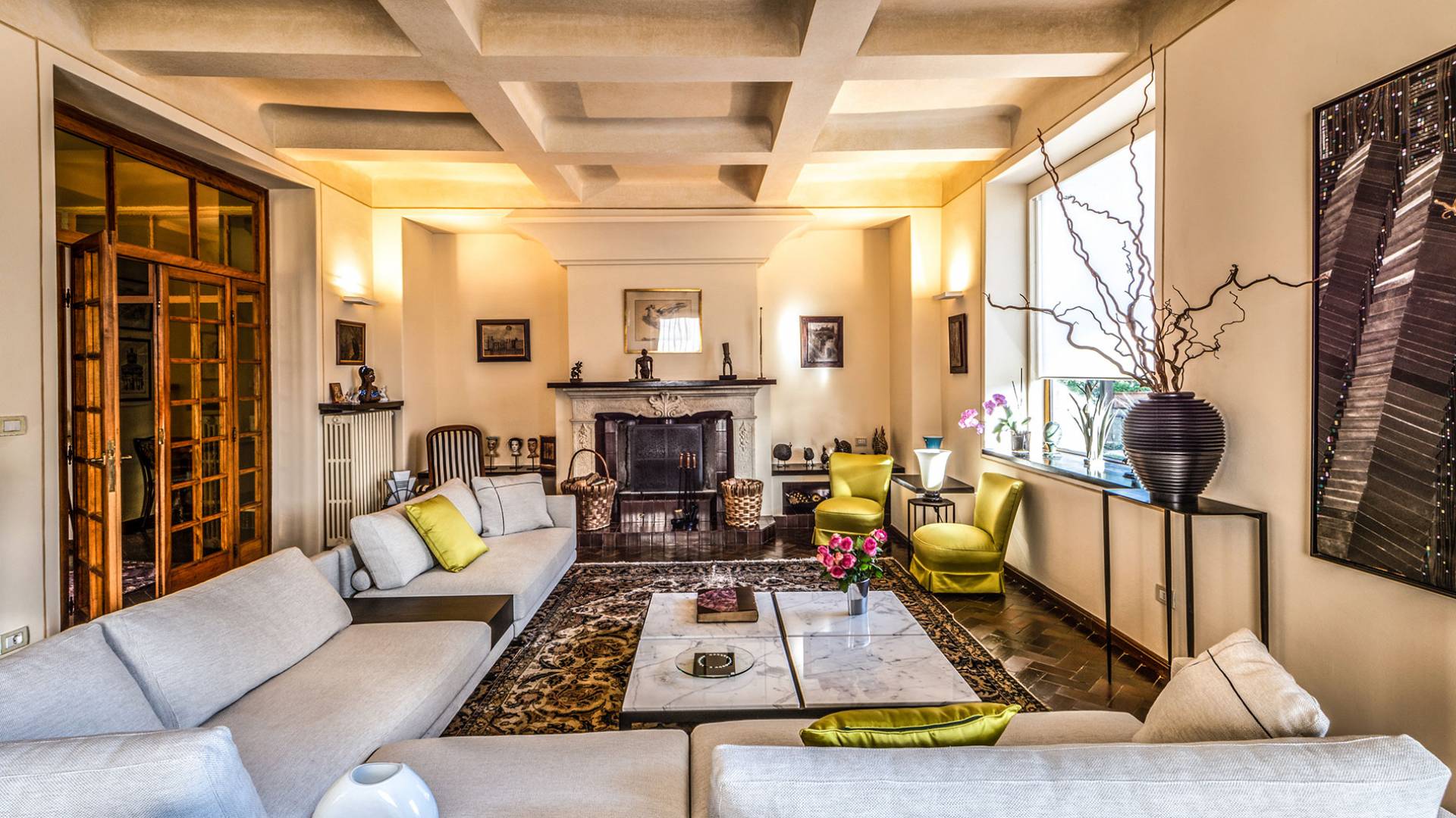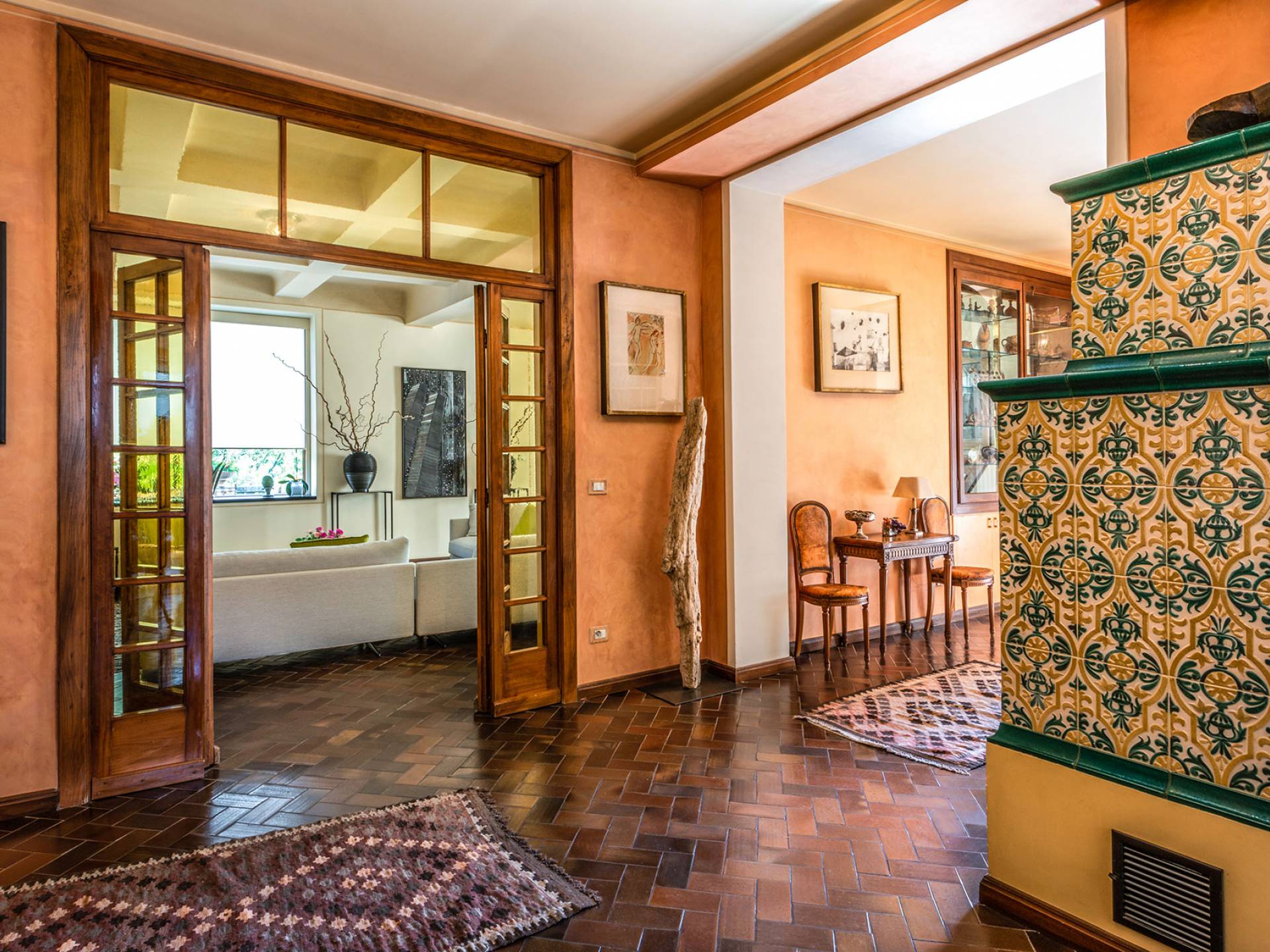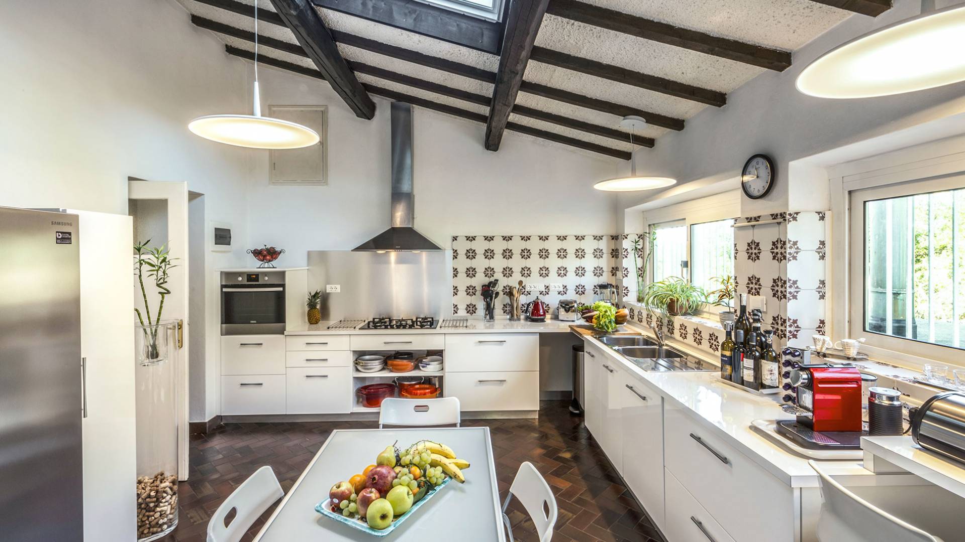 Dall'ingresso principale si accede ad un luminoso e ampio soggiorno con camino e divani. Attraverso porte-finestre si accede al giardino e a due gazebo, uno per aperitivi e relax, l'altro con tavolo da pranzo. Dall'altro lato del soggiorno, c'è un corridoio arredato con un'antica stufa veneziana in ceramica e un bel pianoforte verticale (Bechstein) che conduce al tavolo da pranzo. Un altro corridoio conduce a una cucina spaziosa e ben attrezzata con forno, microonde, frigorifero "side-by-side", tostapane, macchina da caffè Nespresso, lavastoviglie e tavolo per la colazione. Dalla cucina si accede facilmente al giardino e ai gazebo. Gli ospiti possono inoltre usufruire di una sala home theatre dotata di TV satellitare, lettori CD/DVD e impianto stereo di alta qualità. Due bagni con doccia compongono il resto di questo piano.