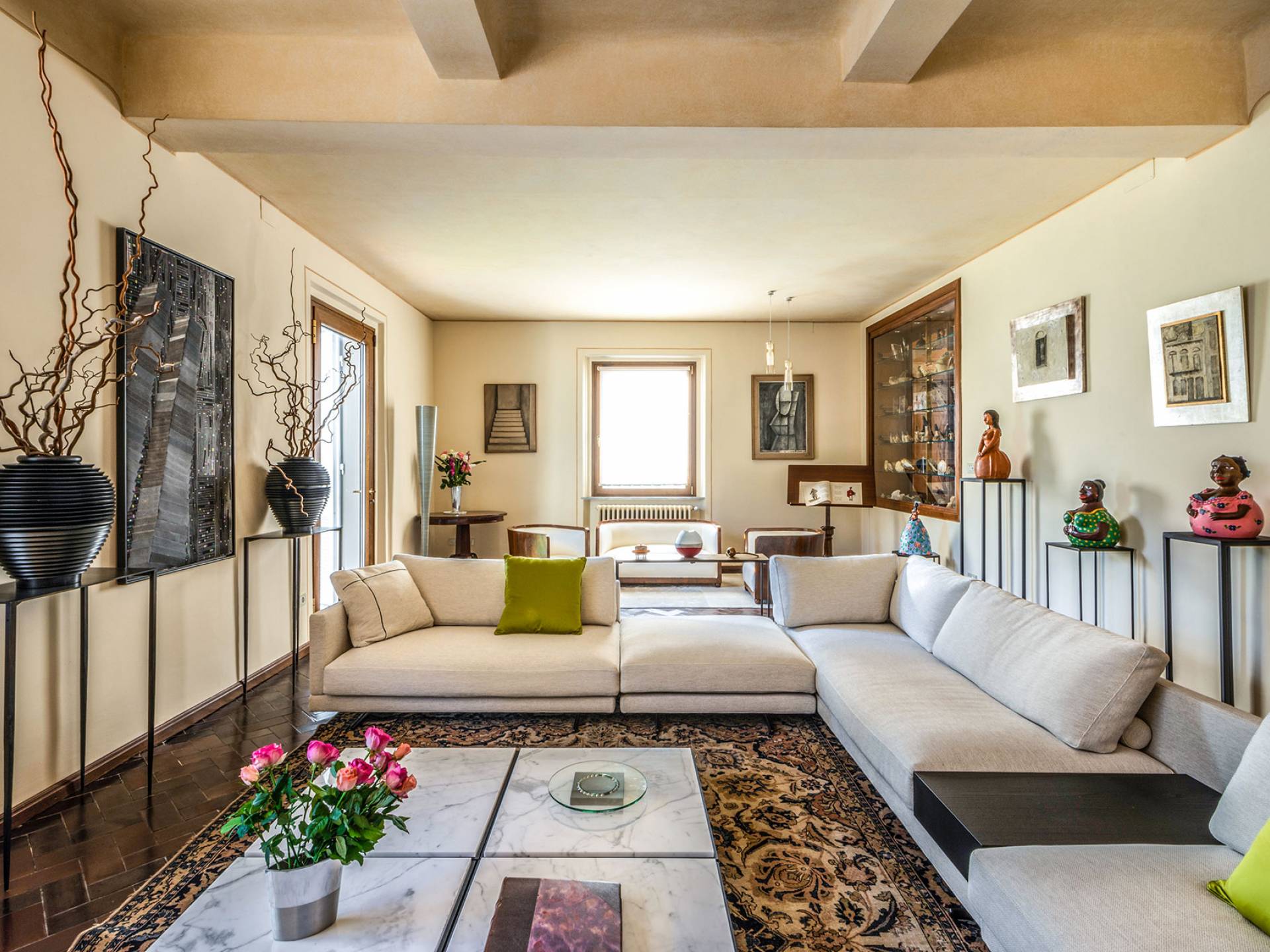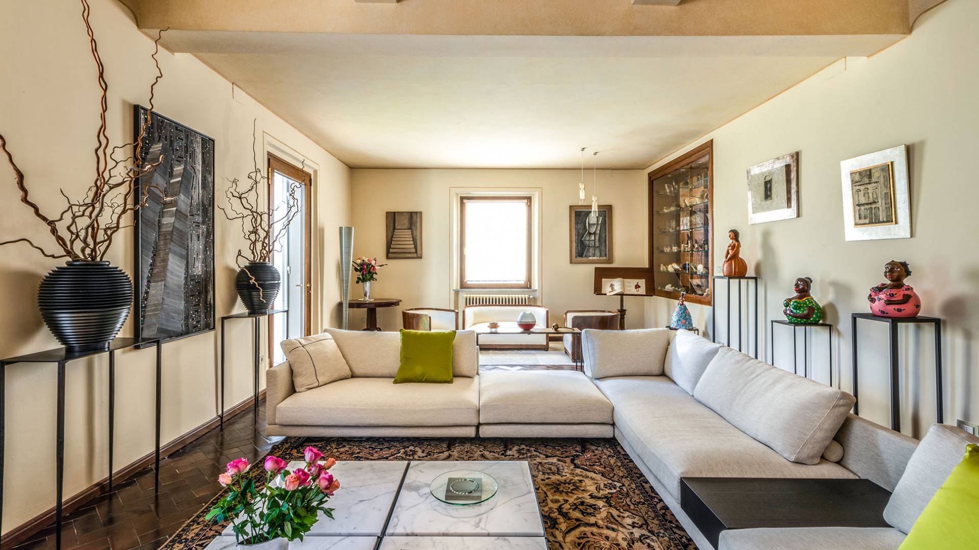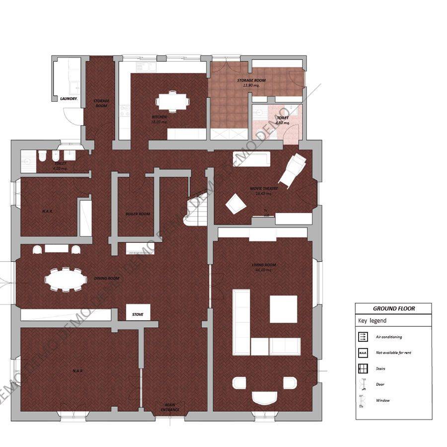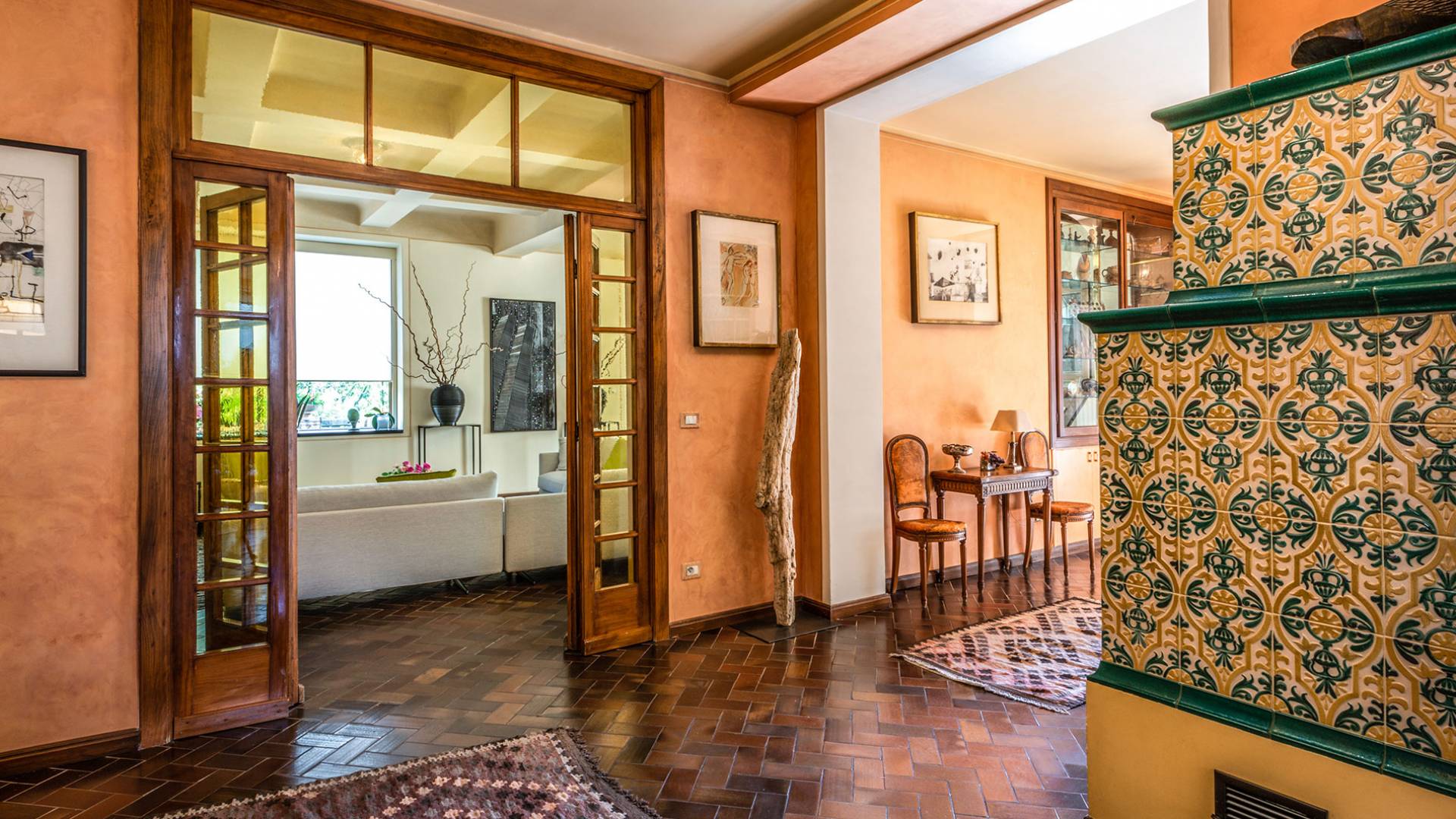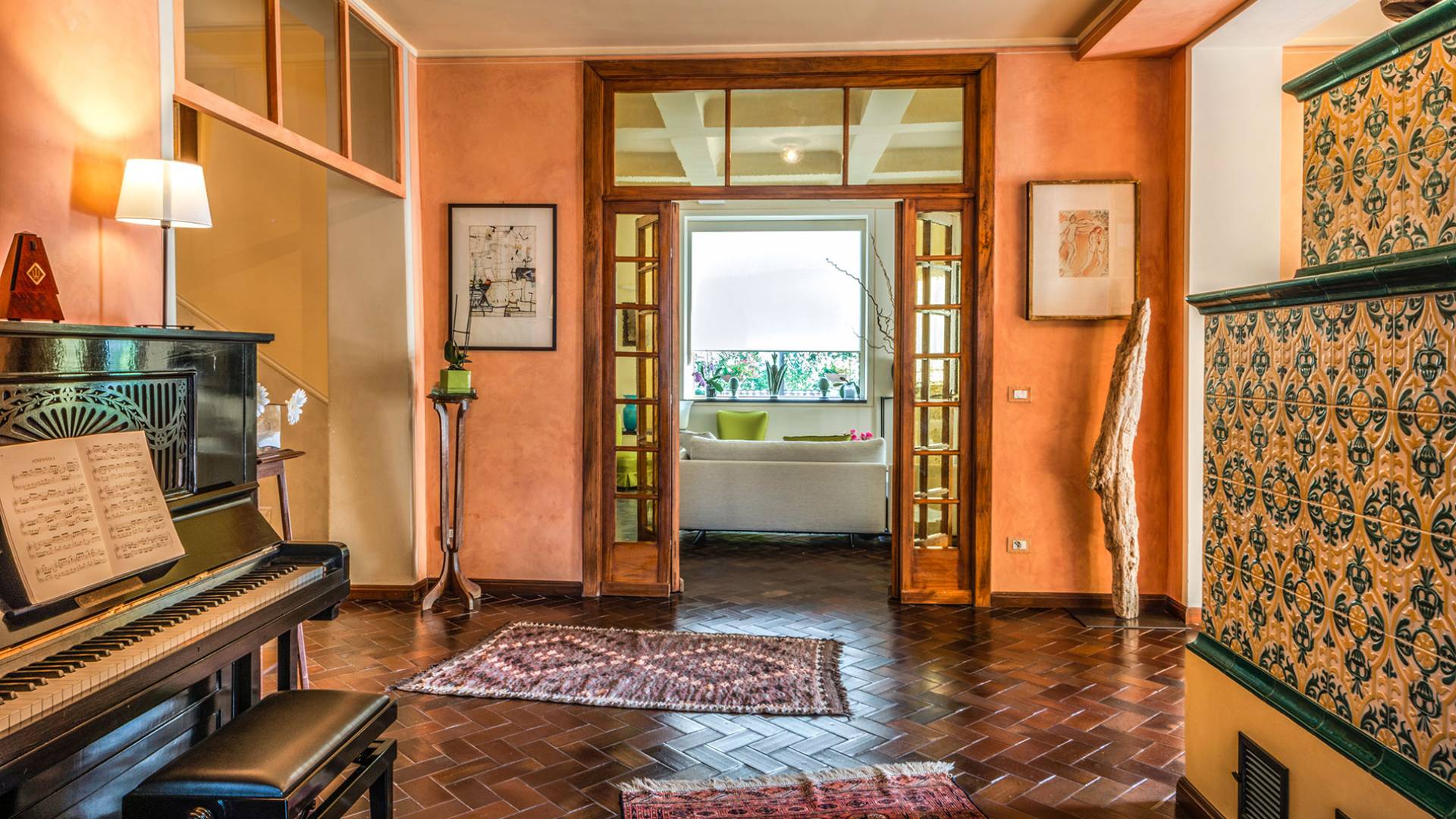 Dall'ingresso principale si accede ad un luminoso e ampio soggiorno con camino e divani. Attraverso porte-finestre si accede al giardino e a due gazebo, uno per aperitivi e relax, l'altro con tavolo da pranzo. Dall'altro lato del soggiorno, c'è un corridoio arredato con un'antica stufa veneziana in ceramica e un bel pianoforte verticale (Bechstein) che conduce al tavolo da pranzo. Un altro corridoio conduce a una cucina spaziosa e ben attrezzata con forno, microonde, frigorifero "side-by-side", tostapane, macchina da caffè Nespresso, lavastoviglie e tavolo per la colazione. Dalla cucina si accede facilmente al giardino e ai gazebo. Gli ospiti possono inoltre usufruire di una sala home theatre dotata di TV satellitare, lettori CD/DVD e impianto stereo di alta qualità. Due bagni con doccia compongono il resto di questo piano.