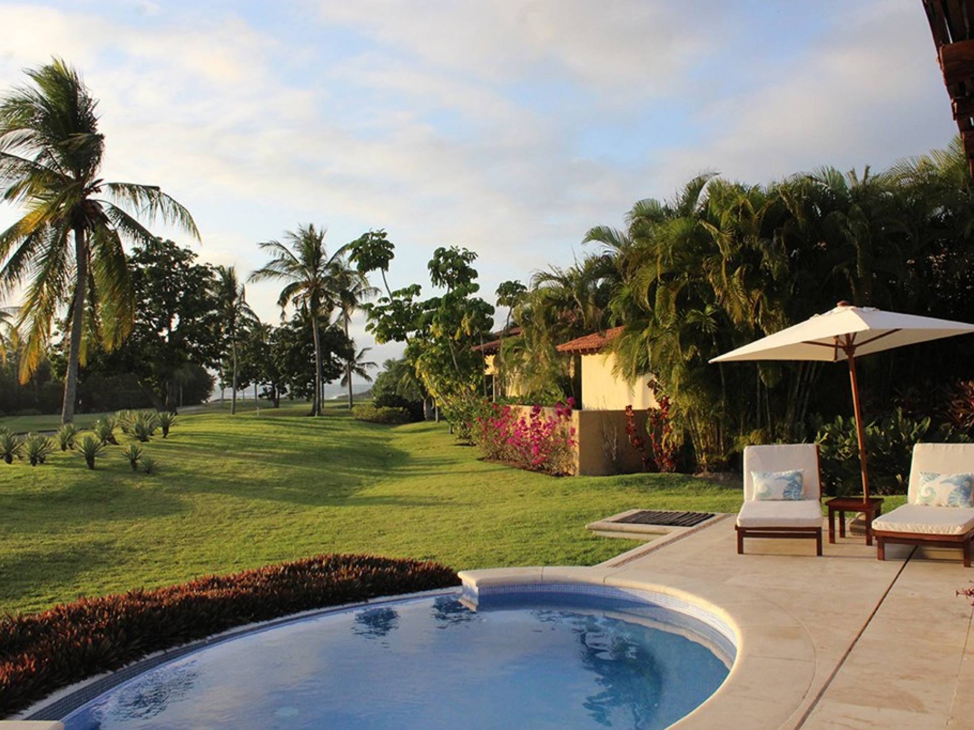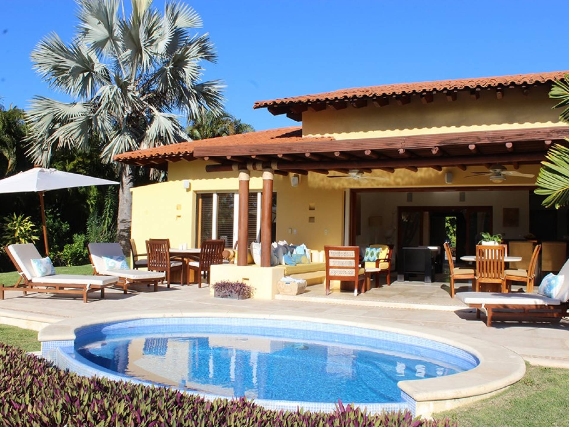 Las Palmas 5 Punta Mita è una villa di lusso in affitto con 3 camere da letto e una piscina privata. Vicino al 4° fairway del campo da golf Jack Nicklaus Signature Pacifico, dove puoi vedere il famoso green dell'isola "Coda della balena", Las Palmas 5 incarna lo stile di vita all'aria aperta di Punta Mita.