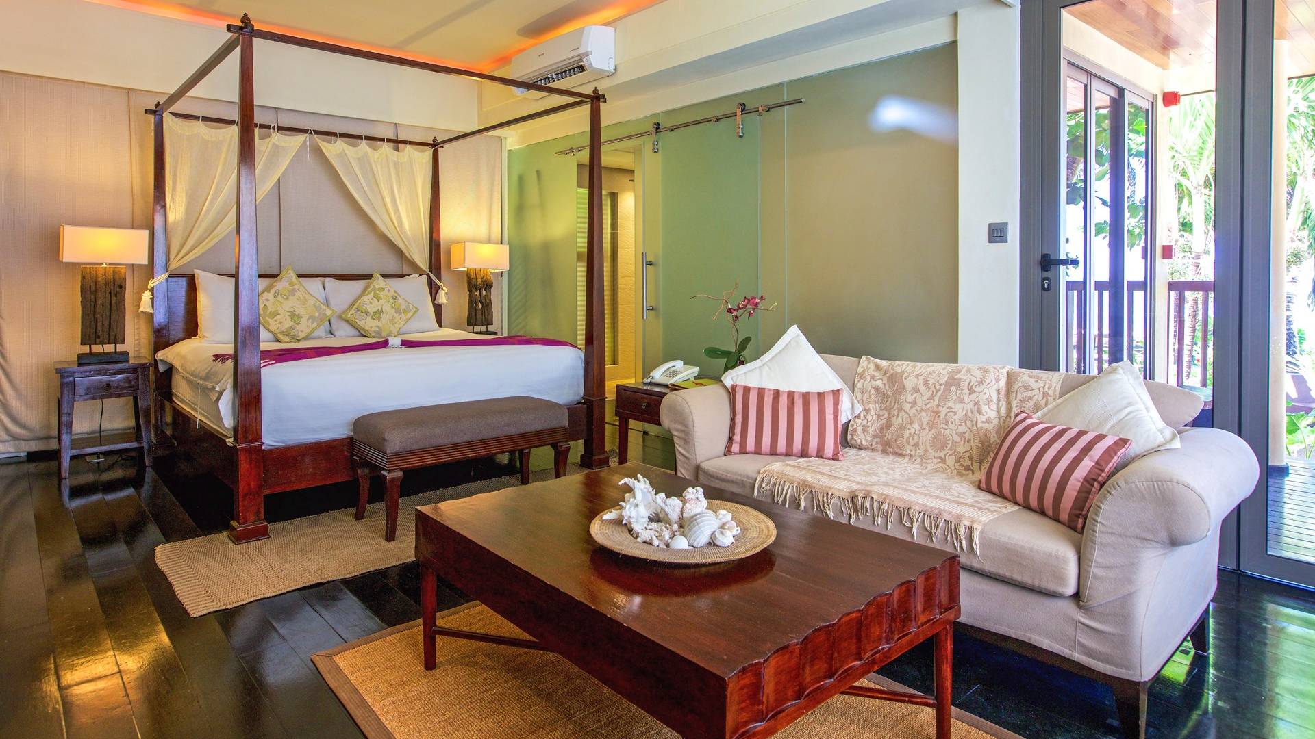 La suite con vista sull'oceano infonde un arredamento moderno e spazioso con lo stile e la raffinatezza tradizionali delle Seychelles. Dotata di un lussuoso letto king-size, un'accogliente area soggiorno, una doccia con getto a pioggia, il proprio balcone privato e l'accesso diretto al lungomare mozzafiato di Praslin, questa suite è l'ideale per coloro che vogliono svegliarsi con una vista perfetta sull'oceano.