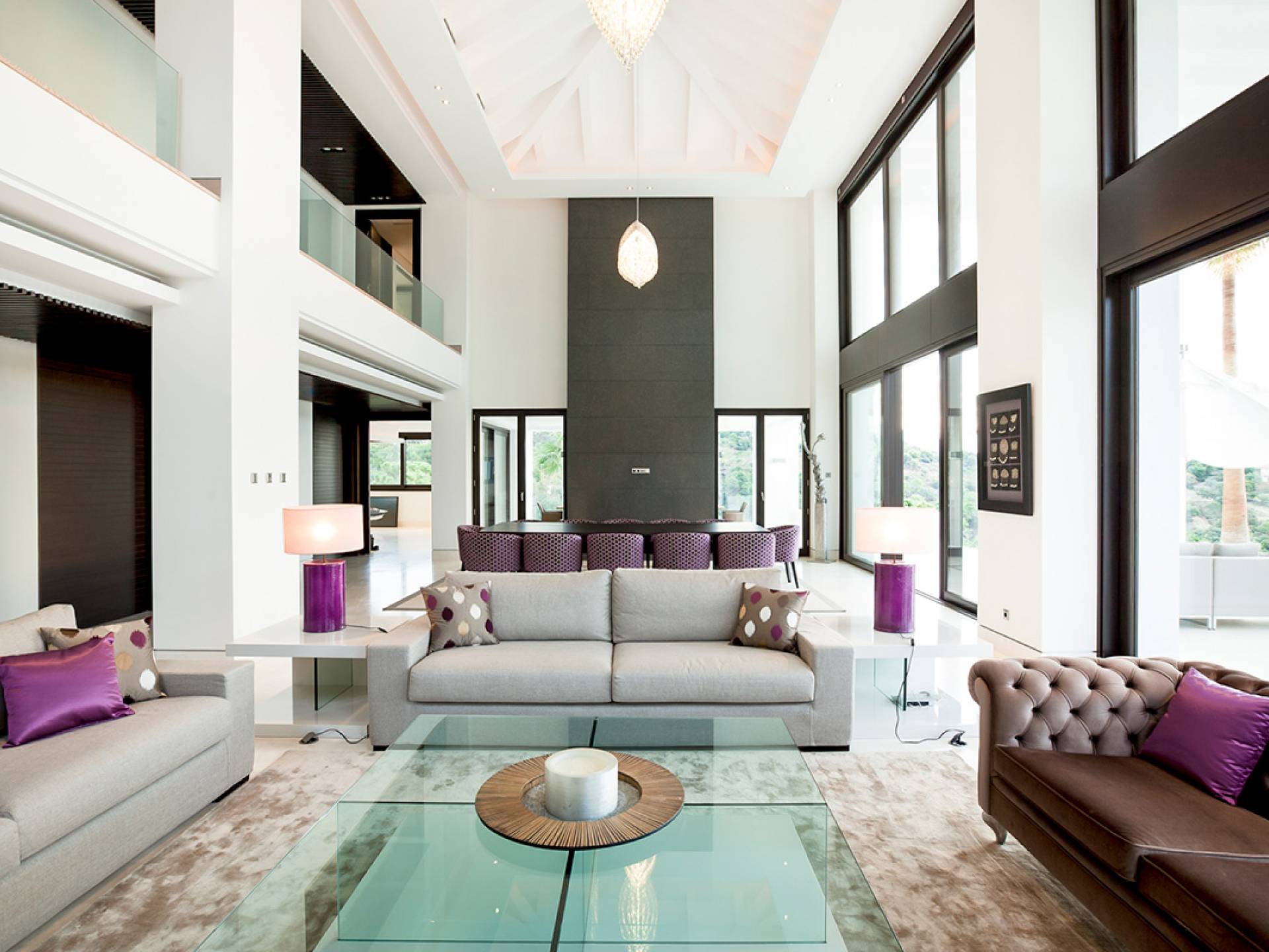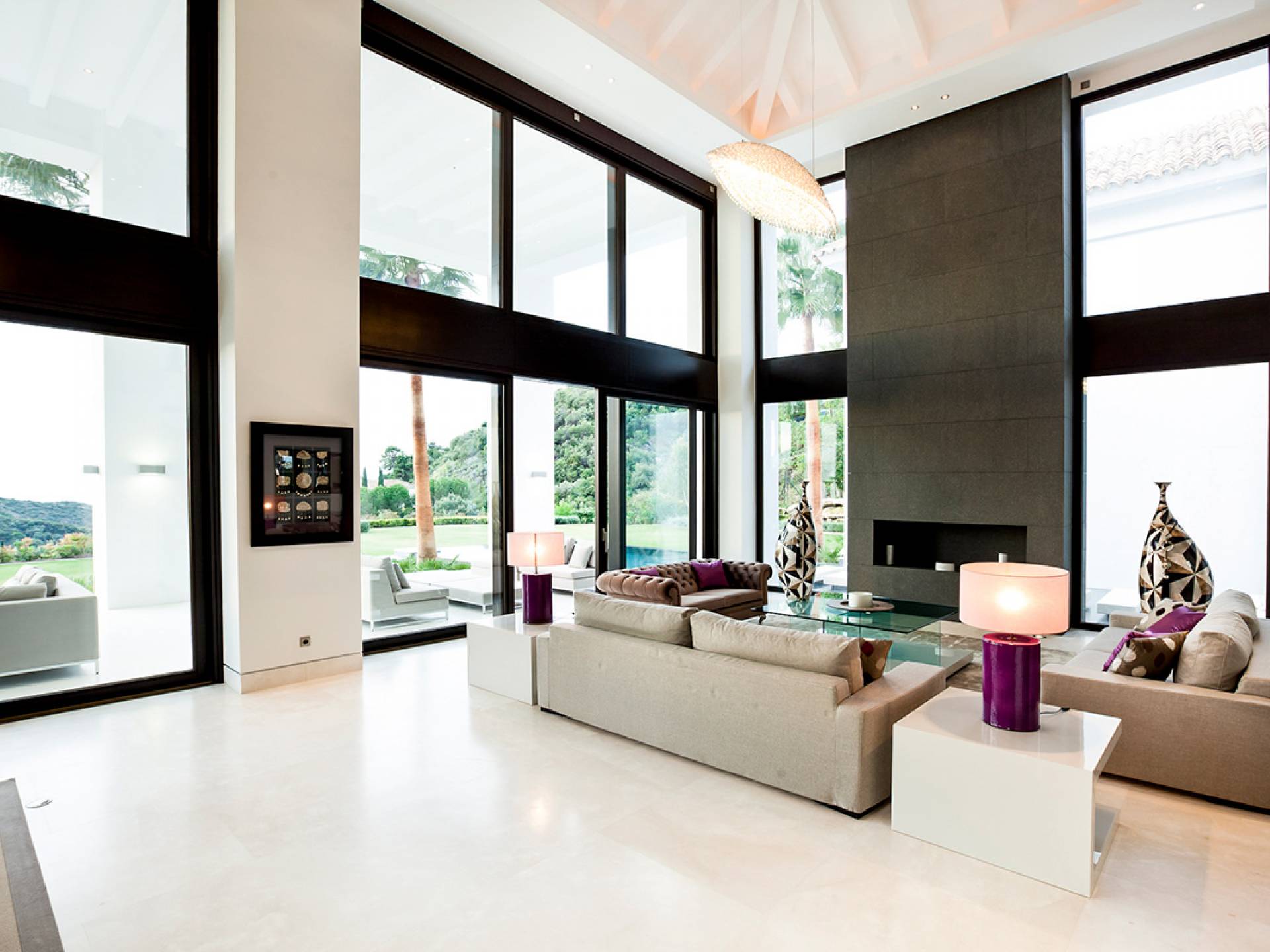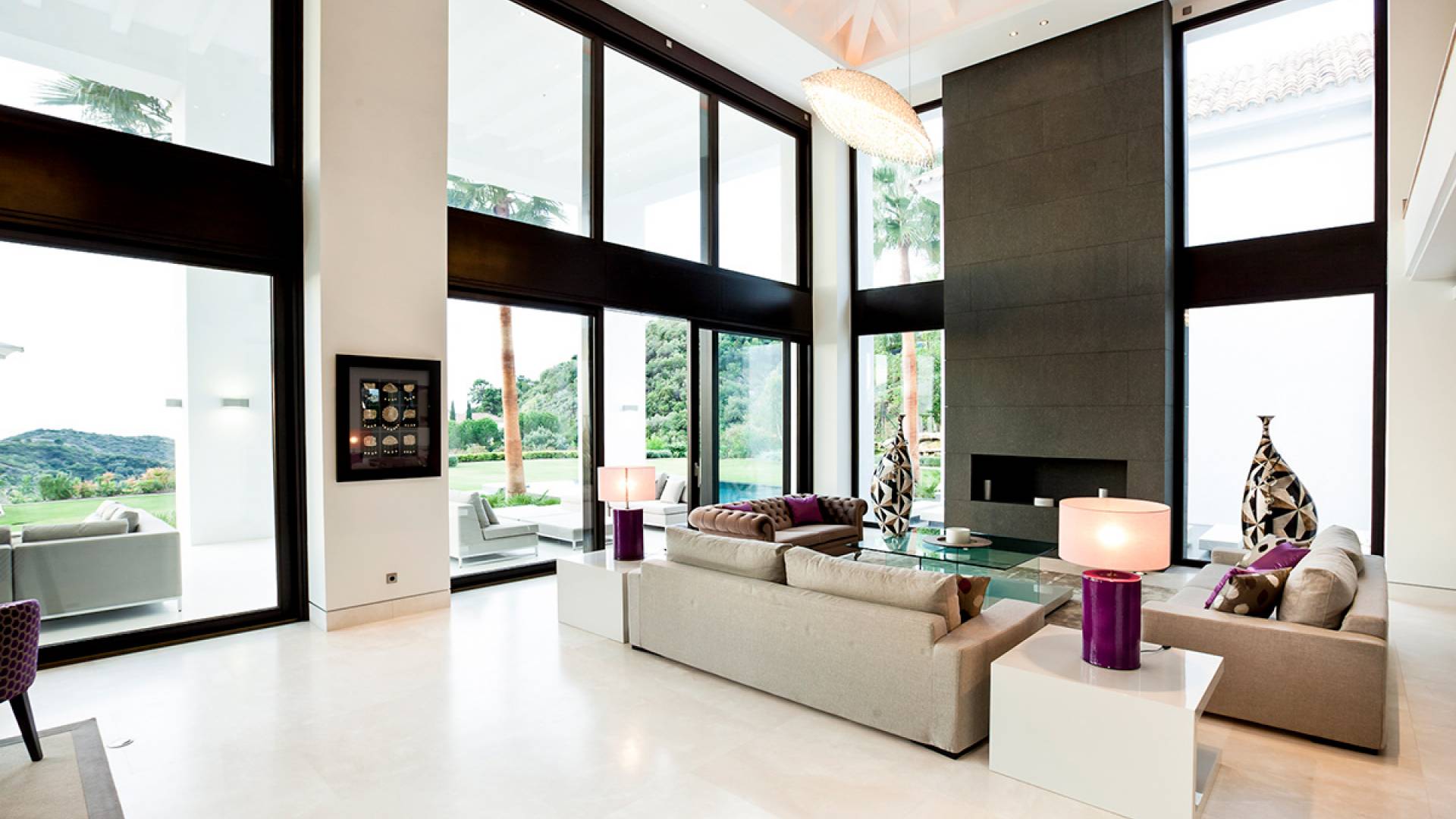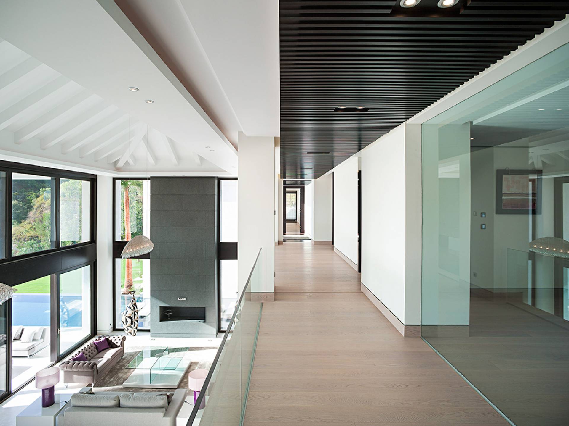 Villa Palo Alto Marbella è una villa di lusso in affitto con 5 camere da letto e piscina privata. Situata a "La Zagaleta", una delle residenze private più esclusive della Spagna, questa bellissima villa è l'epitome del lusso e della vita di alto livello. Suddivisa su tre piani e situata in un tranquillo parco privato, Villa Palo Alto Marbella offre agli ospiti un livello impareggiabile di comfort, spazio e luce. Le pareti bianche, le finestre a due piani bordate di metallo scuro e la cornice grigia piatta del camino conferiscono alla grande sala di Villa Palo Alto un'atmosfera moderna e all'aperto.