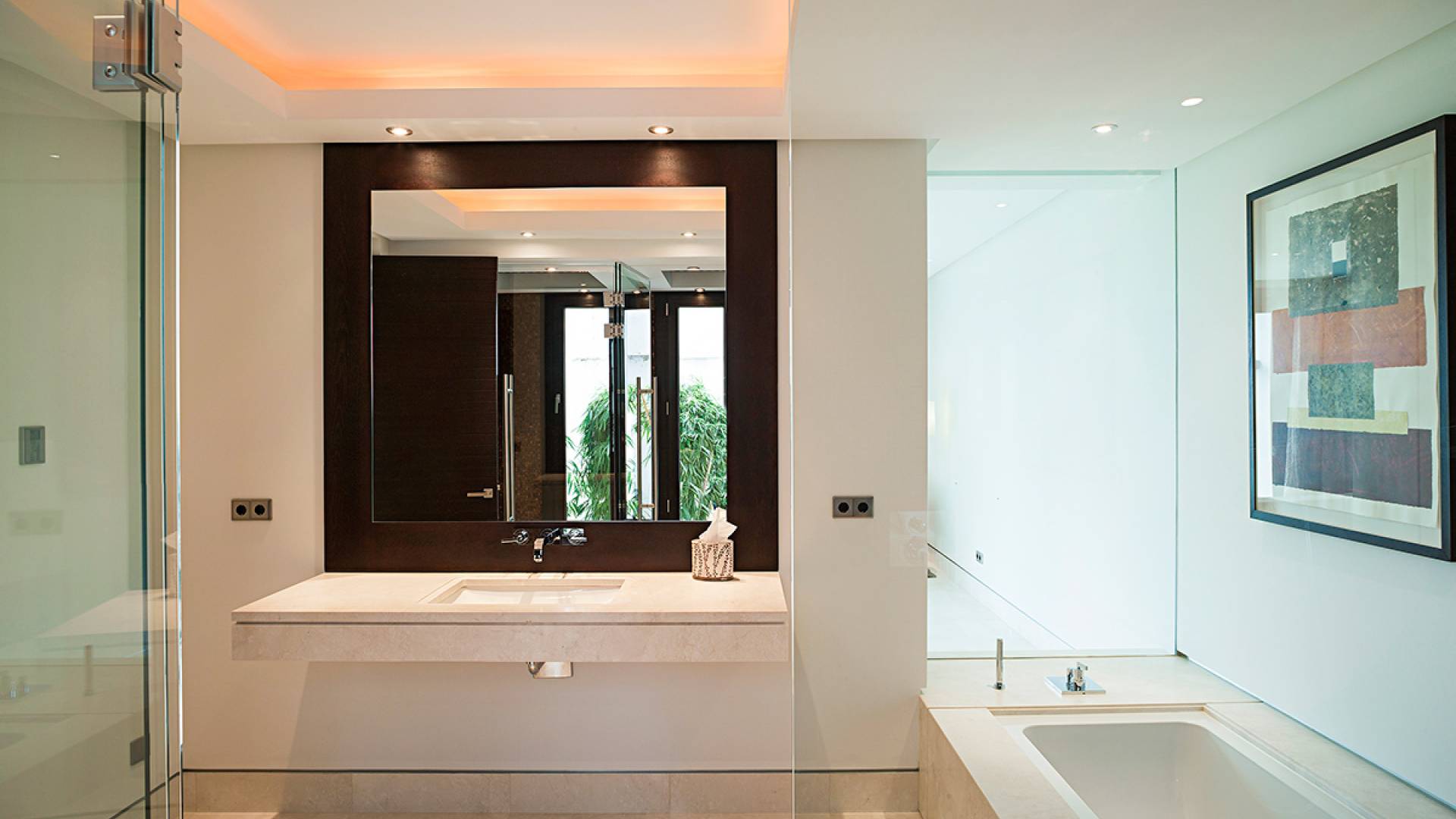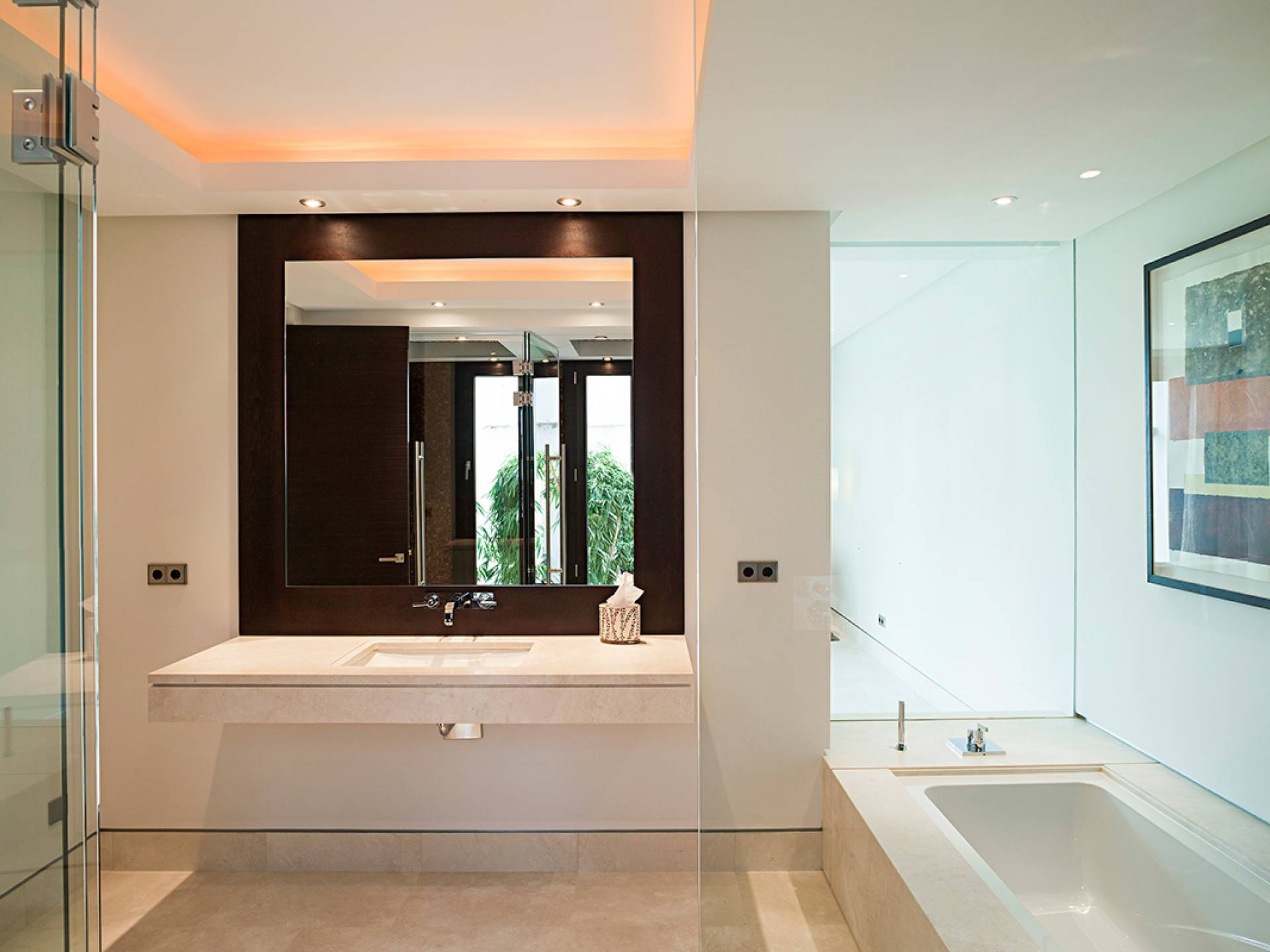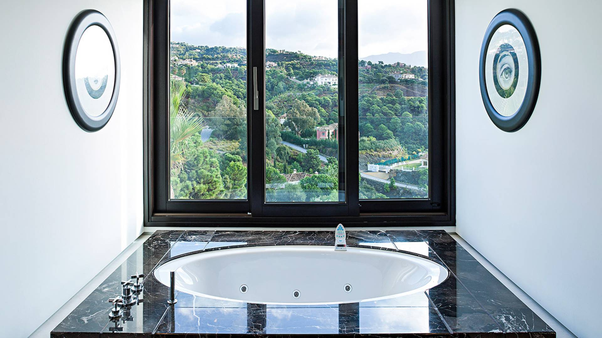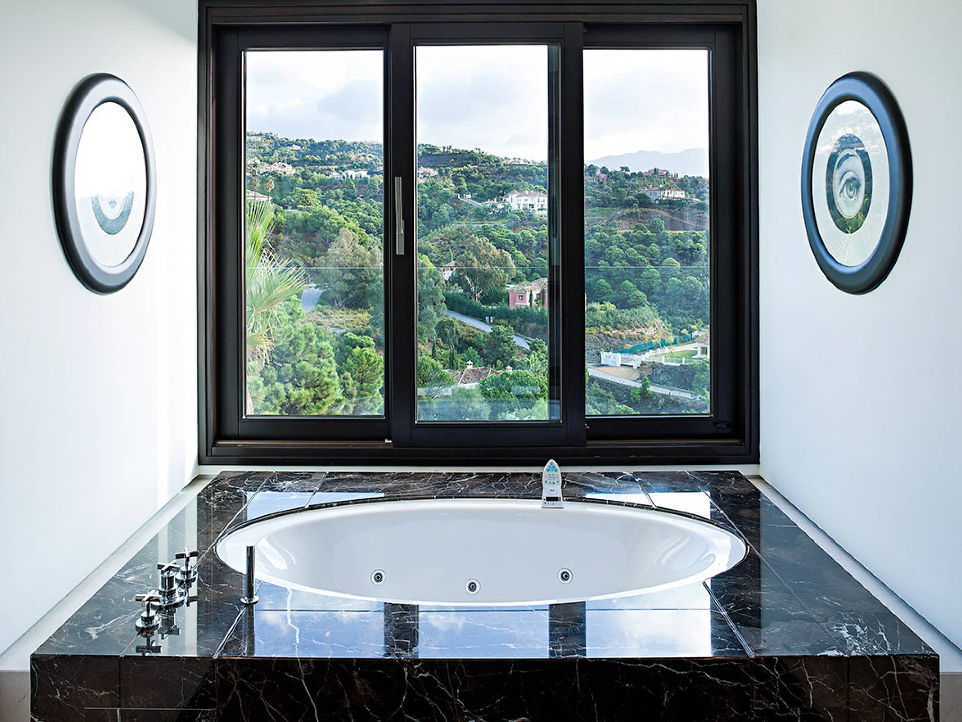 Villa Palo Alto Marbella è una villa di lusso in affitto con 5 camere da letto e piscina privata. Situata a "La Zagaleta", una delle residenze private più esclusive della Spagna, questa bellissima villa è l'epitome del lusso e della vita di alto livello. Suddivisa su tre piani e situata in un tranquillo parco privato, Villa Palo Alto Marbella offre agli ospiti un livello impareggiabile di comfort, spazio e luce. Le pareti bianche, le finestre a due piani bordate di metallo scuro e la cornice grigia piatta del camino conferiscono alla grande sala di Villa Palo Alto un'atmosfera moderna e all'aperto.