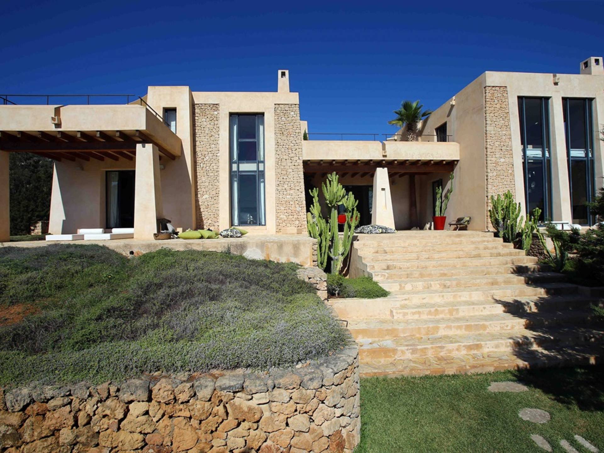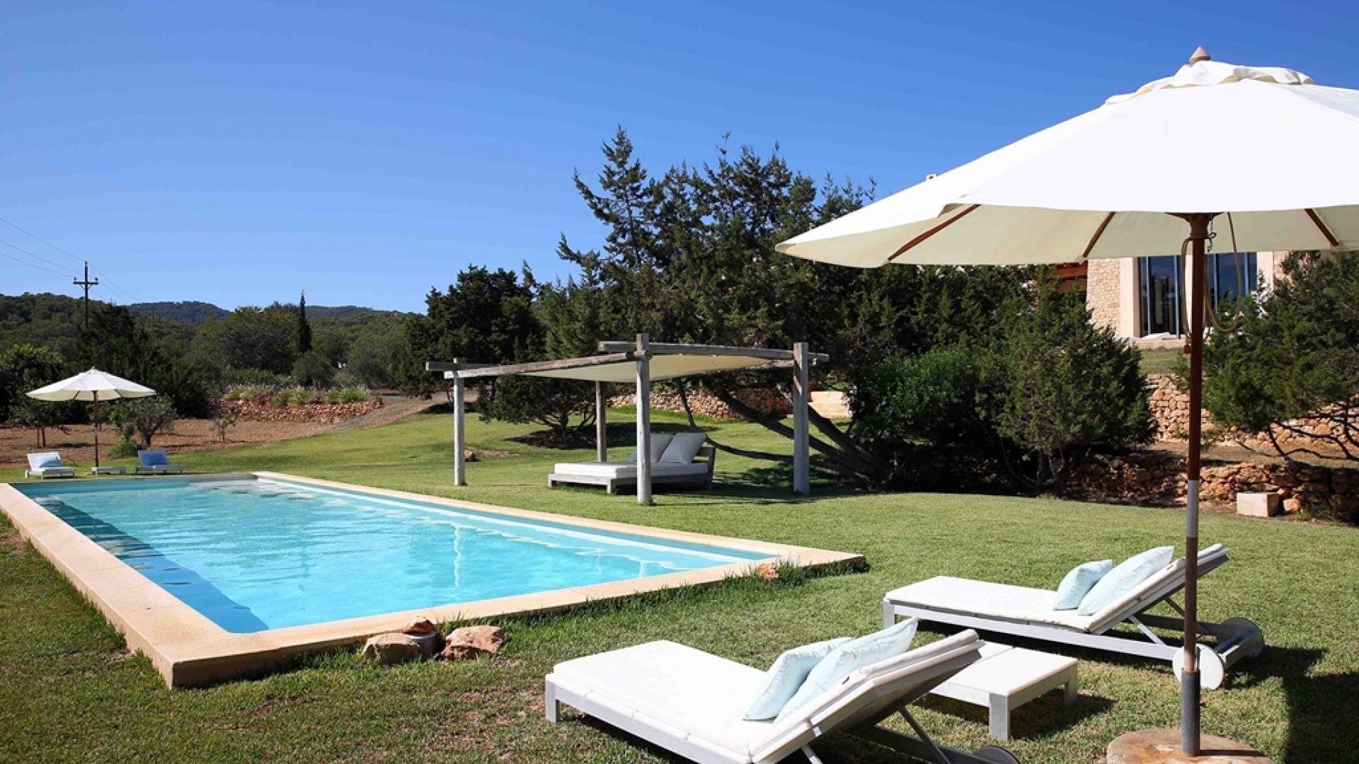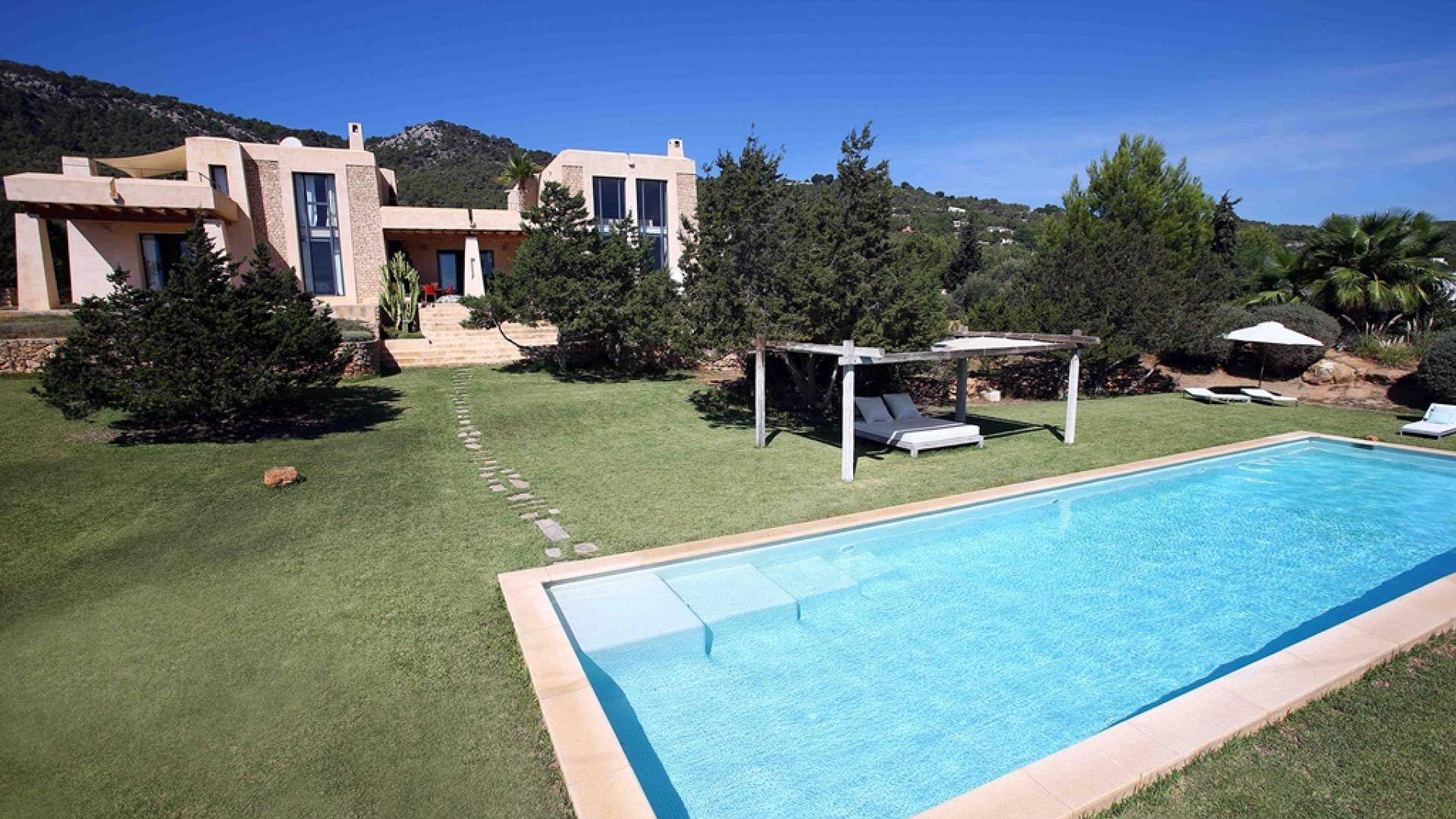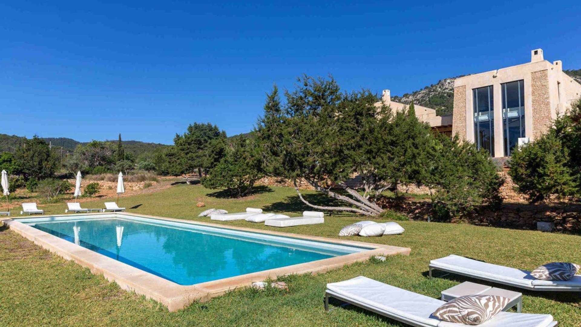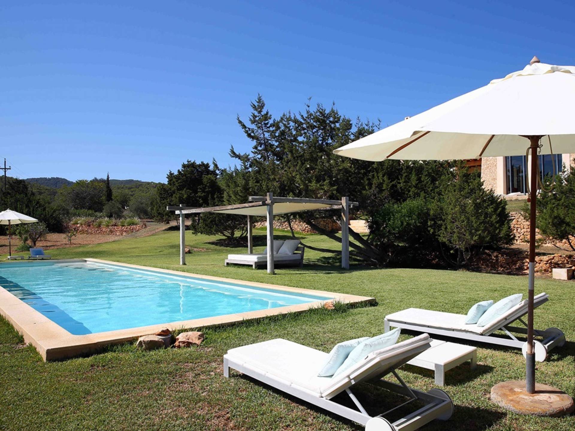 Ci sono ampie terrazze, prati, aree relax e terrazze per mangiare che circondano la splendida piscina. I lettini sono Gandia Blasco e i mobili sono di Philippe Starck. Situato a Es Cubells, vicino a San Jose, nel sud di Ibiza. Distanza da San José in auto: 7 minuti Distanza dalla città di Ibiza in auto: 15 minuti
