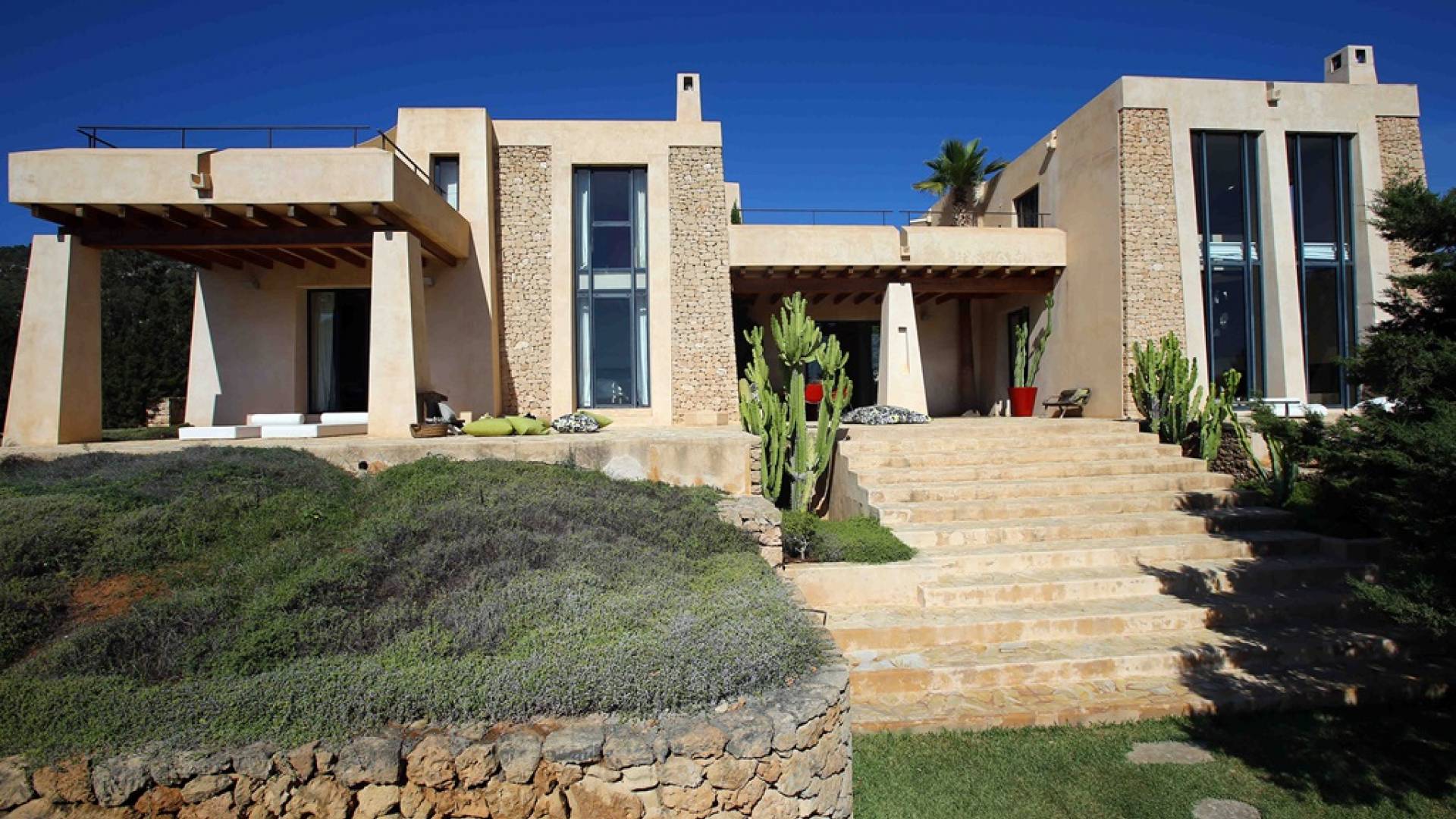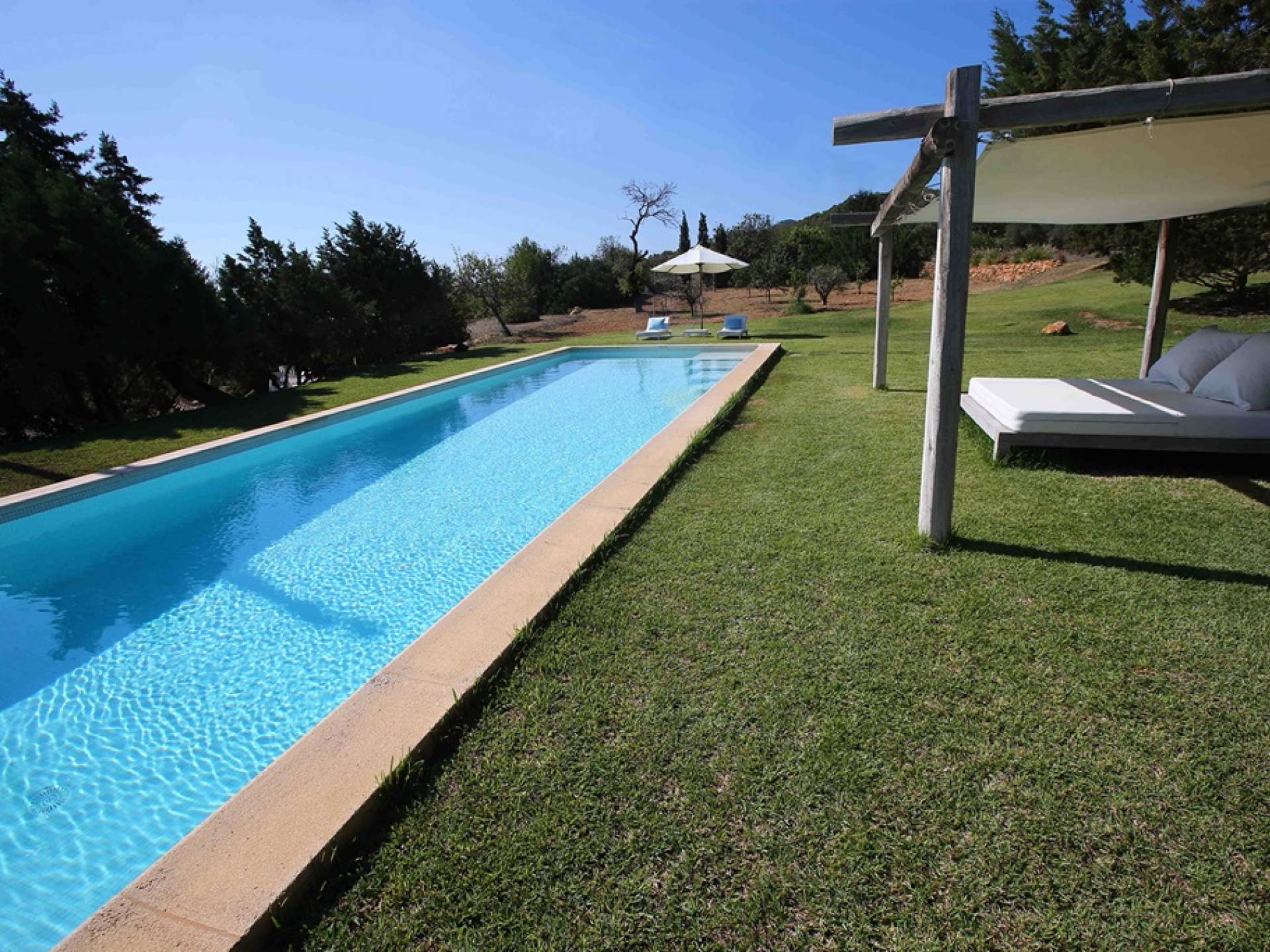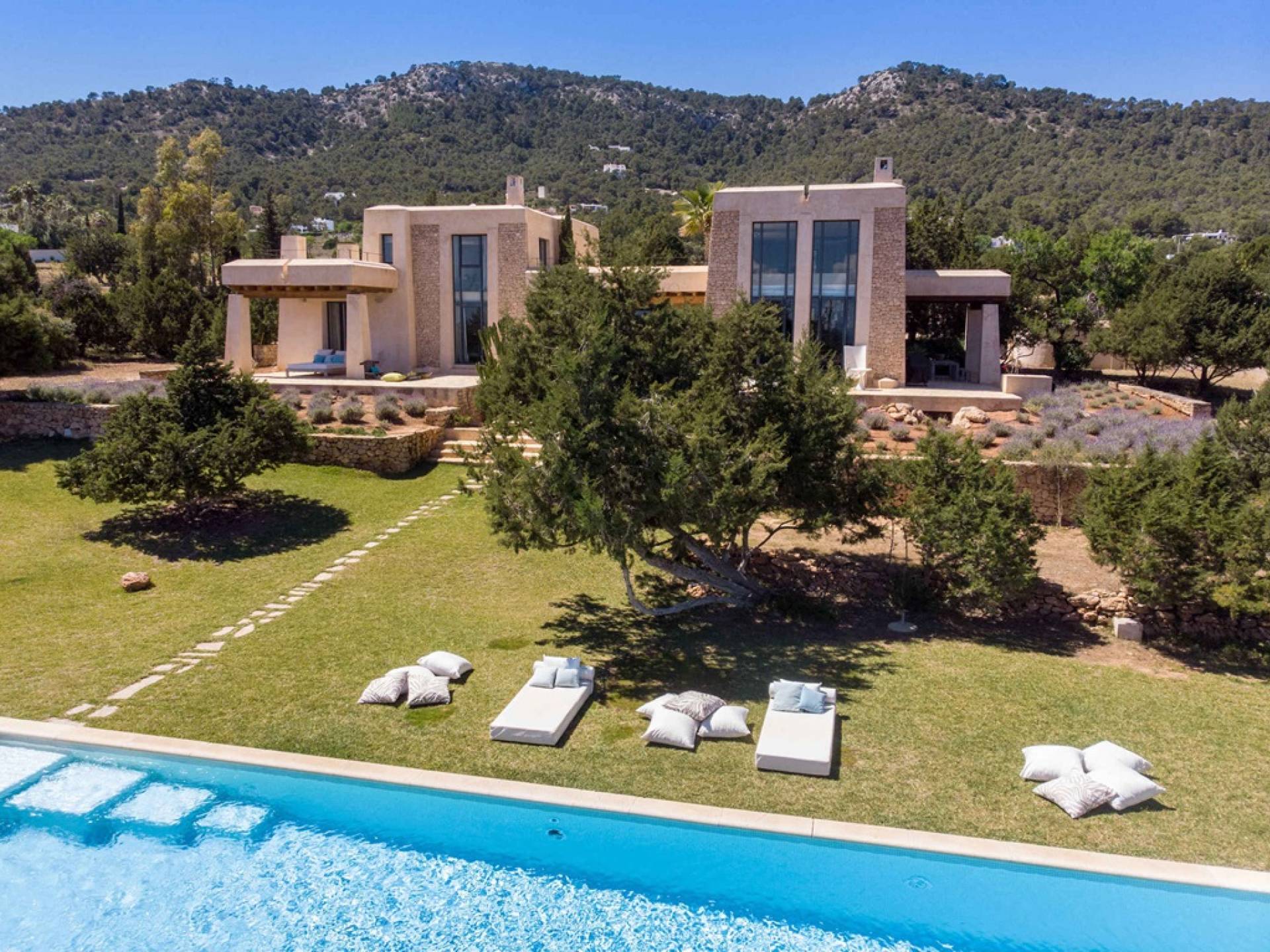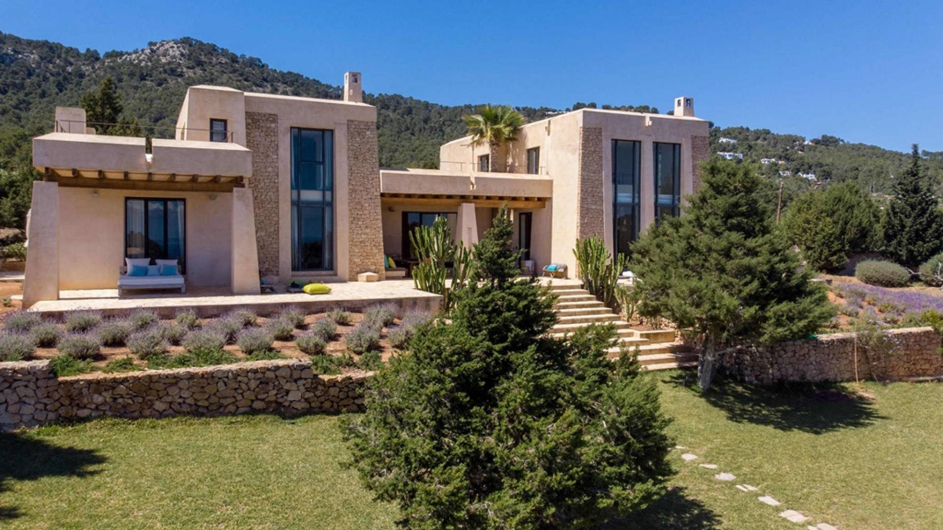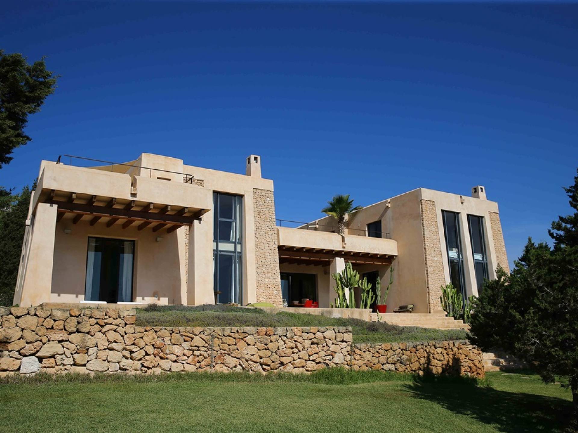 Ci sono ampie terrazze, prati, aree relax e terrazze per mangiare che circondano la splendida piscina. I lettini sono Gandia Blasco e i mobili sono di Philippe Starck. Situato a Es Cubells, vicino a San Jose, nel sud di Ibiza. Distanza da San José in auto: 7 minuti Distanza dalla città di Ibiza in auto: 15 minuti