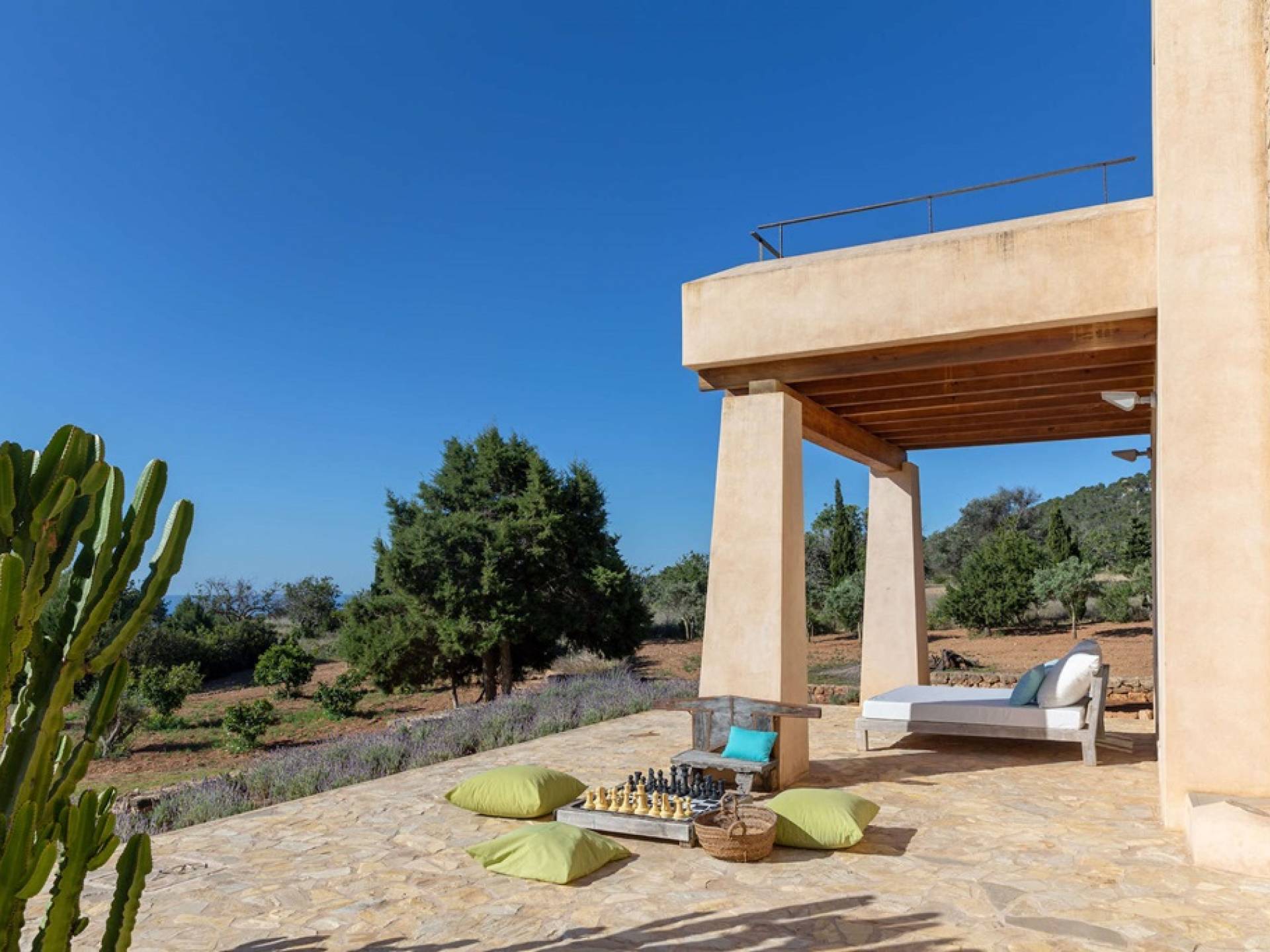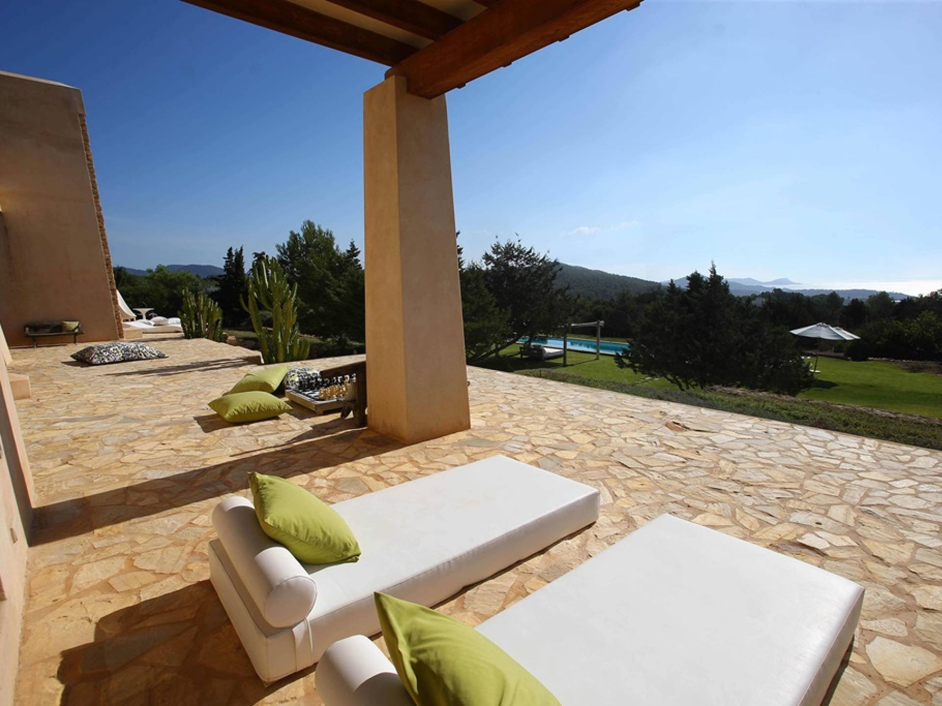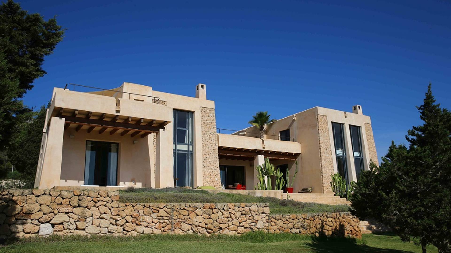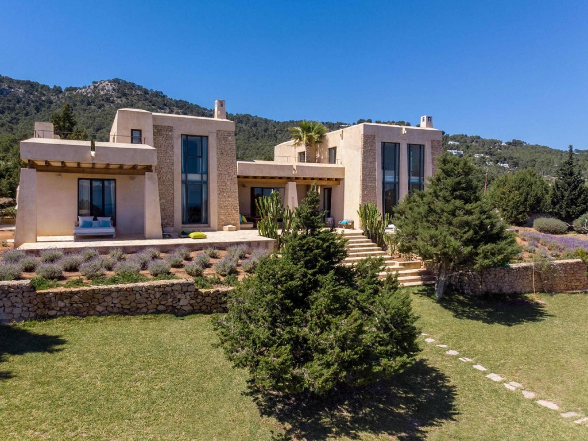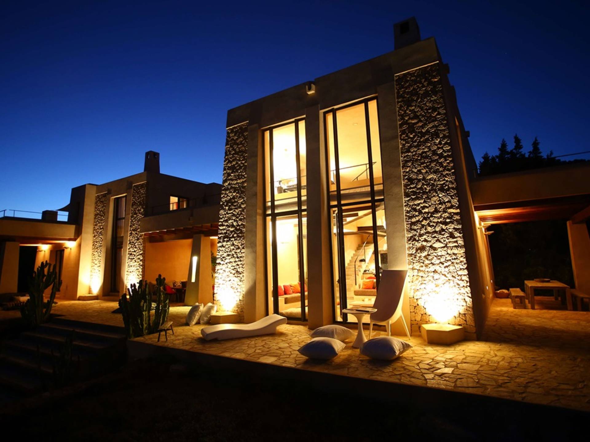 Ci sono ampie terrazze, prati, aree relax e terrazze per mangiare che circondano la splendida piscina. I lettini sono Gandia Blasco e i mobili sono di Philippe Starck. Situato a Es Cubells, vicino a San Jose, nel sud di Ibiza. Distanza da San José in auto: 7 minuti Distanza dalla città di Ibiza in auto: 15 minuti