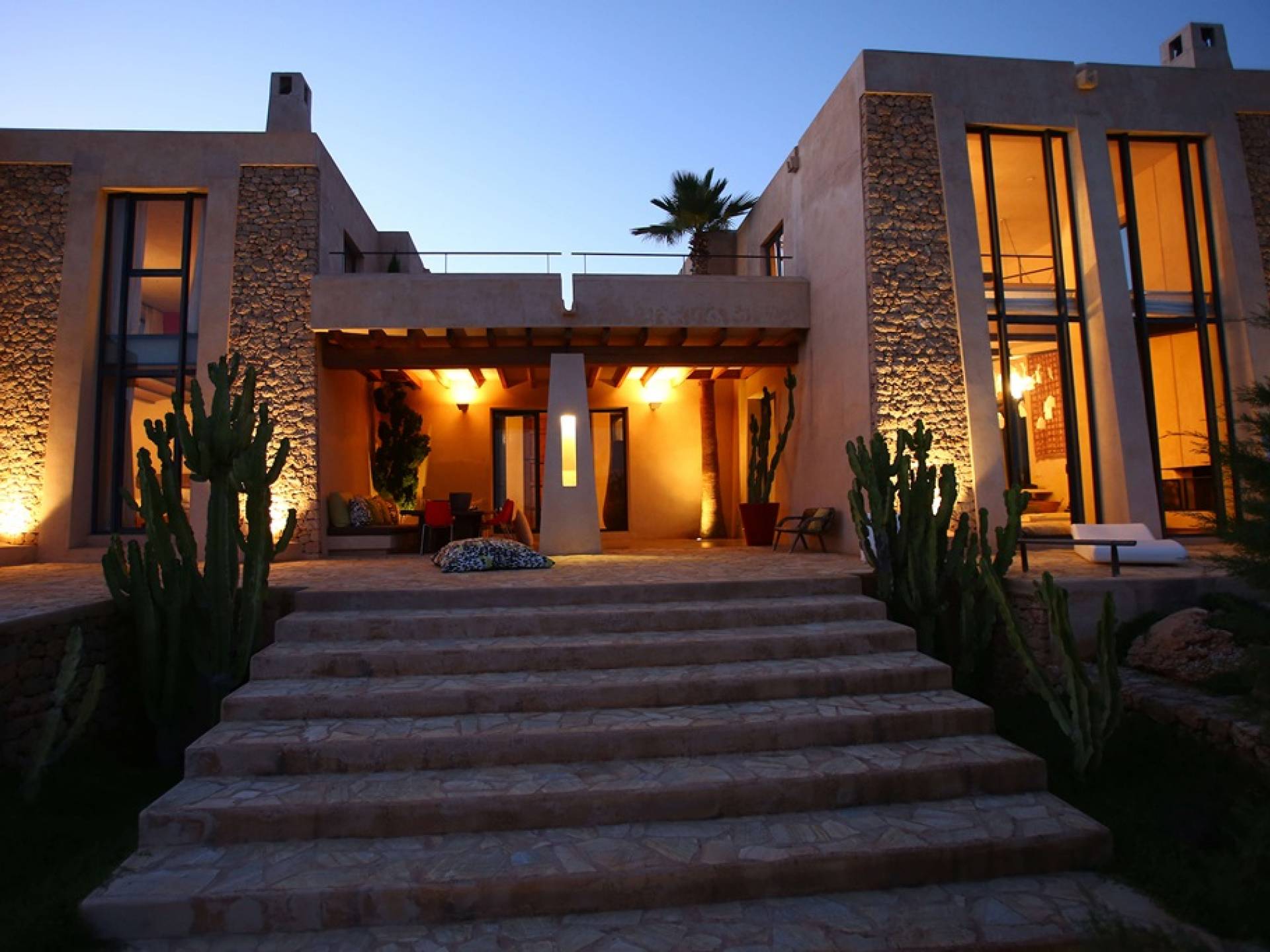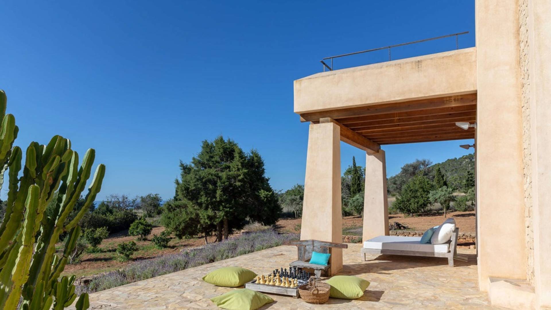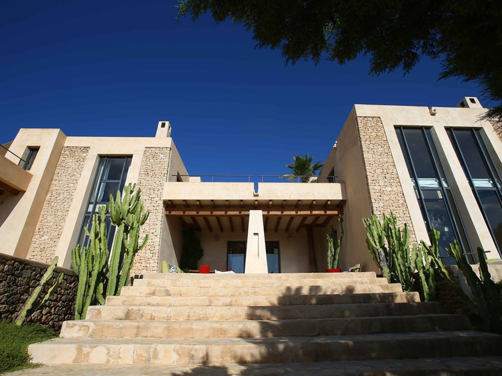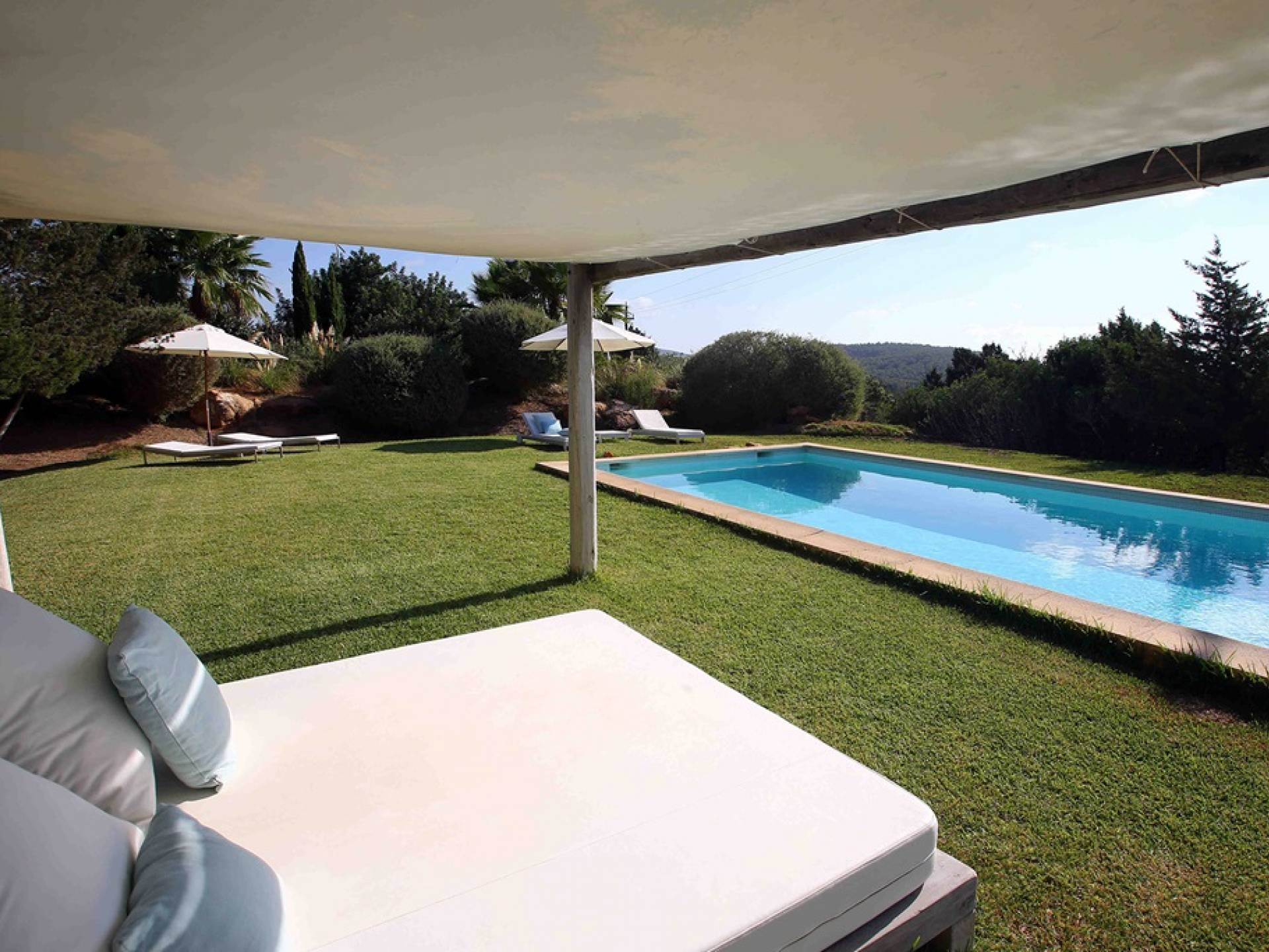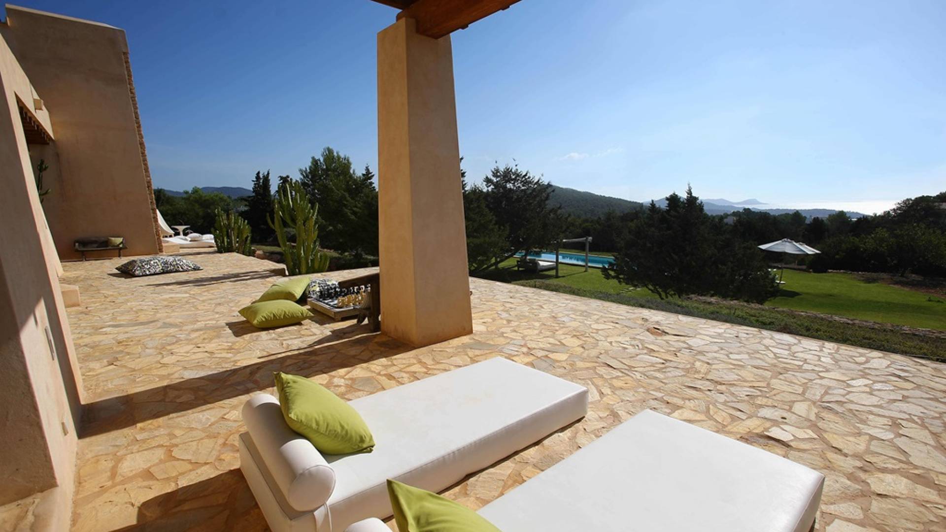 Ci sono ampie terrazze, prati, aree relax e terrazze per mangiare che circondano la splendida piscina. I lettini sono Gandia Blasco e i mobili sono di Philippe Starck. Situato a Es Cubells, vicino a San Jose, nel sud di Ibiza. Distanza da San José in auto: 7 minuti Distanza dalla città di Ibiza in auto: 15 minuti