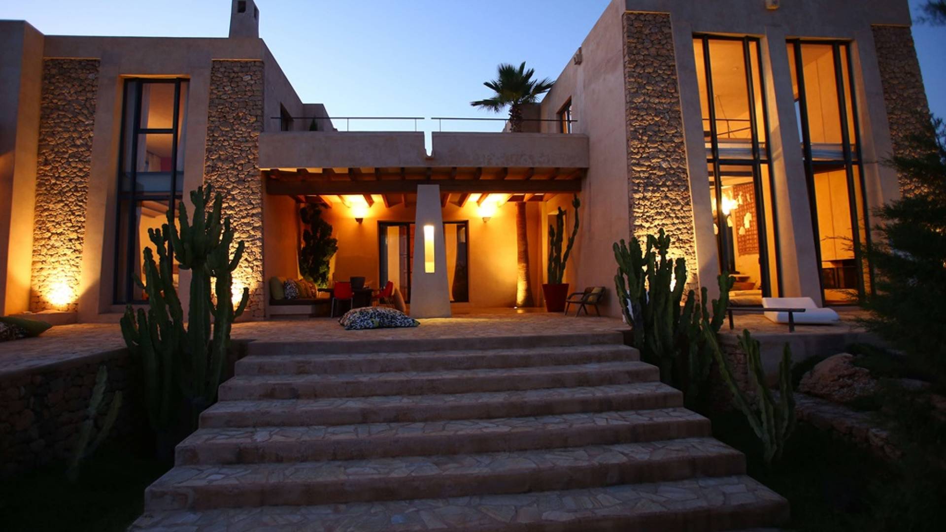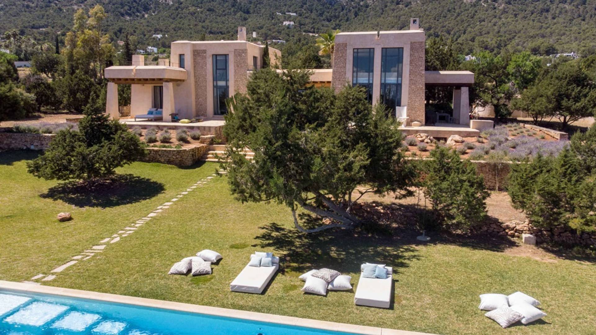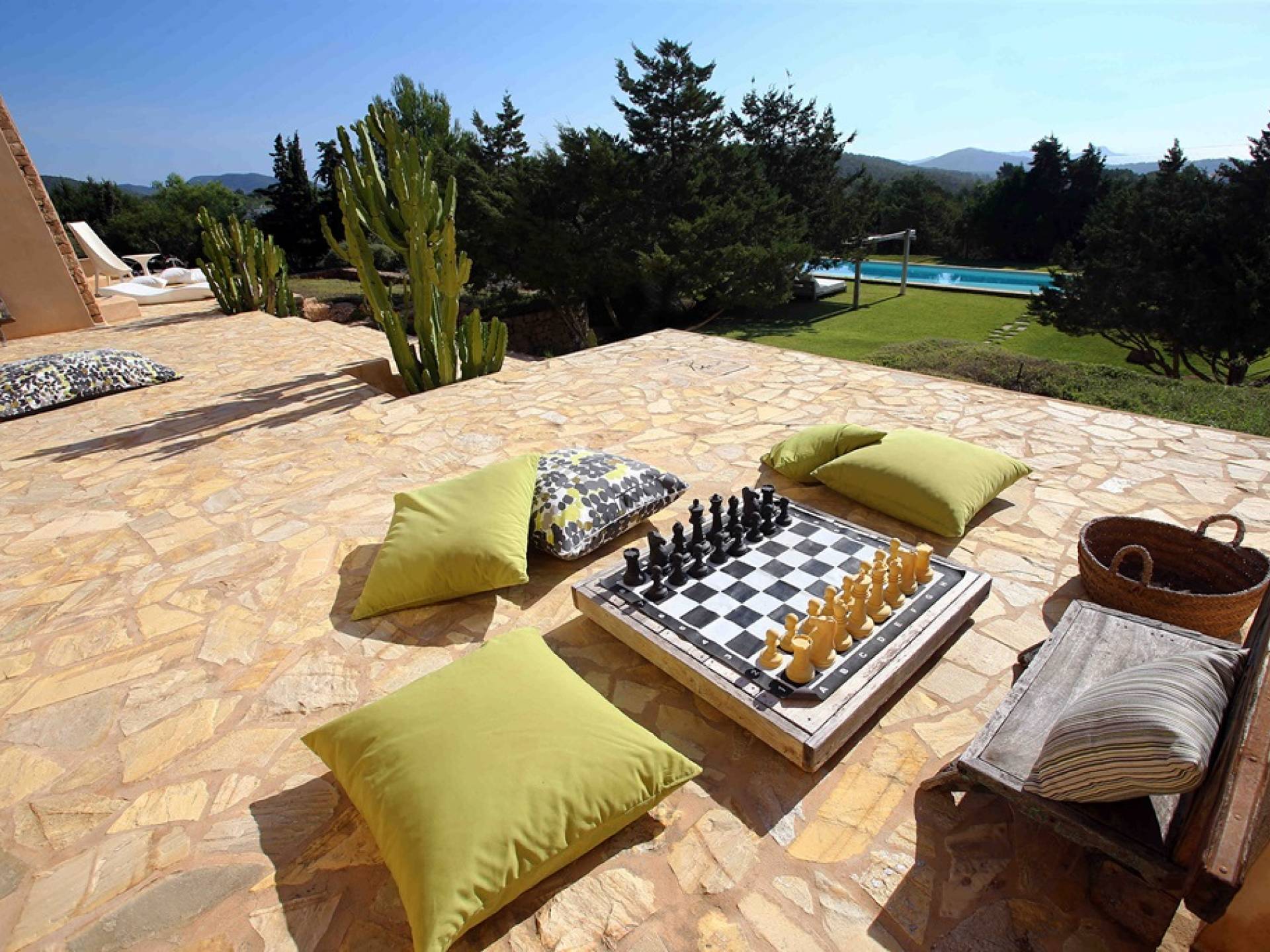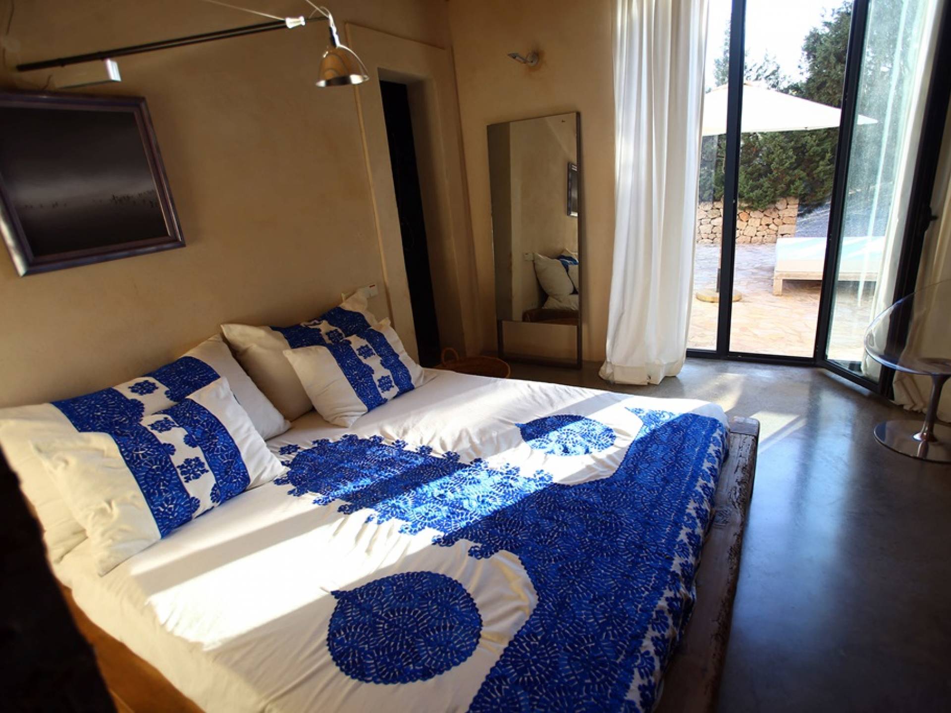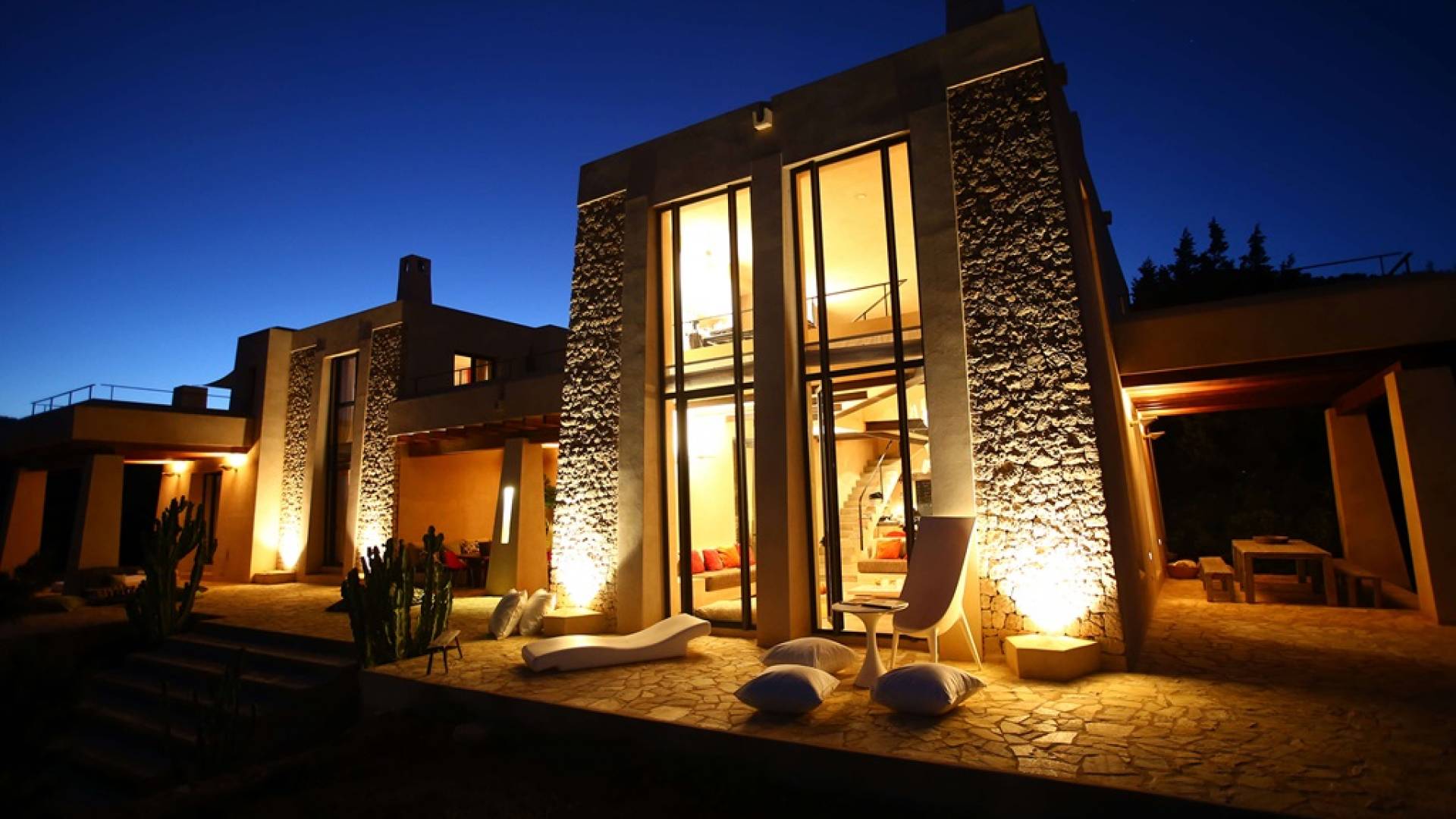 Ci sono ampie terrazze, prati, aree relax e terrazze per mangiare che circondano la splendida piscina. I lettini sono Gandia Blasco e i mobili sono di Philippe Starck. Situato a Es Cubells, vicino a San Jose, nel sud di Ibiza. Distanza da San José in auto: 7 minuti Distanza dalla città di Ibiza in auto: 15 minuti