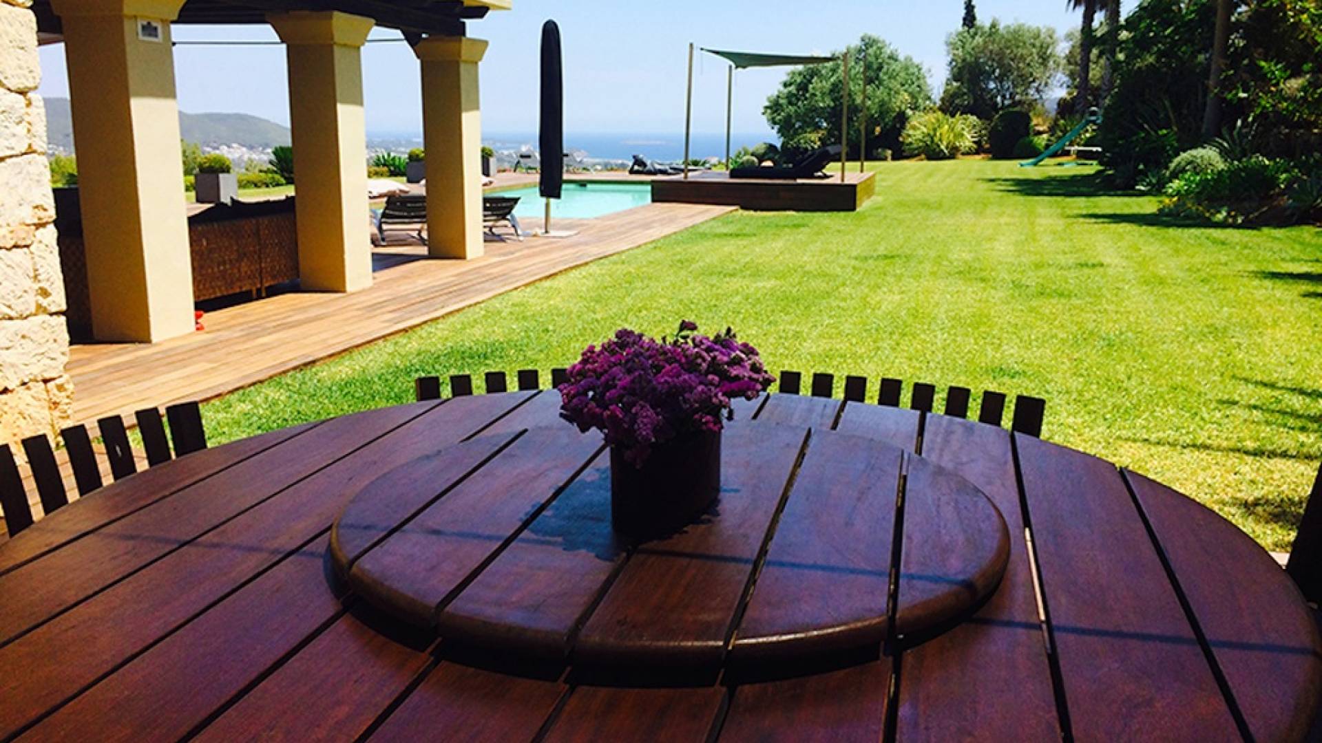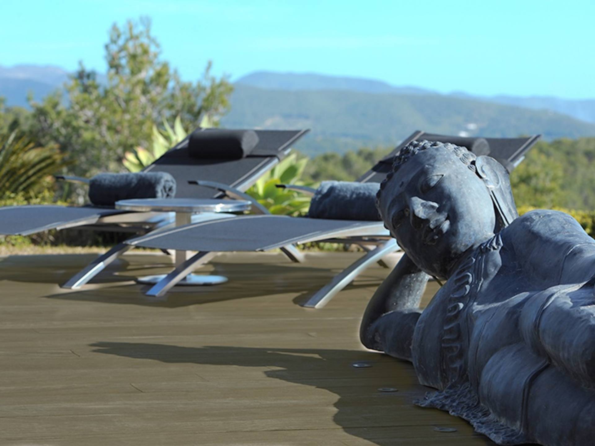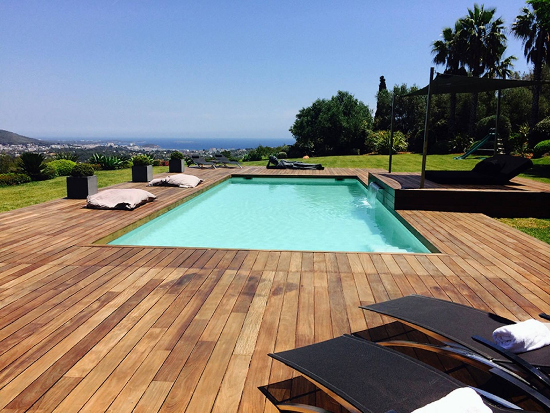 Ci sono vaste aree esterne tra cui una piscina con fontana a cascata, ampia zona chill-out, divano letto, lettini prendisole, ombrelloni, area giochi per bambini, un tavolo da pranzo rotondo all'aperto con lazy susan, un grande barbecue e un frigorifero esterno . Le terrazze coperte vantano comodi divani esterni e un sistema audio vuoto esterno, c'è anche un'amaca nascosta attaccata alle palme e un giardino di erbe aromatiche: origano, timo, salvia, citronella e peperoncini.