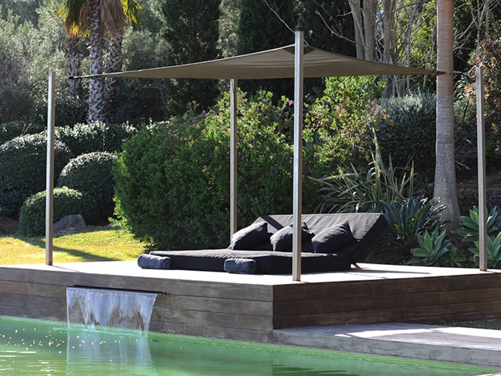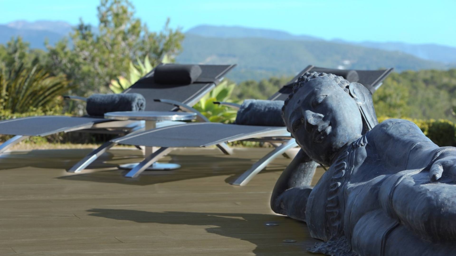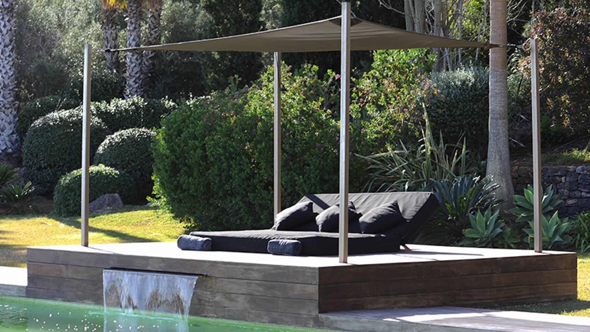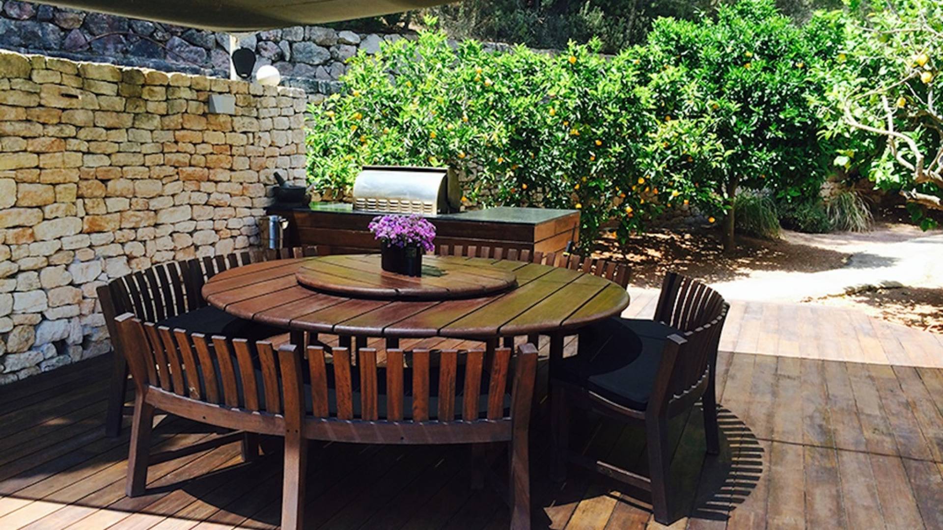 Ci sono vaste aree esterne tra cui una piscina con fontana a cascata, ampia zona chill-out, divano letto, lettini prendisole, ombrelloni, area giochi per bambini, un tavolo da pranzo rotondo all'aperto con lazy susan, un grande barbecue e un frigorifero esterno . Le terrazze coperte vantano comodi divani esterni e un sistema audio vuoto esterno, c'è anche un'amaca nascosta attaccata alle palme e un giardino di erbe aromatiche: origano, timo, salvia, citronella e peperoncini.