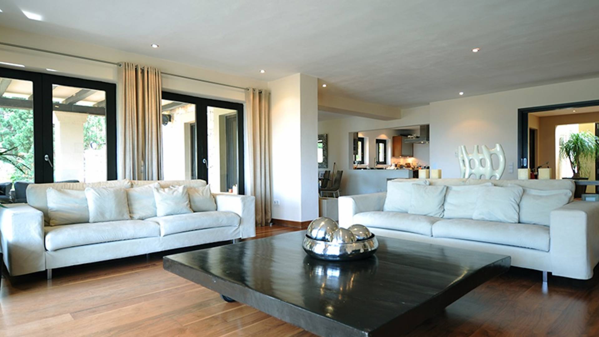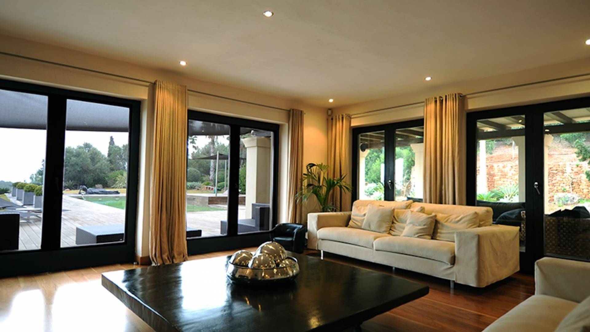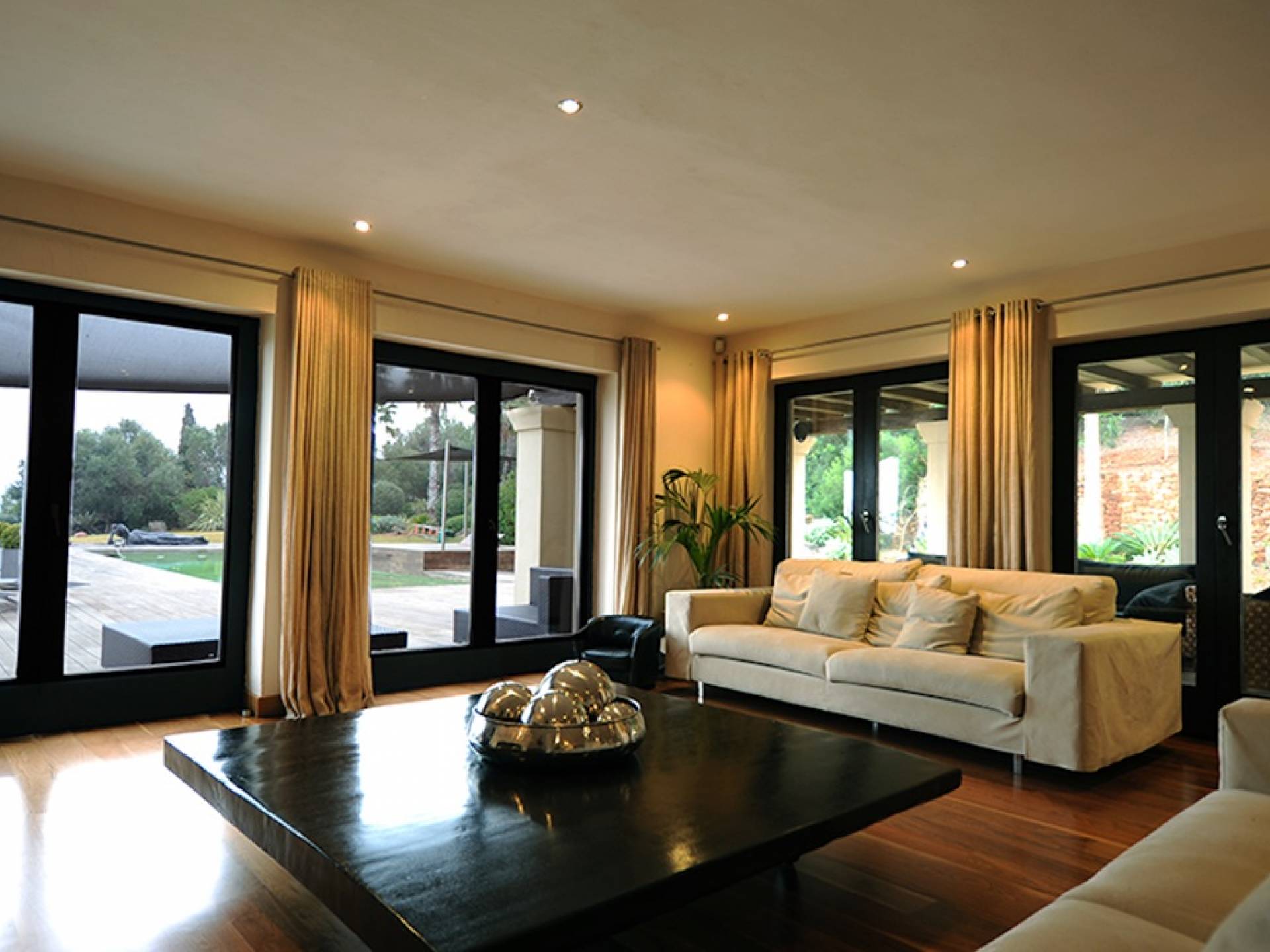 Questa villa ha uno stile raffinato in tutto il suo vasto spazio abitativo, accompagnato da pavimenti in noce nera e arredi neutri nei toni del crema e del tortora. Al piano terra c'è un ampio salone a pianta aperta, zona pranzo e cucina. Nel soggiorno ci sono grandi divani lussuosi, un tavolino da caffè, TV satellitare, TV al plasma, DVD, impianto audio Bang e Olufsen. La grande cucina completamente attrezzata con bar per la colazione ha un frigorifero americano, piano cottura Gaggeneau, lavastoviglie Miele, grande forno, macchina da caffè Krups, spremiagrumi, spremiagrumi, stoviglie Royal Stafford e posate Robert Welch. Il ripostiglio è dotato di un frigo vino extra, lavatrice e asciugatrice. Tutte le aree hanno accesso al WiFi e l'intera proprietà è protetta da un sistema di allarme con telecamere a circuito chiuso collegato a una società di sicurezza 24 ore su 24. C'è anche un bagno per gli ospiti.