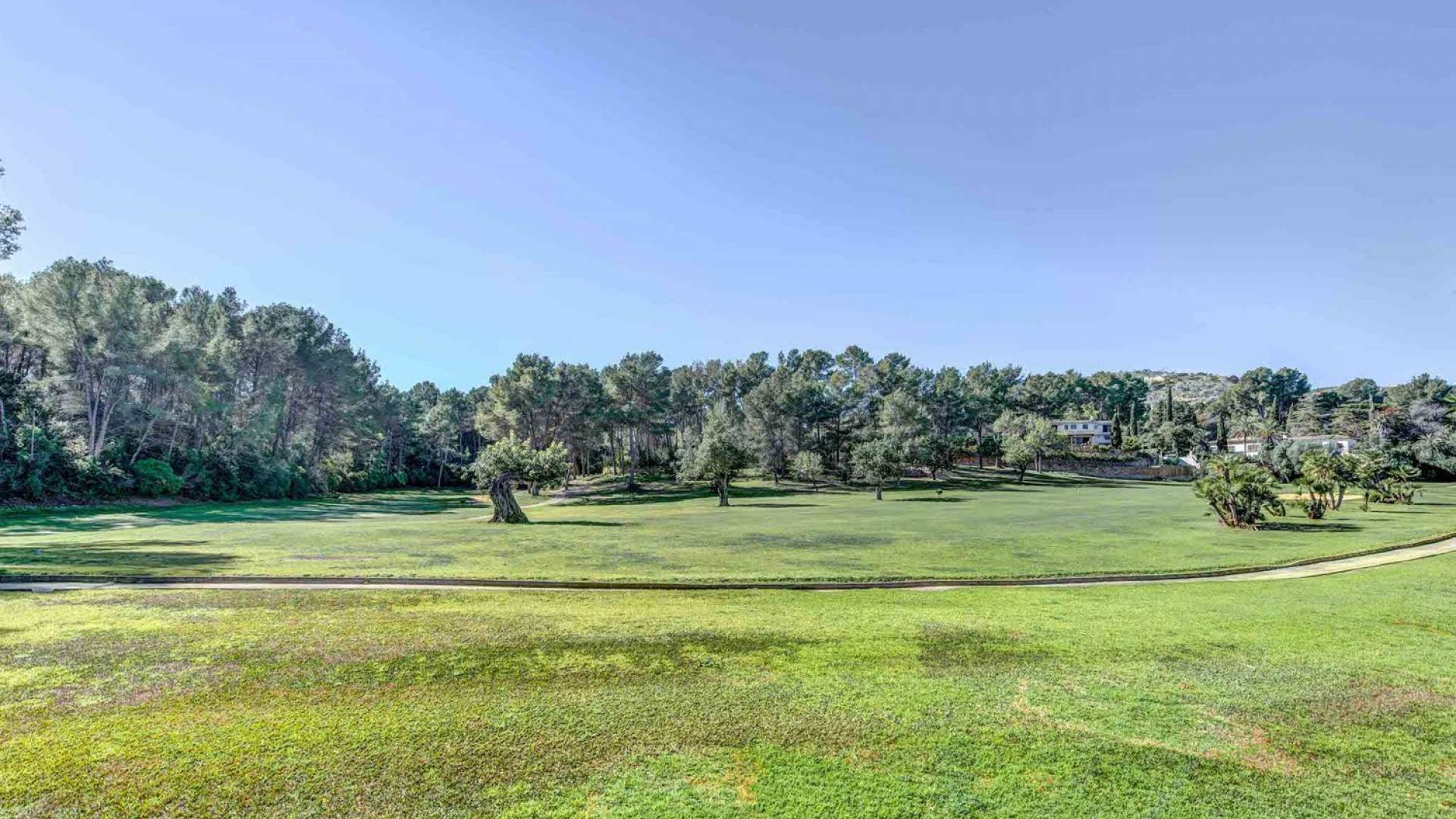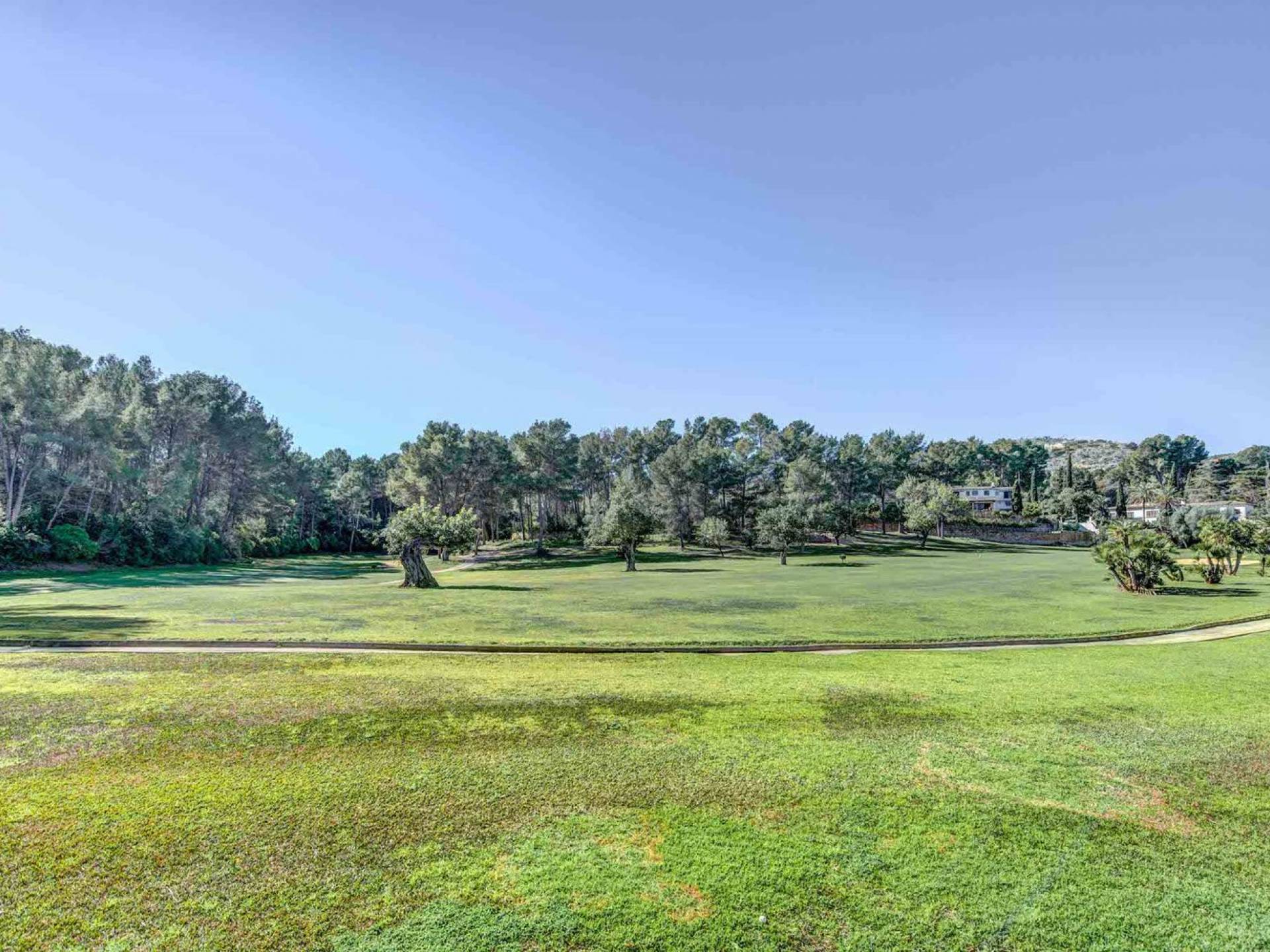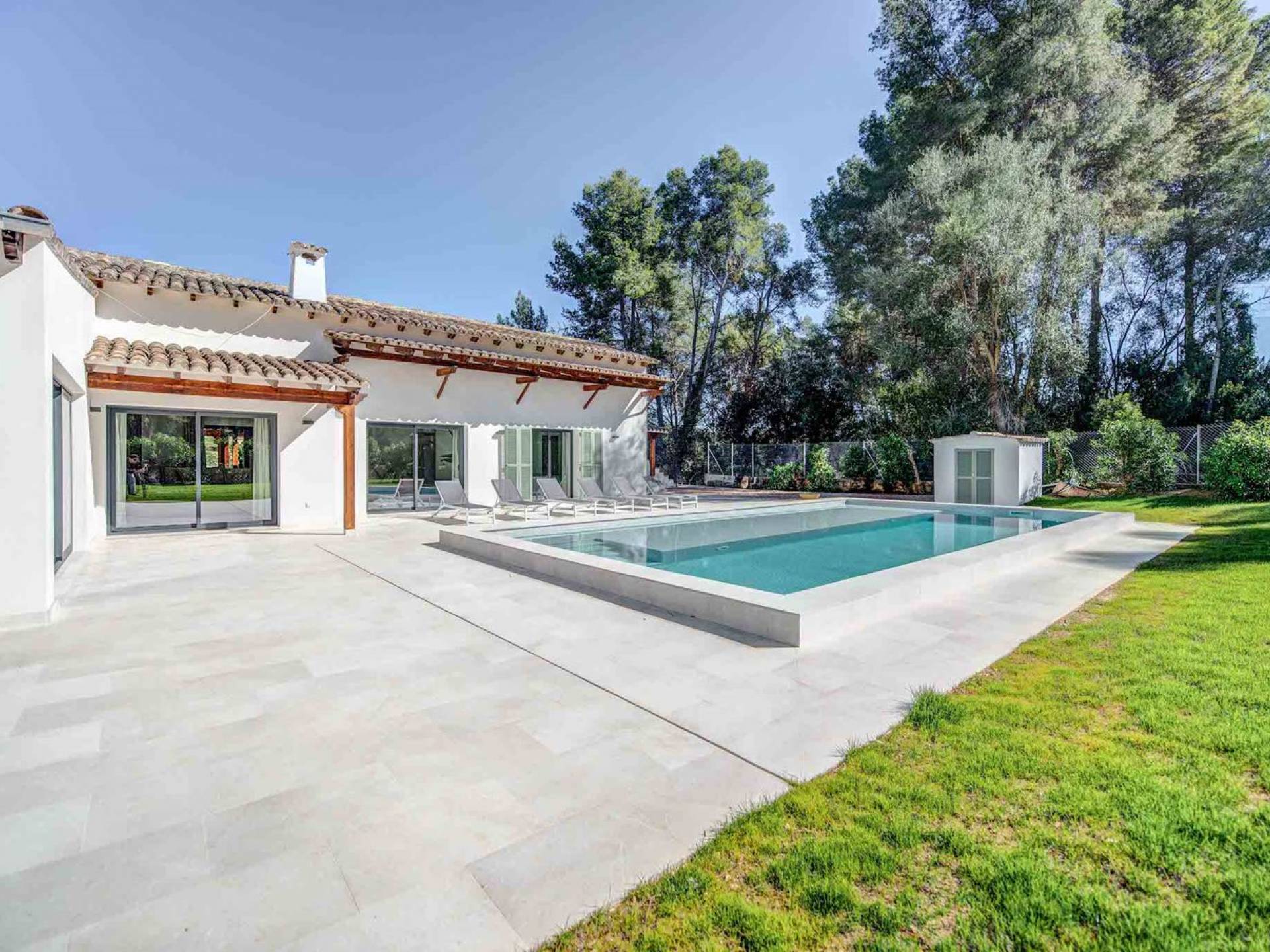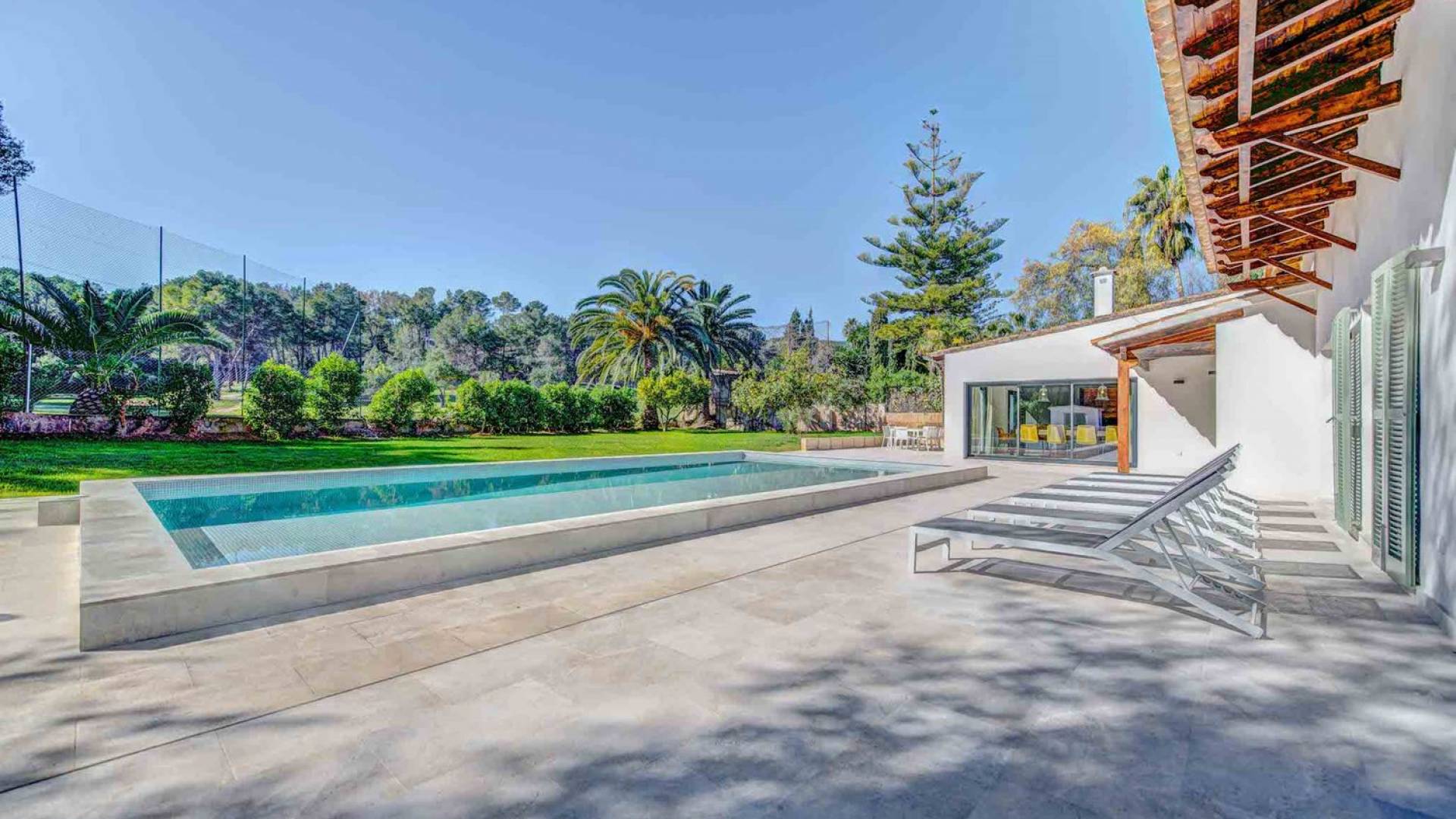 La terrazza che circonda la casa dà accesso alla piscina che dispone di un'ampia zona di acqua bassa perfetta per i bambini o per rilassarsi comodamente al sole e in acqua. Gli splendidi giardini presentano un prato e alberi da frutto, separati dal campo da golf solo da una siepe.