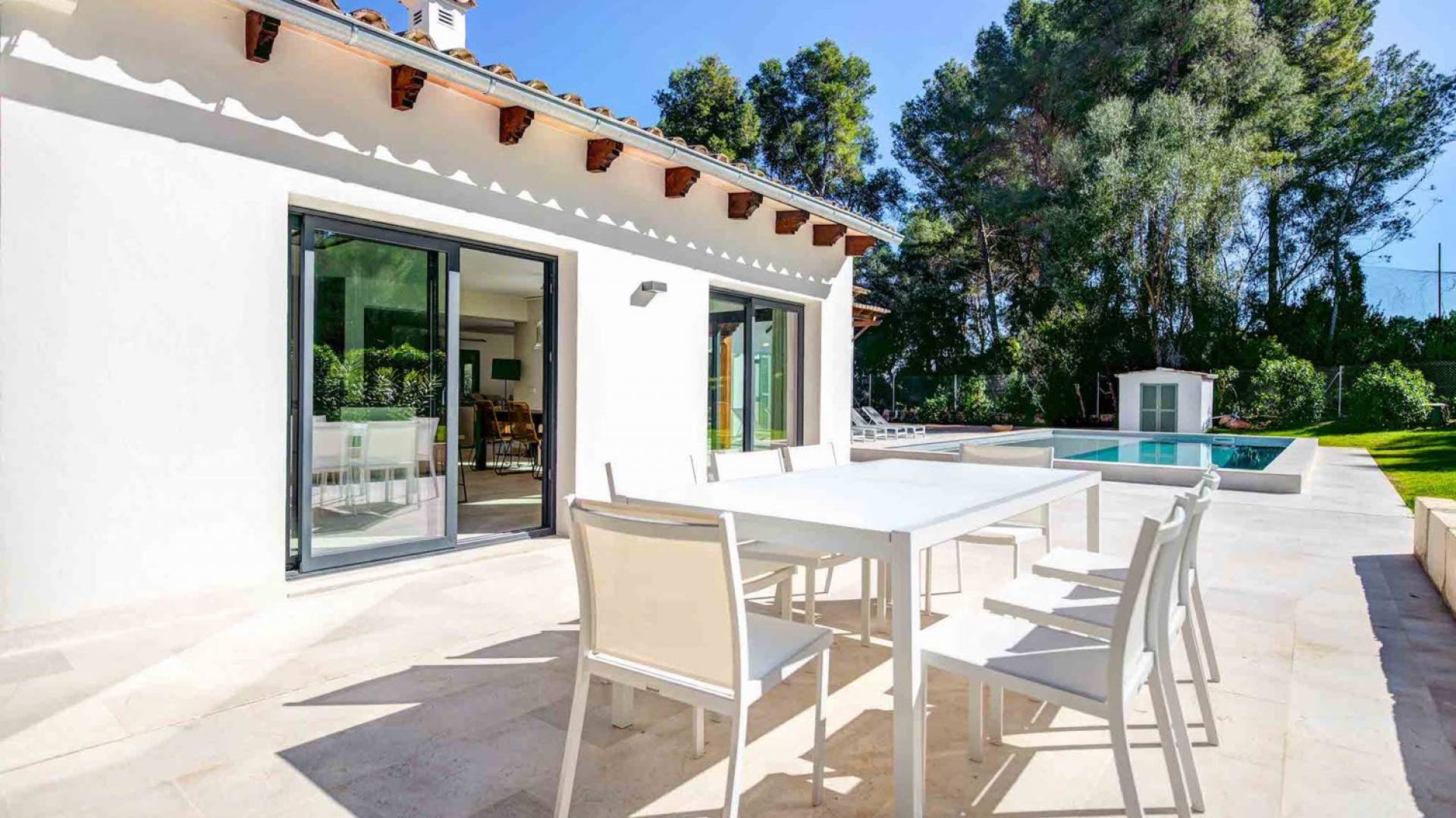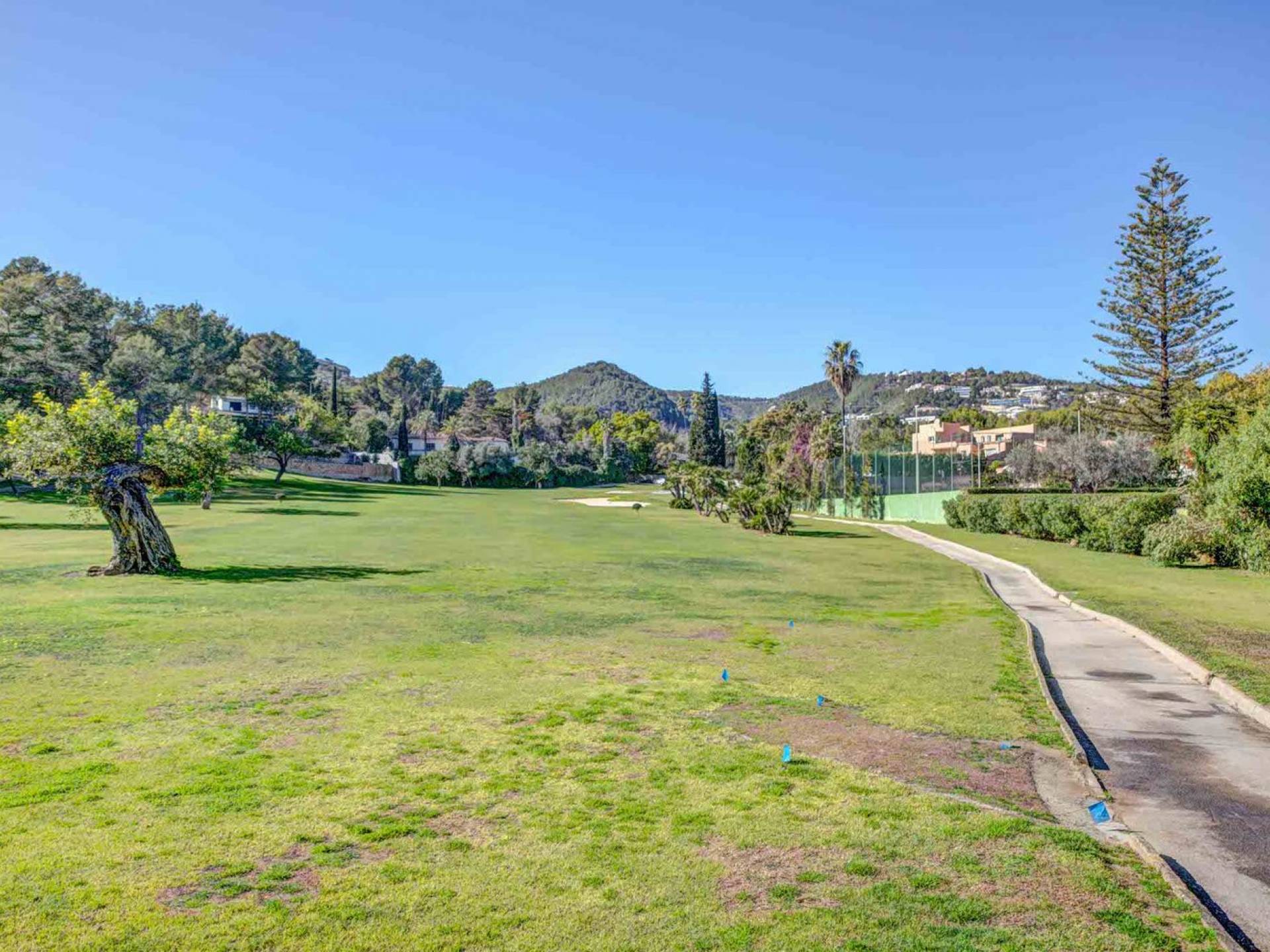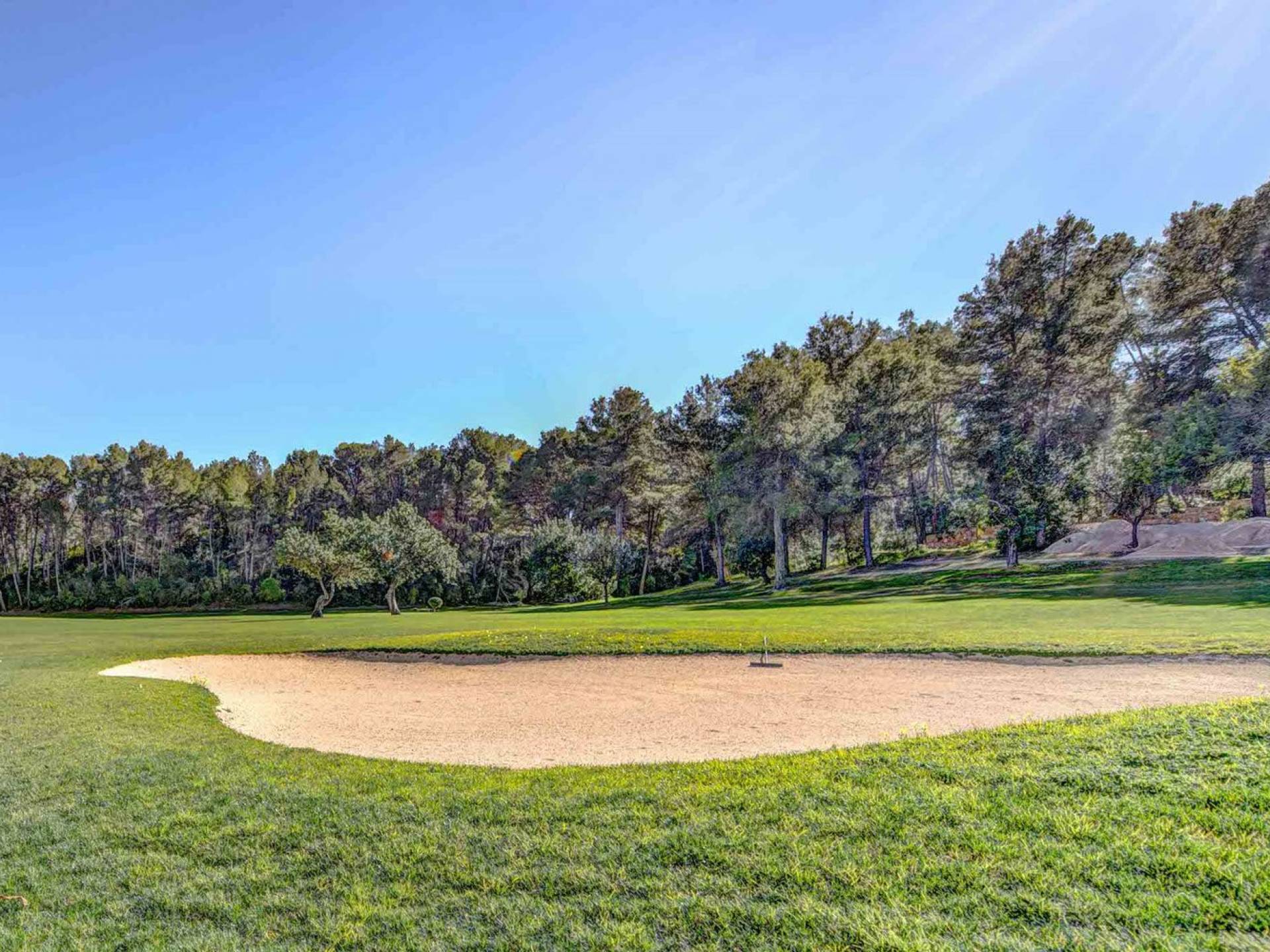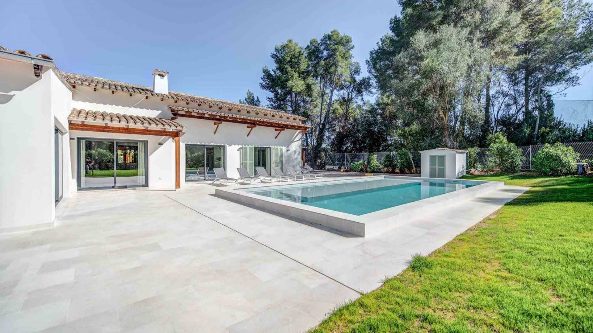 La terrazza che circonda la casa dà accesso alla piscina che dispone di un'ampia zona di acqua bassa perfetta per i bambini o per rilassarsi comodamente al sole e in acqua. Gli splendidi giardini presentano un prato e alberi da frutto, separati dal campo da golf solo da una siepe.