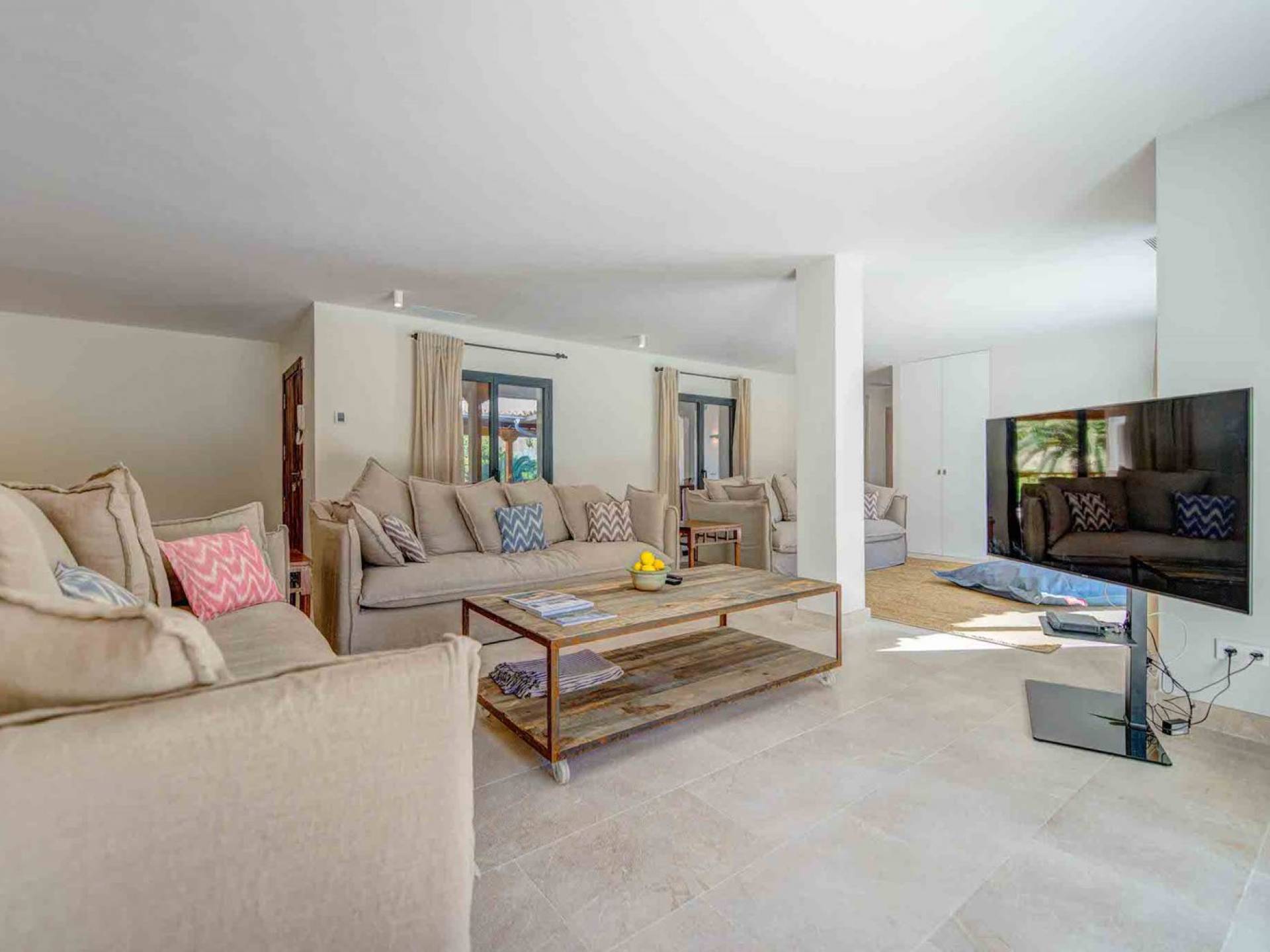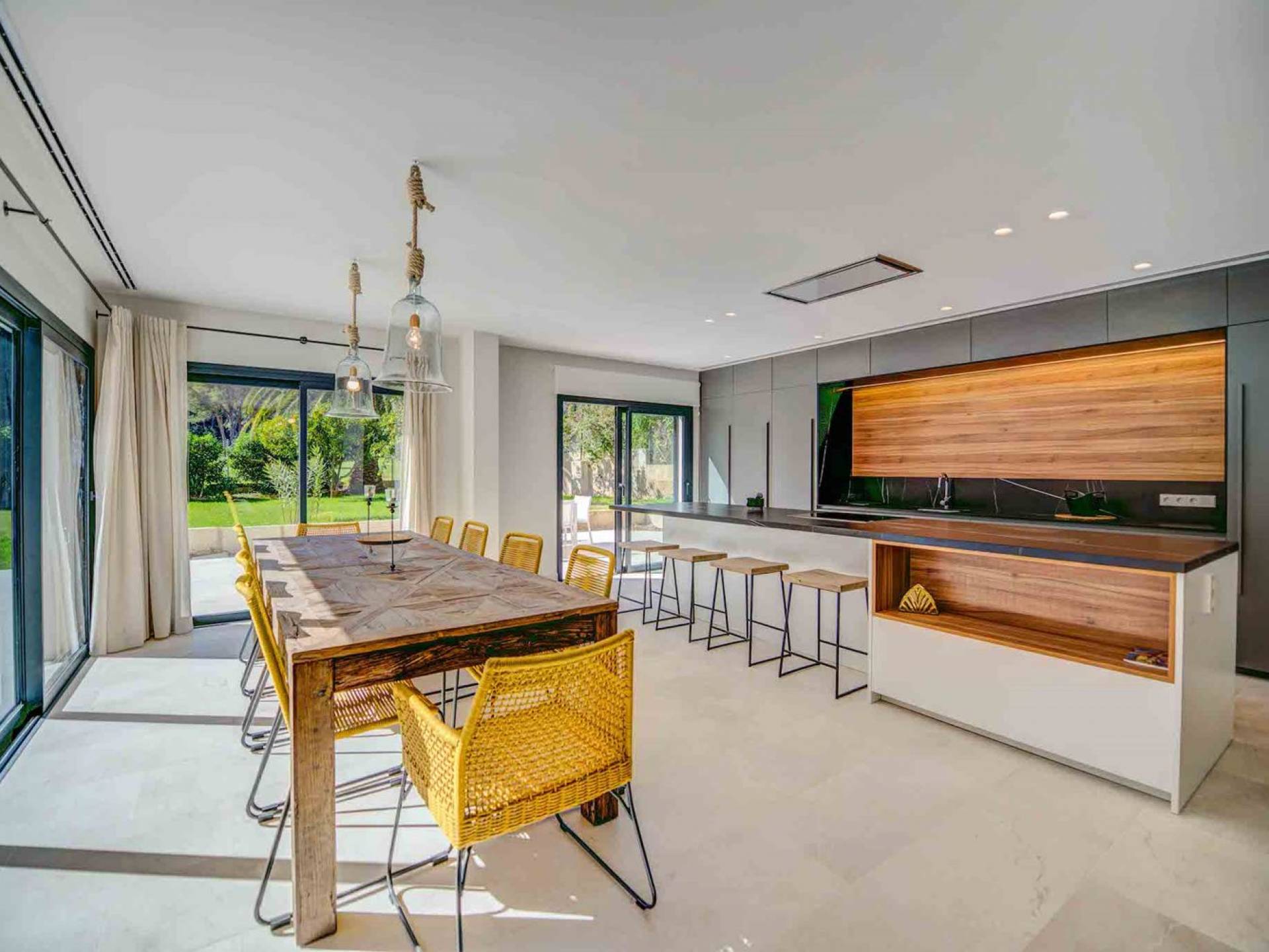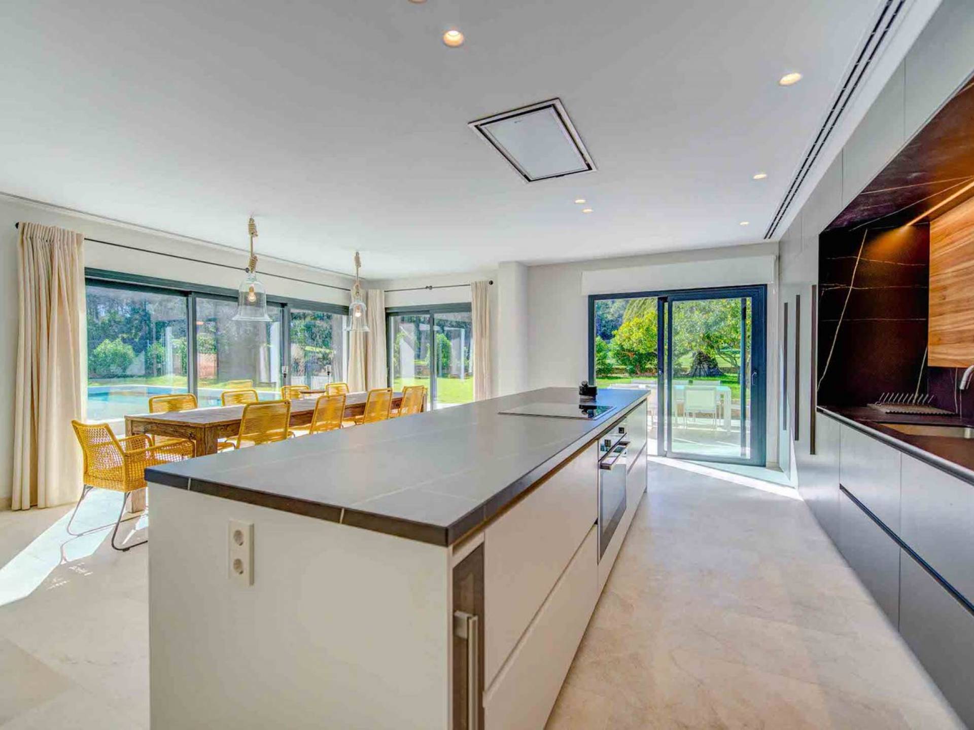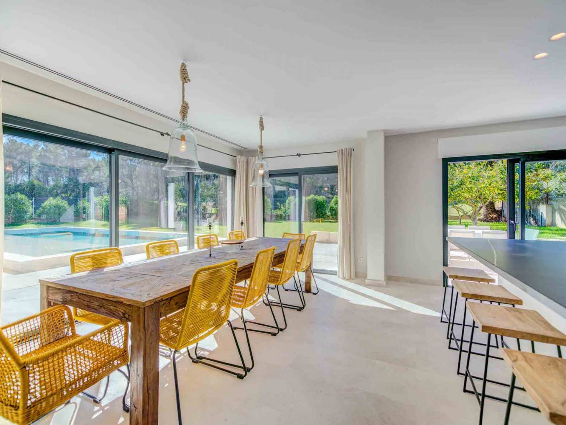 La casa è distribuita su un unico piano, che dalla strada è il primo piano, il piano terra ospita due ampi garage scoperti. Le ampie zone giorno a pianta aperta a forma di "L" sono moderne e luminose grazie alle numerose finestre dal pavimento al soffitto che si aprono tutte sulla terrazza della piscina e sui giardini. La zona pranzo ha un enorme tavolo che può ospitare comodamente 10 persone, mentre la cucina super moderna vanta un bar per la colazione ed elettrodomestici di fascia alta. Il salone comprende 3 grandi e comodi divani, invitanti cuscini sul pavimento e una grande TV a schermo piatto, oltre a viste sulla piscina e sui giardini.
