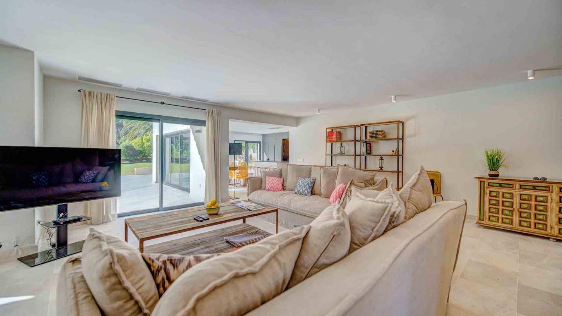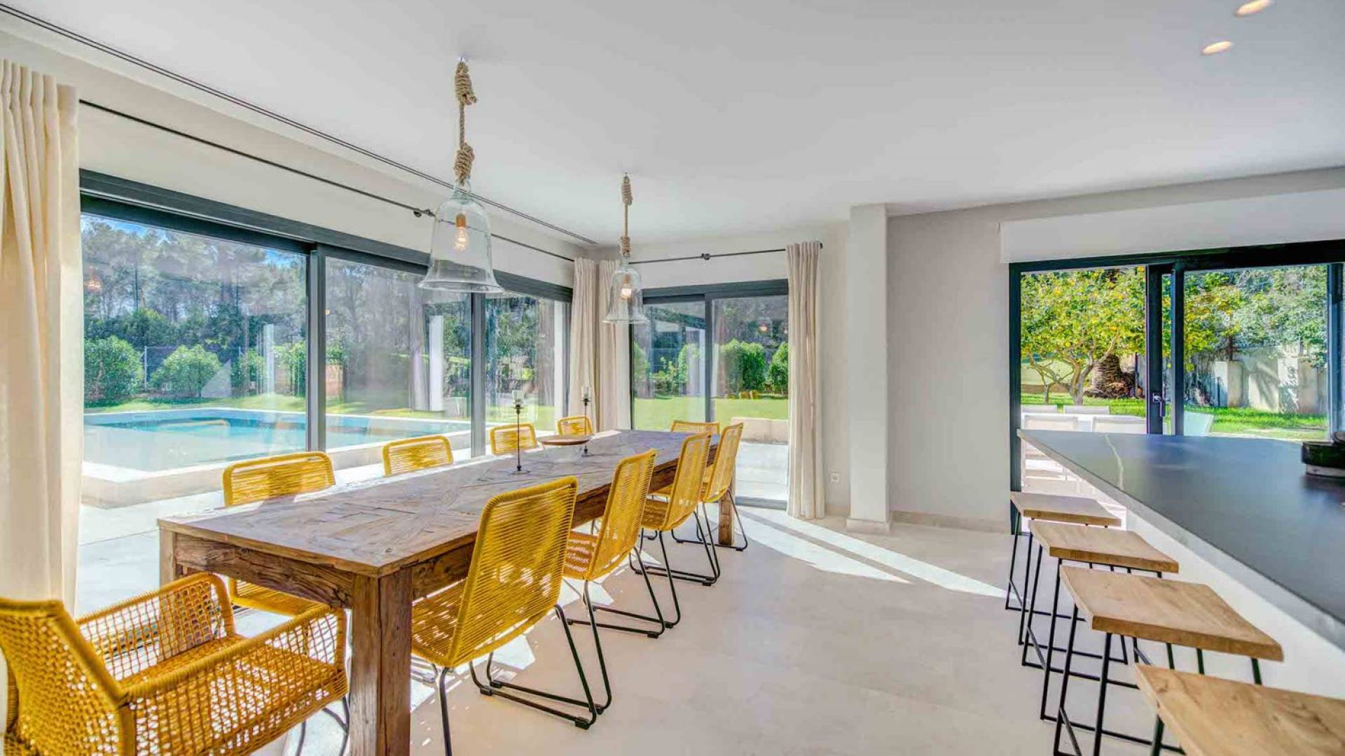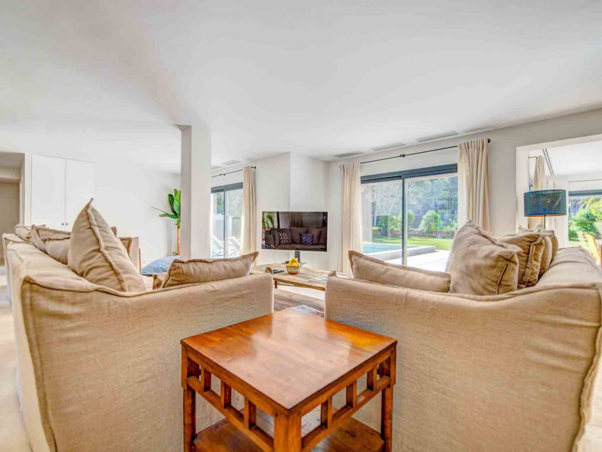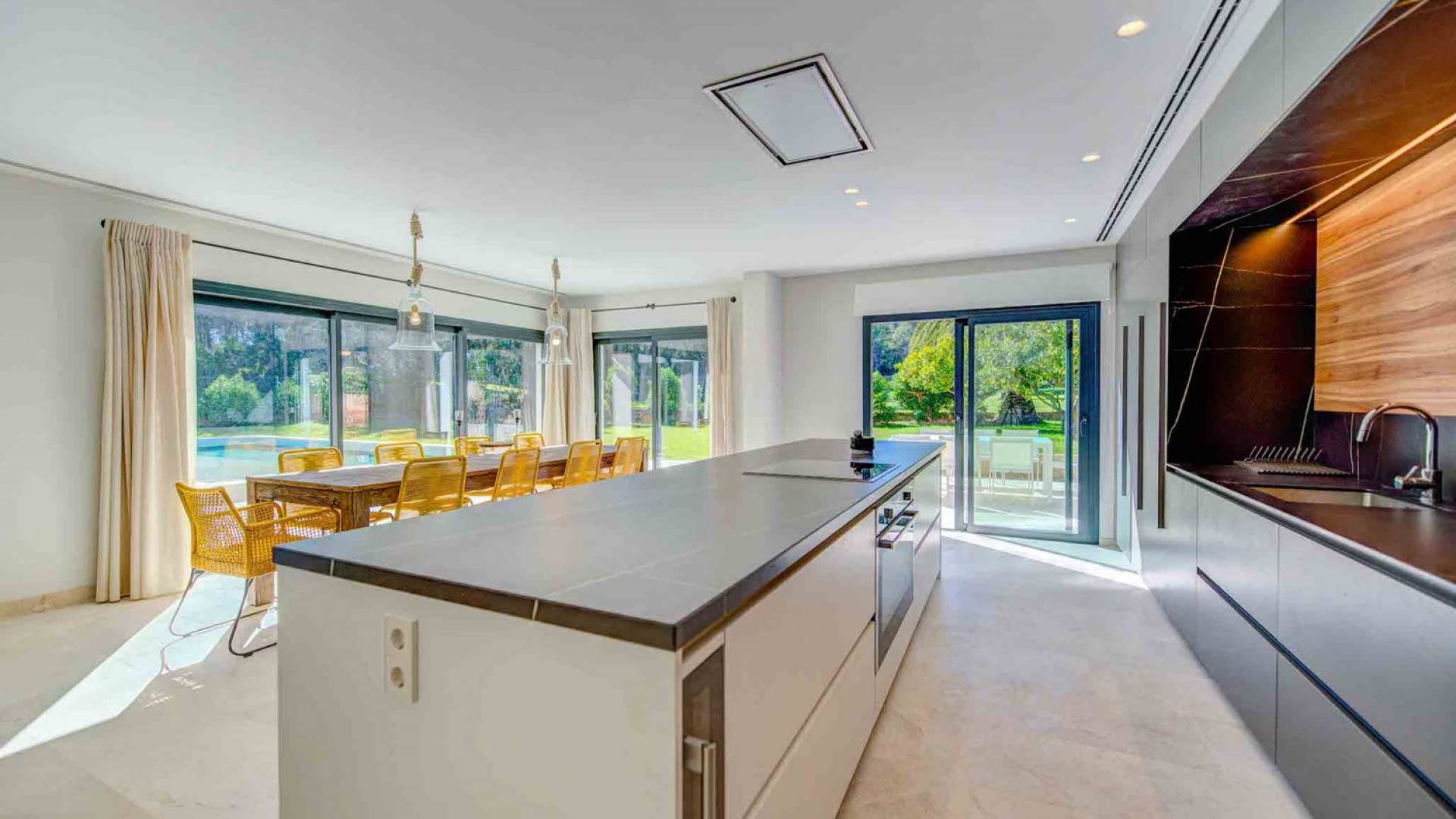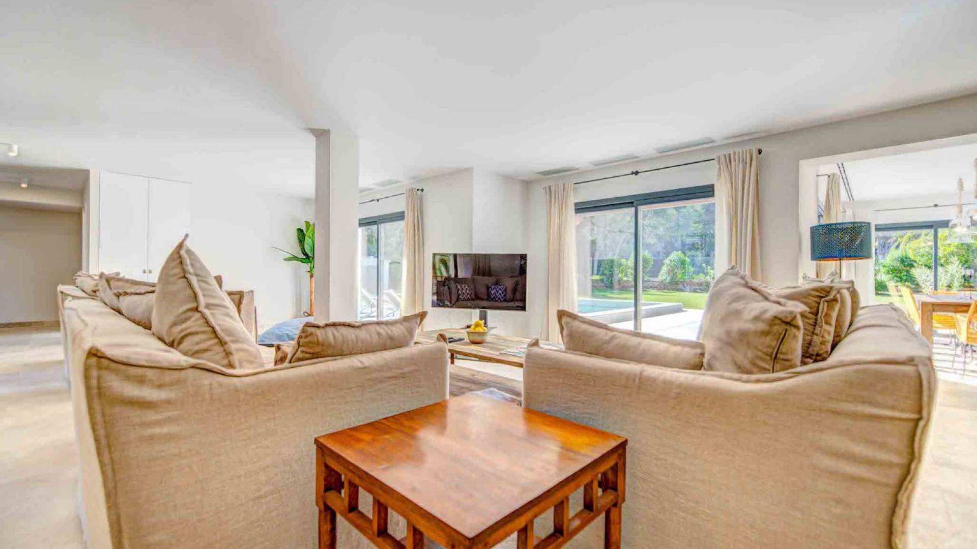 La casa è distribuita su un unico piano, che dalla strada è il primo piano, il piano terra ospita due ampi garage scoperti. Le ampie zone giorno a pianta aperta a forma di "L" sono moderne e luminose grazie alle numerose finestre dal pavimento al soffitto che si aprono tutte sulla terrazza della piscina e sui giardini. La zona pranzo ha un enorme tavolo che può ospitare comodamente 10 persone, mentre la cucina super moderna vanta un bar per la colazione ed elettrodomestici di fascia alta. Il salone comprende 3 grandi e comodi divani, invitanti cuscini sul pavimento e una grande TV a schermo piatto, oltre a viste sulla piscina e sui giardini.