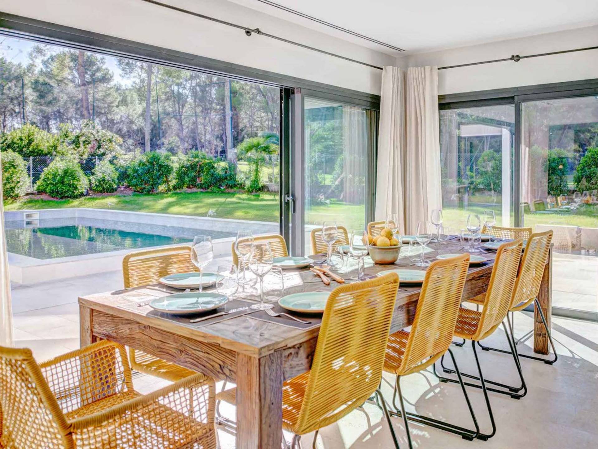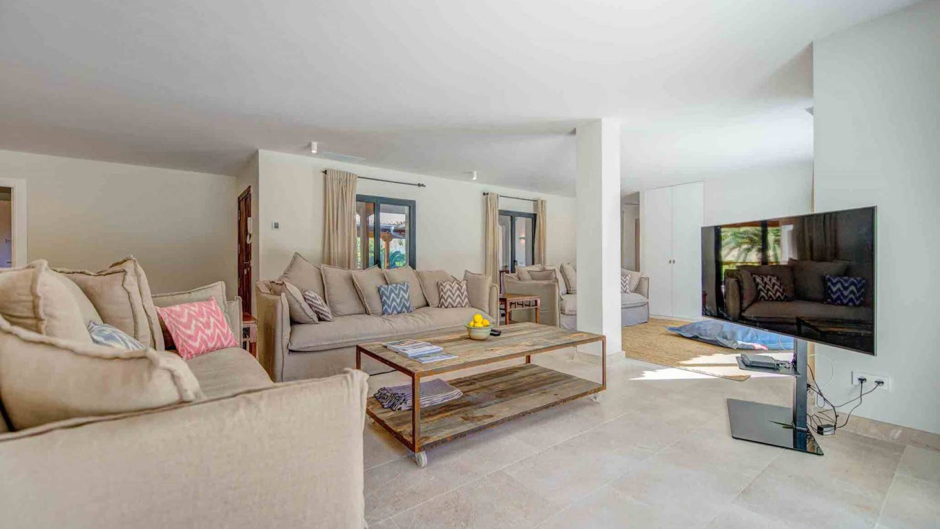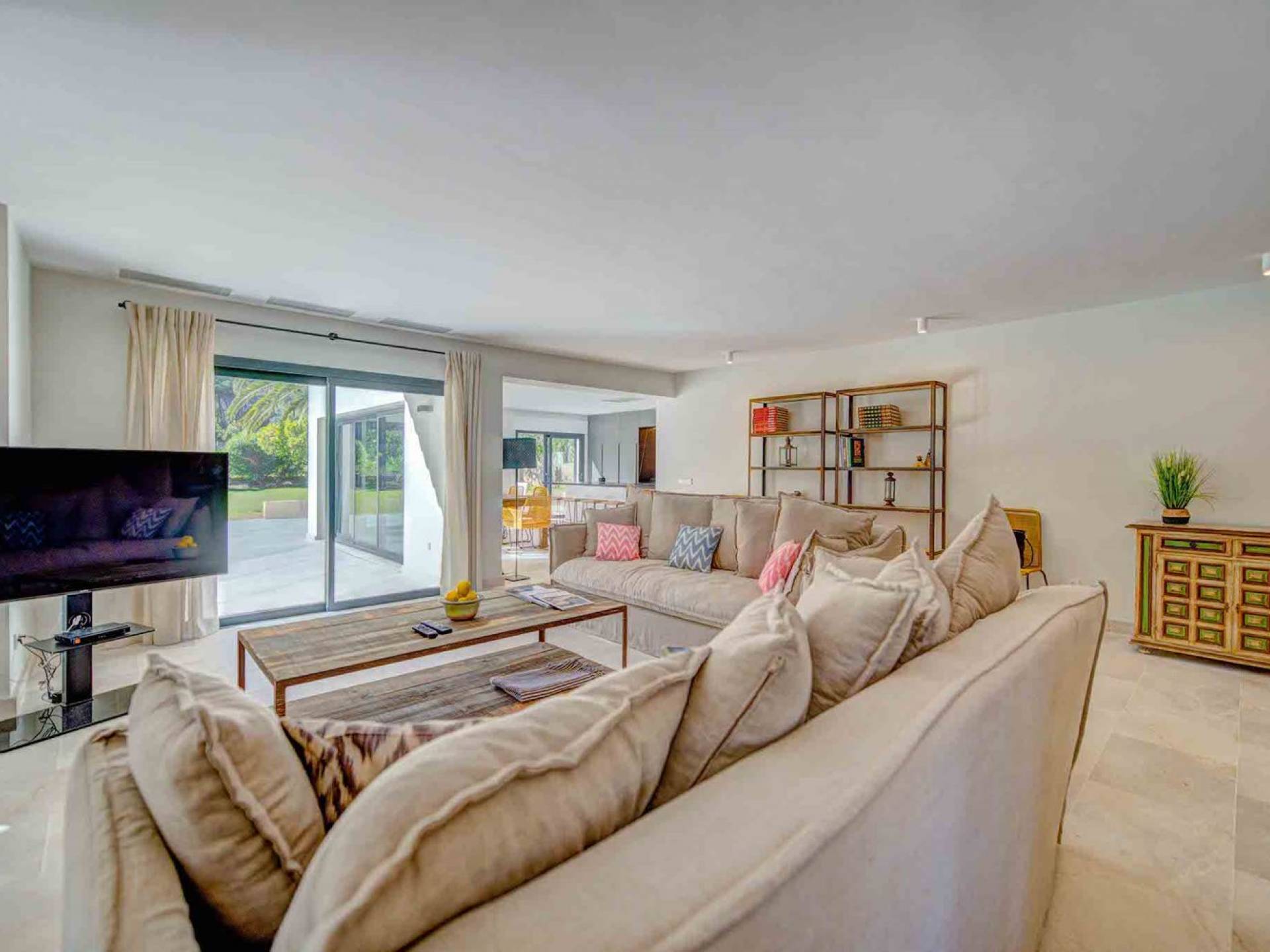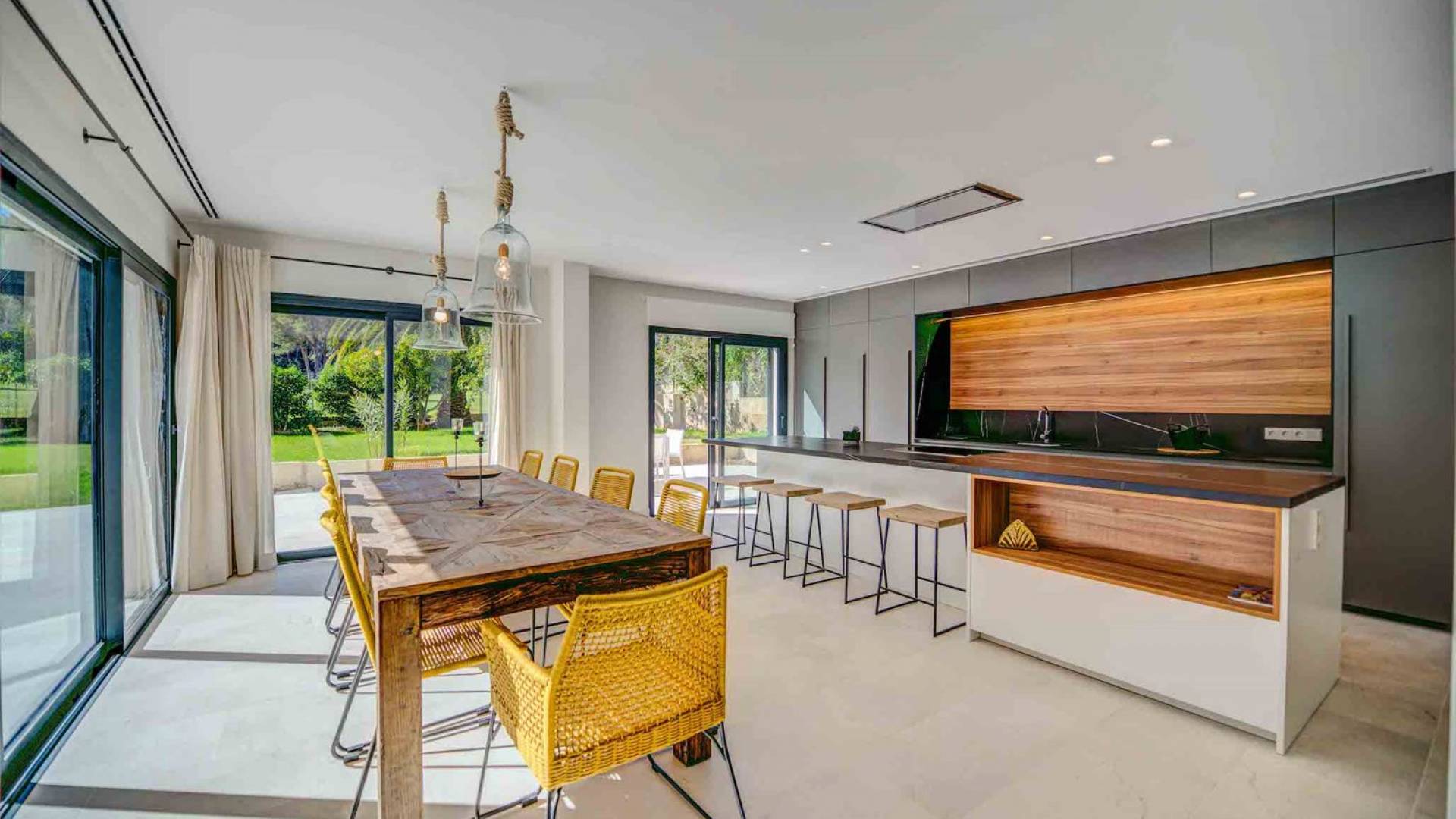 La casa è distribuita su un unico piano, che dalla strada è il primo piano, il piano terra ospita due ampi garage scoperti. Le ampie zone giorno a pianta aperta a forma di "L" sono moderne e luminose grazie alle numerose finestre dal pavimento al soffitto che si aprono tutte sulla terrazza della piscina e sui giardini. La zona pranzo ha un enorme tavolo che può ospitare comodamente 10 persone, mentre la cucina super moderna vanta un bar per la colazione ed elettrodomestici di fascia alta. Il salone comprende 3 grandi e comodi divani, invitanti cuscini sul pavimento e una grande TV a schermo piatto, oltre a viste sulla piscina e sui giardini.
