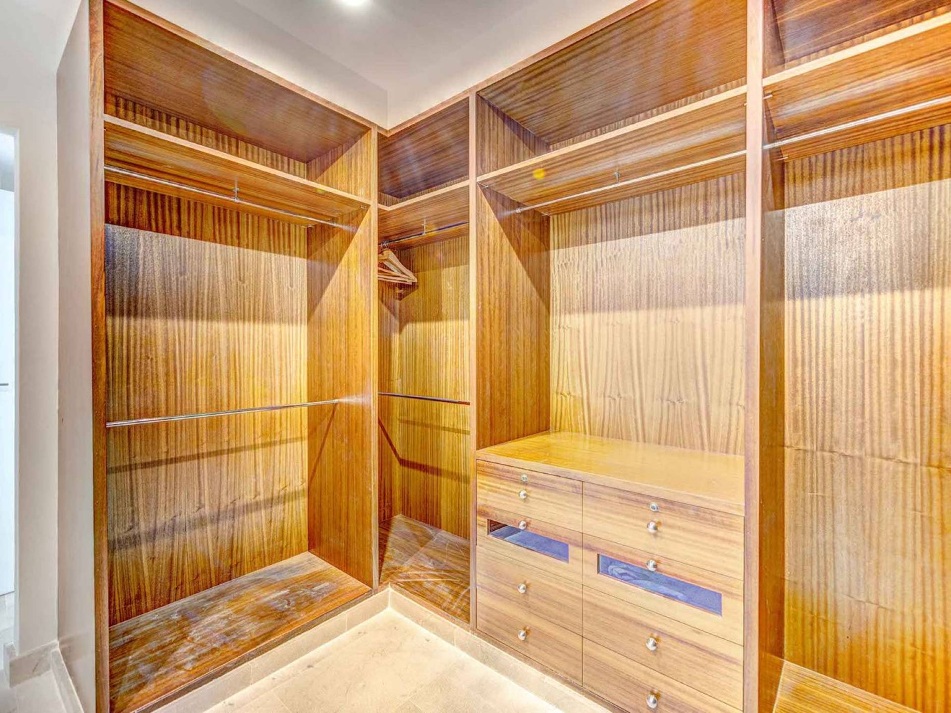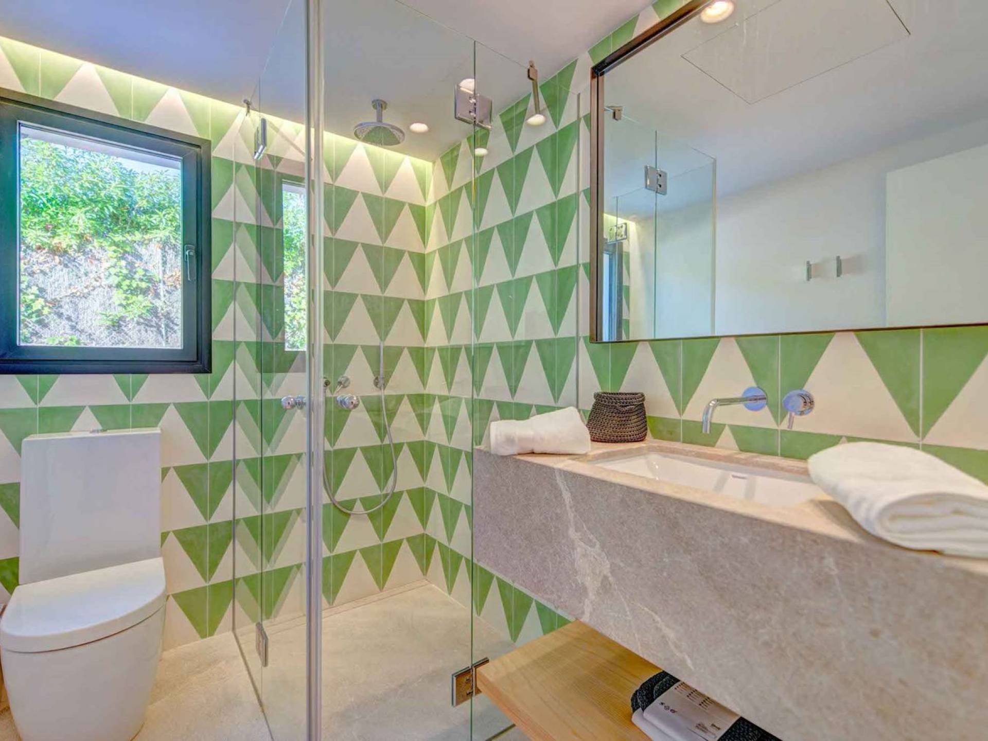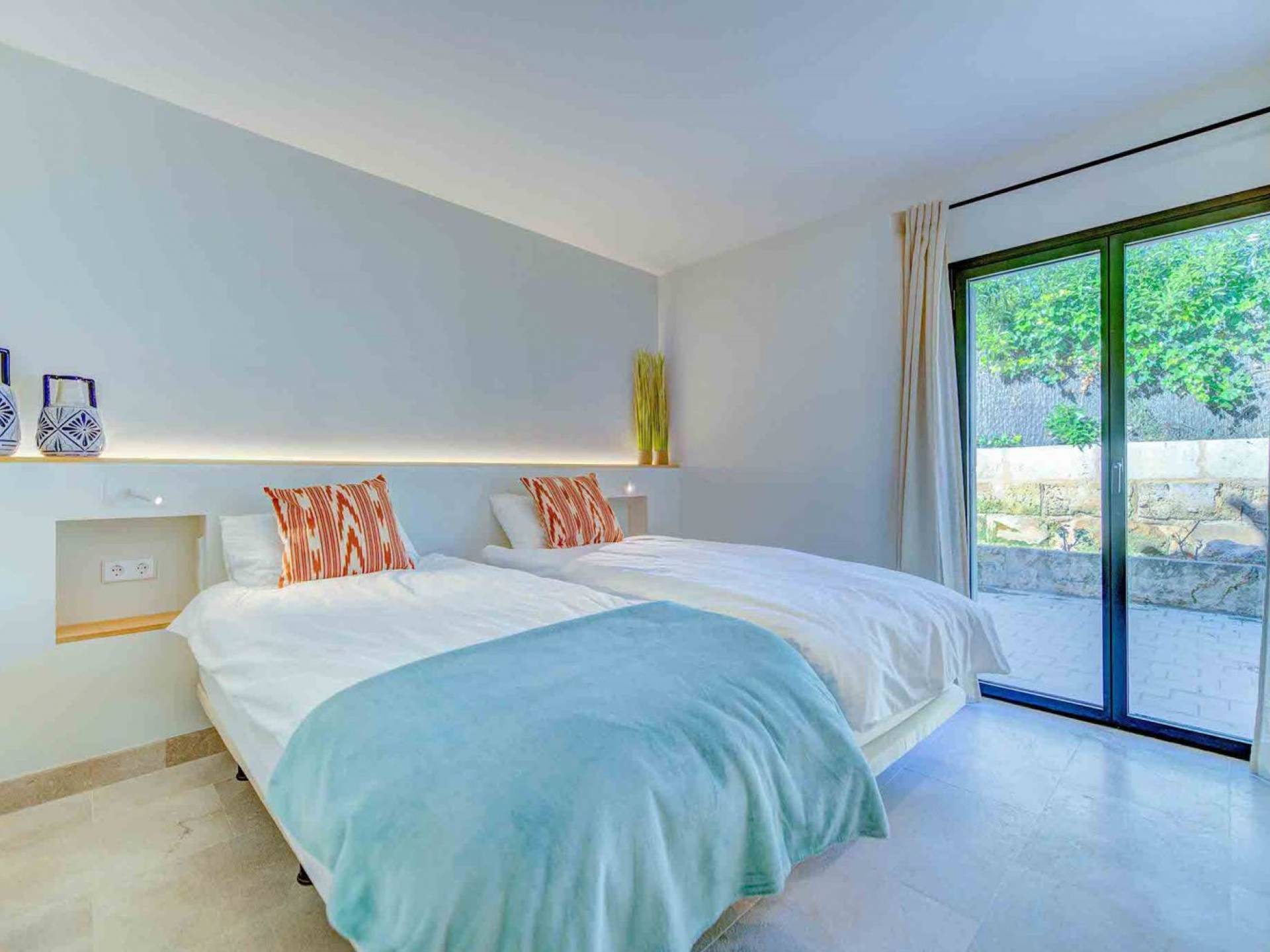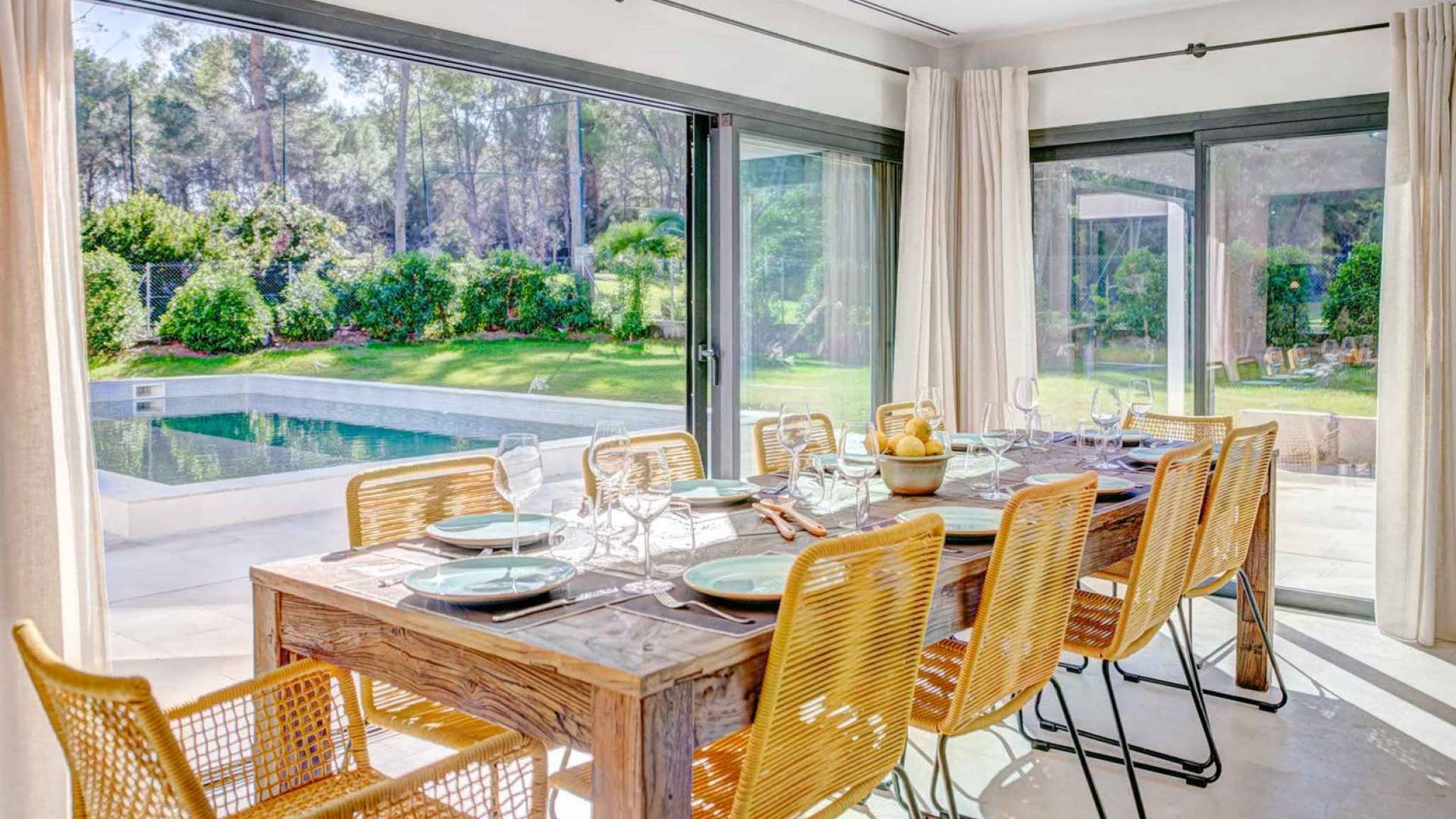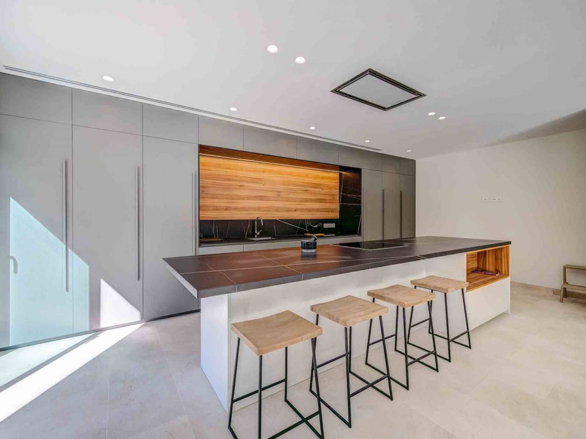 La casa è distribuita su un unico piano, che dalla strada è il primo piano, il piano terra ospita due ampi garage scoperti. Le ampie zone giorno a pianta aperta a forma di "L" sono moderne e luminose grazie alle numerose finestre dal pavimento al soffitto che si aprono tutte sulla terrazza della piscina e sui giardini. La zona pranzo ha un enorme tavolo che può ospitare comodamente 10 persone, mentre la cucina super moderna vanta un bar per la colazione ed elettrodomestici di fascia alta. Il salone comprende 3 grandi e comodi divani, invitanti cuscini sul pavimento e una grande TV a schermo piatto, oltre a viste sulla piscina e sui giardini.