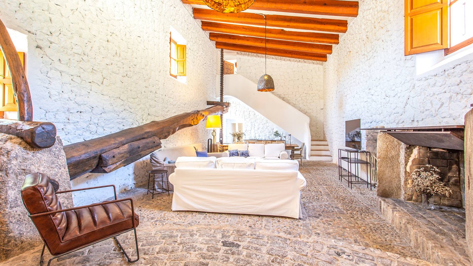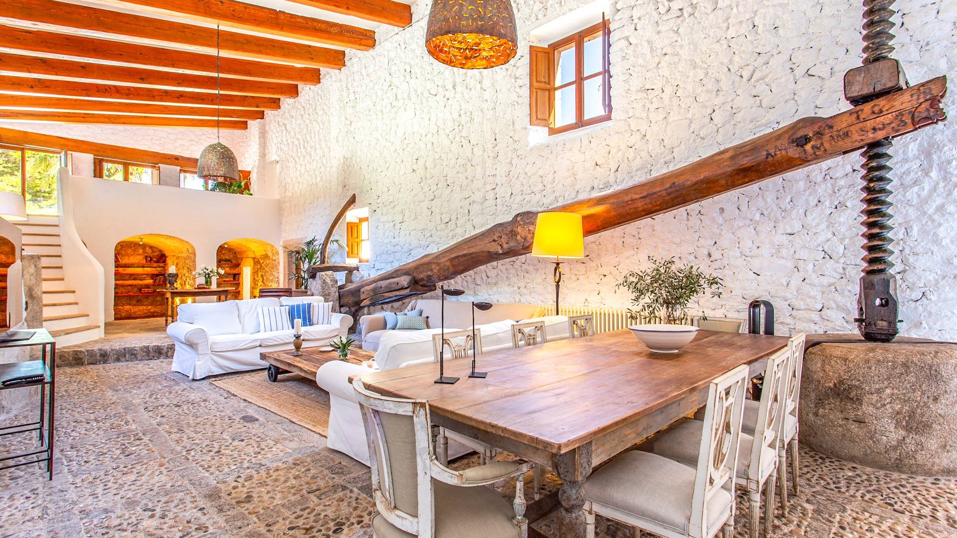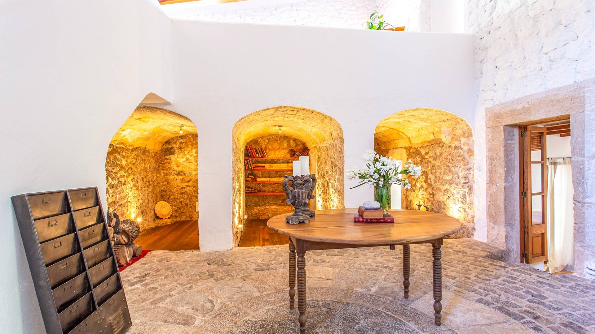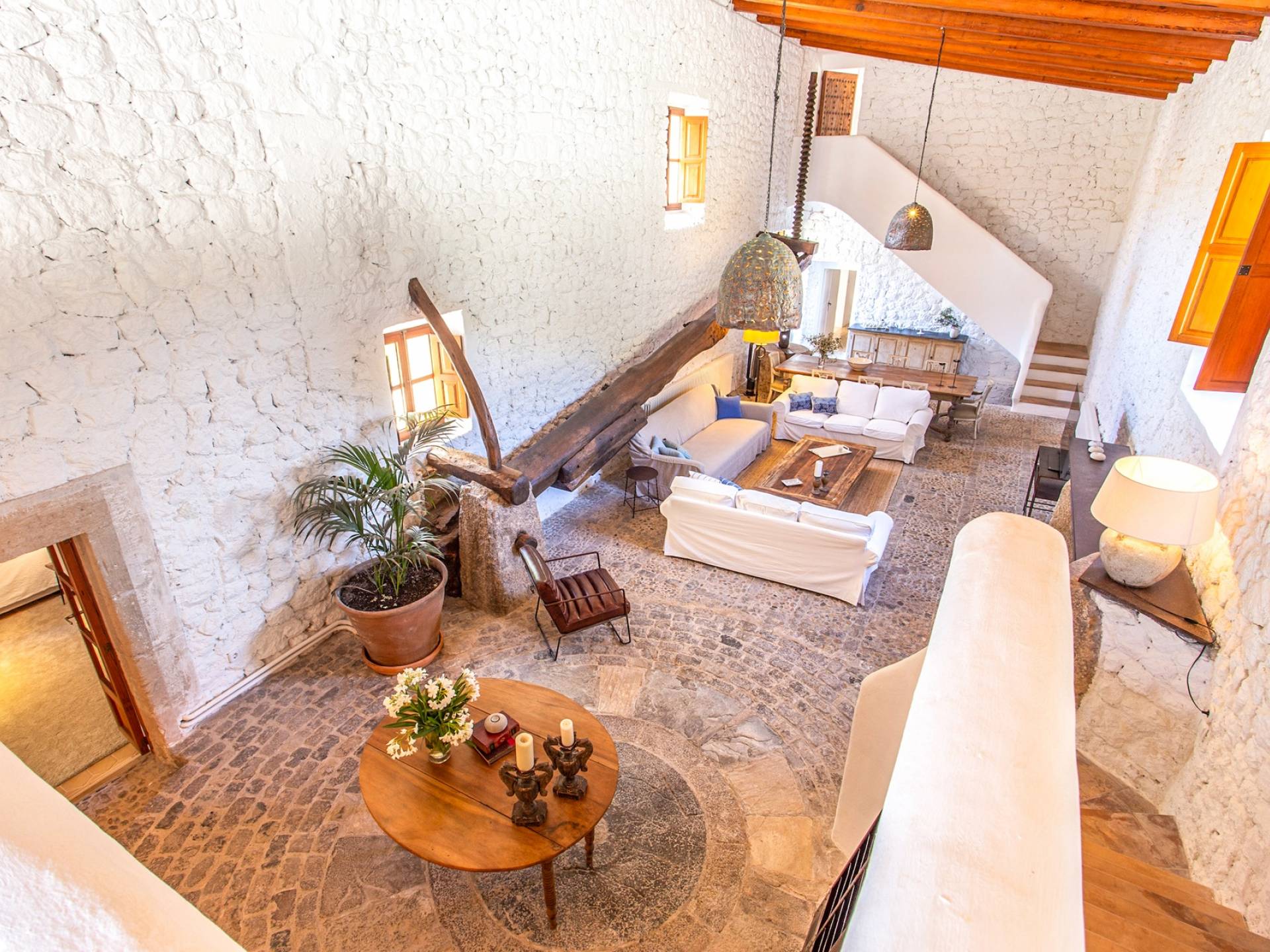 L'imponente zona giorno a doppia altezza vanta un camino con un grande vecchio frantoio. La bella cucina completamente attrezzata e la sala da pranzo si affacciano sul rigoglioso giardino con palme, ulivi e limoni. La Finca offre spazio per dormire per 12 persone ed è suddivisa in 6 camere matrimoniali tutte dal design rustico, creando un aspetto eclettico che enfatizza la natura, con travi in legno, pareti in pietra e soffitti alti.