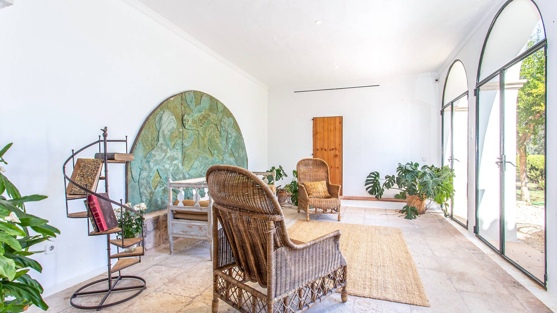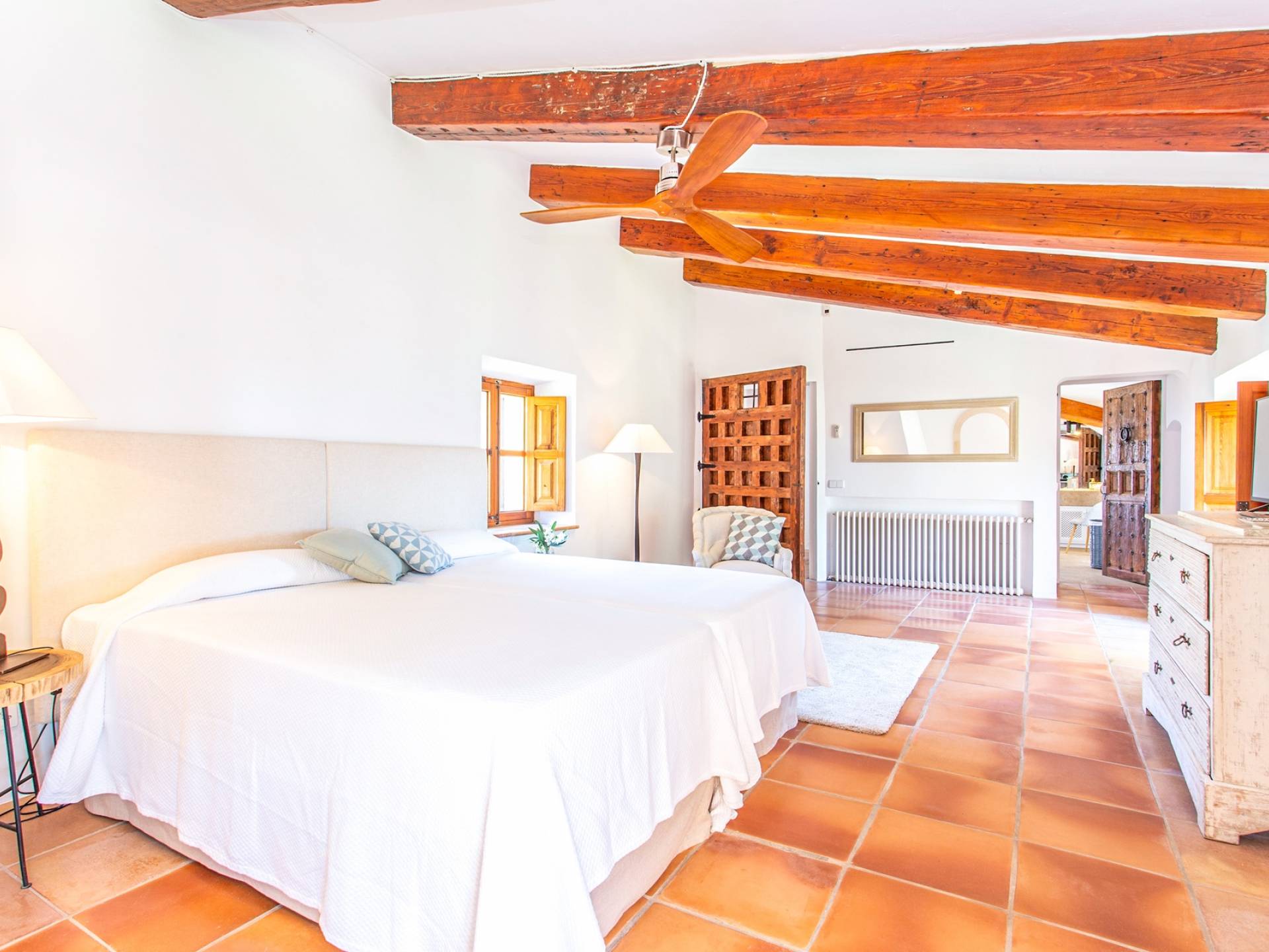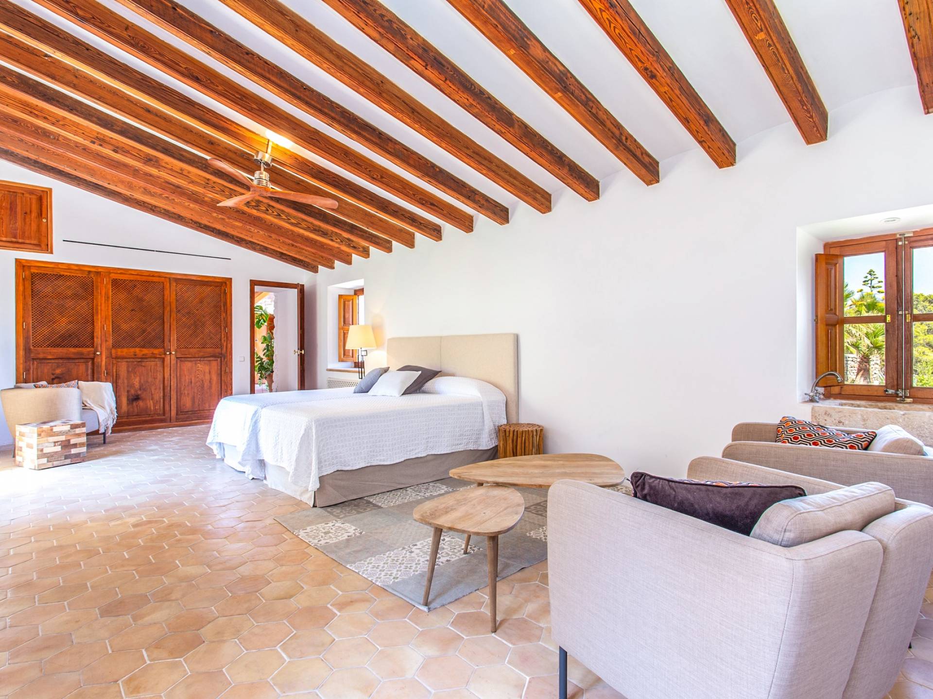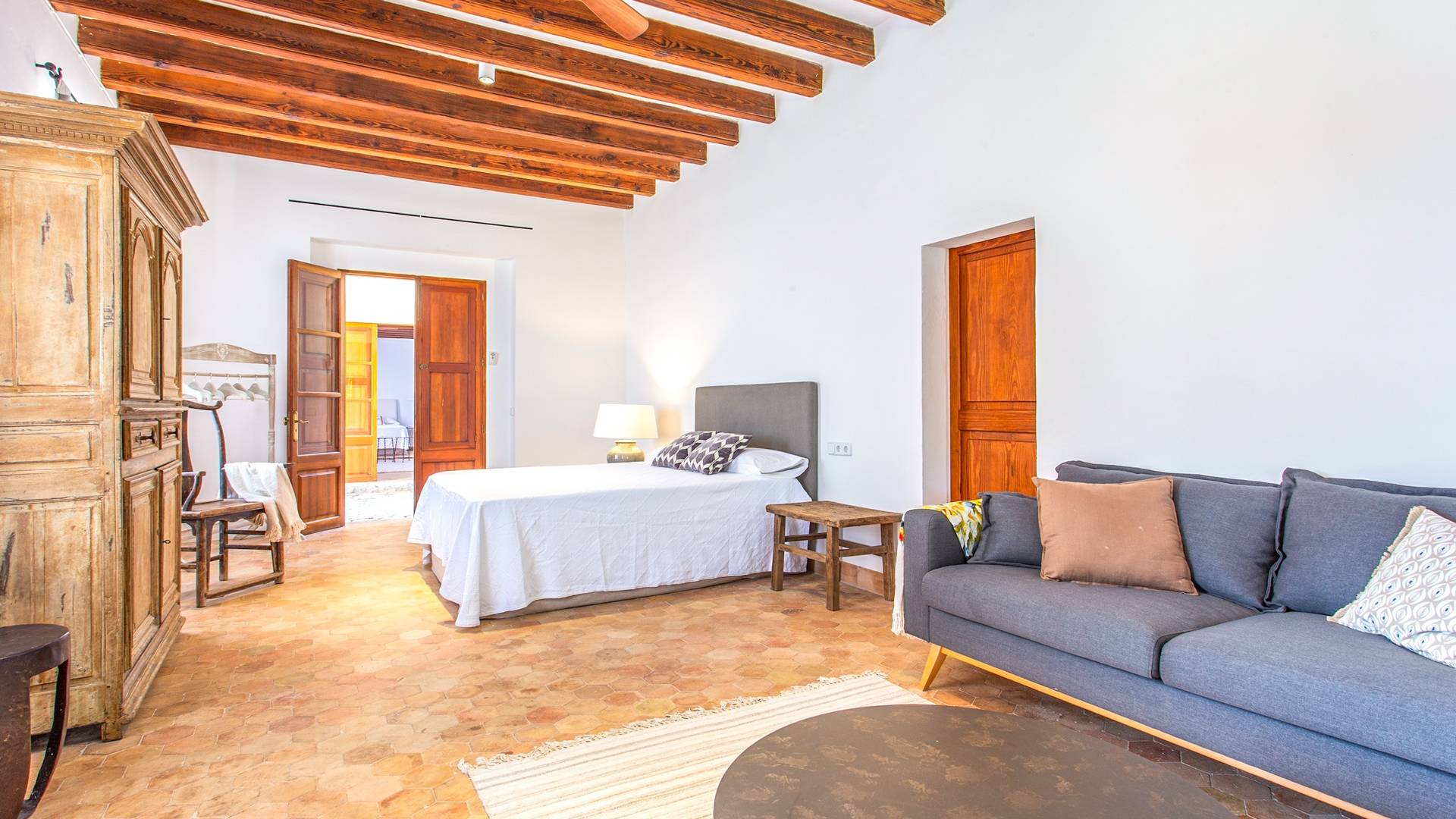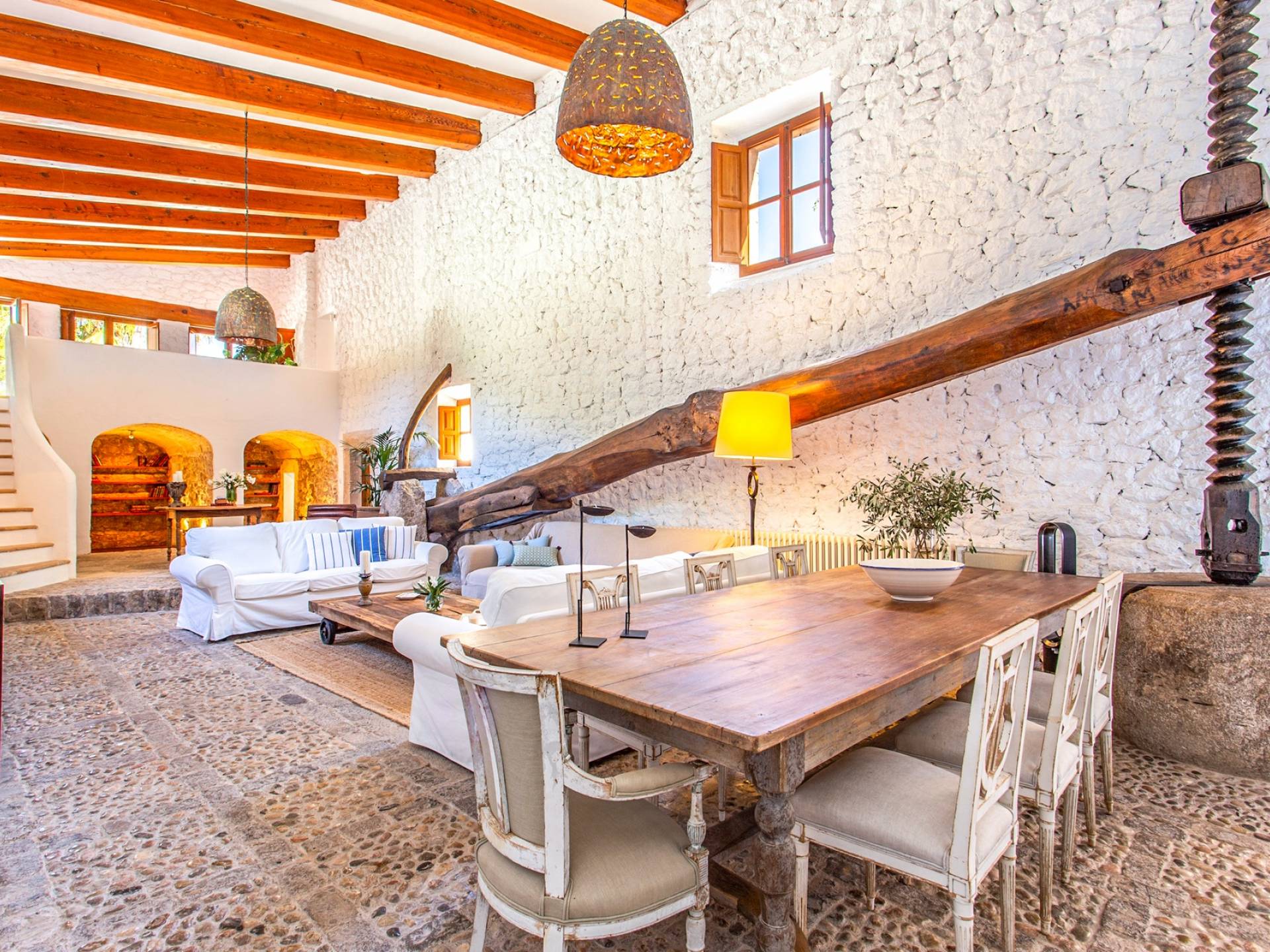 L'imponente zona giorno a doppia altezza vanta un camino con un grande vecchio frantoio. La bella cucina completamente attrezzata e la sala da pranzo si affacciano sul rigoglioso giardino con palme, ulivi e limoni. La Finca offre spazio per dormire per 12 persone ed è suddivisa in 6 camere matrimoniali tutte dal design rustico, creando un aspetto eclettico che enfatizza la natura, con travi in legno, pareti in pietra e soffitti alti.