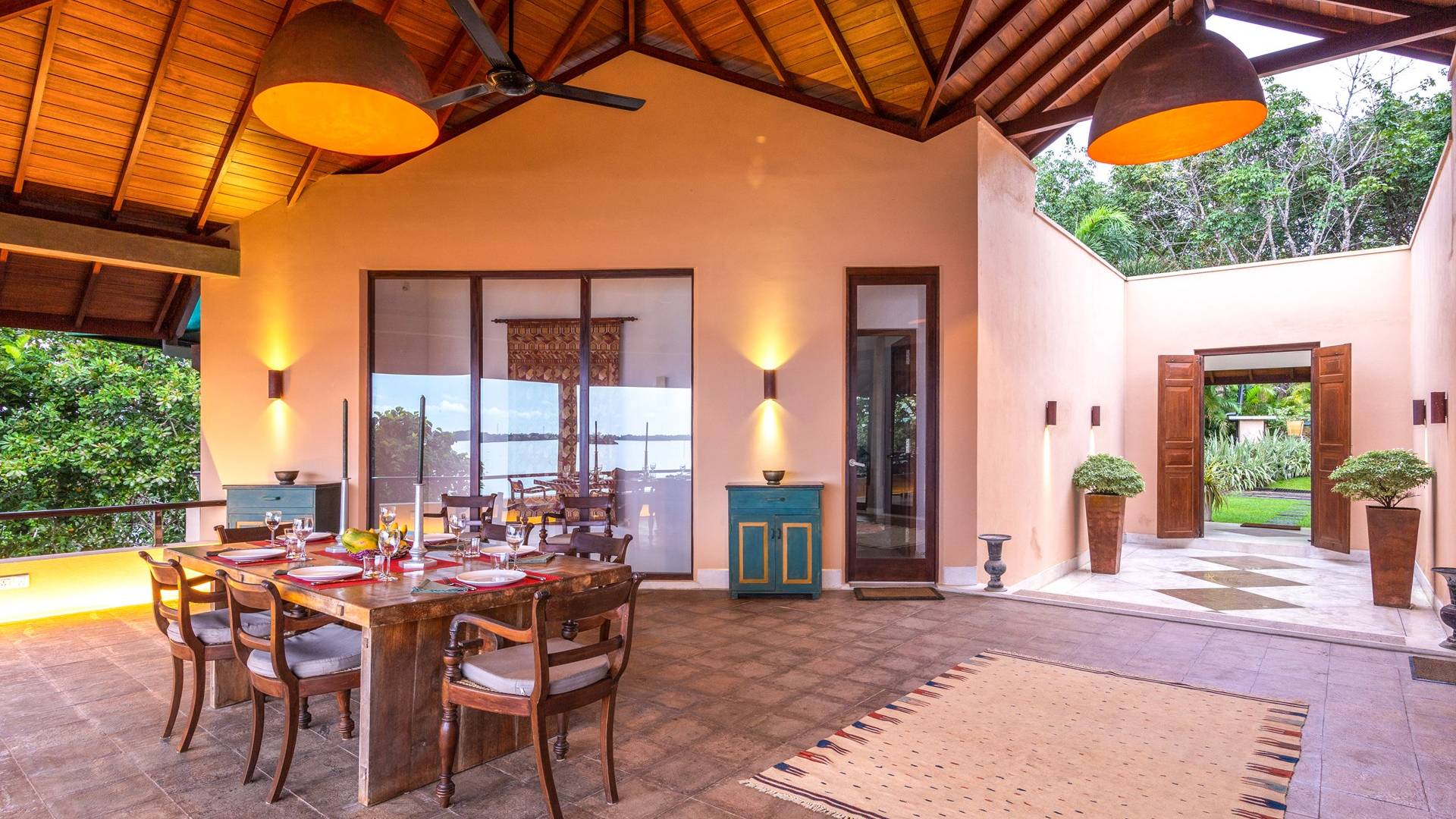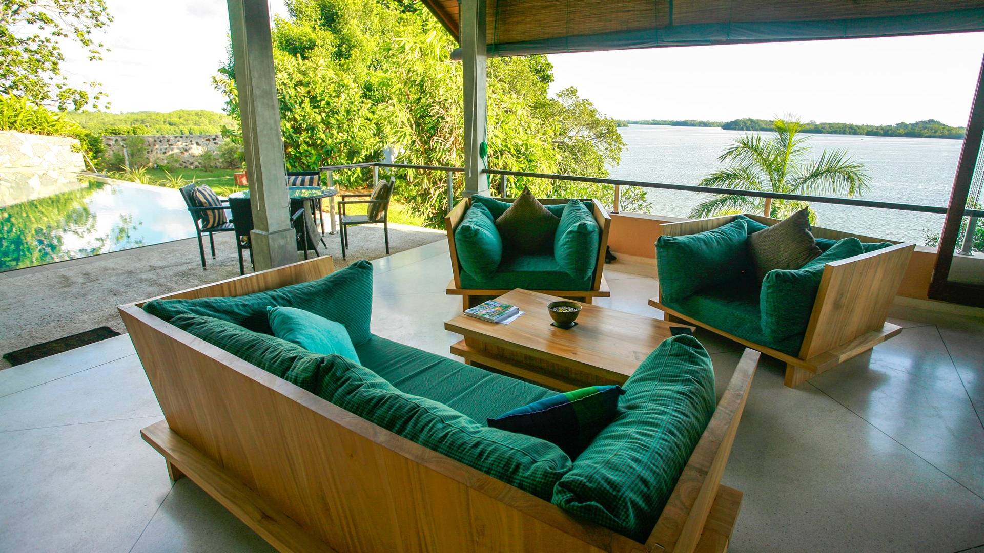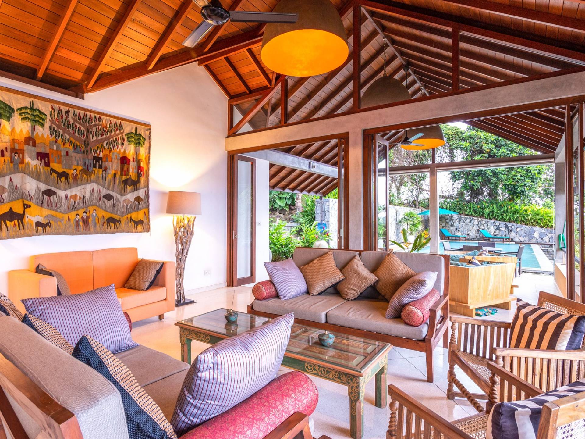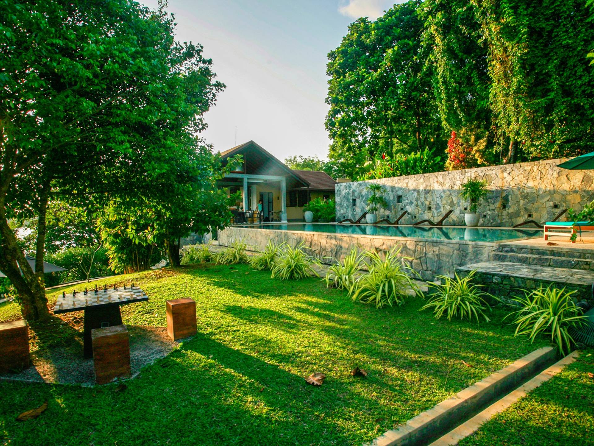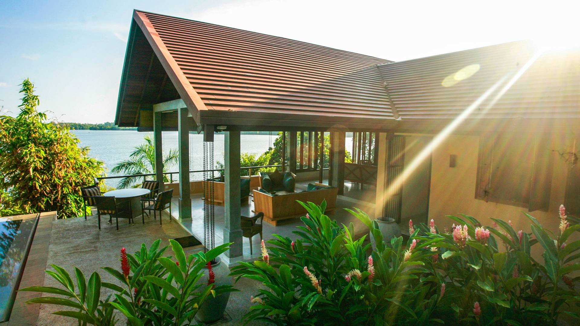 A un livello di ingresso si trovano il salotto principale chiuso e la zona pranzo aperta con splendida vista sul lago, nonché una delle camere matrimoniali. Scendendo le scale, a un livello inferiore, si trovano le restanti 3 camere da letto e una sala TV e l'accesso dall'esterno al livello inferiore è un ampio locale con attrezzi ginnici. Ci sono giochi e libri, nonché cavalletti per gli ospiti che portano i propri colori. Il cuoco è capace sia della cucina occidentale che di quella locale e la sua cucina è spesso elogiata nelle recensioni. Sopra la piscina a un livello più alto c'è lo yoga shala e ci sono anche 3 biciclette fornite per l'uso.