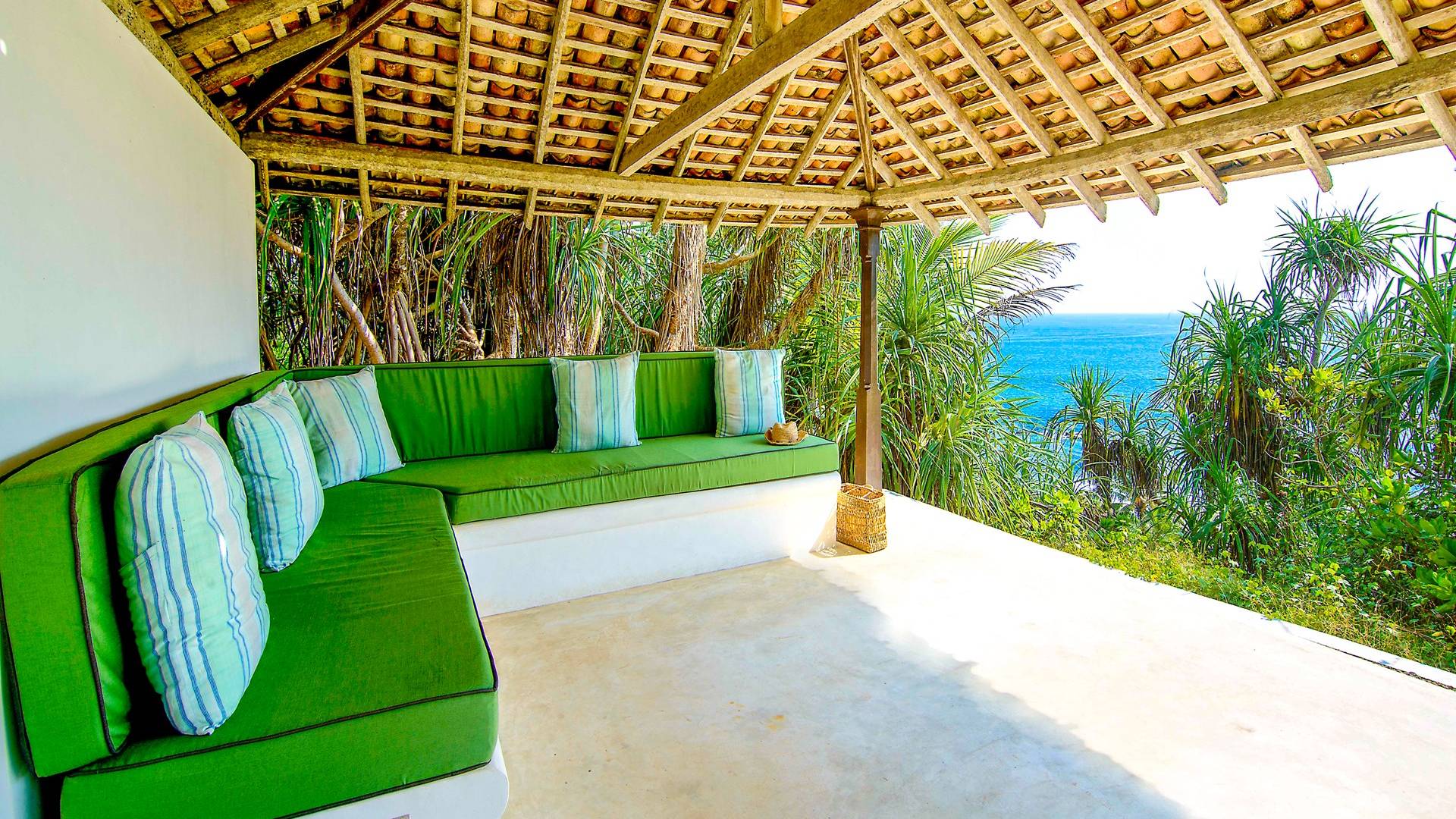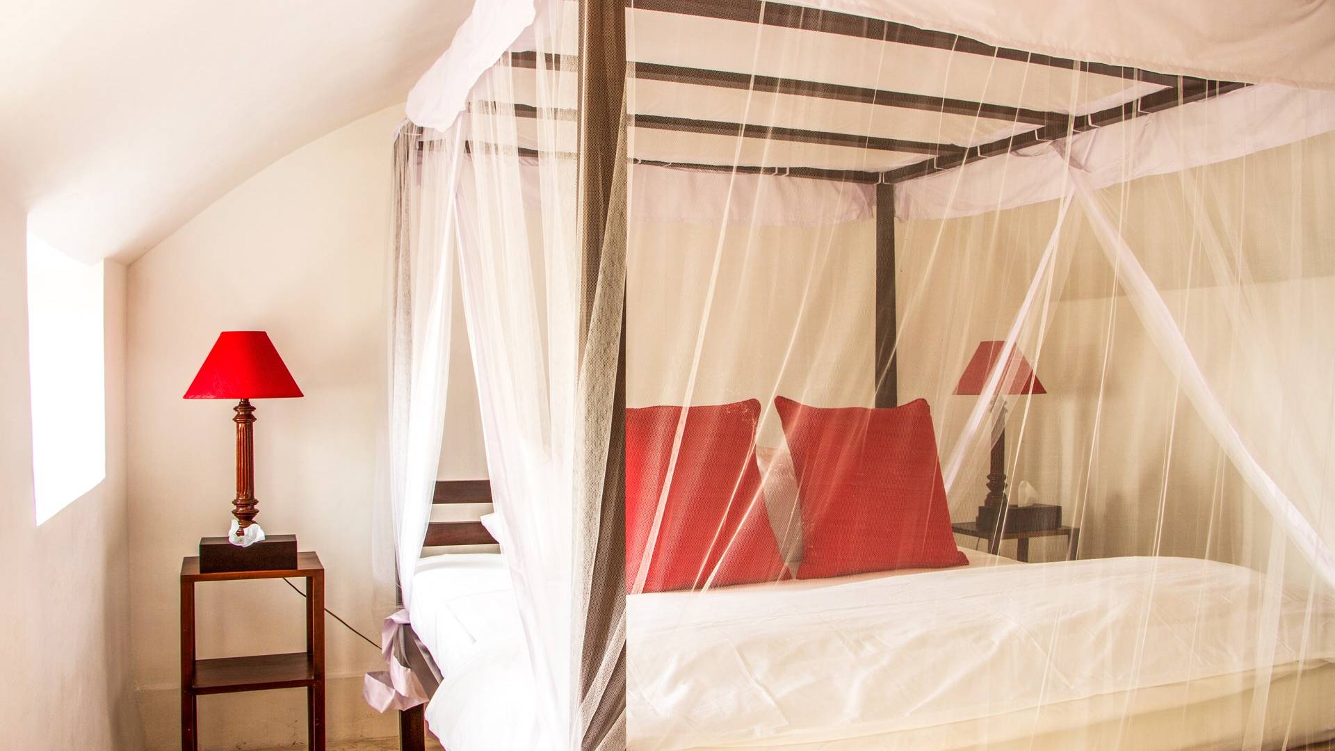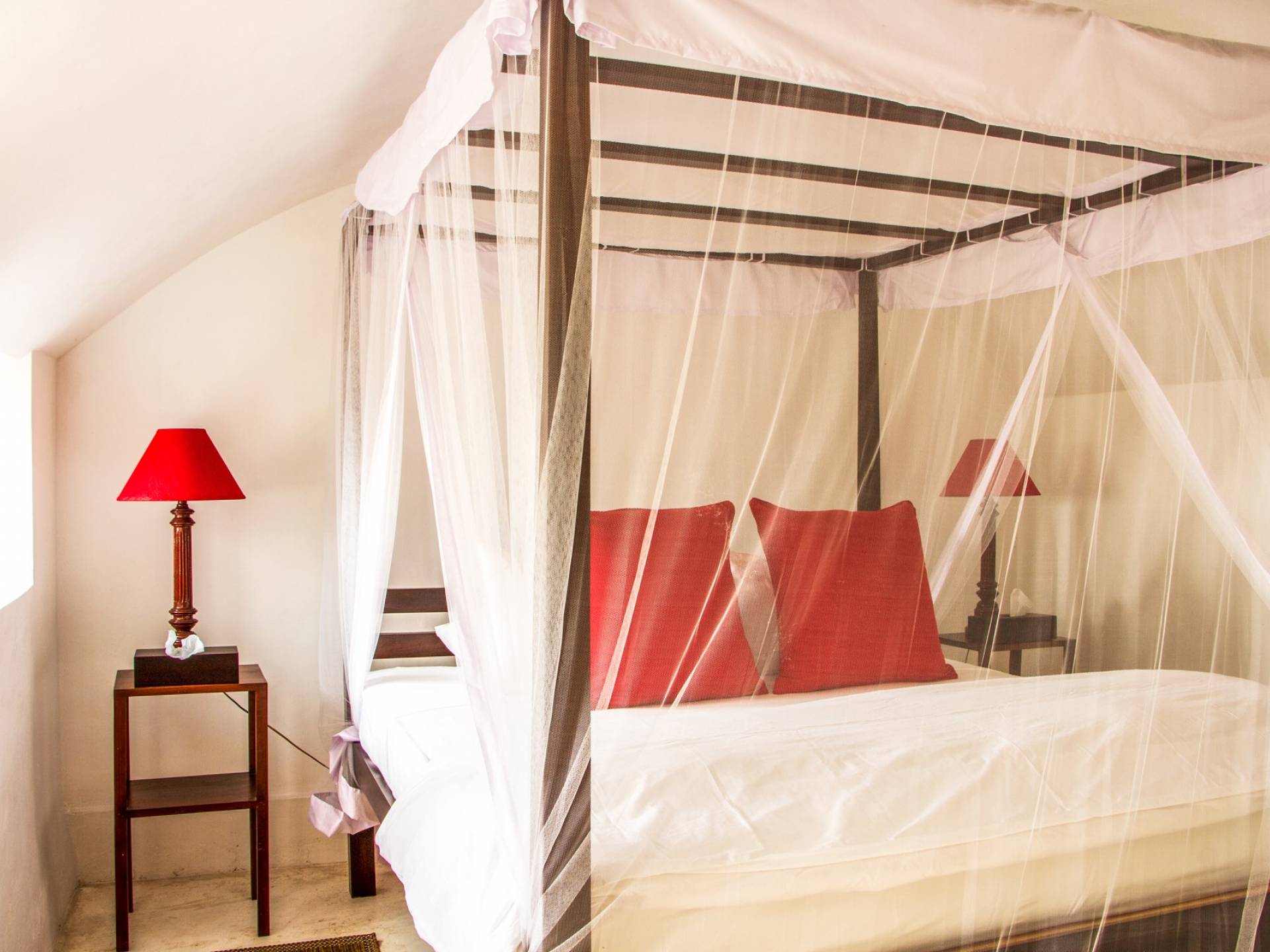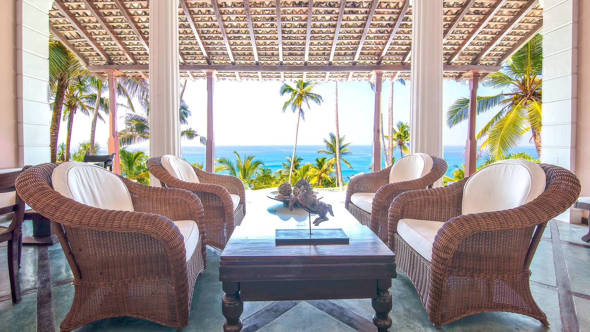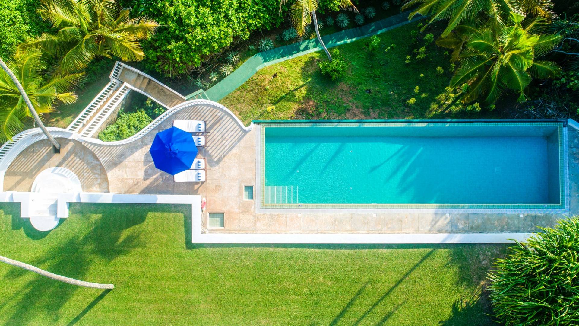 Il salotto di Pointe Sud si apre su un'ampia veranda con gradini bianchi che conducono teatralmente in giardino. Sedie rilassanti e un tavolo da pranzo per dieci si affacciano sulla spettacolare vista a 180 gradi sul mare, sulla piscina e sul giardino. Quattro comode camere da letto si aprono sul soggiorno. Ogni camera è climatizzata, dotata di letti a baldacchino e dispone di un moderno bagno privato con doccia. Due delle camere presentano splendide viste sul mare attraverso le finestre con sbarre in legno kithul. La camera da letto verso est della villa ha anche un giardino privato con vasca a padiglione. La camera doppia, situata sul retro della casa, è arredata per i bambini. La quinta camera da letto ha due porte, una che dà sul giardino su entrambi i lati.