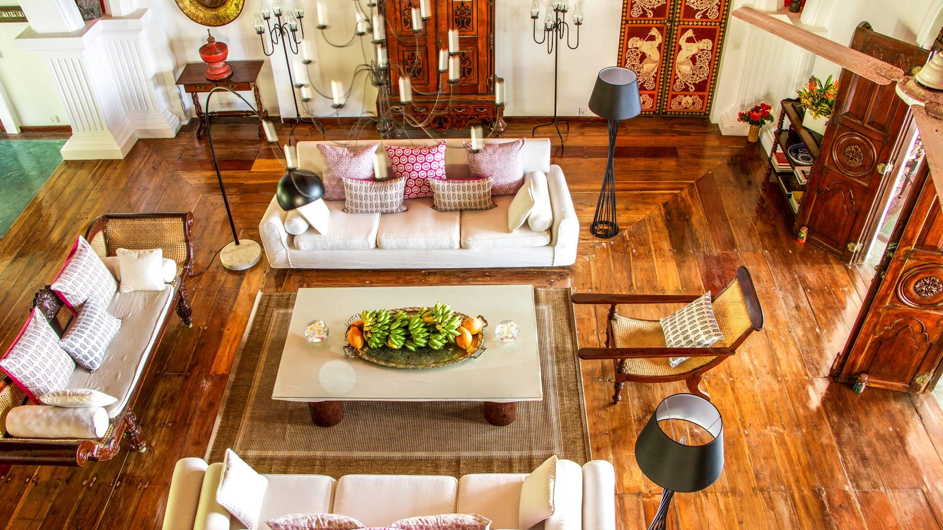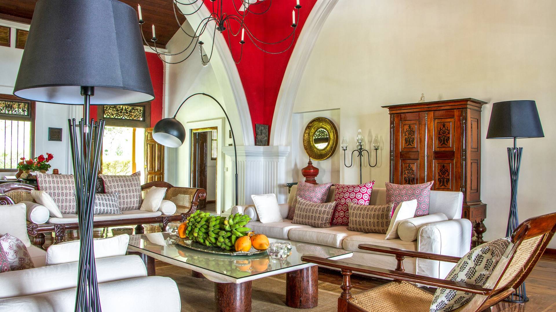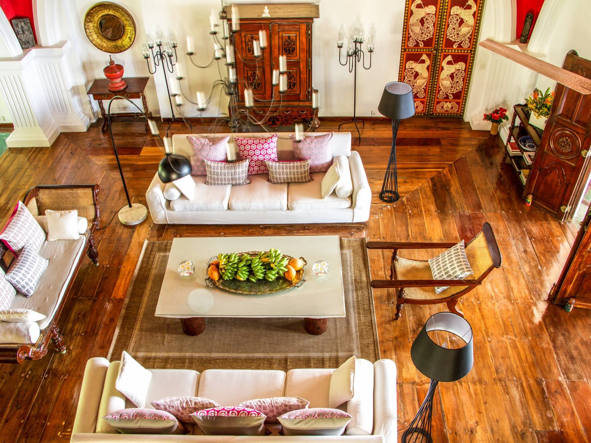 L'ingresso di Pointe Sud conduce in un magnifico salotto con un suggestivo soffitto sormontato da un tetto a pagoda a più livelli. Le vecchie assi del pavimento in teak sono sormontate da divani con cuscini avorio, lampade da terra, librerie antiche e un tavolo da pranzo formale per dieci persone. Una scala nascosta conduce al soppalco che si affaccia sul soggiorno. Qui c'è un divano e una TV satellitare con lettore DVD. I bambini si divertiranno con i giocattoli che occupano la maggior parte dello spazio qui.