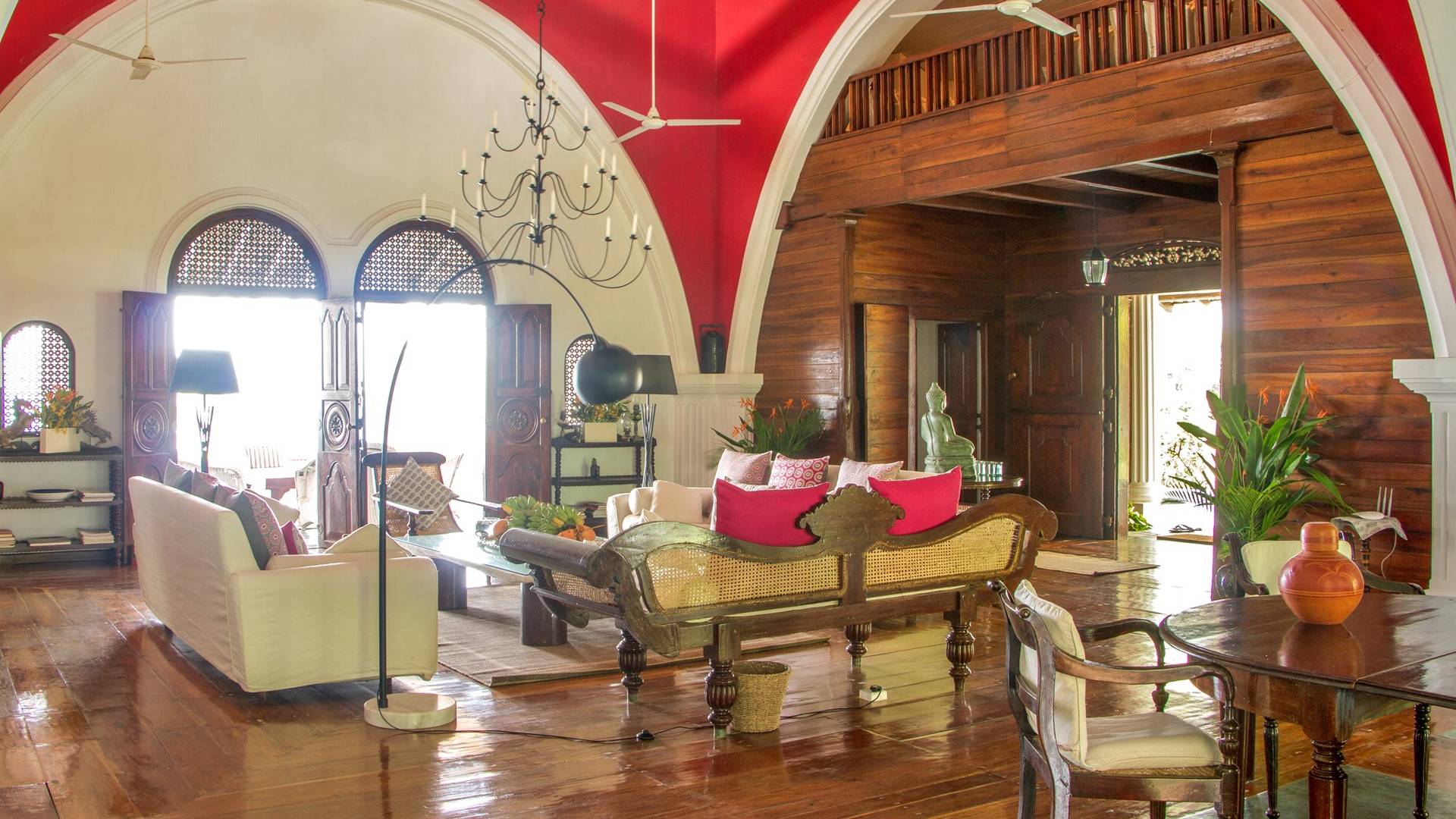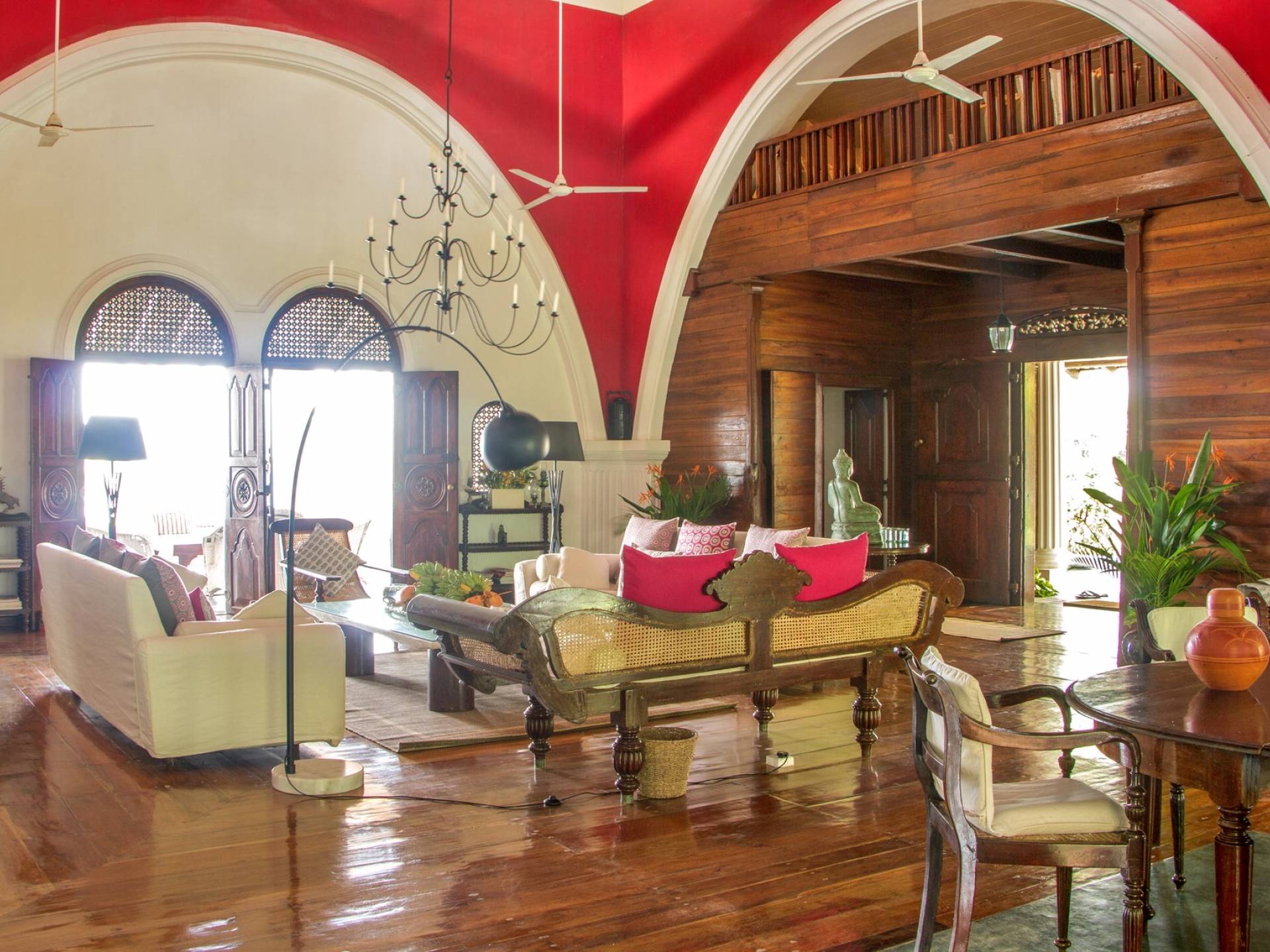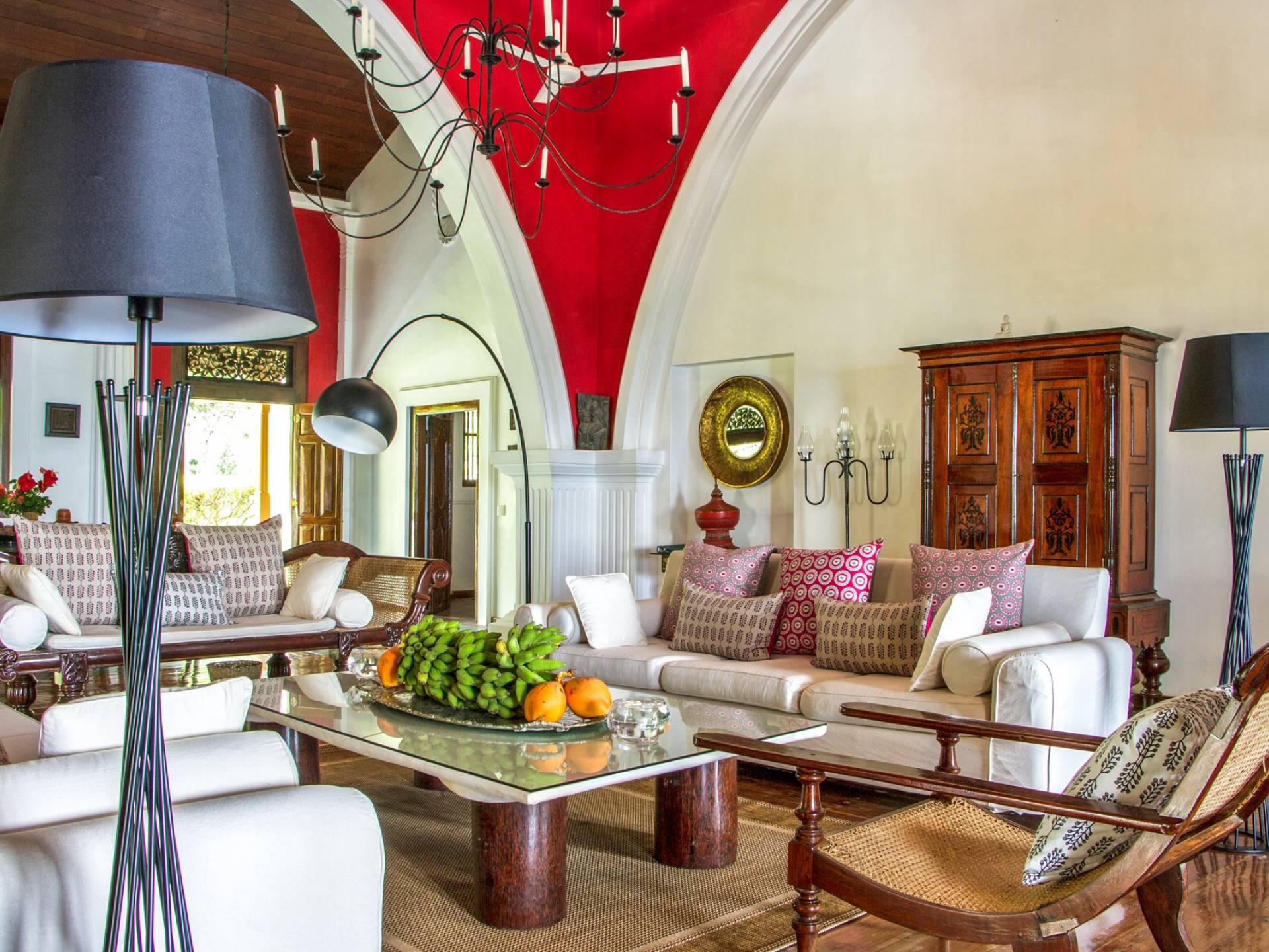 L'ingresso di Pointe Sud conduce in un magnifico salotto con un suggestivo soffitto sormontato da un tetto a pagoda a più livelli. Le vecchie assi del pavimento in teak sono sormontate da divani con cuscini avorio, lampade da terra, librerie antiche e un tavolo da pranzo formale per dieci persone. Una scala nascosta conduce al soppalco che si affaccia sul soggiorno. Qui c'è un divano e una TV satellitare con lettore DVD. I bambini si divertiranno con i giocattoli che occupano la maggior parte dello spazio qui.