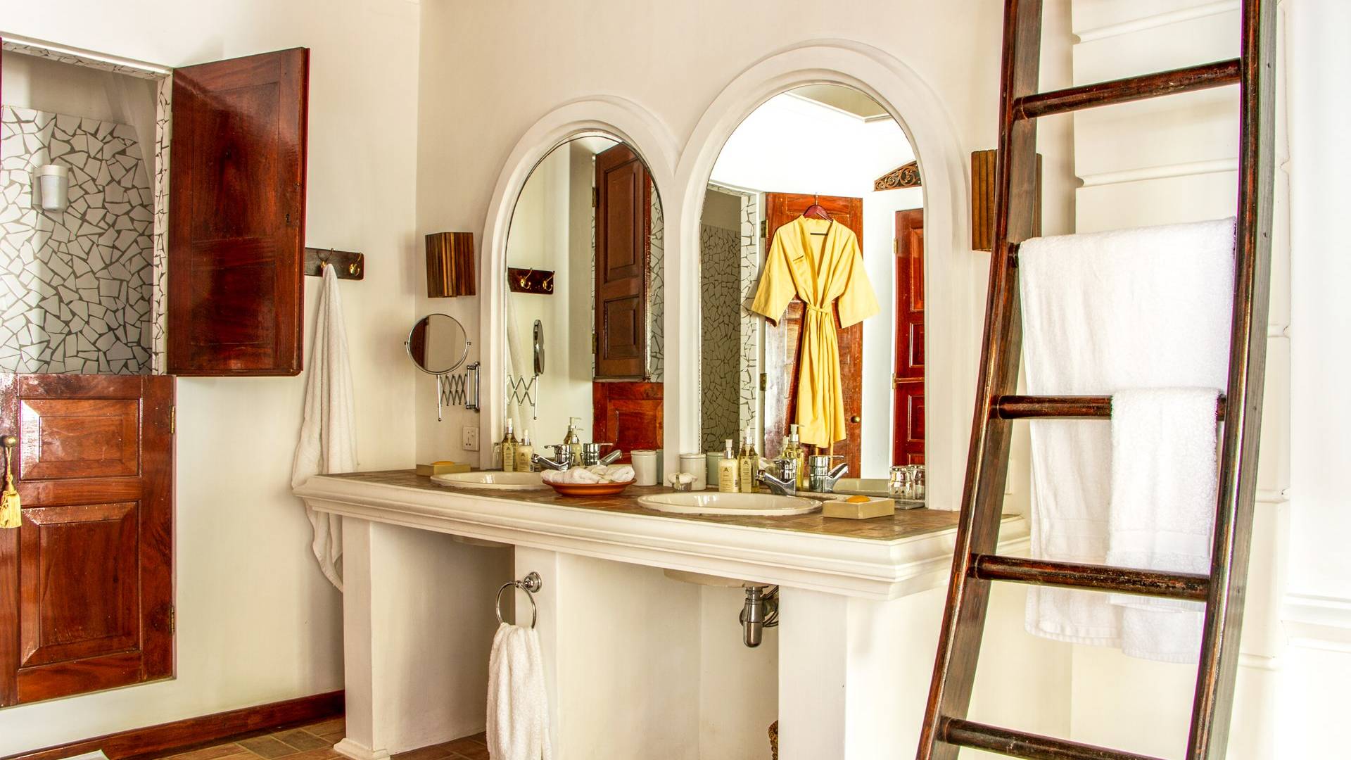La parte posteriore della villa Pointe Sud ospita una cucina completamente attrezzata che dispone di tutti gli elementi essenziali per cucinare, incluso un pratico frigorifero per vino e molto spazio per riporre gli oggetti. Ci sono due padiglioni nel giardino: uno si affaccia a ovest sulla terrazza superiore ed è ideale per yoga, massaggi e cocktail al tramonto. L'altro è raggiungibile scendendo 70 gradini sul prato inferiore proprio accanto alla spiaggia. Questo padiglione inferiore è l'ideale per sfuggire al sole e godersi i barbecue durante il giorno. C'è anche una piscina circondata da lettini e ombrelloni. La villa è servita da una governante, chef, giardiniere e gestore della villa.