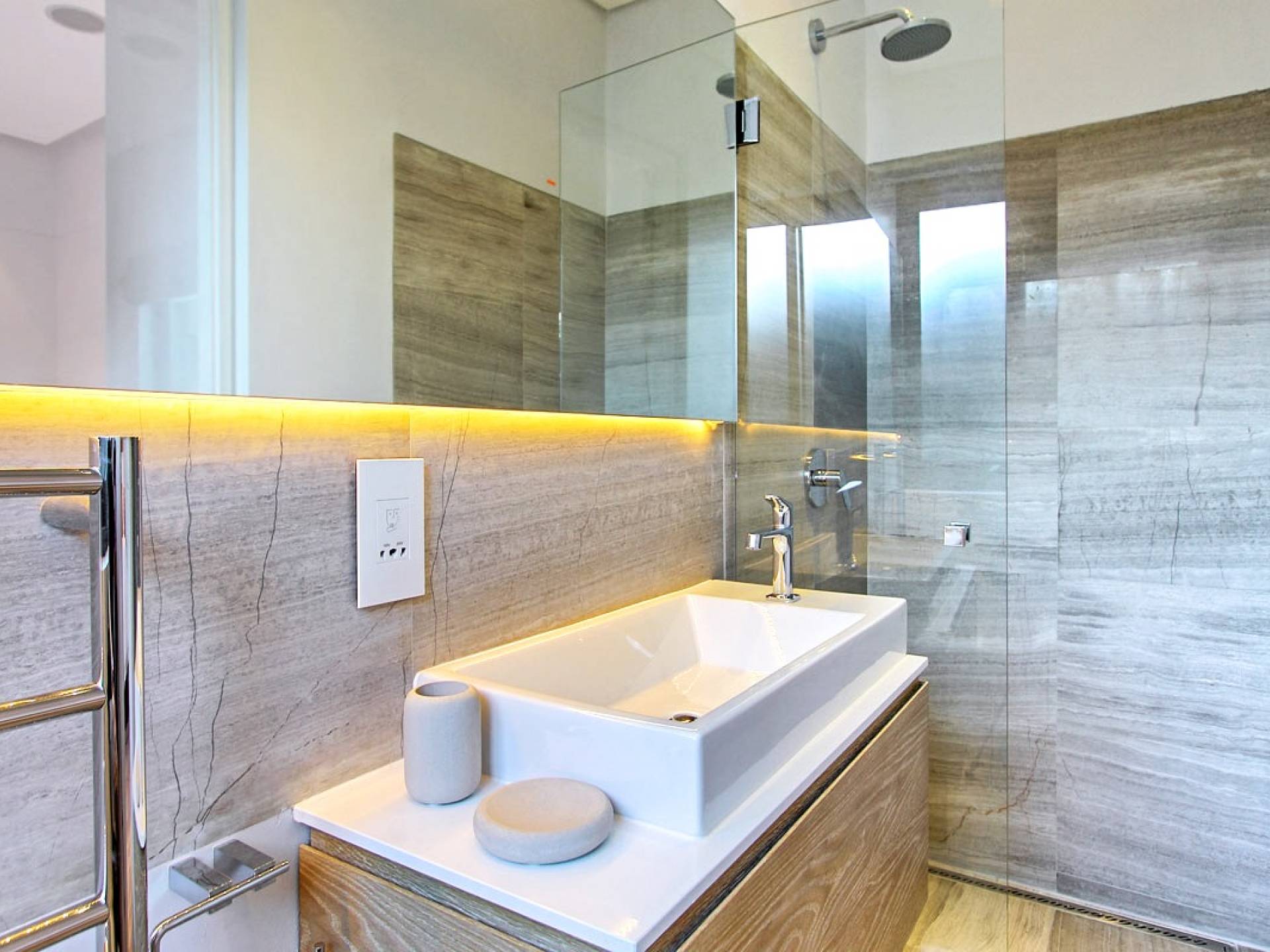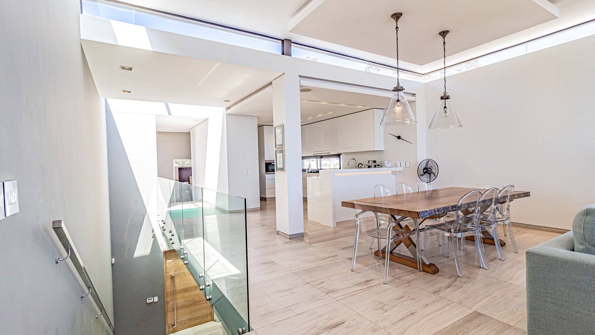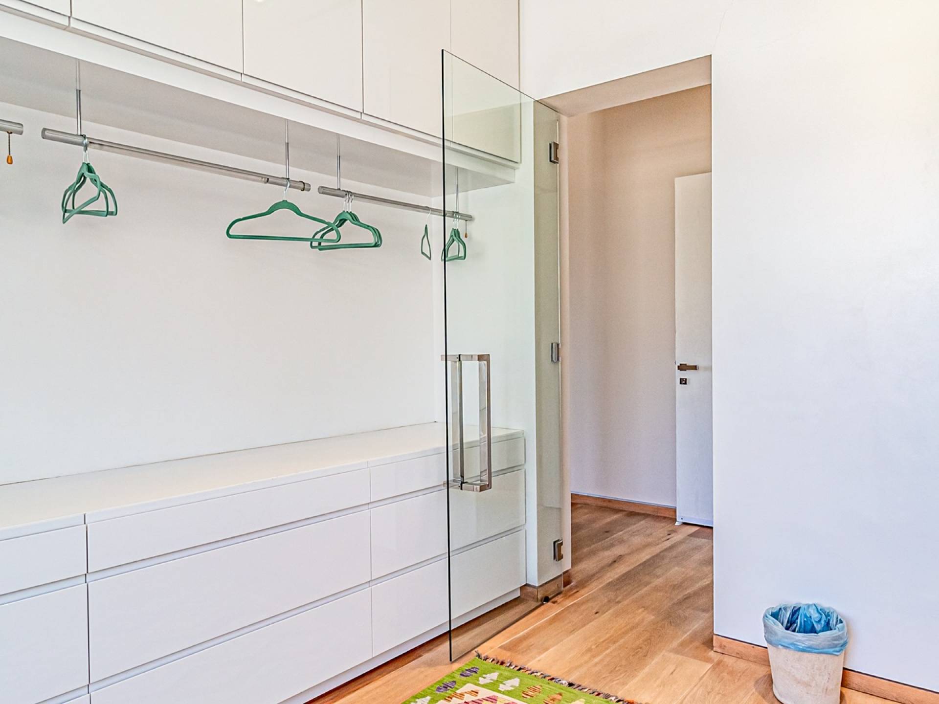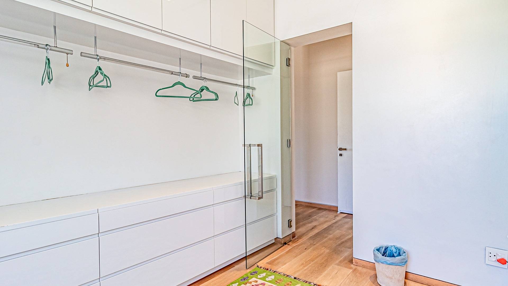 Un ampio garage a doppio volume conduce direttamente nell'atrio riparato e nell'ascensore. La porta d'ingresso accede al piano terra della proprietà, mentre l'ascensore porta gli ospiti al soggiorno e alla zona cucina sovrastante. Una maestosa scala galleggiante in vetro opaco attira lo sguardo fino al livello superiore. Tre delle quattro camere da letto sono situate al piano terra. La prima camera degli ospiti, situata appena a sinistra della porta d'ingresso, è caratteristica e dispone di un letto matrimoniale. Gode di un bagno privato con una doccia spaziosa.