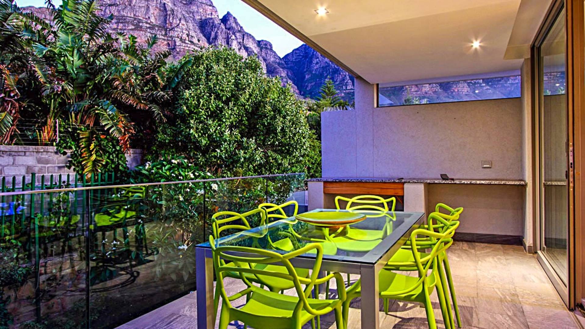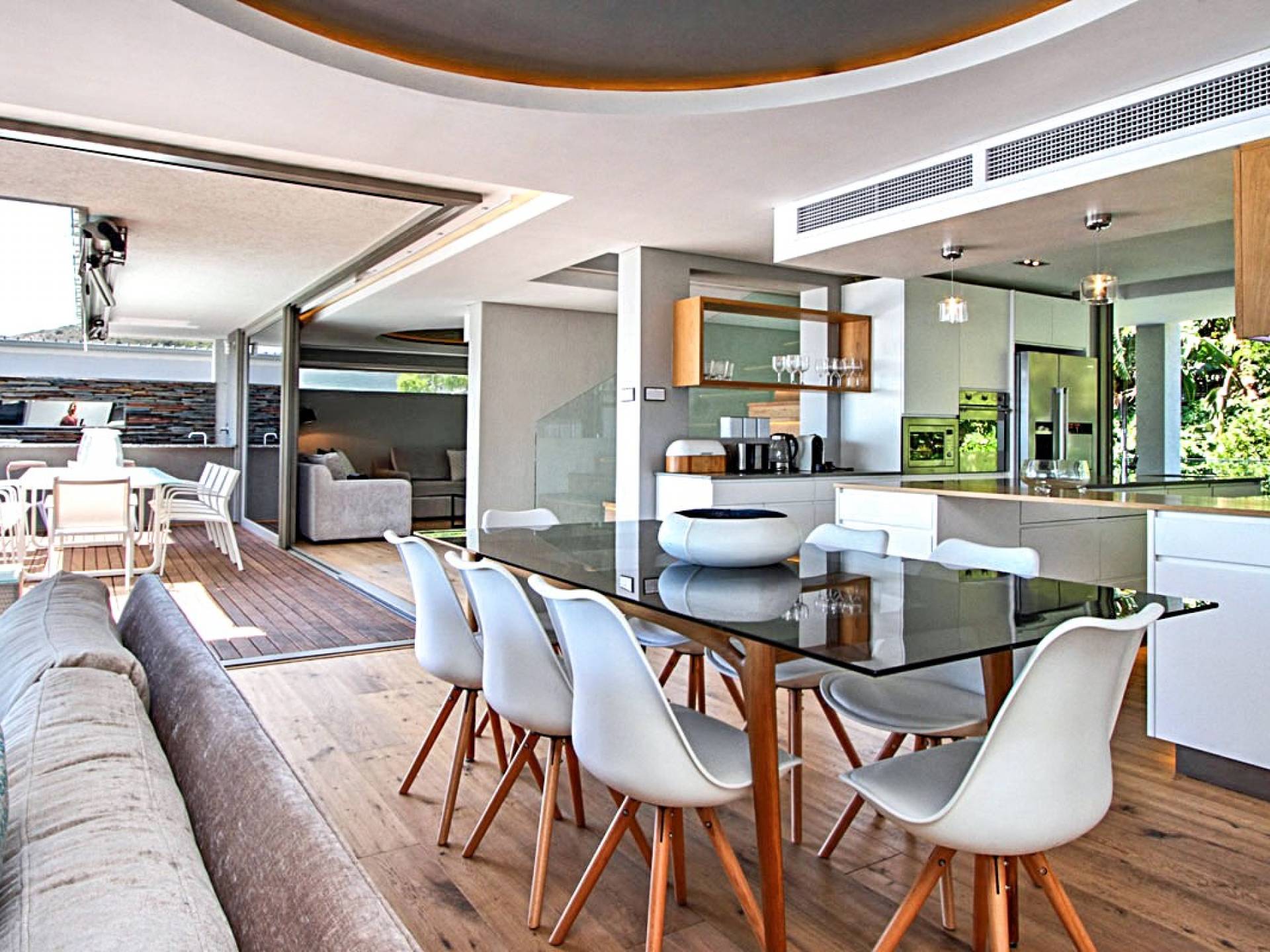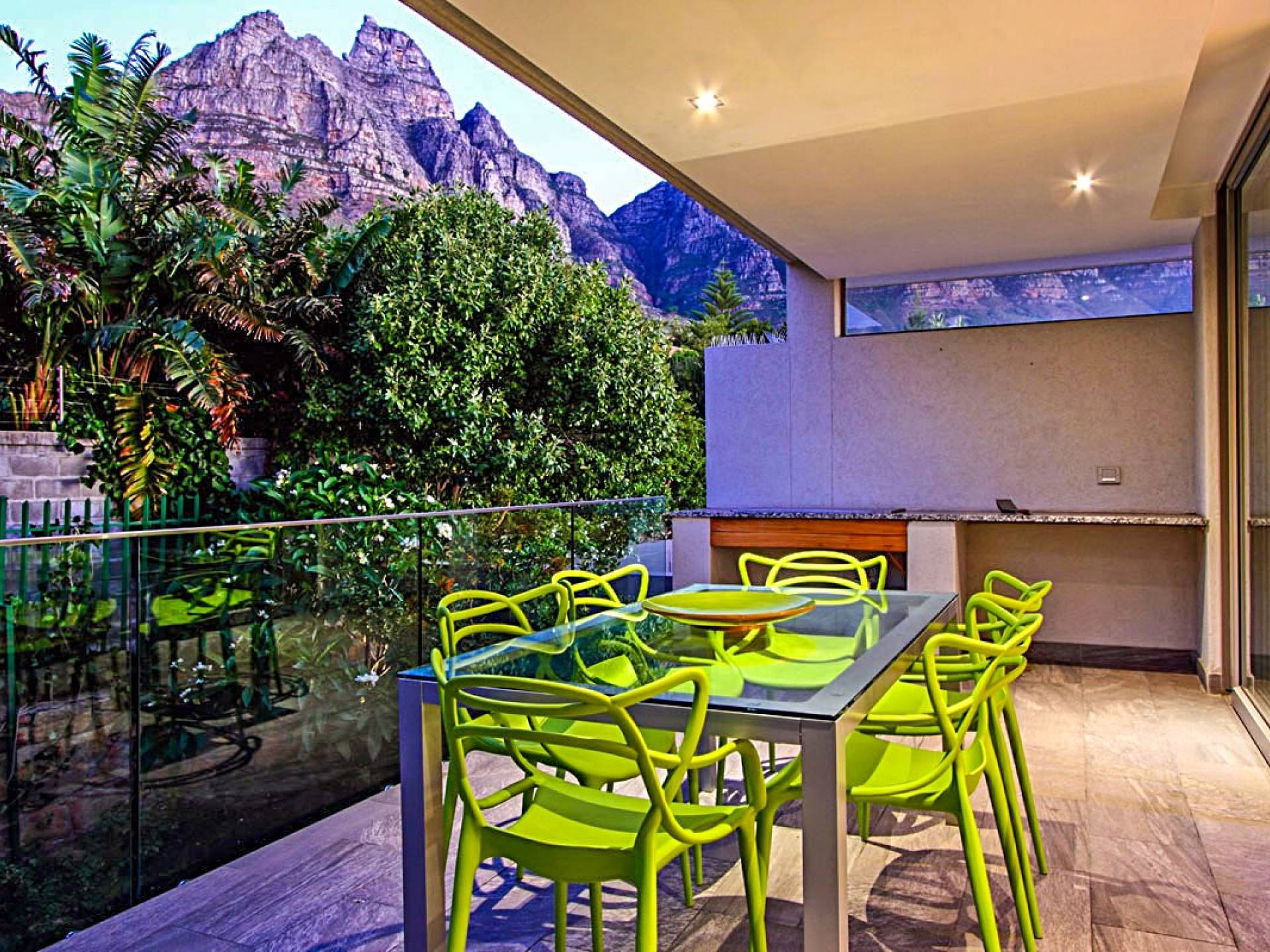 Salite le scale fino al secondo livello, spalancate le porte scorrevoli in vetro e preparatevi a lasciarvi togliere il fiato da un'ampia area soggiorno / intrattenimento con un salotto contemporaneo, TV HD curva, divani a forma di L, stato di fatto - una cantinetta per vino all'avanguardia e un tavolo da pranzo per otto persone. Adiacente al salone in questo bellissimo open space tipico del vivere moderno si trova una cucina completamente attrezzata, che vanta tutti i comfort necessari per il vostro soggiorno, tra cui una stufa a gas, due forni elettrici e piano cottura, doppio frigo / congelatore, macchina per il caffè e un retrocucina separato con lavatrice e asciugatrice e lavastoviglie. La cucina si apre su un fresco balcone sul retro che si affaccia sulla montagna con una splendida vista sulla funivia di Table Mountain e sui Dodici Apostoli. Questo balcone sul retro ha un barbecue a gas, un tavolo all'aperto con posti a sedere per sei persone per gustare la colazione al sole del mattino e un'area lounge all'aperto con comode sedie per un po 'di ombra pomeridiana. A completare questo magnifico livello abitativo c'è un'altra sala di intrattenimento separata, che dispone di comodi divani e tappeti, un televisore a schermo super grande e un sistema di intrattenimento high-tech con audio surround per quella serata al cinema.