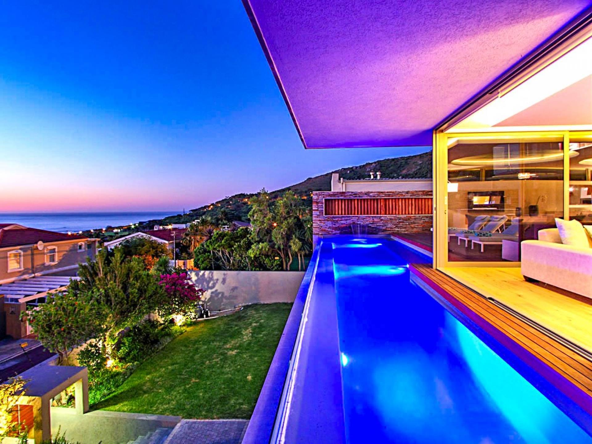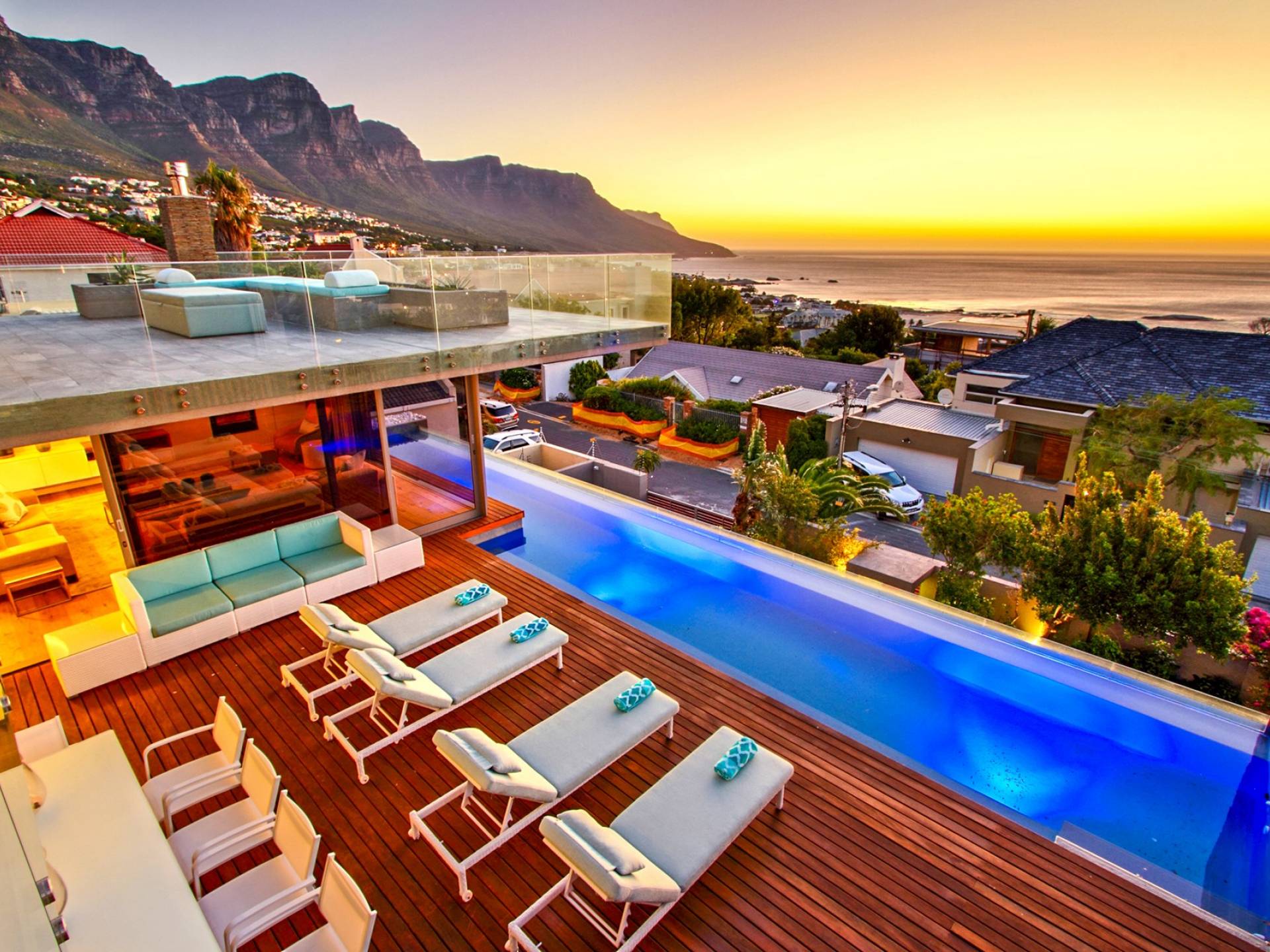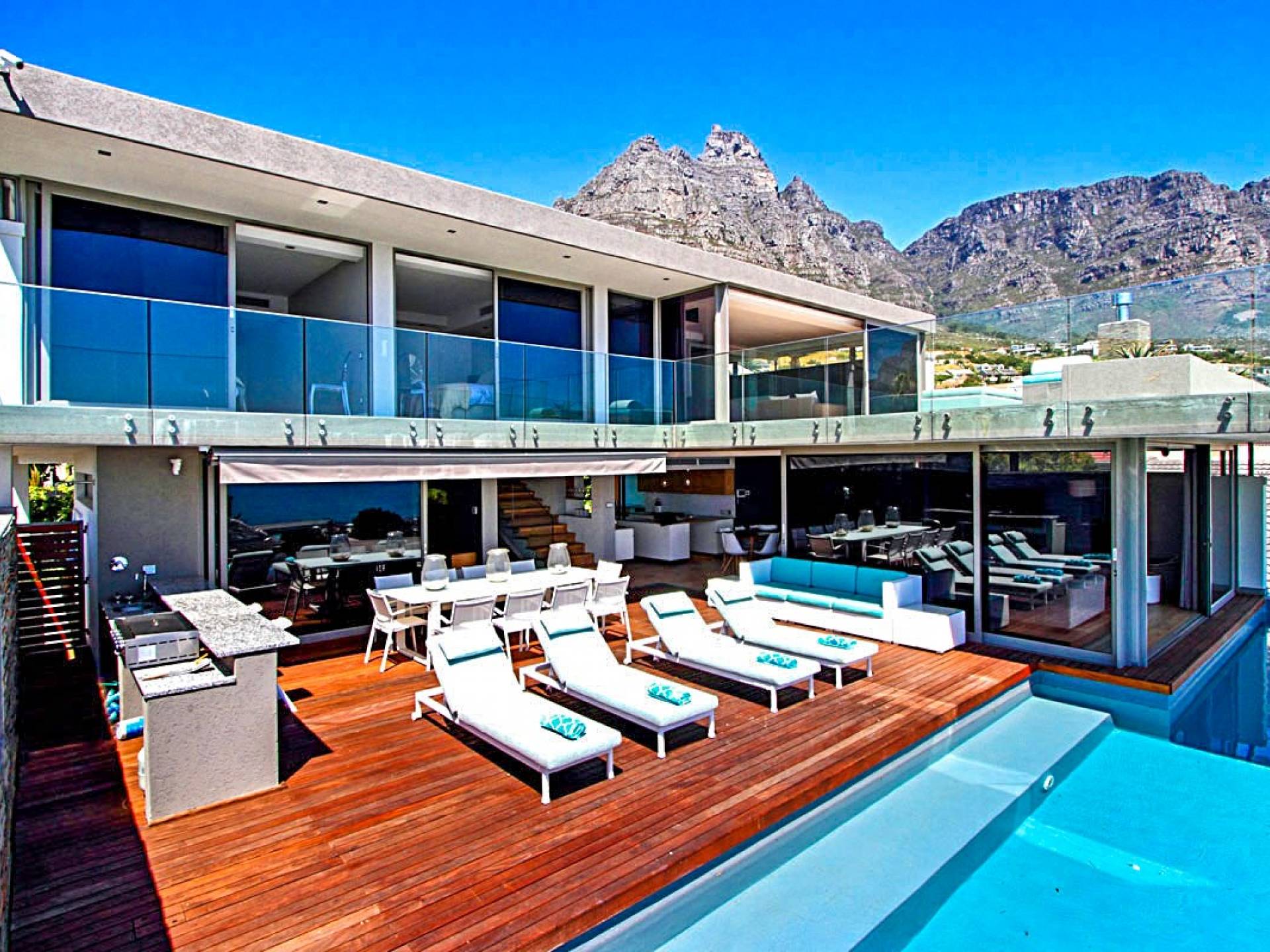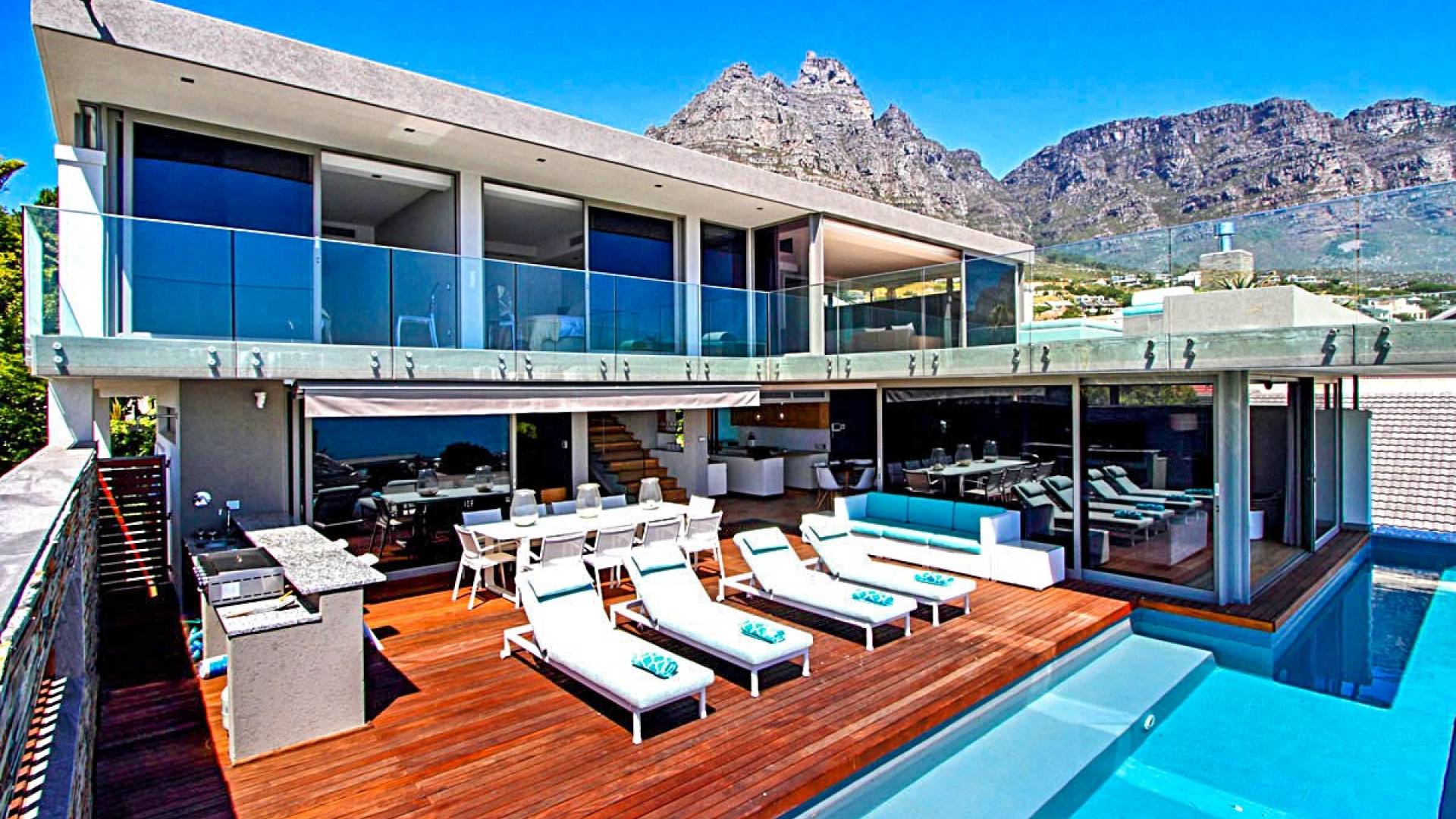 Tutte le stanze di questo livello si estendono su un vasto ponte di legno con una scintillante piscina di 15 metri completa di sedili Martini per ammirare le splendide viste di Lion's Head e dell'oceano. Un bar esterno con un secondo barbecue a gas, sedie a sdraio e un tavolo da pranzo all'aperto per 10 lo rendono un luogo perfetto per intrattenere le serate estive. Accendi la fontana d'acqua, le luci della piscina e le luci di intrattenimento interne per un'incantevole scena di intrattenimento serale per ammirare il tramonto sull'oceano.