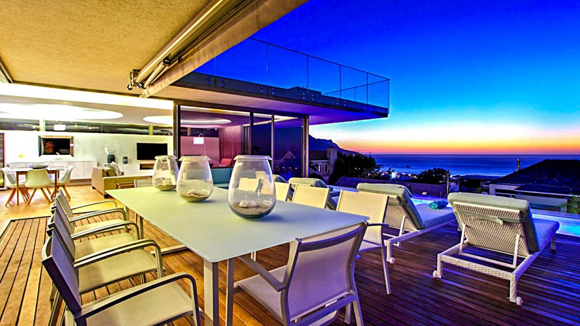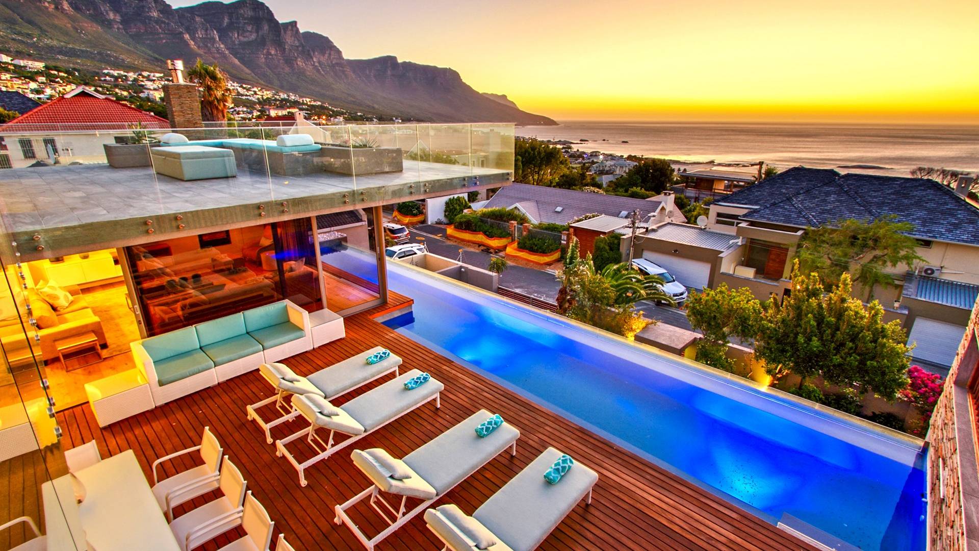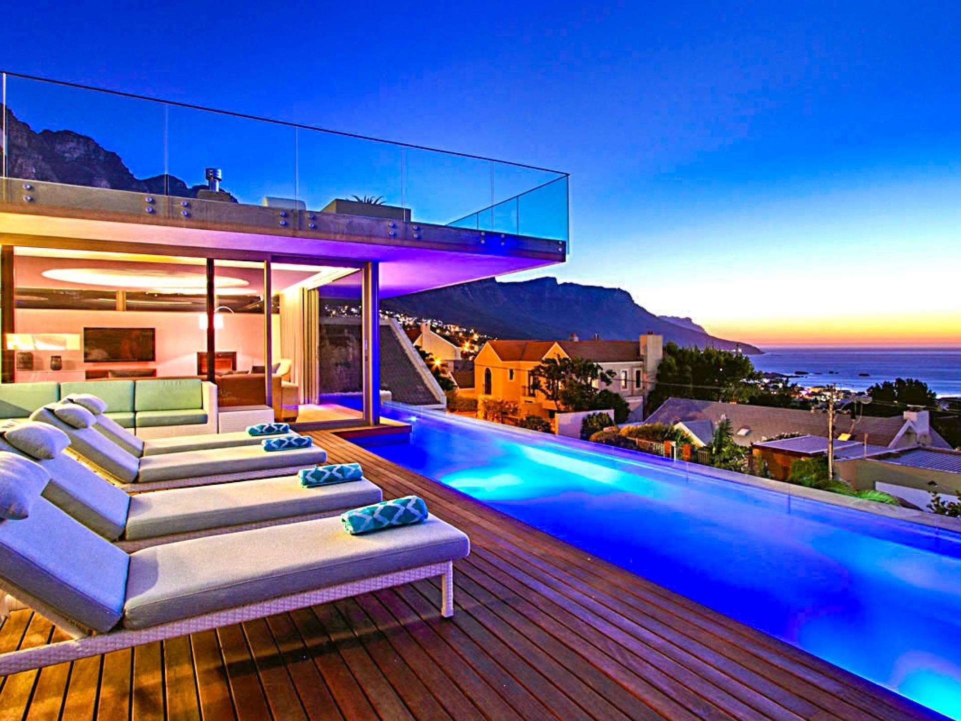 Tutte le stanze di questo livello si estendono su un vasto ponte di legno con una scintillante piscina di 15 metri completa di sedili Martini per ammirare le splendide viste di Lion's Head e dell'oceano. Un bar esterno con un secondo barbecue a gas, sedie a sdraio e un tavolo da pranzo all'aperto per 10 lo rendono un luogo perfetto per intrattenere le serate estive. Accendi la fontana d'acqua, le luci della piscina e le luci di intrattenimento interne per un'incantevole scena di intrattenimento serale per ammirare il tramonto sull'oceano.