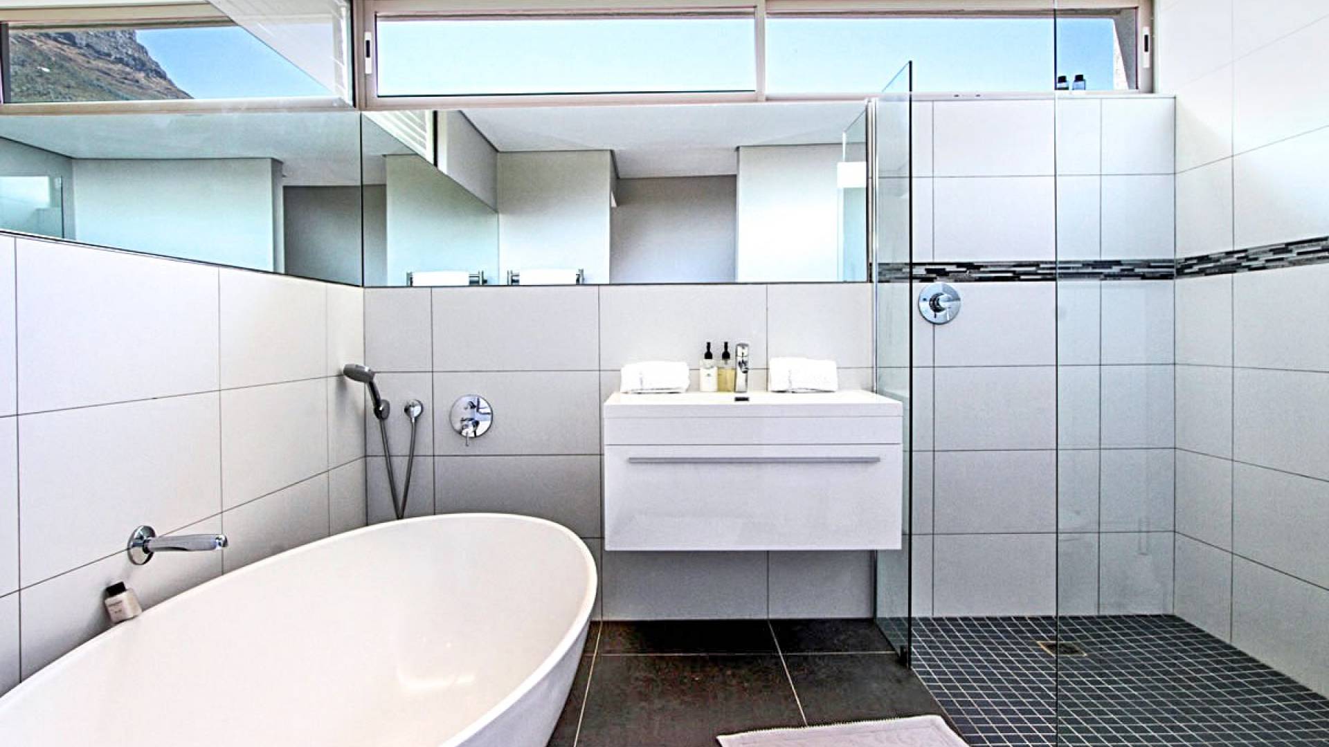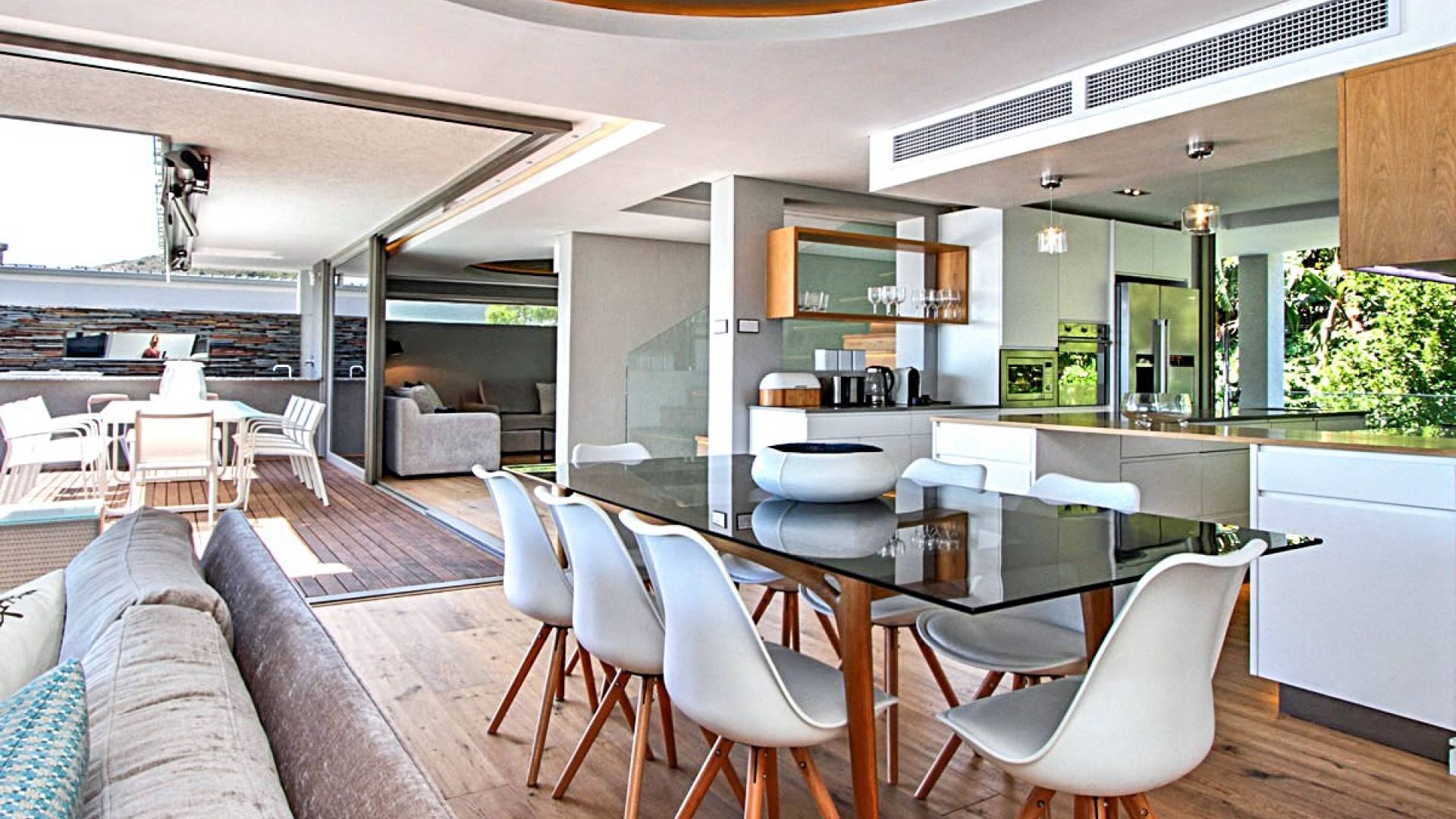 Questa casa contemporanea mozzafiato è il rifugio perfetto per famiglie o gruppi di amici per godersi lo spensierato stile di vita cosmopolita di Città del Capo con la grandiosità suburbana e impareggiabili viste sull'oceano e sulle montagne. Questa proprietà è progettata su tre livelli, ognuno dei quali gode di comodi spazi di intrattenimento e balconi riparati che offrono una vista impareggiabile sull'oceano o sulle montagne. Alla proprietà si accede dal vialetto al piano terra, che ospita due delle cinque camere da letto.