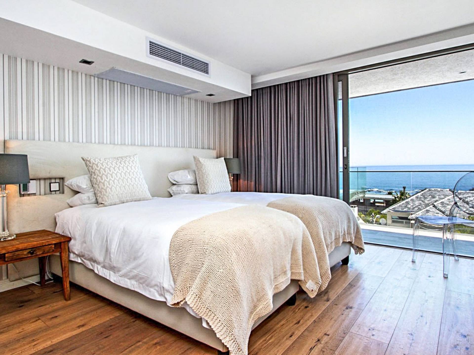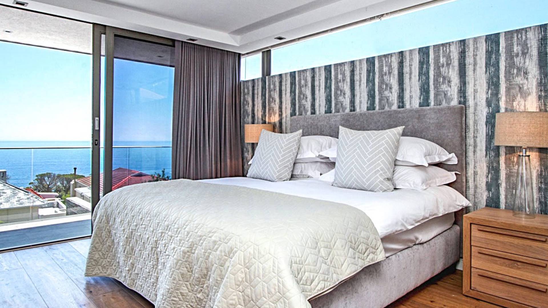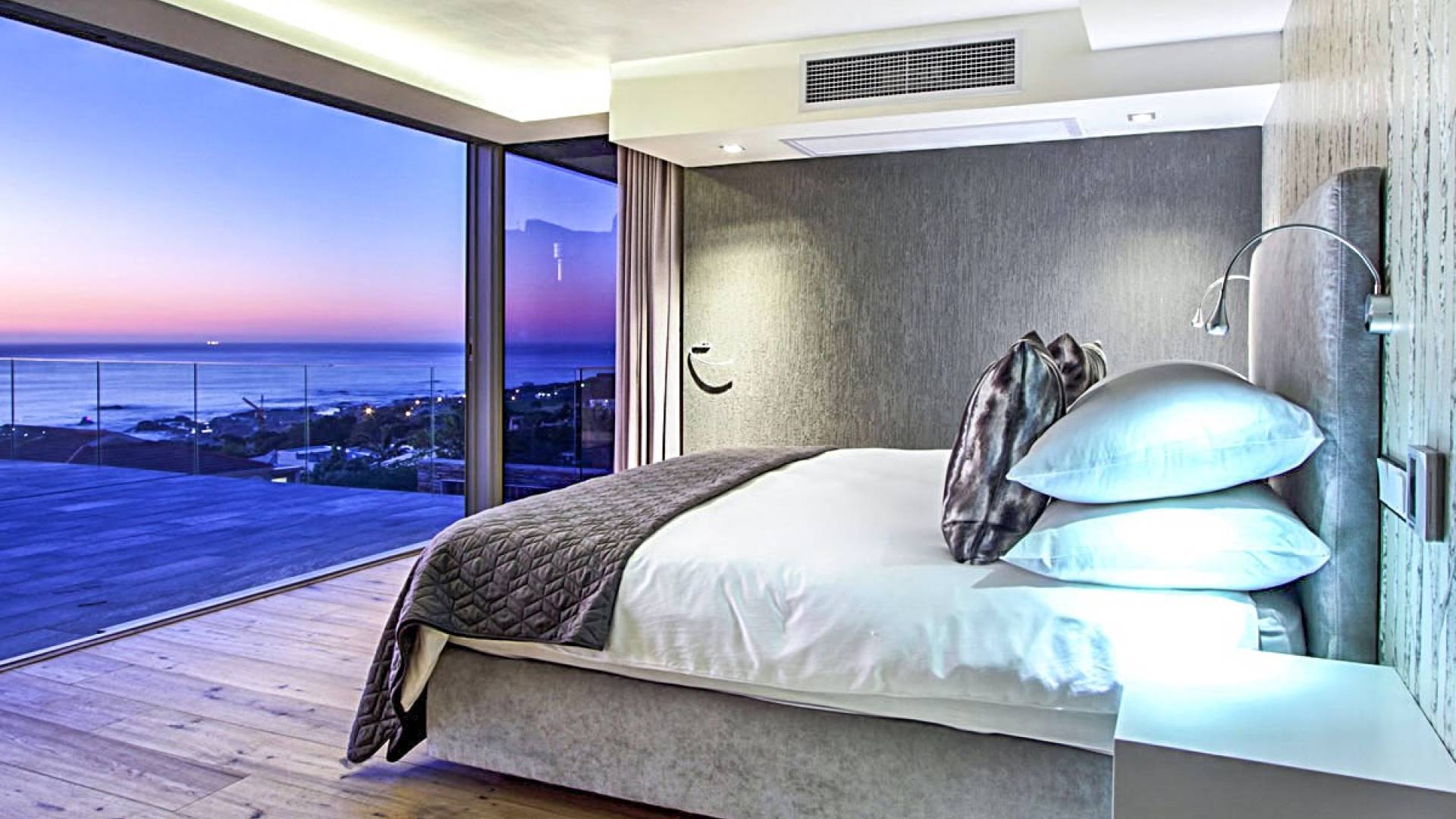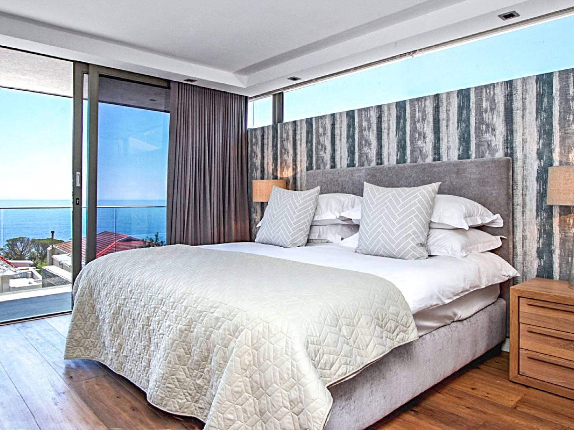 Il terzo livello di questa magnifica proprietà ospita tre lussuose camere da letto che si aprono su ampie terrazze con viste spettacolari. La spaziosa camera da letto principale è un elegante rifugio in cui fuggire, con un'ampia cabina armadio, un comodo salotto e zona TV, un letto king-size e un bagno en-suite a pianta aperta con vasca ovale e spaziosa doccia a pioggia. C'è aria condizionata in tutto e riscaldamento a pavimento in bagno. La camera da letto principale scorre su un patio piastrellato in ardesia che vanta viste mozzafiato sul mare. La seconda e la terza camera da letto a questo livello offrono rispettivamente letti convertibili king e twin-to-king. Entrambi godono di un ampio spazio armadio e dispongono di bagno privato con doccia e vasca. Tutte le camere godono di comfort moderni, come aria condizionata, termoarredo e la casa è completamente sicura e allarmata con sistemi di sicurezza all'avanguardia. La struttura offre un box doppio per due auto e un ampio vialetto con parcheggio fuori strada per almeno tre auto. Le bellissime spiagge di Camps Bay e Clifton sono a pochi passi lungo la collina, così come il vivace lungomare con una serie di ottimi ristoranti, caffè alla moda e bar vivaci