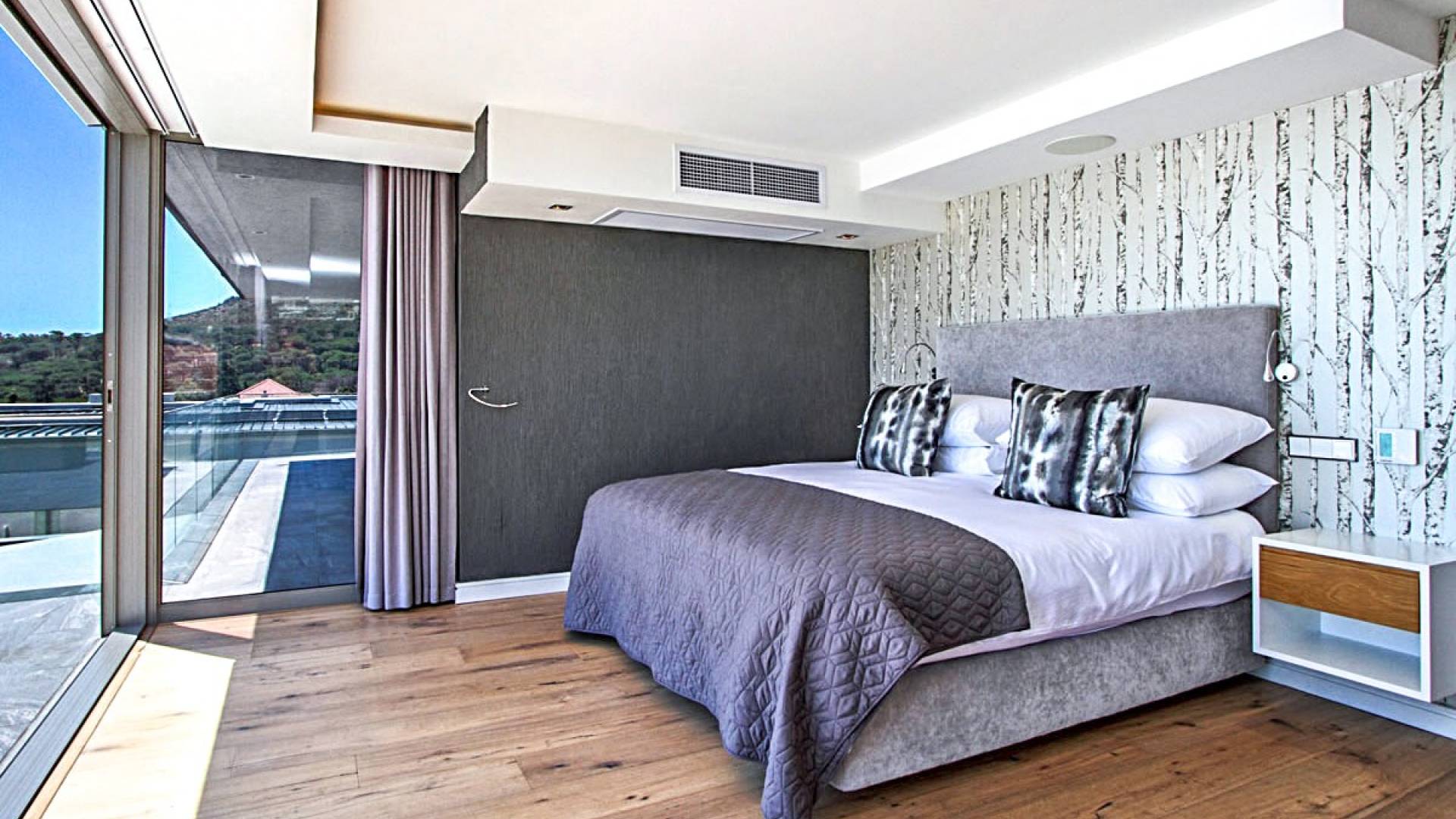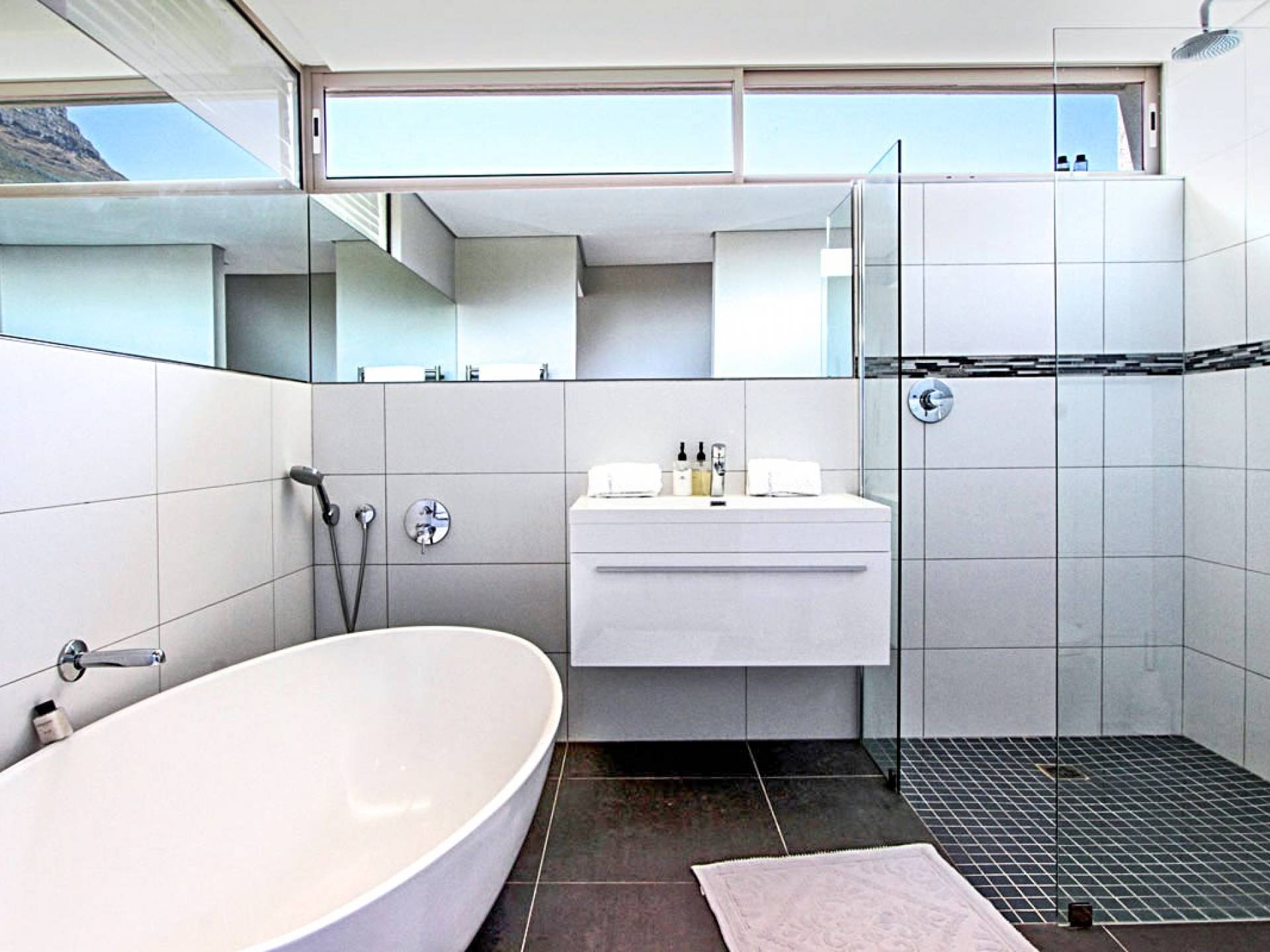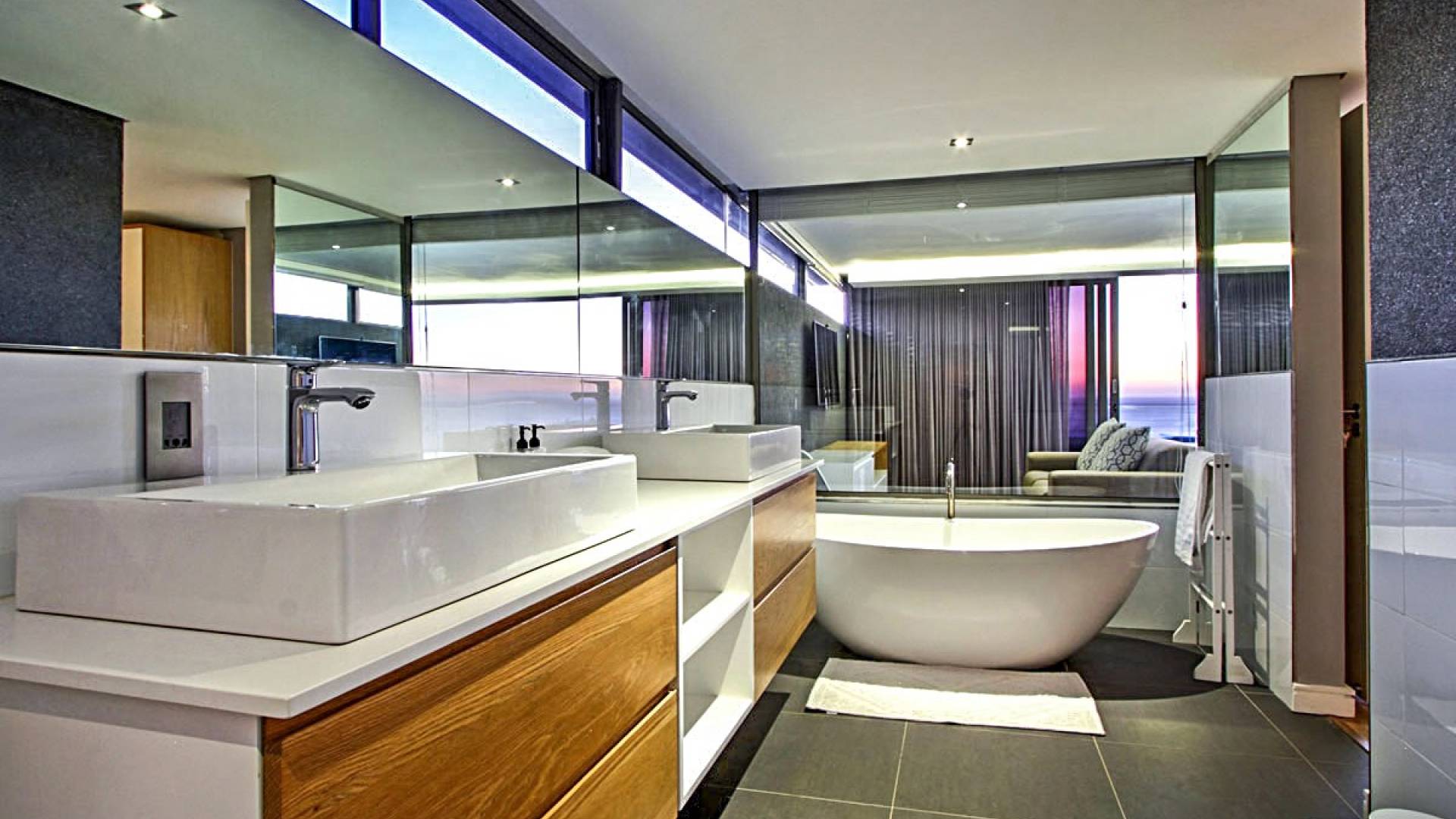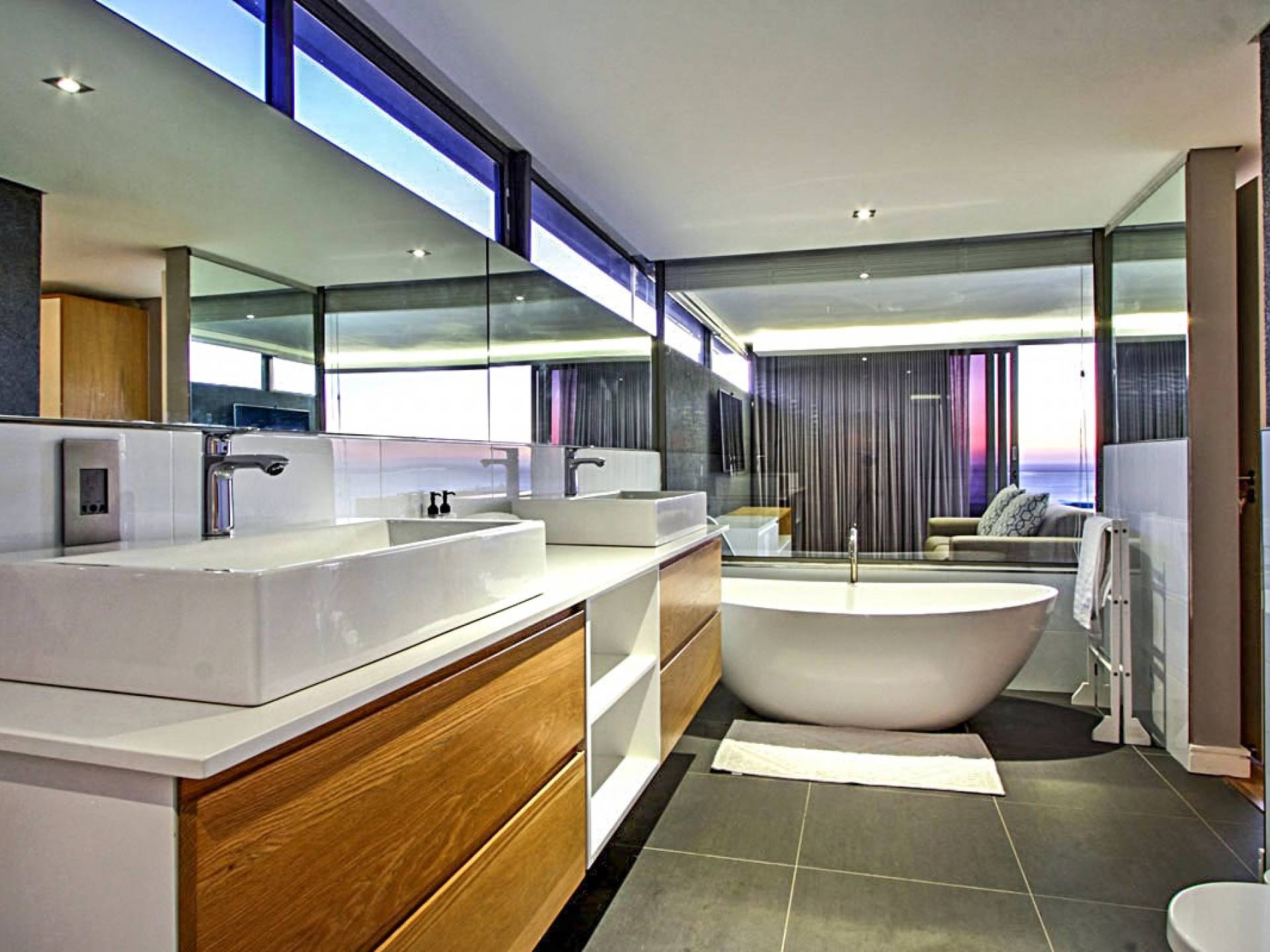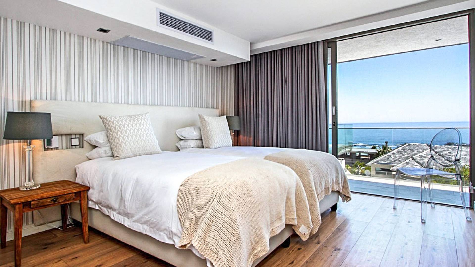 Il terzo livello di questa magnifica proprietà ospita tre lussuose camere da letto che si aprono su ampie terrazze con viste spettacolari. La spaziosa camera da letto principale è un elegante rifugio in cui fuggire, con un'ampia cabina armadio, un comodo salotto e zona TV, un letto king-size e un bagno en-suite a pianta aperta con vasca ovale e spaziosa doccia a pioggia. C'è aria condizionata in tutto e riscaldamento a pavimento in bagno. La camera da letto principale scorre su un patio piastrellato in ardesia che vanta viste mozzafiato sul mare. La seconda e la terza camera da letto a questo livello offrono rispettivamente letti convertibili king e twin-to-king. Entrambi godono di un ampio spazio armadio e dispongono di bagno privato con doccia e vasca. Tutte le camere godono di comfort moderni, come aria condizionata, termoarredo e la casa è completamente sicura e allarmata con sistemi di sicurezza all'avanguardia. La struttura offre un box doppio per due auto e un ampio vialetto con parcheggio fuori strada per almeno tre auto. Le bellissime spiagge di Camps Bay e Clifton sono a pochi passi lungo la collina, così come il vivace lungomare con una serie di ottimi ristoranti, caffè alla moda e bar vivaci