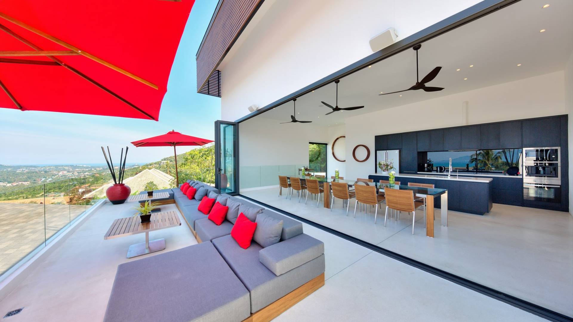 Il livello d'ingresso di Villa Kamelia Samui trasuda lusso moderno con un'atmosfera luminosa e ariosa. Entrando, sarai accolto da una vista impressionante del soggiorno, della sala da pranzo e della cucina a pianta aperta, nonché da una terrazza con vista sulla piscina.