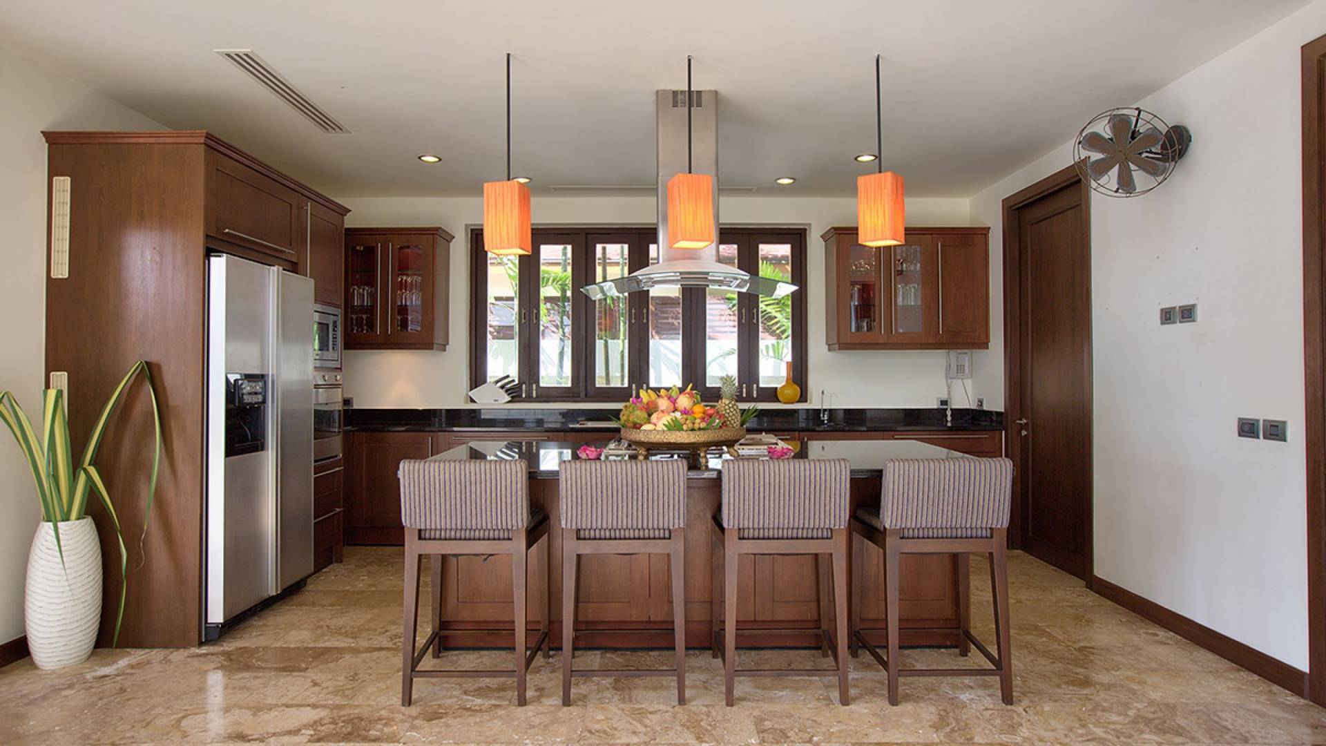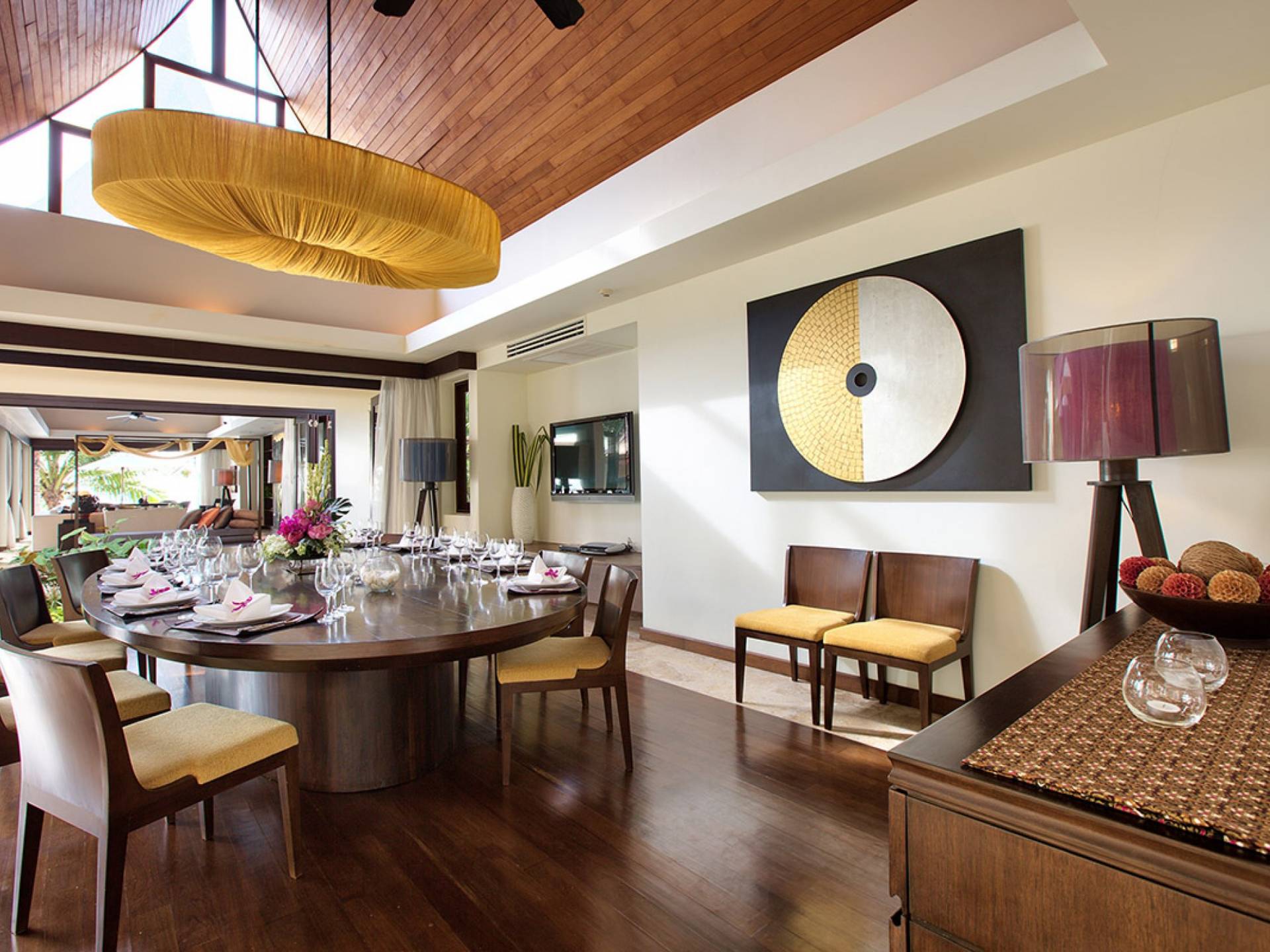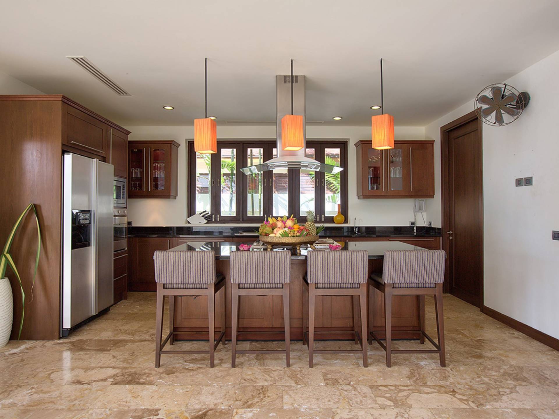La cucina, la sala da pranzo e il salotto di Villa Baan Chang occupano due padiglioni sul lato destro della proprietà, ognuno dei quali si apre completamente scorrevole sulla terrazza a bordo piscina. Una cucina occidentale completamente attrezzata è posizionata vicino all'ingresso e dispone di un bancone per la colazione per incontri mattutini informali. Da lì, un corridoio conduce direttamente alla sala da pranzo da dieci posti, poi c'è un piccolo giardino interno di fronte al padiglione lounge arredato in modo confortevole, che si apre ad un'estremità su una terrazza sulla spiaggia, anch'essa arredata con lettini da giorno.