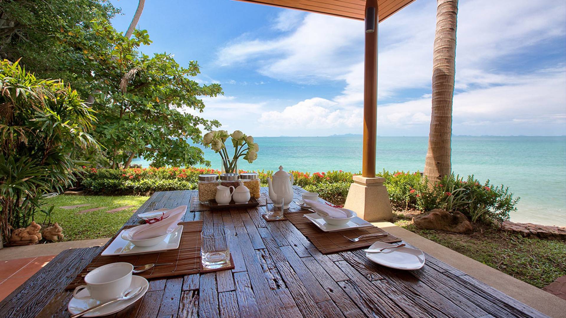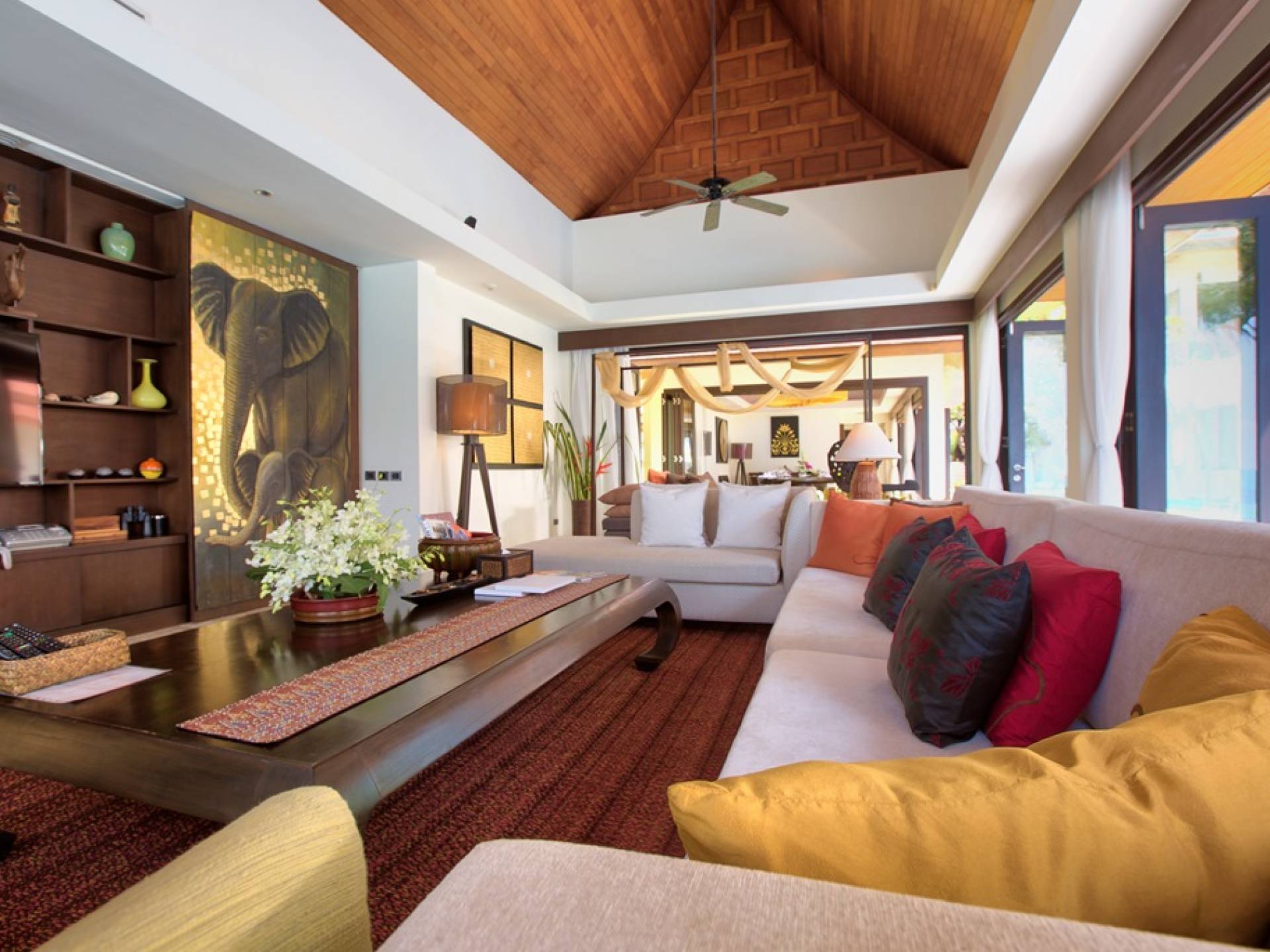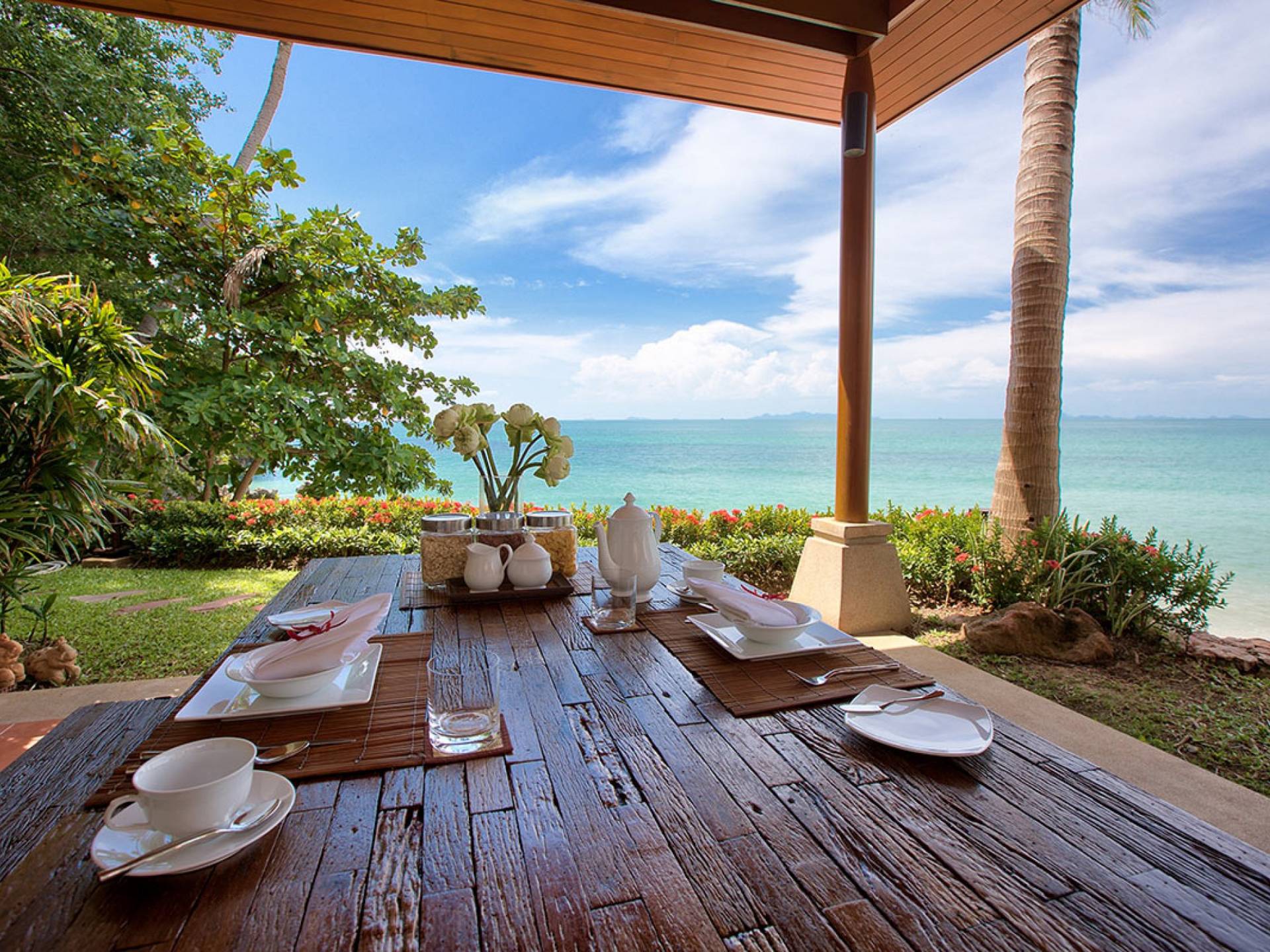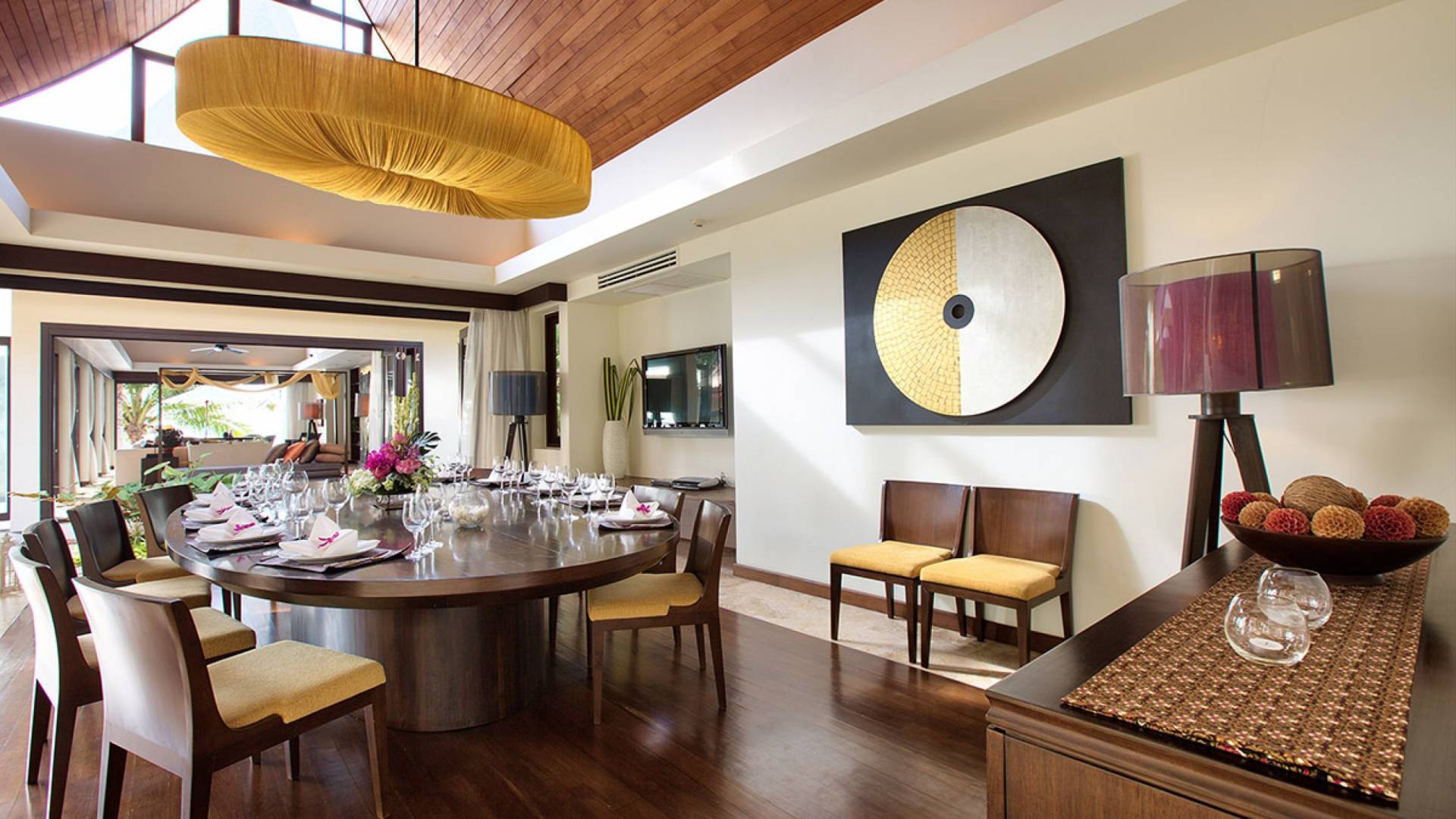 La cucina, la sala da pranzo e il salotto di Villa Baan Chang occupano due padiglioni sul lato destro della proprietà, ognuno dei quali si apre completamente scorrevole sulla terrazza a bordo piscina. Una cucina occidentale completamente attrezzata è posizionata vicino all'ingresso e dispone di un bancone per la colazione per incontri mattutini informali. Da lì, un corridoio conduce direttamente alla sala da pranzo da dieci posti, poi c'è un piccolo giardino interno di fronte al padiglione lounge arredato in modo confortevole, che si apre ad un'estremità su una terrazza sulla spiaggia, anch'essa arredata con lettini da giorno.
