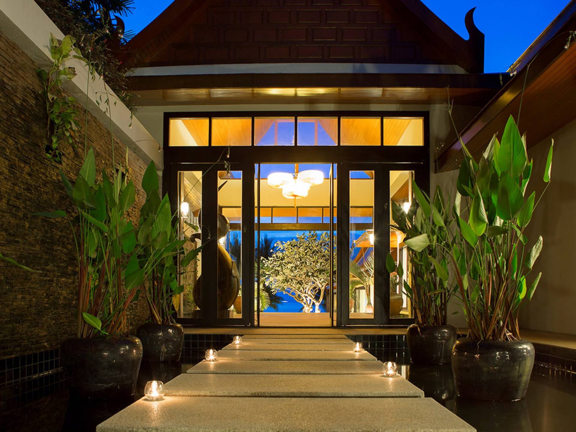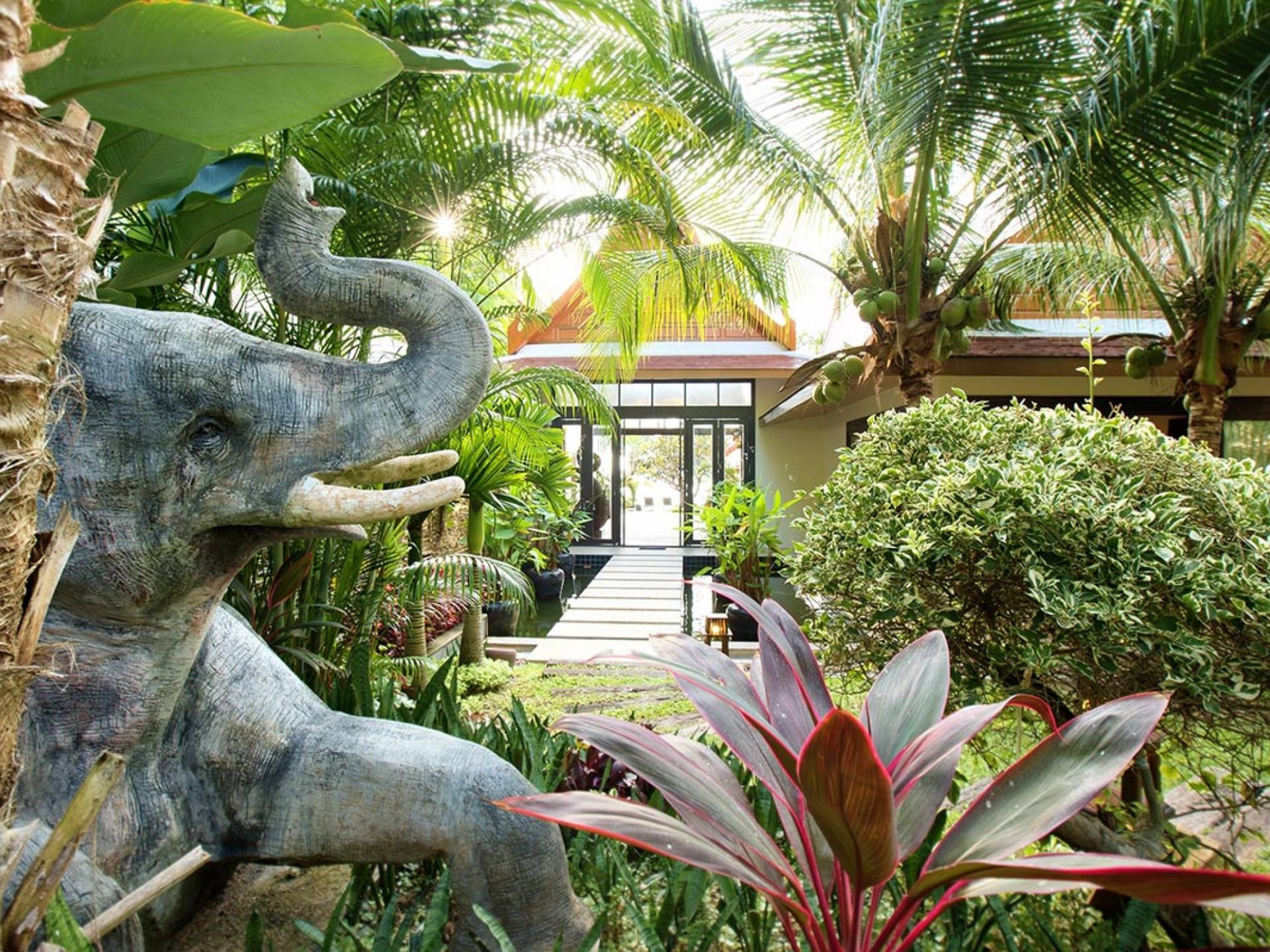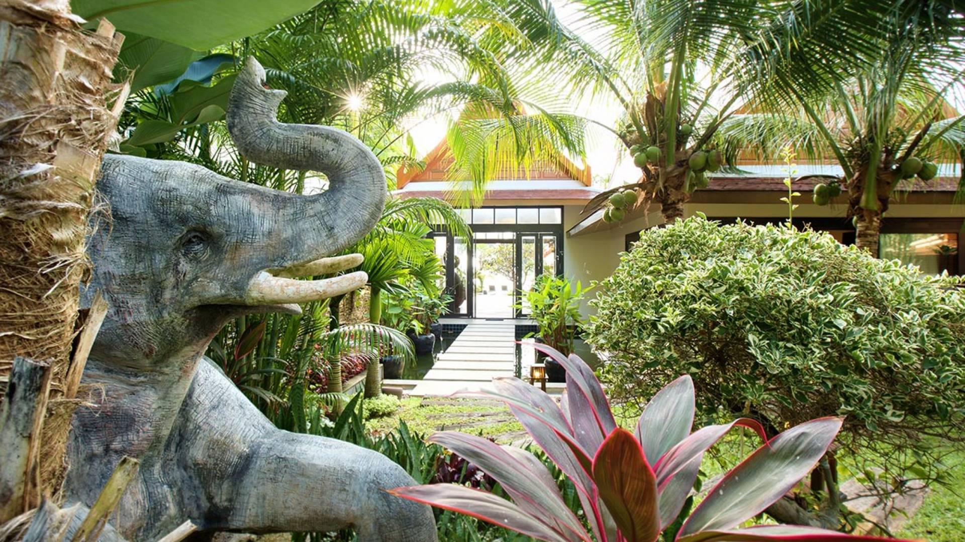 Un sentiero tortuoso conduce dalla strada privata della tenuta all'ingresso della villa attraverso un incantevole giardino con prato e giardini dove le statue di elefanti si nascondono tra il fogliame, dando alla residenza il suo nome tailandese. Gli ospiti accedono alla parte principale della proprietà tramite una serie di ampi gradini sopra un rilassante gioco d'acqua, quindi passano sotto un grande tetto a punta in stile thailandese che rappresenta il tradizionale saluto thailandese o "wai"; la stessa forma è utilizzata per i tetti dei padiglioni soggiorno e camera da letto all'interno della villa.