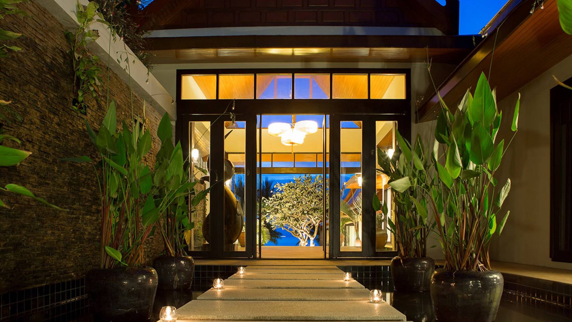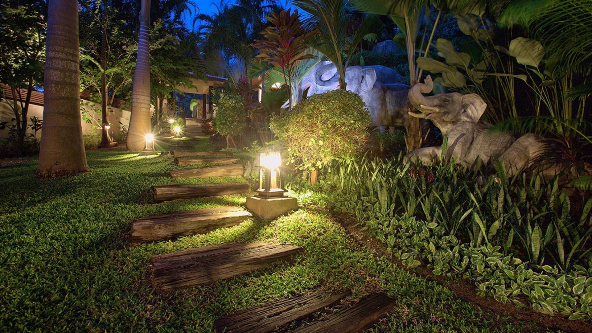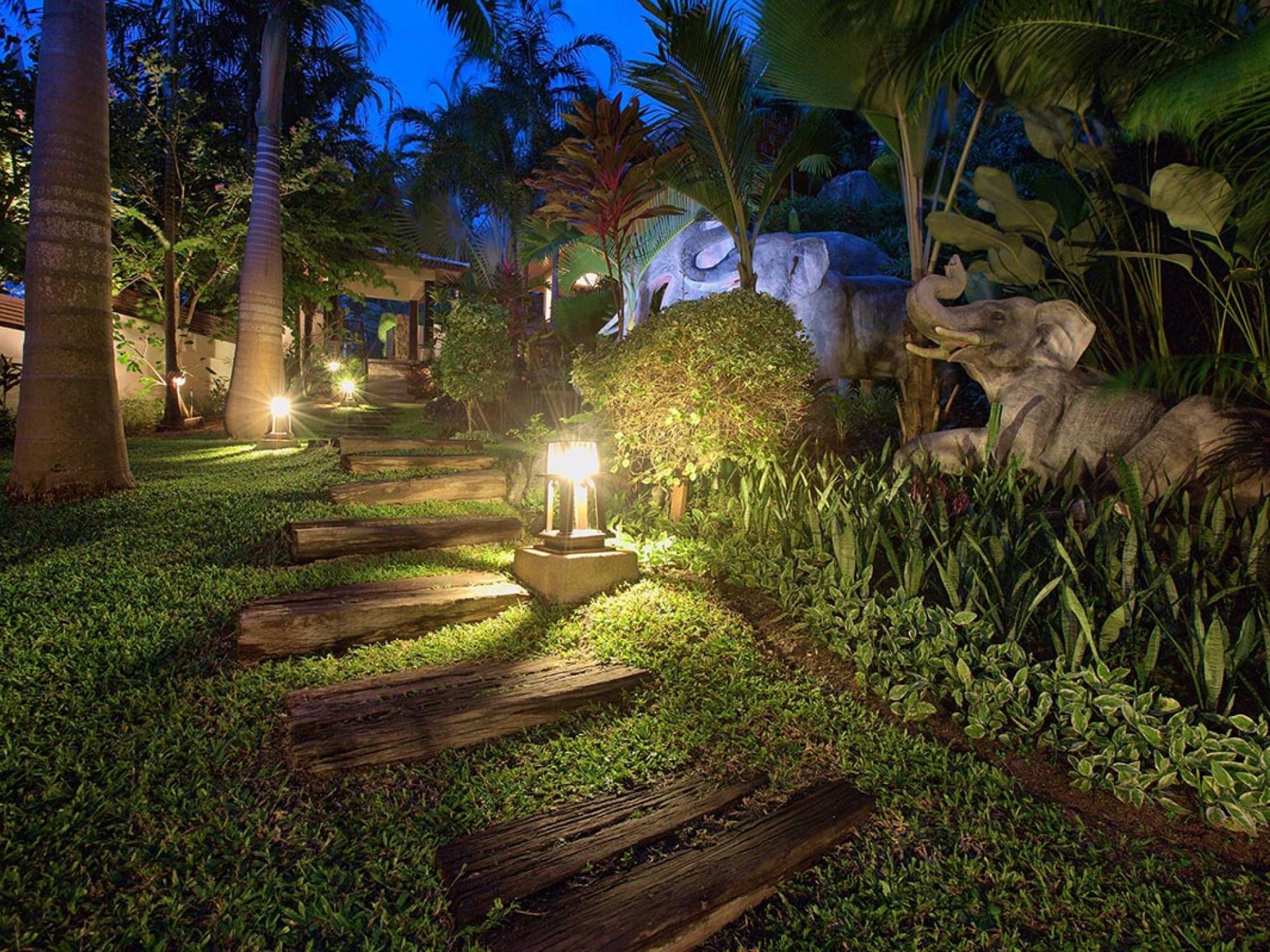 Un sentiero tortuoso conduce dalla strada privata della tenuta all'ingresso della villa attraverso un incantevole giardino con prato e giardini dove le statue di elefanti si nascondono tra il fogliame, dando alla residenza il suo nome tailandese. Gli ospiti accedono alla parte principale della proprietà tramite una serie di ampi gradini sopra un rilassante gioco d'acqua, quindi passano sotto un grande tetto a punta in stile thailandese che rappresenta il tradizionale saluto thailandese o "wai"; la stessa forma è utilizzata per i tetti dei padiglioni soggiorno e camera da letto all'interno della villa.