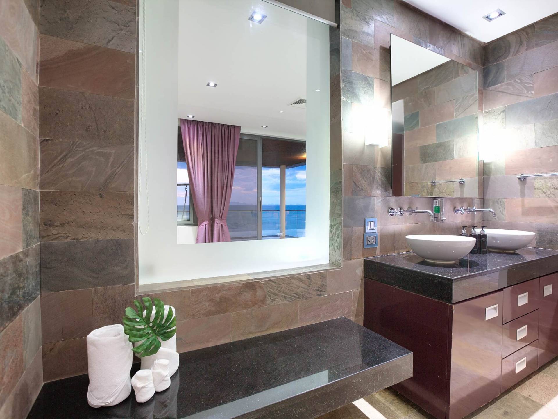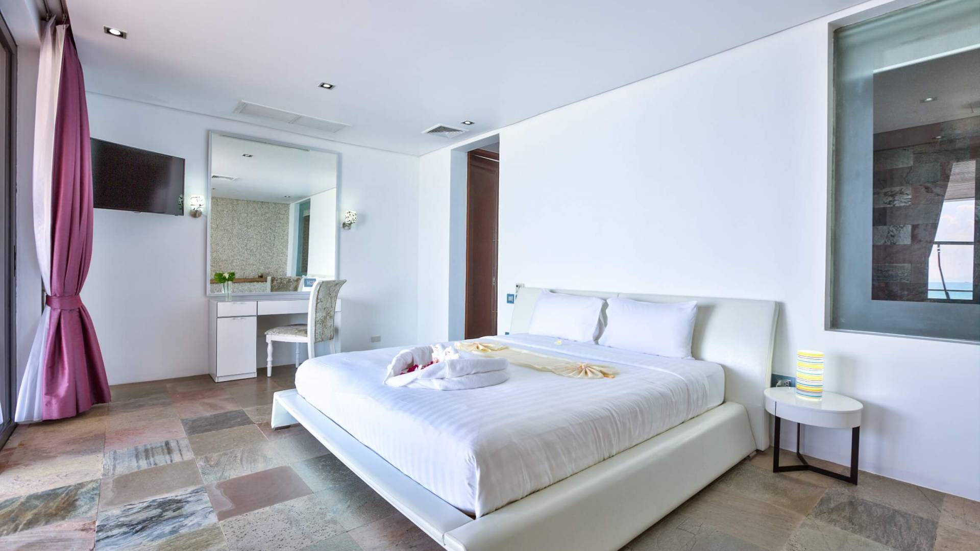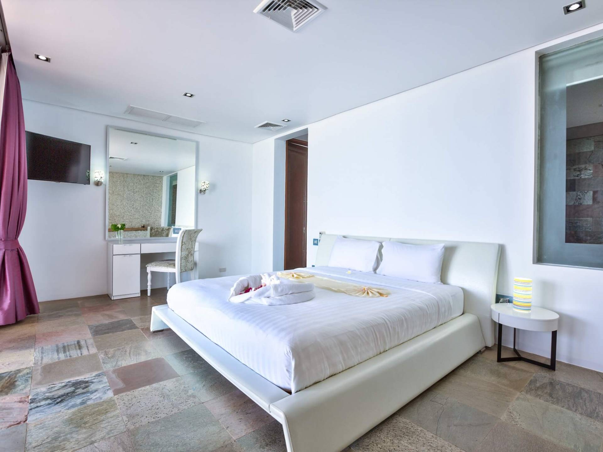 Di nuovo al piano terra, situata a sinistra di Villa U Koh Samui, c'è una camera da letto king-size indipendente con bagno privato che è stata arredata con stile, bagno privato con TV satellitare. Da qui puoi goderti viste mozzafiato sull'oceano grazie alle porte progettate su misura che si aprono su un passaggio centrale coperto.