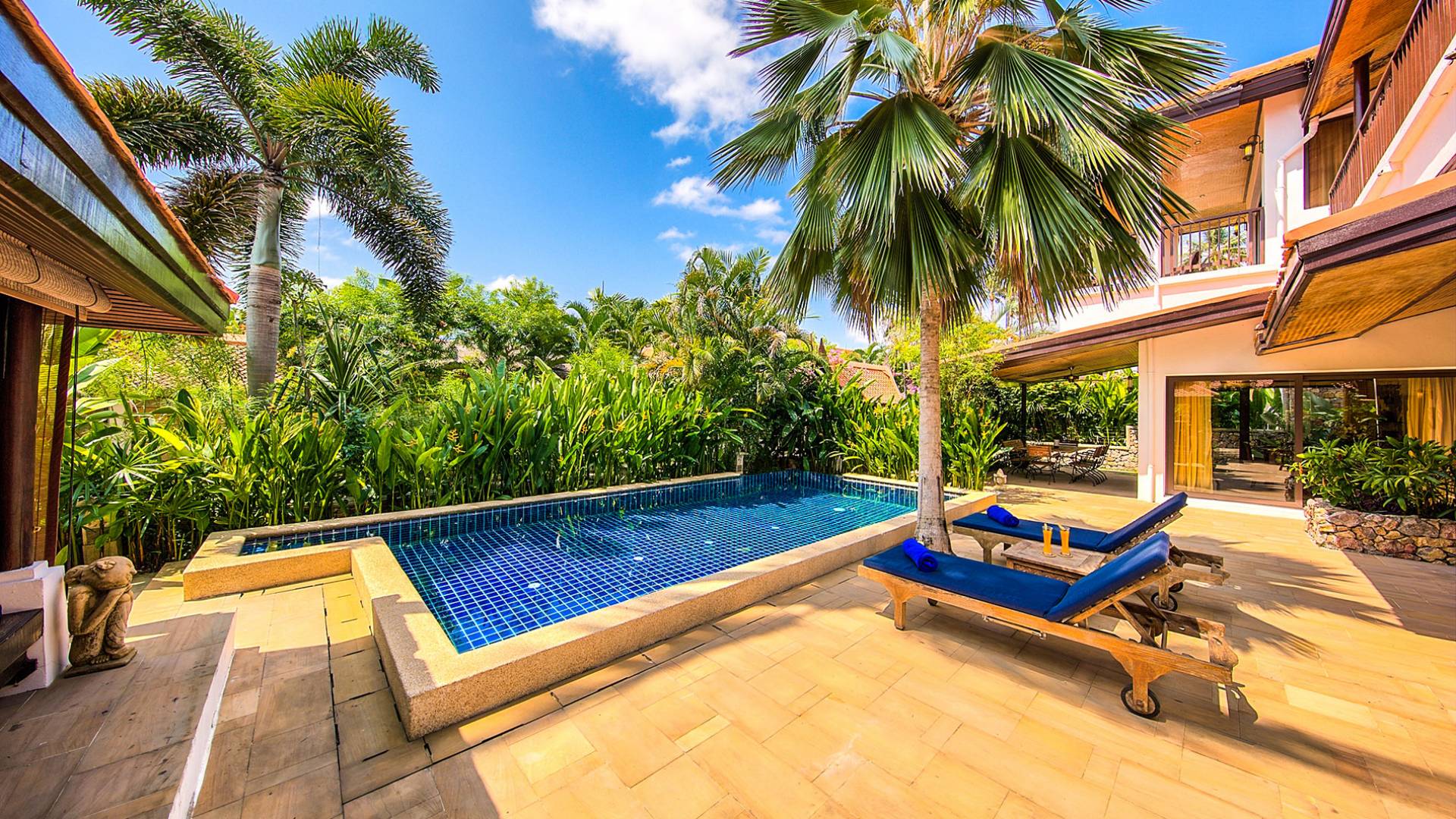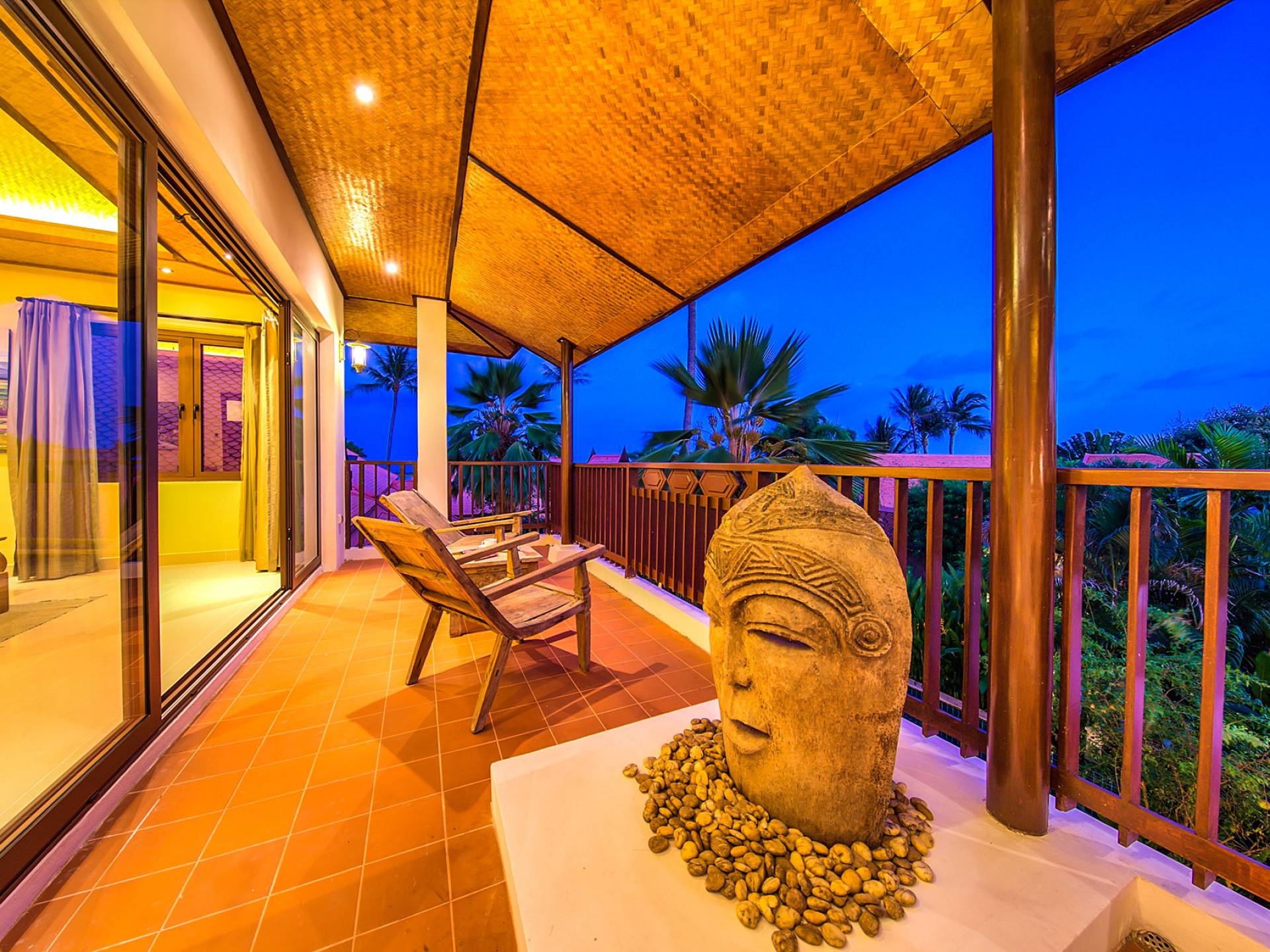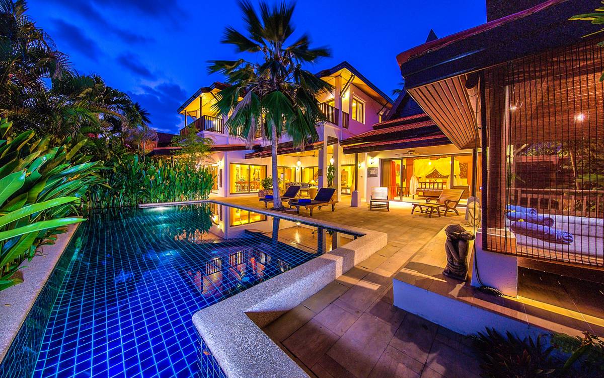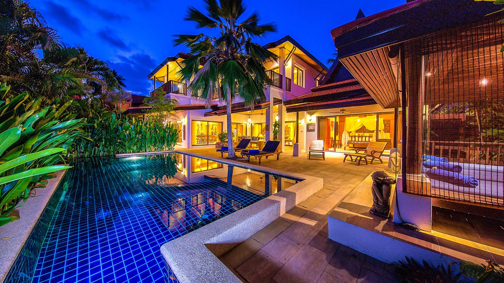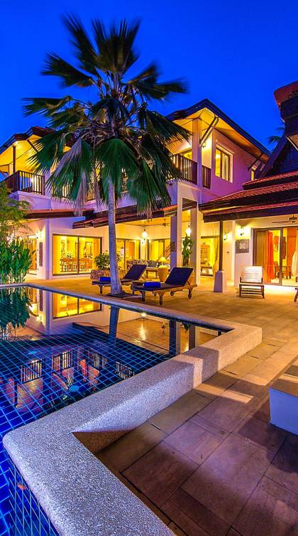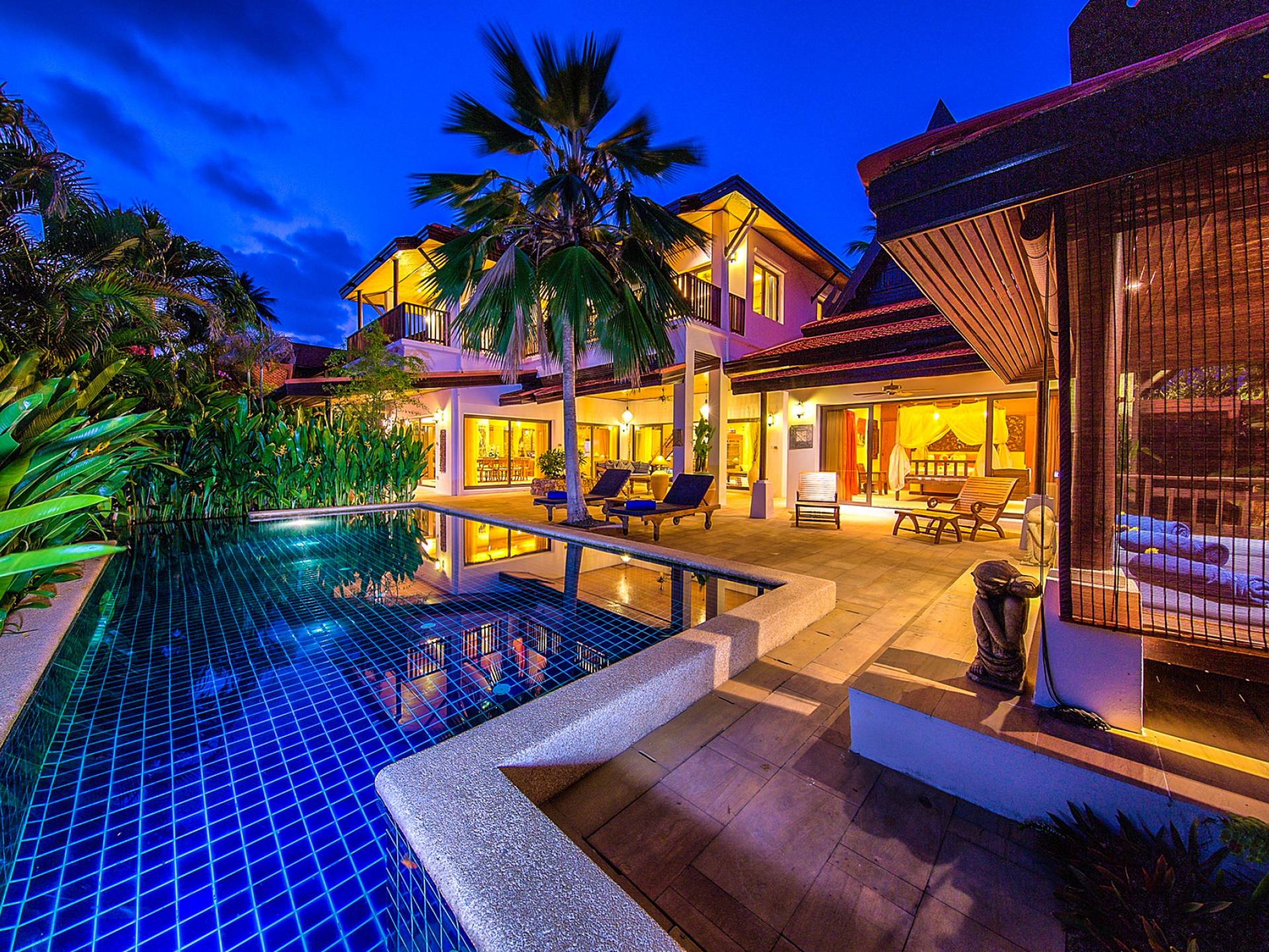 Villa Baan Buaa Samui è una lussuosa villa fronte mare in affitto con 3 camere da letto che può ospitare comodamente 6 adulti. Ci sono 3 camere matrimoniali e una culla che può essere fornita anche su richiesta e soggetta a disponibilità. Questa villa in affitto sulla spiaggia comprende un edificio principale di 2 piani e un edificio separato per gli ospiti adiacente. E' splendidamente arredato con molti pezzi d'antiquariato e riccamente decorato per riflettere l'architettura tailandese/balinese. Baan Buena è stato progettato per riflettere la vita tropicale interna ed esterna e offre un ambiente tranquillo e lussuoso per la tua vacanza sull'isola tropicale a Samui. La villa si trova a pochi passi dalla sabbia bianca di Nahai Beach e offre viste sul mare e sulla spiaggia dalle camere da letto e dai balconi al piano superiore.