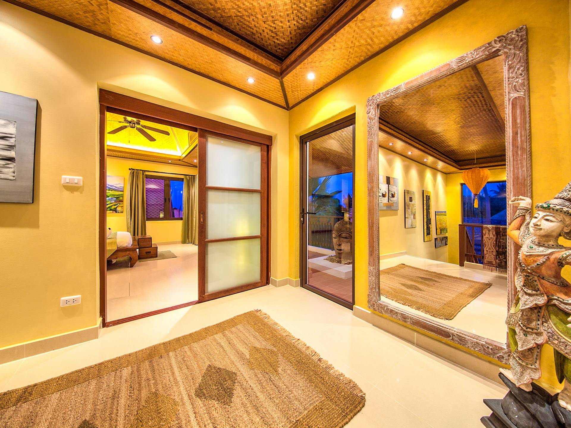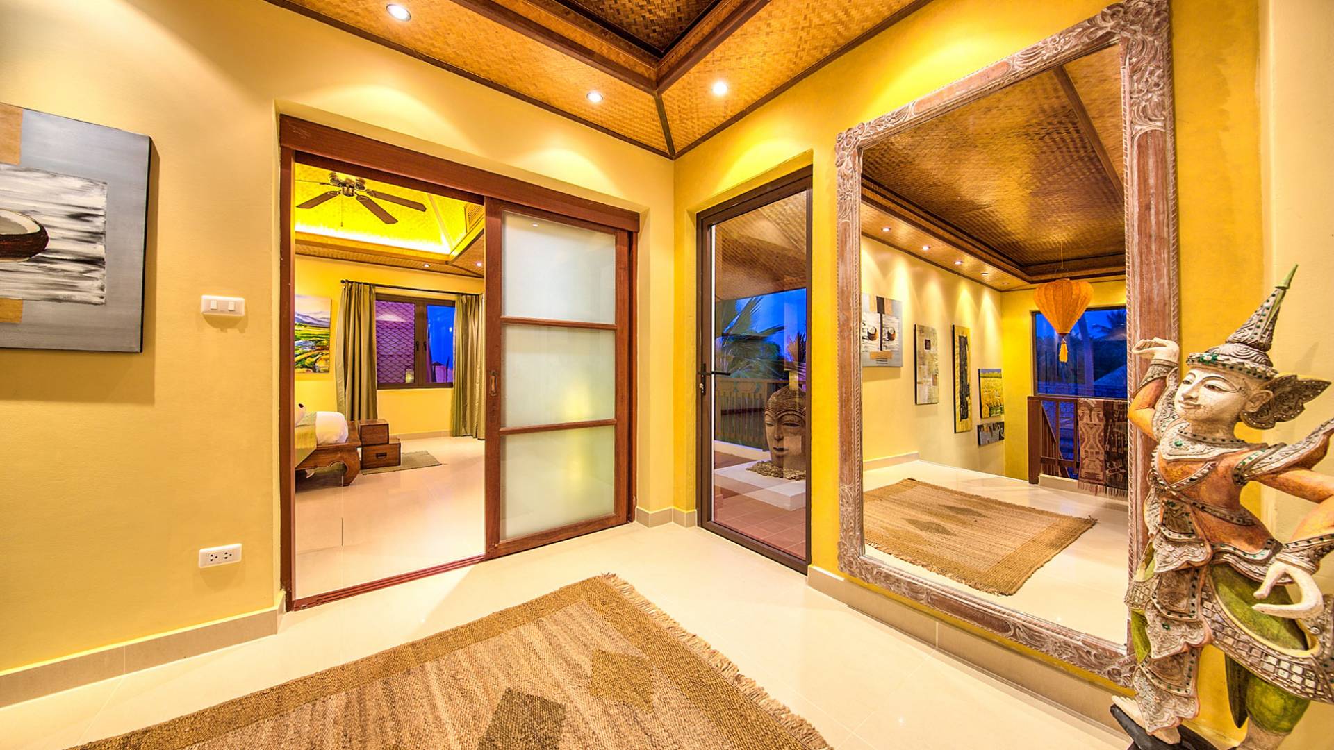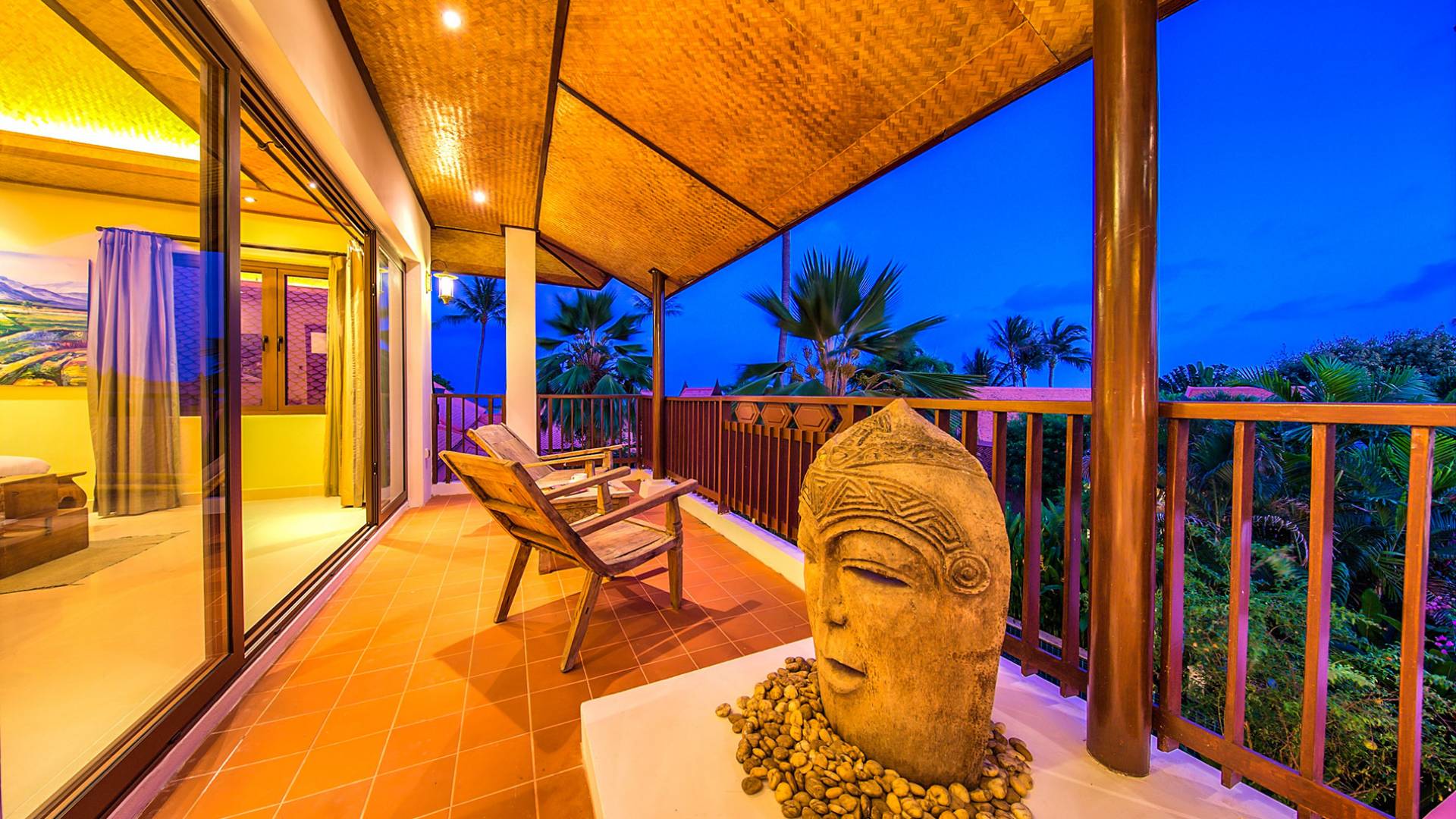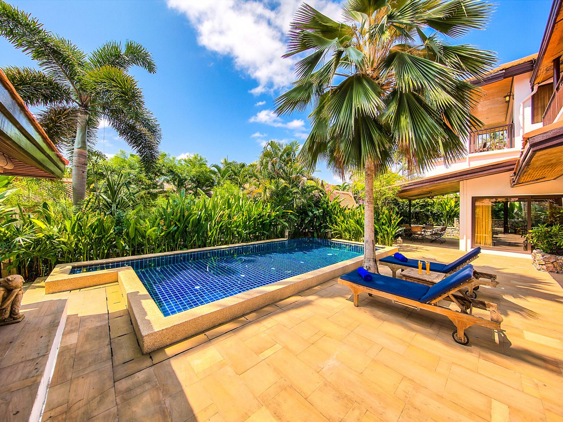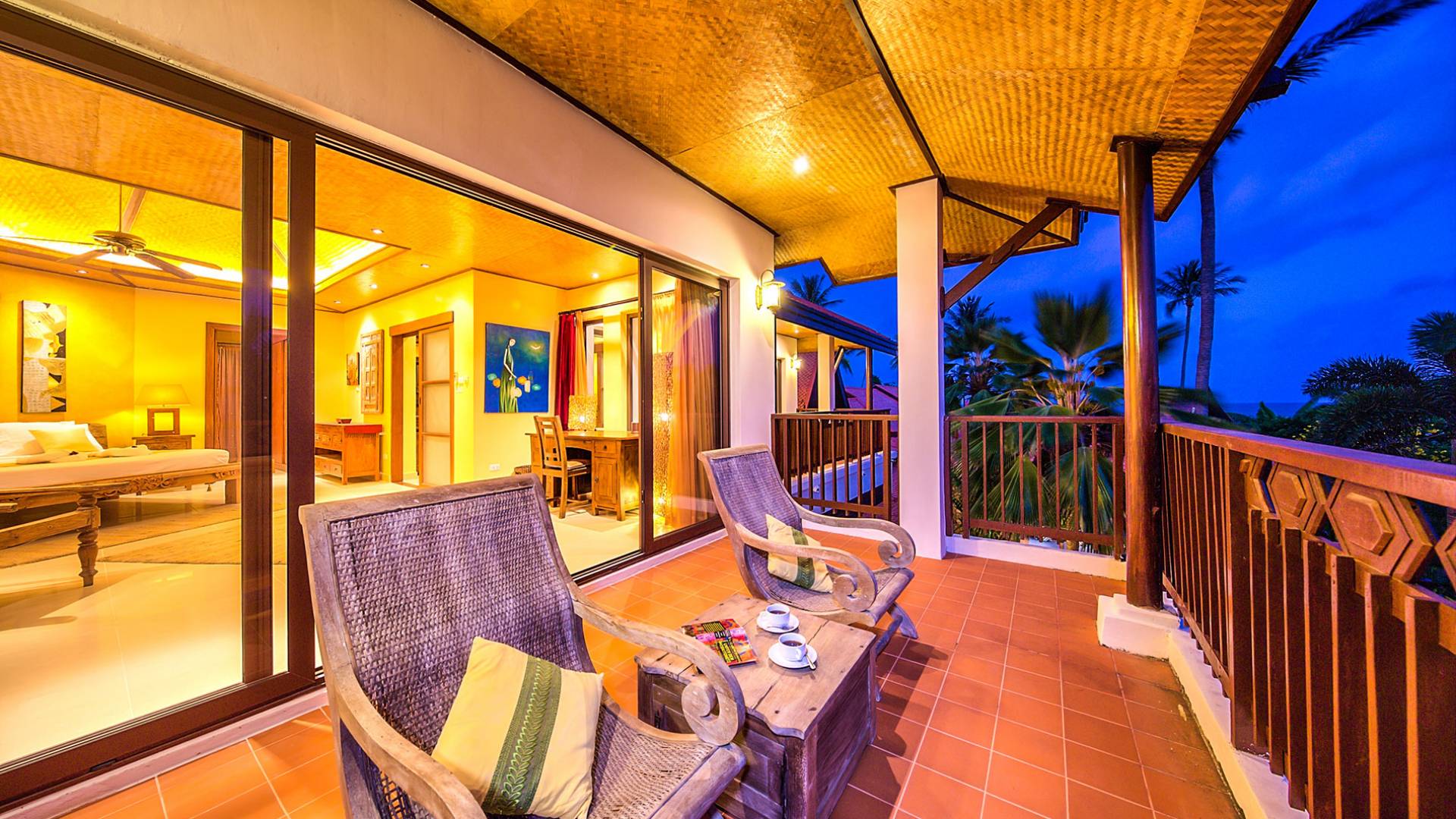 Villa Baan Buaa Samui è una lussuosa villa fronte mare in affitto con 3 camere da letto che può ospitare comodamente 6 adulti. Ci sono 3 camere matrimoniali e una culla che può essere fornita anche su richiesta e soggetta a disponibilità. Questa villa in affitto sulla spiaggia comprende un edificio principale di 2 piani e un edificio separato per gli ospiti adiacente. E' splendidamente arredato con molti pezzi d'antiquariato e riccamente decorato per riflettere l'architettura tailandese/balinese. Baan Buena è stato progettato per riflettere la vita tropicale interna ed esterna e offre un ambiente tranquillo e lussuoso per la tua vacanza sull'isola tropicale a Samui. La villa si trova a pochi passi dalla sabbia bianca di Nahai Beach e offre viste sul mare e sulla spiaggia dalle camere da letto e dai balconi al piano superiore.