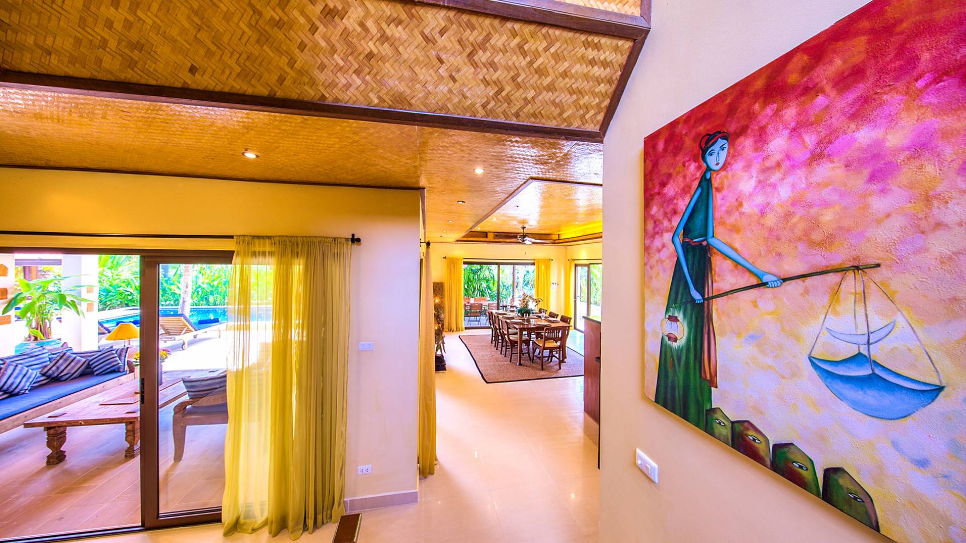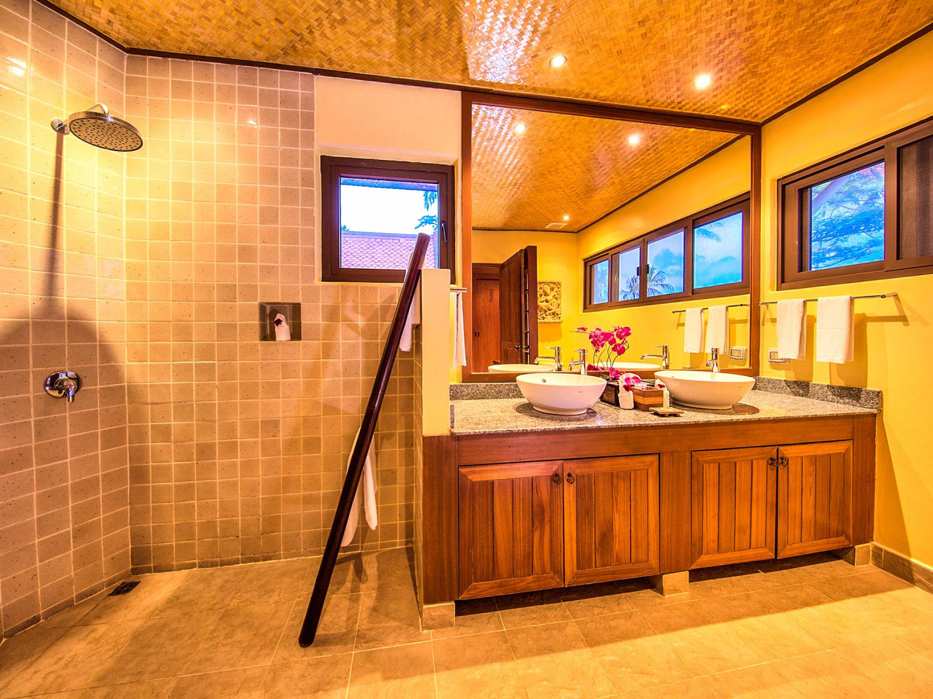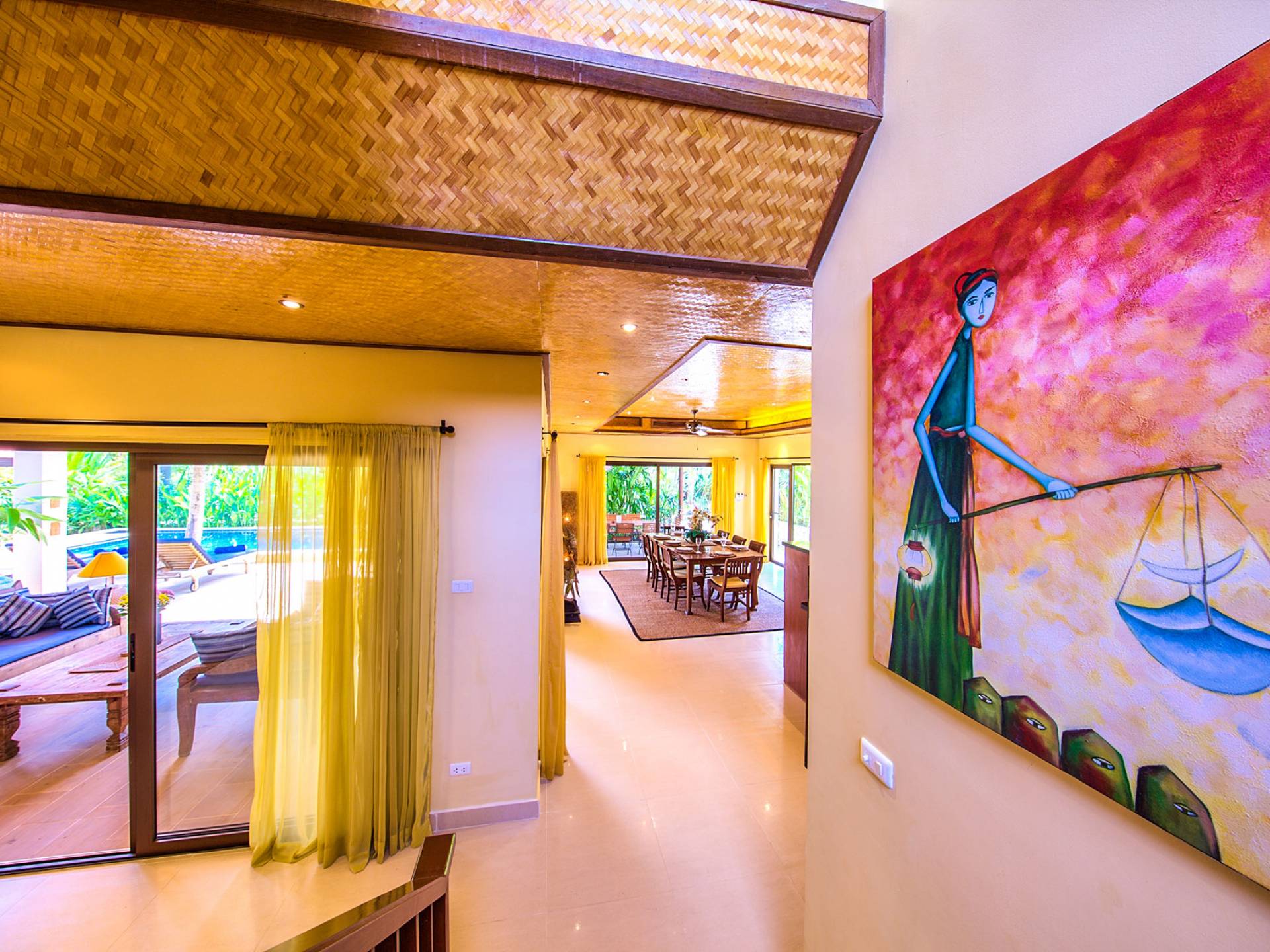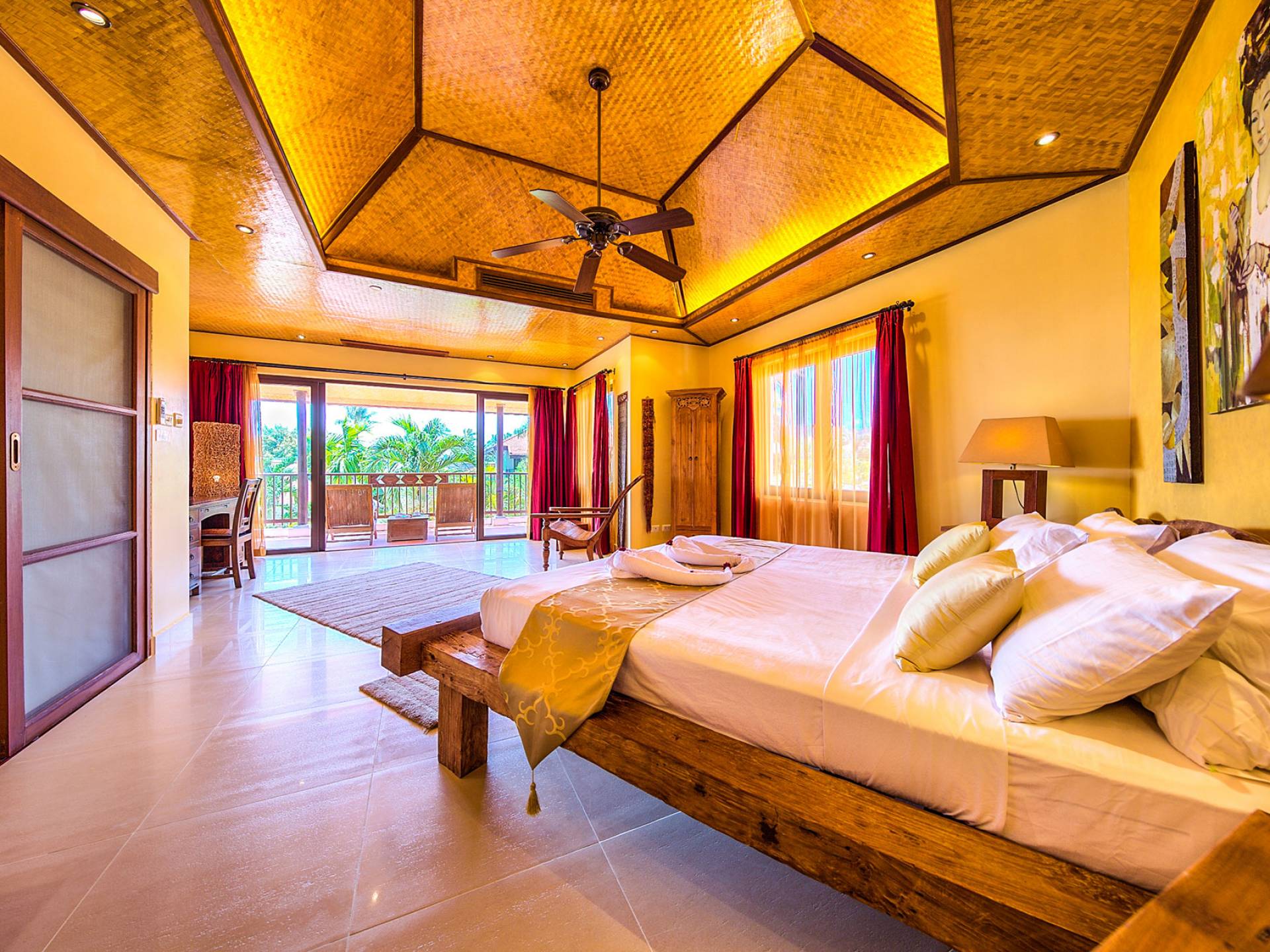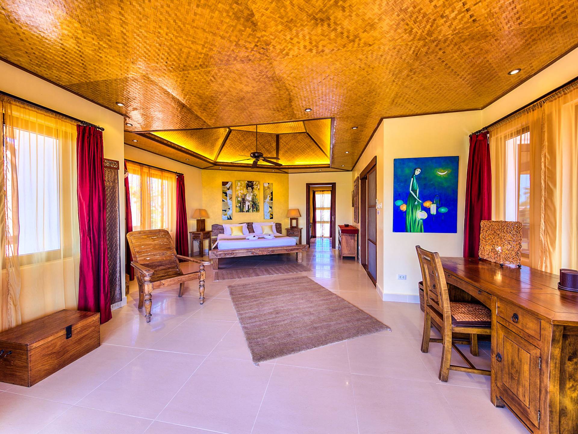 Villa Baan Buaa Samui è una lussuosa villa fronte mare in affitto con 3 camere da letto che può ospitare comodamente 6 adulti. Ci sono 3 camere matrimoniali e una culla che può essere fornita anche su richiesta e soggetta a disponibilità. Questa villa in affitto sulla spiaggia comprende un edificio principale di 2 piani e un edificio separato per gli ospiti adiacente. E' splendidamente arredato con molti pezzi d'antiquariato e riccamente decorato per riflettere l'architettura tailandese/balinese. Baan Buena è stato progettato per riflettere la vita tropicale interna ed esterna e offre un ambiente tranquillo e lussuoso per la tua vacanza sull'isola tropicale a Samui. La villa si trova a pochi passi dalla sabbia bianca di Nahai Beach e offre viste sul mare e sulla spiaggia dalle camere da letto e dai balconi al piano superiore.